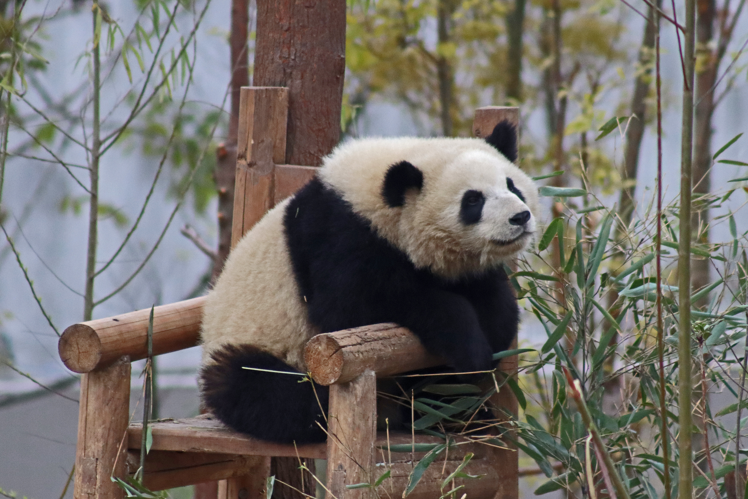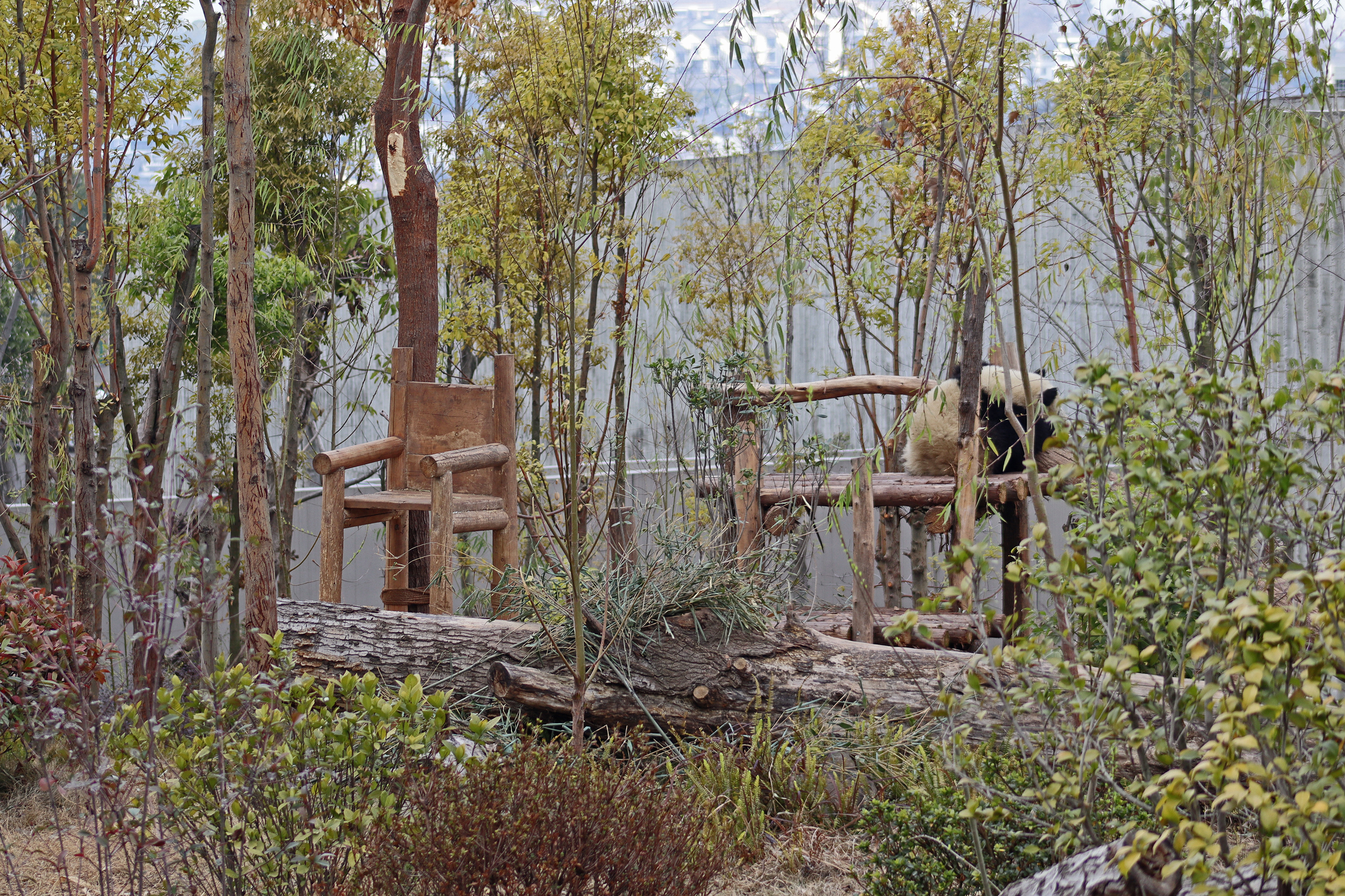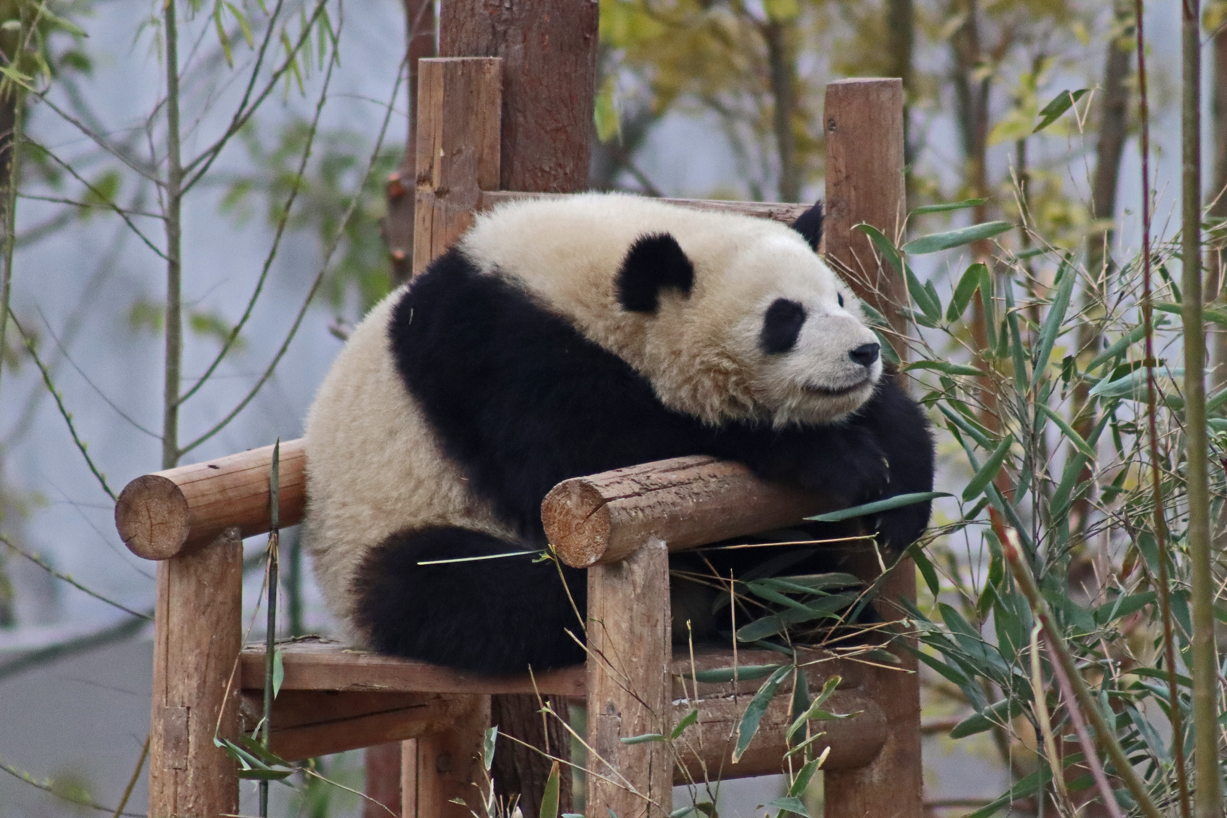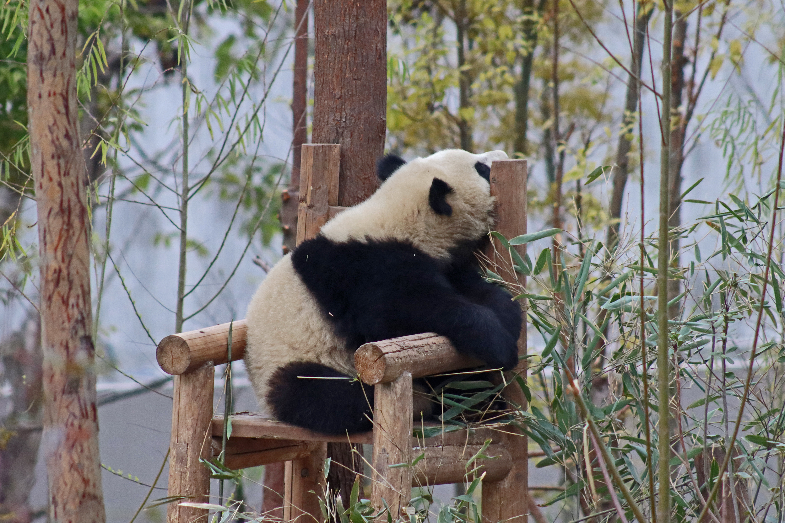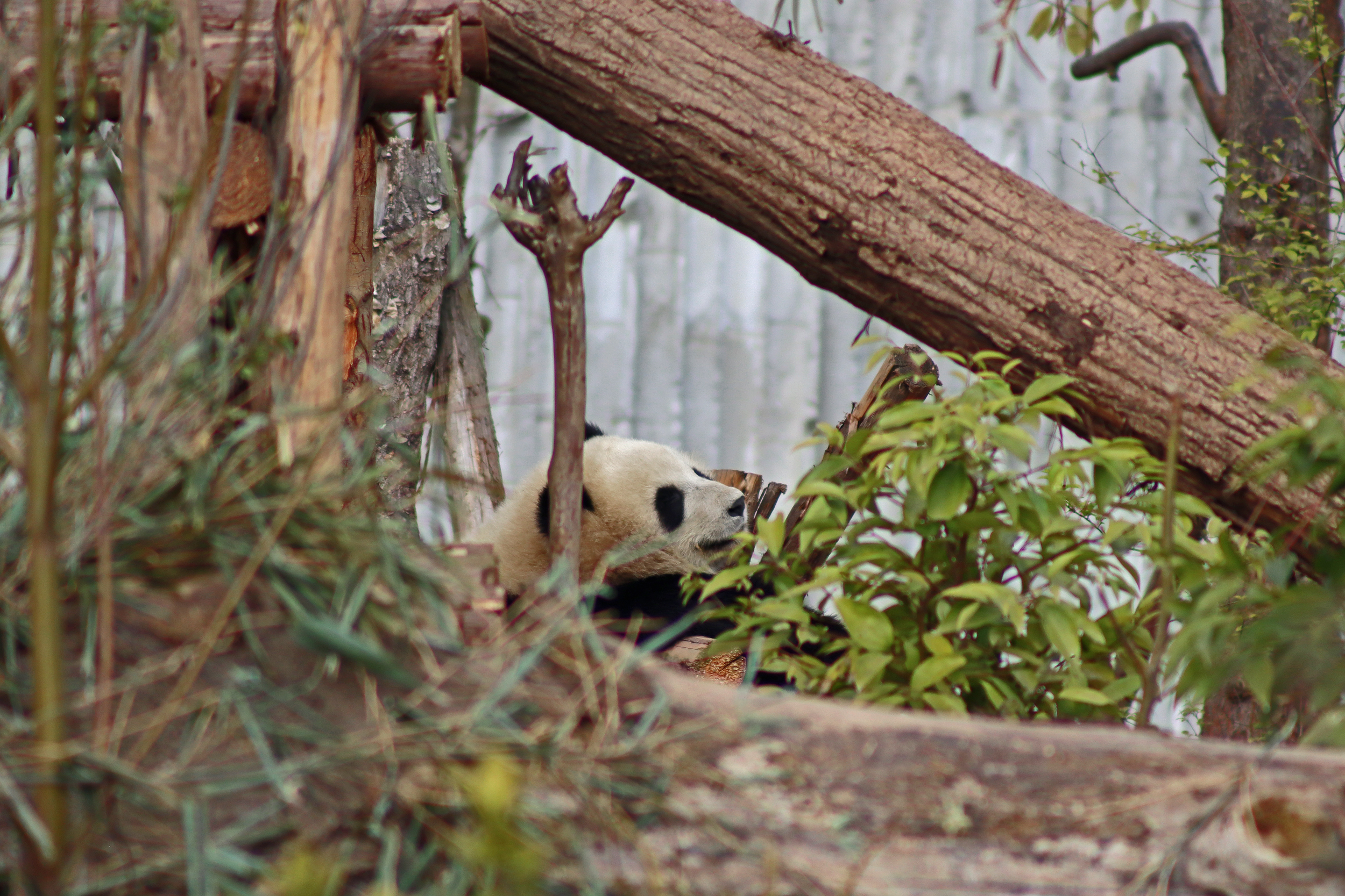 Lun Wu is the panda with the very fluffy round face – he seems a bit more shy and reserved, preferring to stay closer to the back of the yard and more hidden amongst the plants. Jin Dou is the panda who spent most of the day all the way up in the tree and only coming down when the keeper threw in some more bamboo! It was very cute seeing bamboo being collected quickly and then taken all the way up the tree to eat, it’s some skill being able to carry a mouthful of bamboo stems all the way up a tree^ I got lucky towards the end of the afternoon and Lun Wu had settled onto the wooden chair in a relatively plant-less view in the middle of the yard and could get some good photos – this yard is large and has a lot of plants, so it was quite tricky to get photos if the pandas were further back or slightly hidden from view. Then I ended the day seeing both of them settled in for a snooze up the same tree despite there being plenty of tree choices – so cute =D