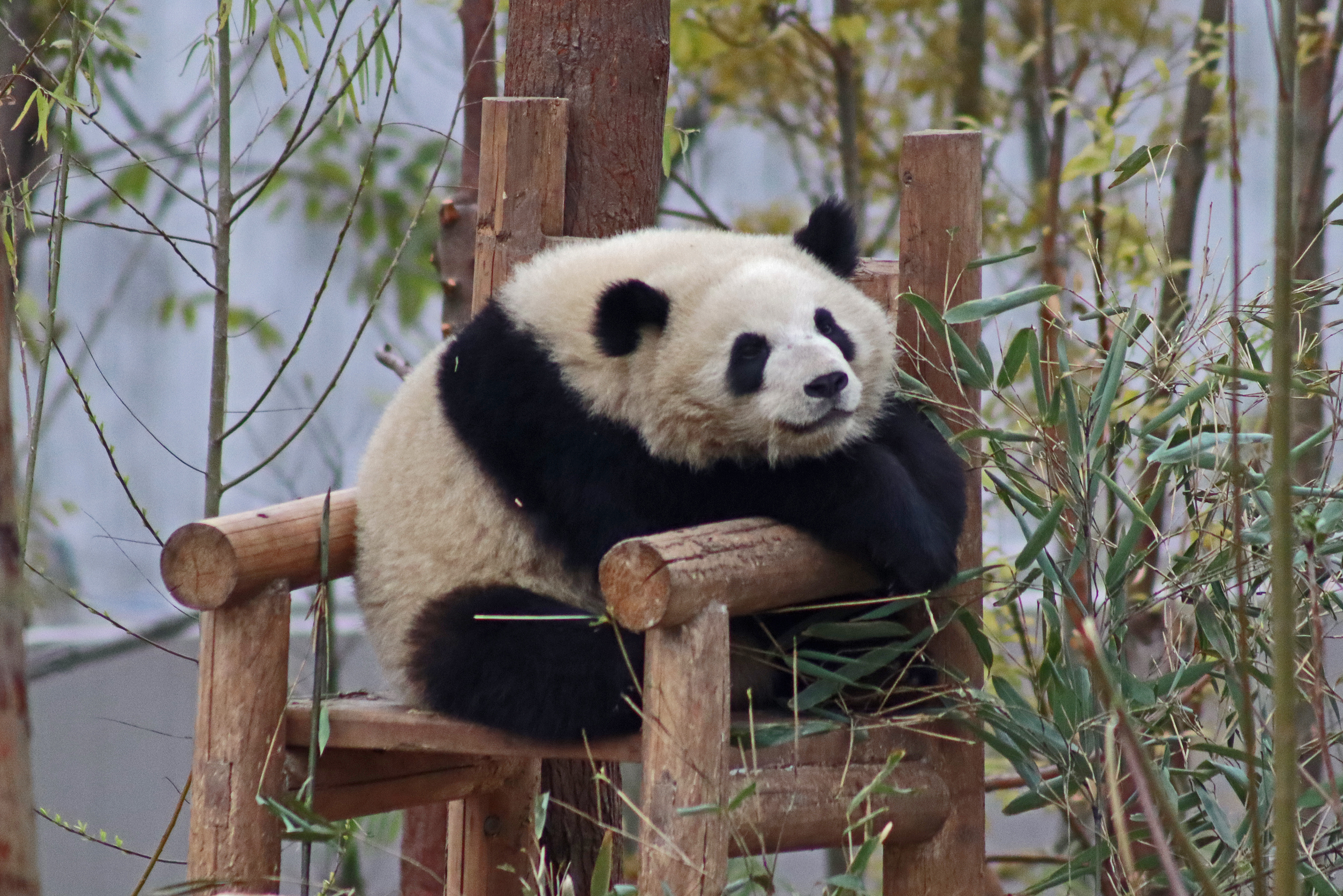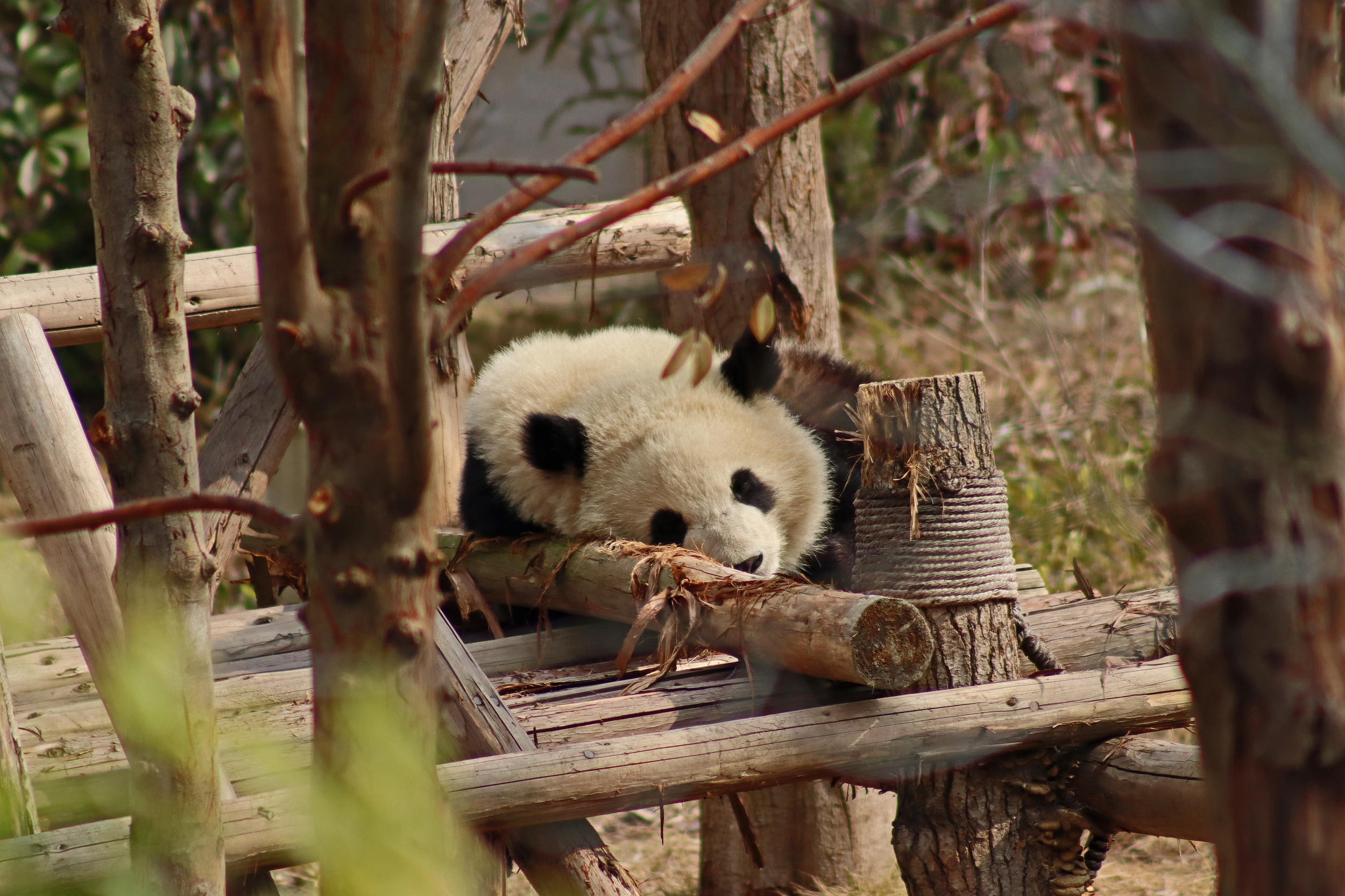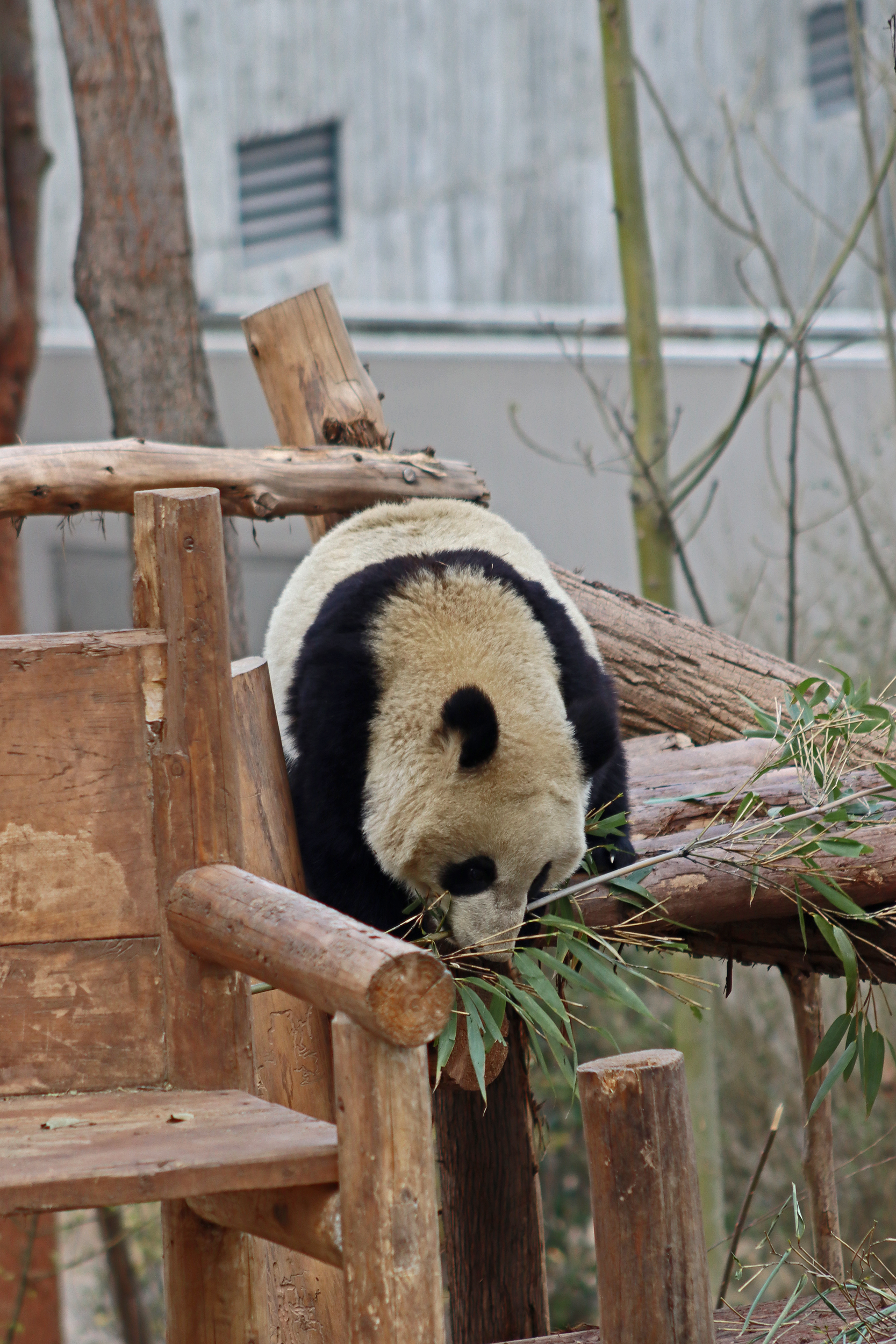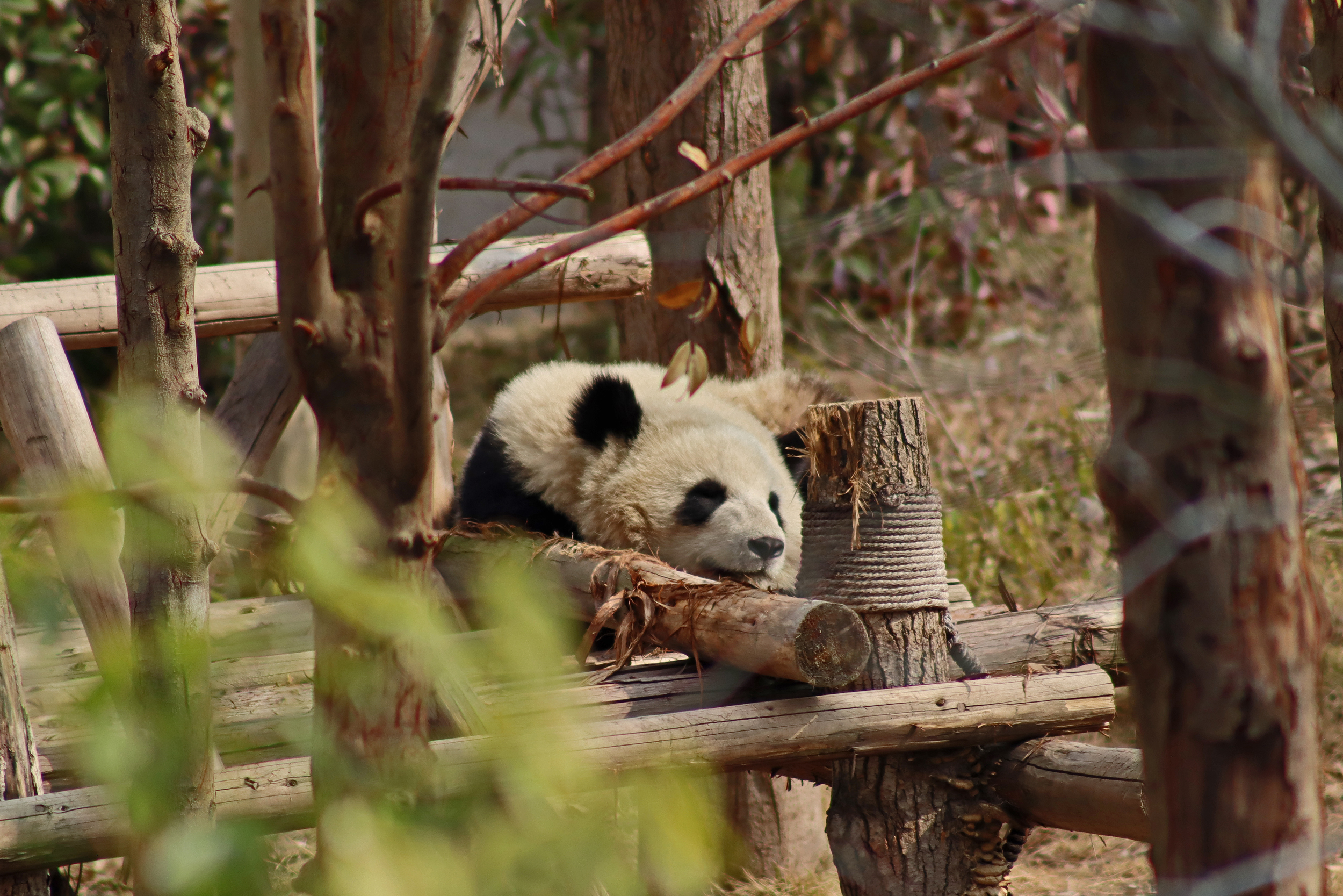 Lun Wu is the panda with the very fluffy round face – he seems a bit more shy and reserved, preferring to stay closer to the back of the yard and more hidden amongst the plants. Jin Dou is the panda who spent most of the day all the way up in the tree and only coming down when the keeper threw in some more bamboo! It was very cute seeing bamboo being collected quickly and then taken all the way up the tree to eat, it’s some skill being able to carry a mouthful of bamboo stems all the way up a tree^ I got lucky towards the end of the afternoon and Lun Wu had settled onto the wooden chair in a relatively plant-less view in the middle of the yard and could get some good photos – this yard is large and has a lot of plants, so it was quite tricky to get photos if the pandas were further back or slightly hidden from view. Then I ended the day seeing both of them settled in for a snooze up the same tree despite there being plenty of tree choices – so cute =D