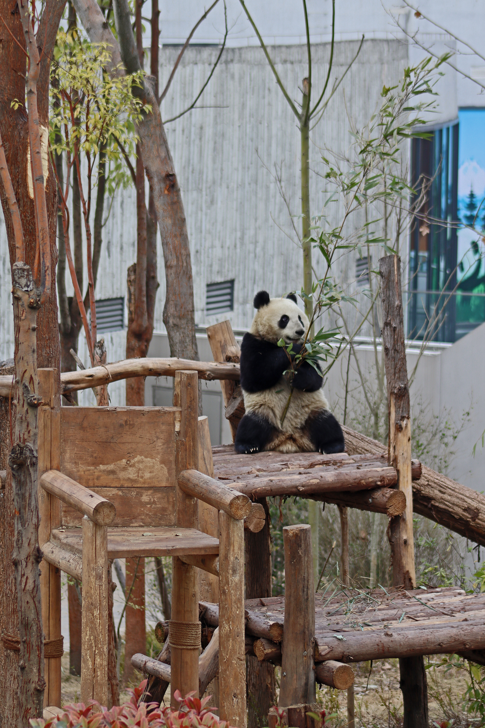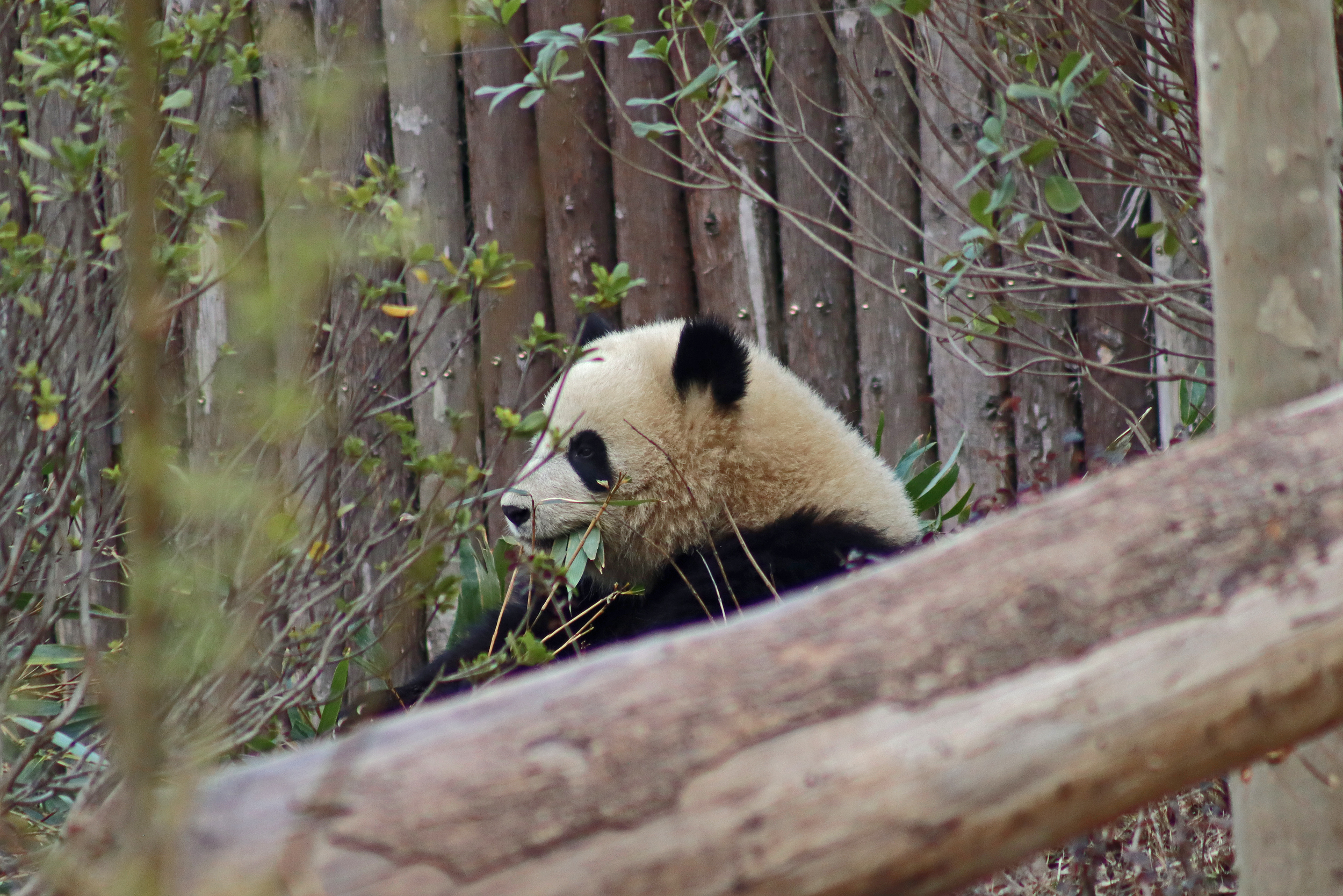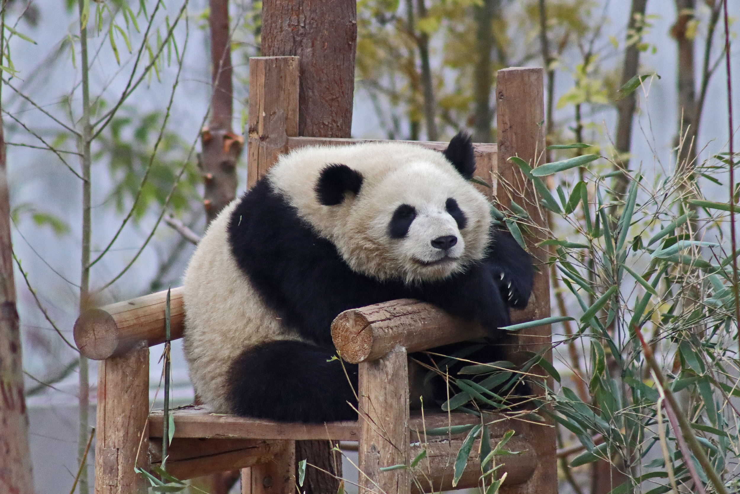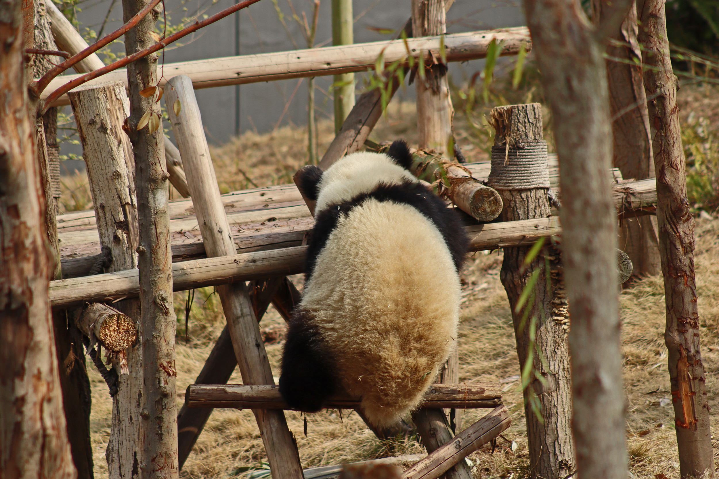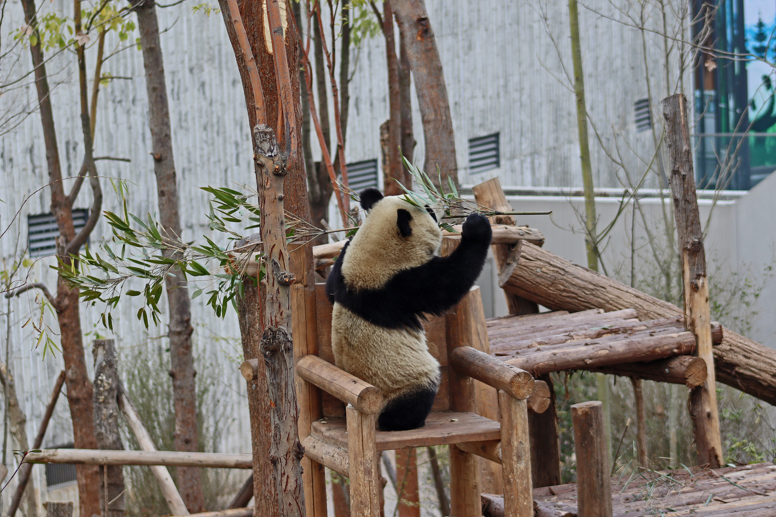 Lun Wu is the panda with the very fluffy round face – he seems a bit more shy and reserved, preferring to stay closer to the back of the yard and more hidden amongst the plants. Jin Dou is the panda who spent most of the day all the way up in the tree and only coming down when the keeper threw in some more bamboo! It was very cute seeing bamboo being collected quickly and then taken all the way up the tree to eat, it’s some skill being able to carry a mouthful of bamboo stems all the way up a tree^ I got lucky towards the end of the afternoon and Lun Wu had settled onto the wooden chair in a relatively plant-less view in the middle of the yard and could get some good photos – this yard is large and has a lot of plants, so it was quite tricky to get photos if the pandas were further back or slightly hidden from view. Then I ended the day seeing both of them settled in for a snooze up the same tree despite there being plenty of tree choices – so cute =D