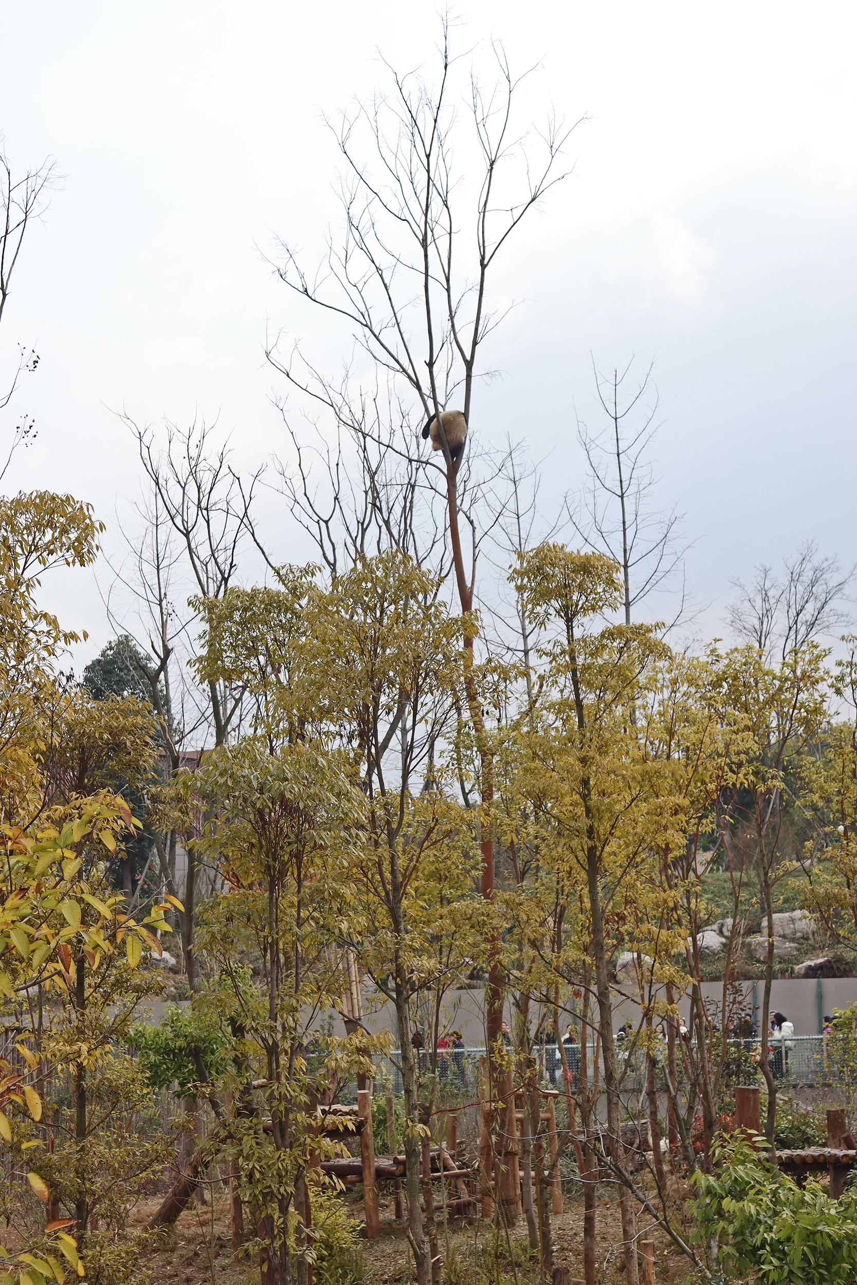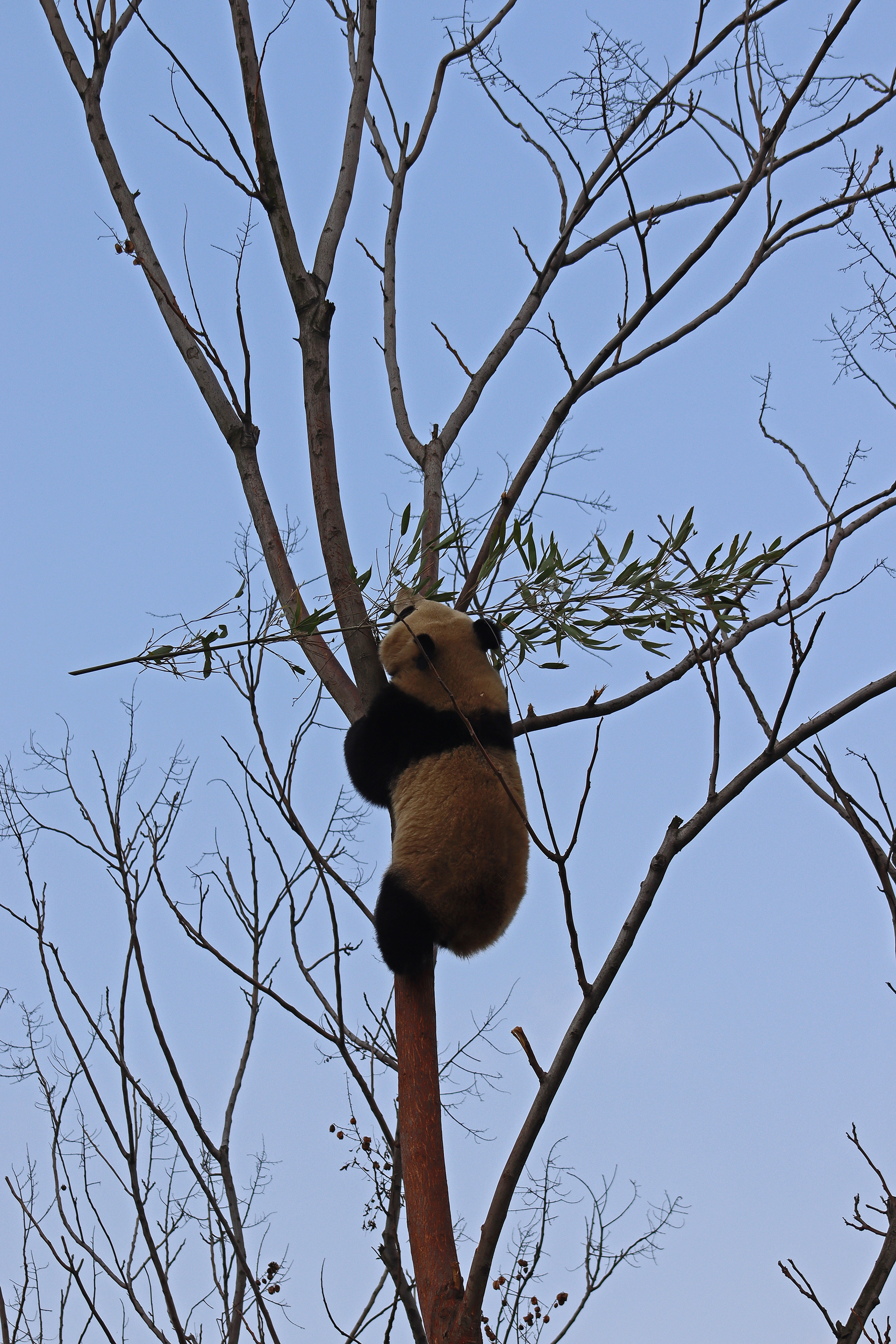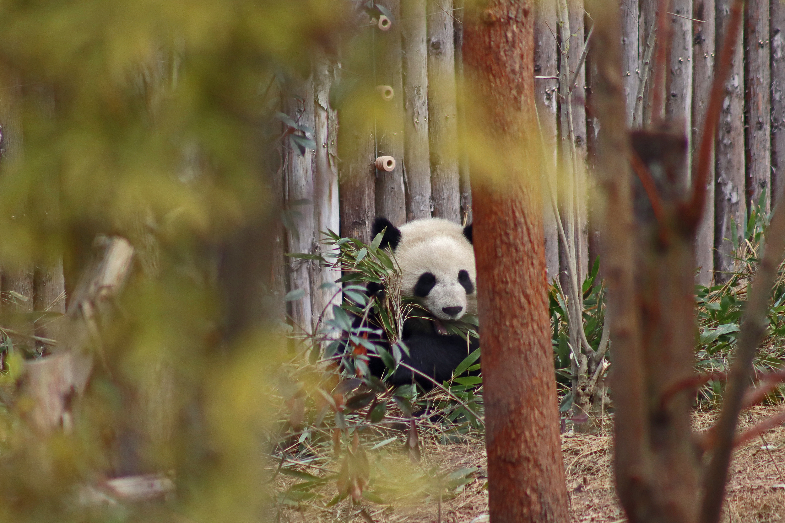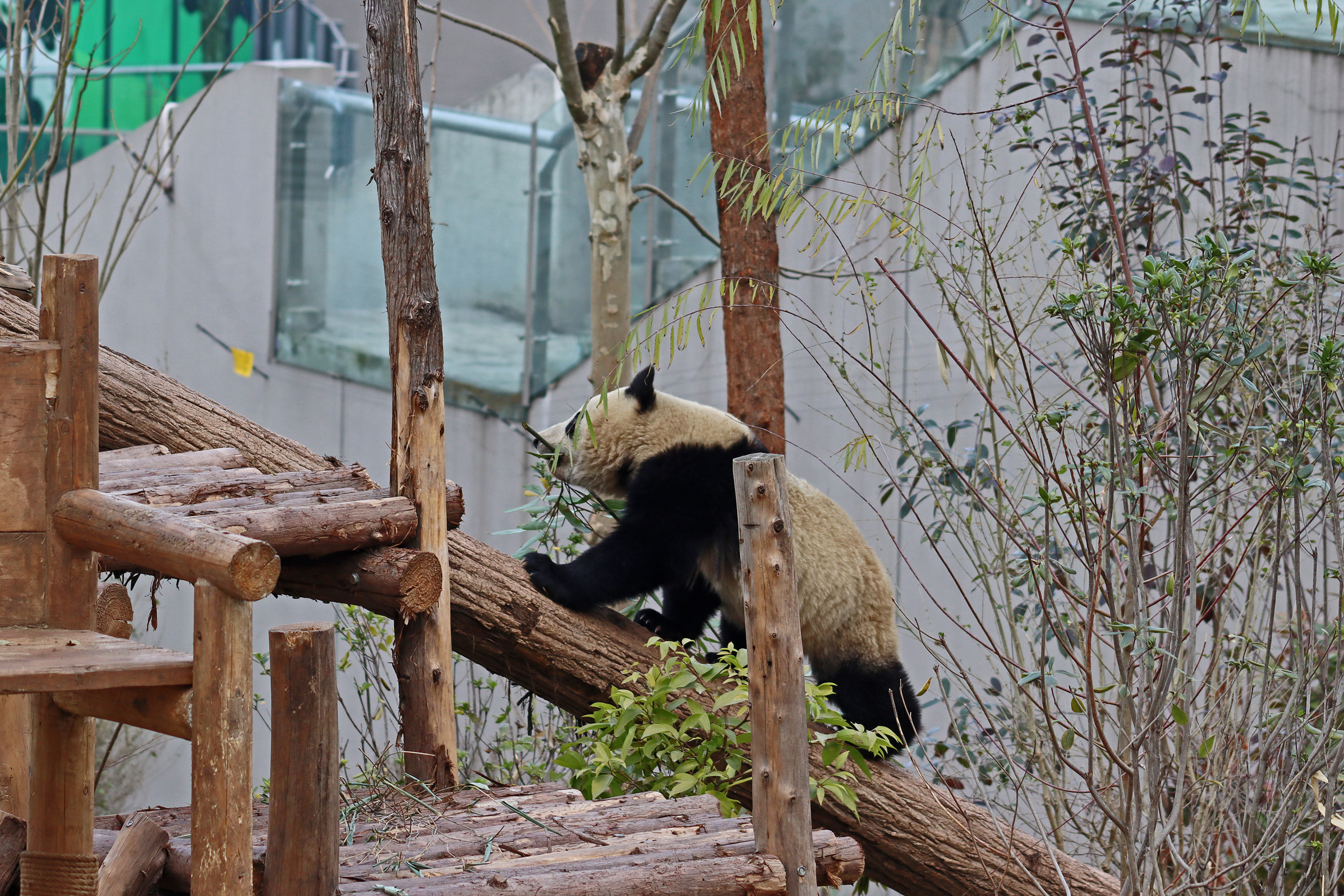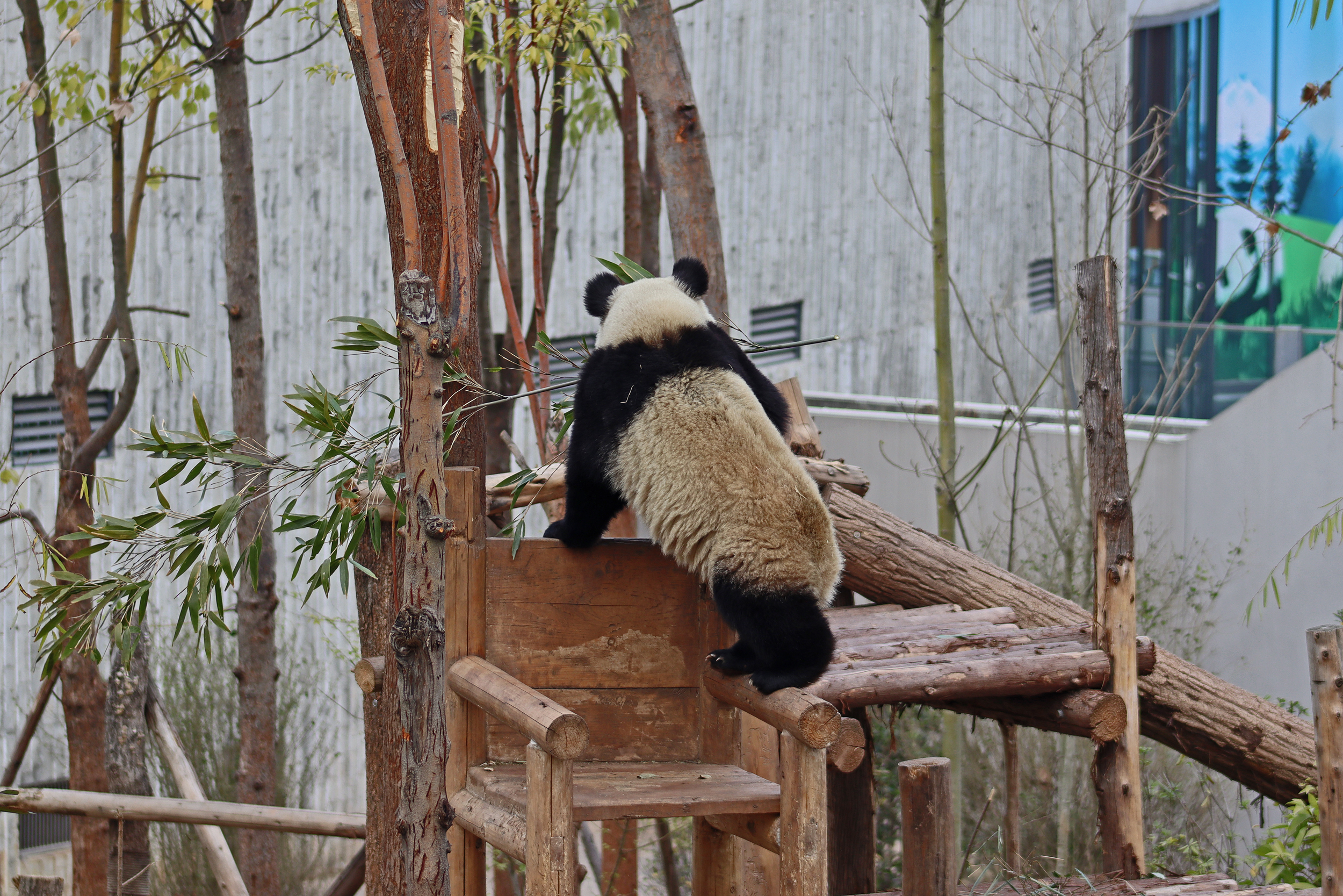 Lun Wu is the panda with the very fluffy round face – he seems a bit more shy and reserved, preferring to stay closer to the back of the yard and more hidden amongst the plants. Jin Dou is the panda who spent most of the day all the way up in the tree and only coming down when the keeper threw in some more bamboo! It was very cute seeing bamboo being collected quickly and then taken all the way up the tree to eat, it’s some skill being able to carry a mouthful of bamboo stems all the way up a tree^ I got lucky towards the end of the afternoon and Lun Wu had settled onto the wooden chair in a relatively plant-less view in the middle of the yard and could get some good photos – this yard is large and has a lot of plants, so it was quite tricky to get photos if the pandas were further back or slightly hidden from view. Then I ended the day seeing both of them settled in for a snooze up the same tree despite there being plenty of tree choices – so cute =D