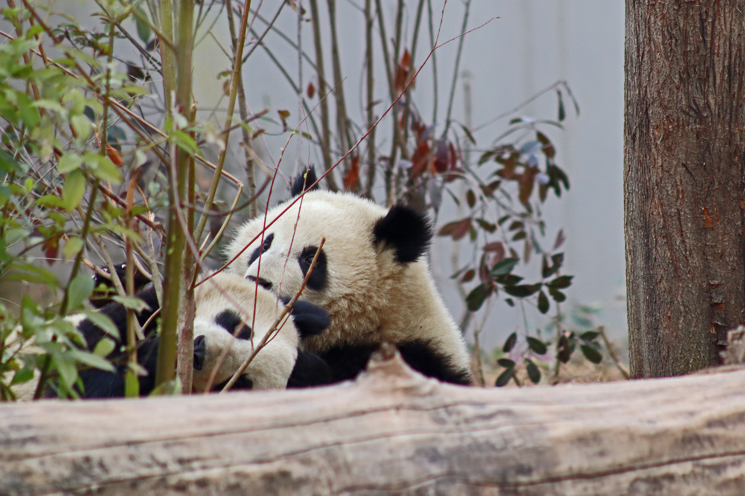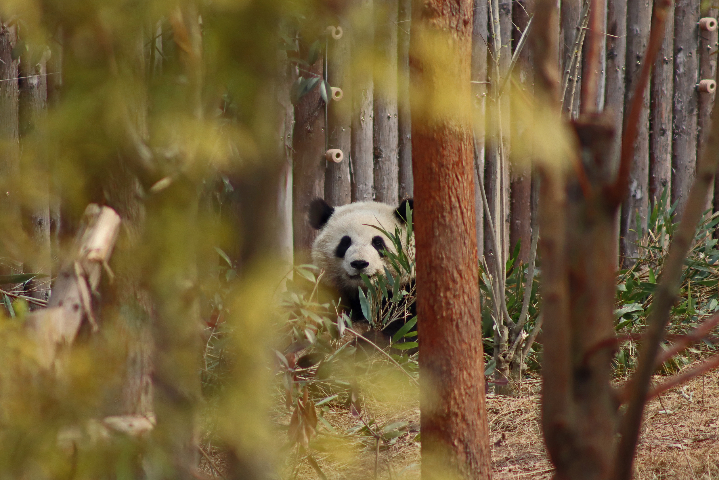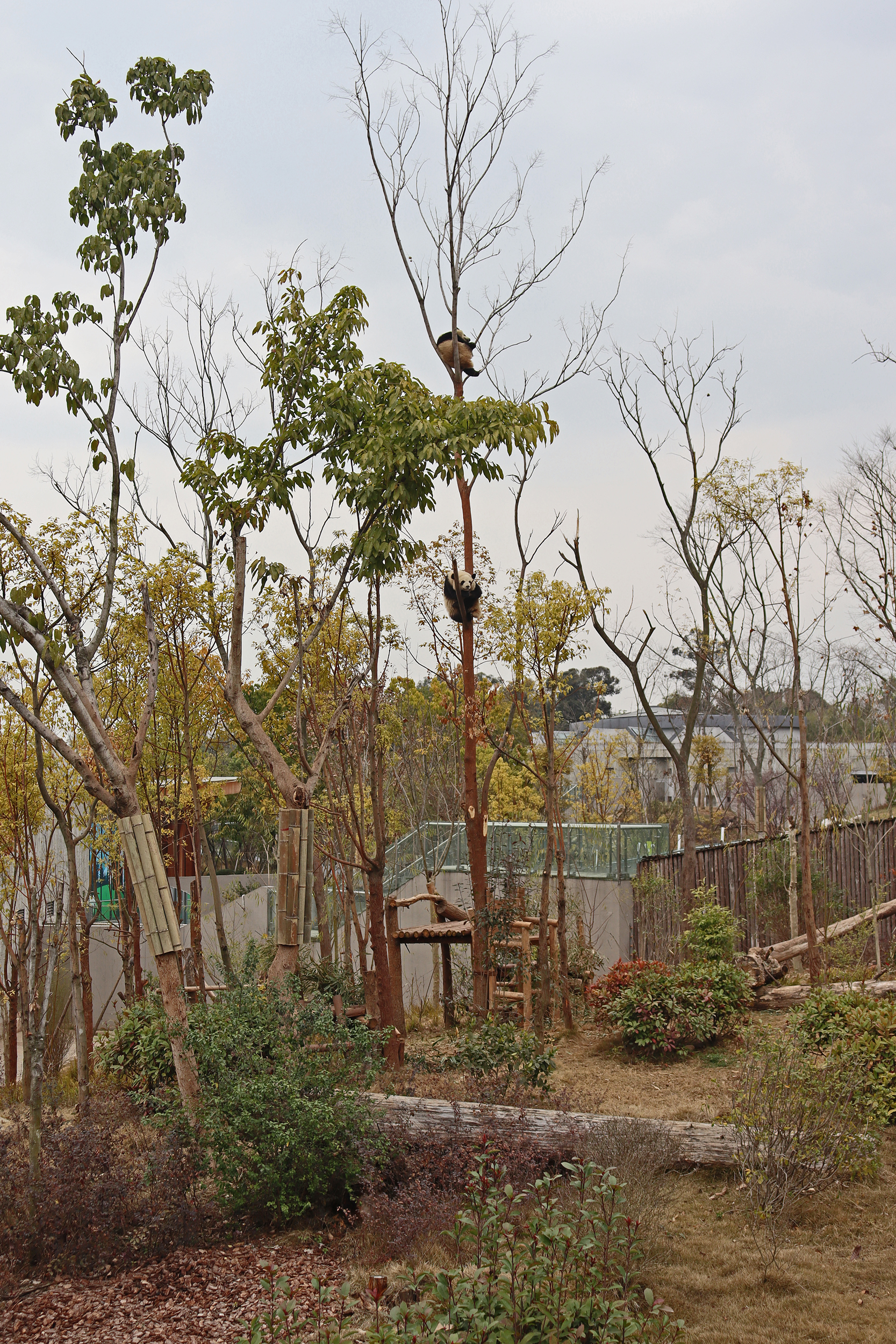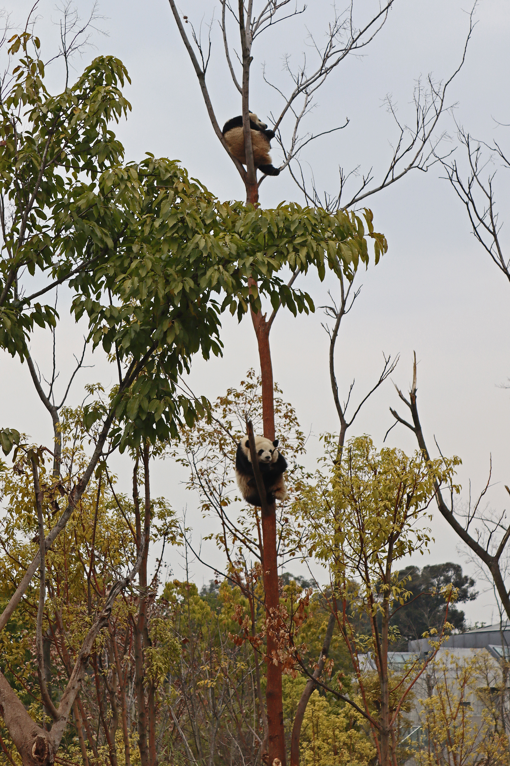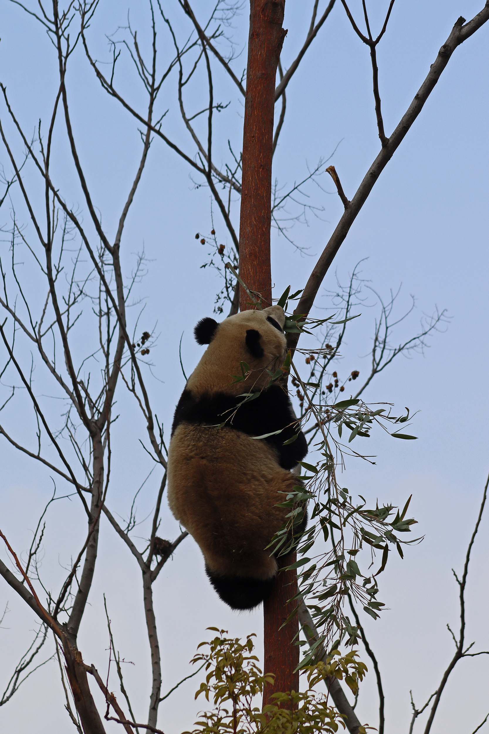 Lun Wu is the panda with the very fluffy round face – he seems a bit more shy and reserved, preferring to stay closer to the back of the yard and more hidden amongst the plants. Jin Dou is the panda who spent most of the day all the way up in the tree and only coming down when the keeper threw in some more bamboo! It was very cute seeing bamboo being collected quickly and then taken all the way up the tree to eat, it’s some skill being able to carry a mouthful of bamboo stems all the way up a tree^ I got lucky towards the end of the afternoon and Lun Wu had settled onto the wooden chair in a relatively plant-less view in the middle of the yard and could get some good photos – this yard is large and has a lot of plants, so it was quite tricky to get photos if the pandas were further back or slightly hidden from view. Then I ended the day seeing both of them settled in for a snooze up the same tree despite there being plenty of tree choices – so cute =D