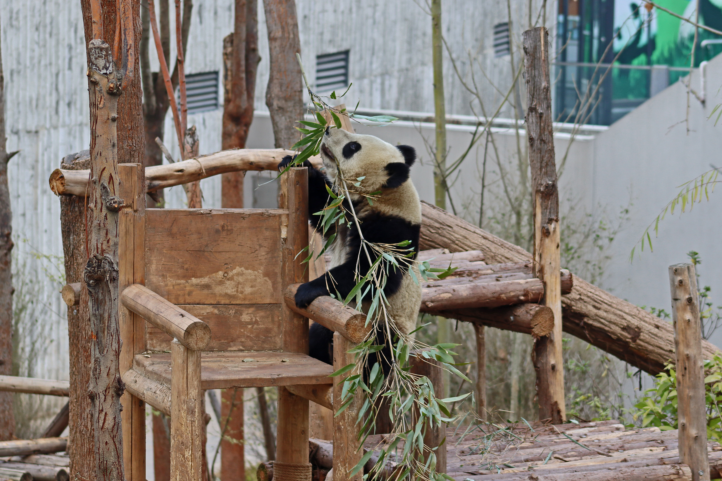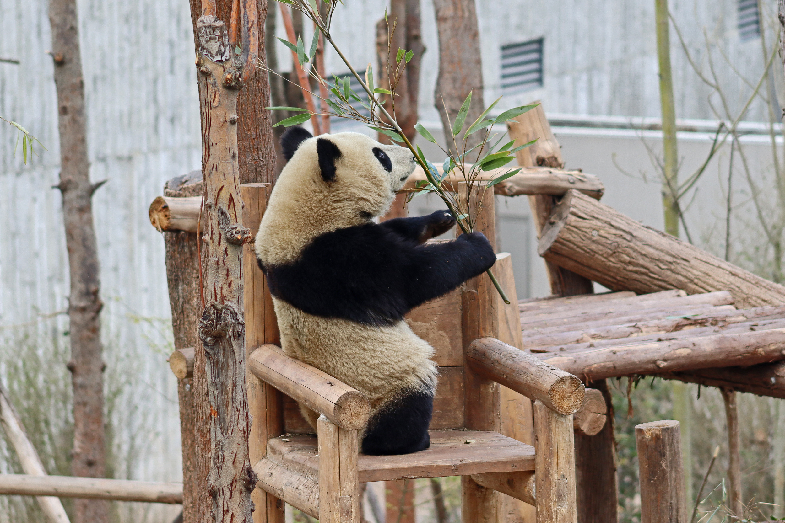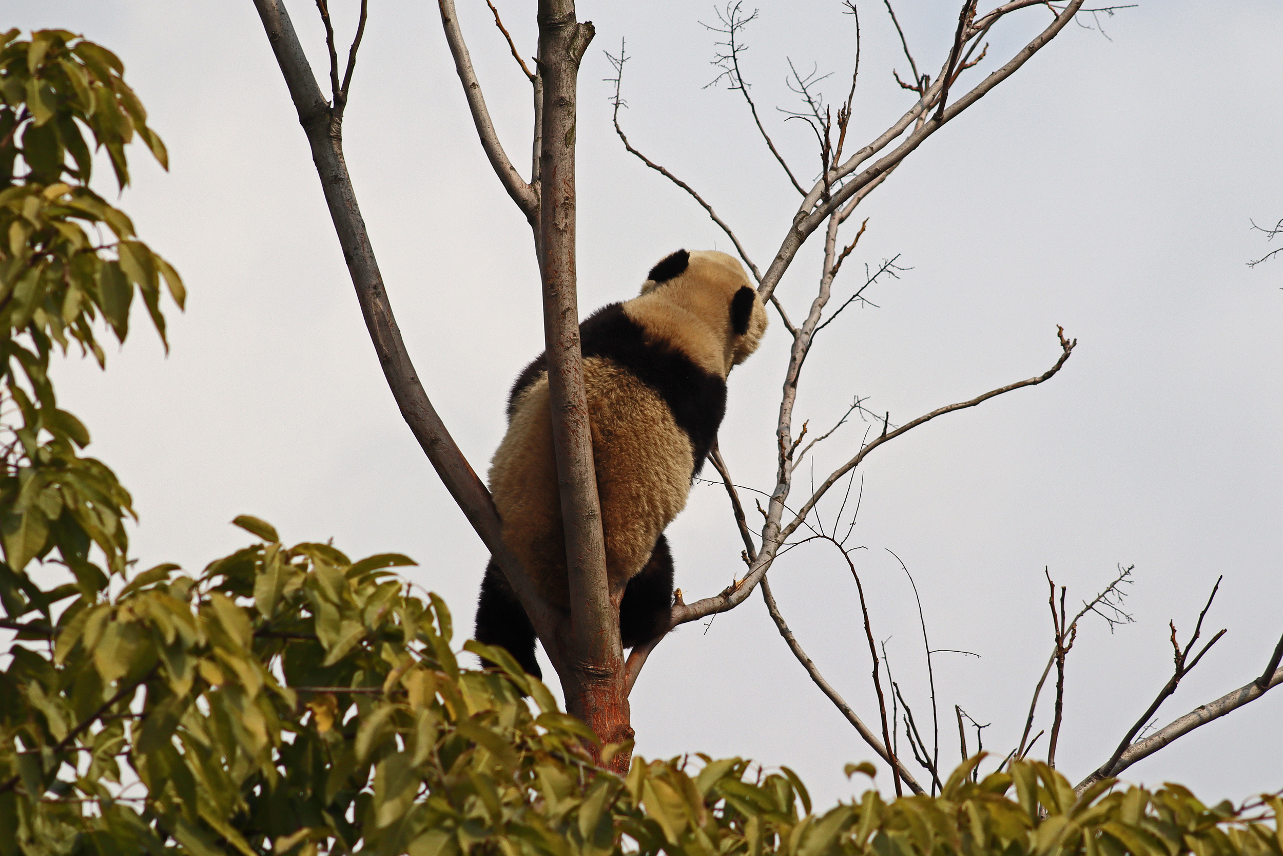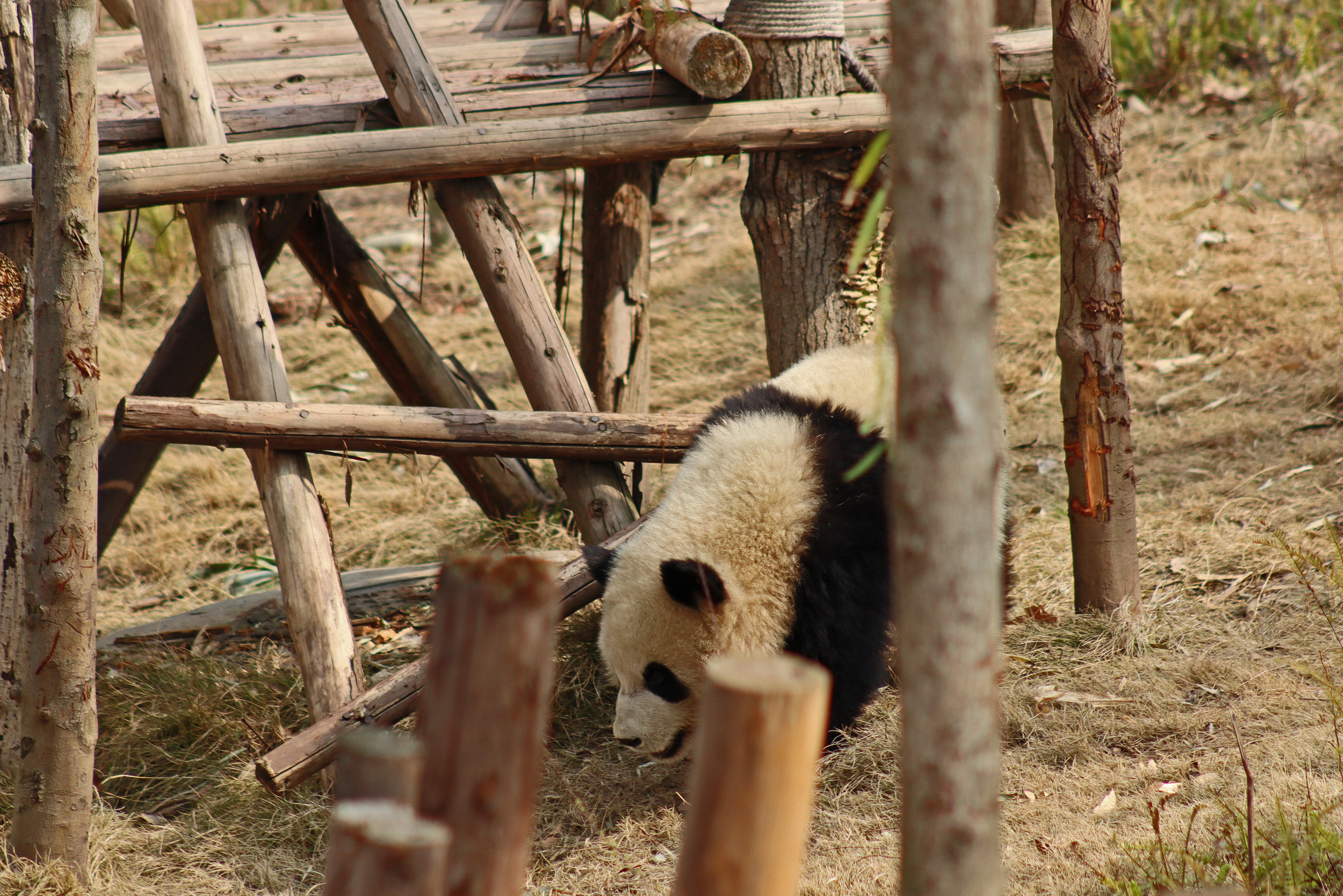Lun Wu is the panda with the very fluffy round face – he seems a bit more shy and reserved, preferring to stay closer to the back of the yard and more hidden amongst the plants. Jin Dou is the panda who spent most of the day all the way up in the tree and only coming down when the keeper threw in some more bamboo! It was very cute seeing bamboo being collected quickly and then taken all the way up the tree to eat, it’s some skill being able to carry a mouthful of bamboo stems all the way up a tree^ I got lucky towards the end of the afternoon and Lun Wu had settled onto the wooden chair in a relatively plant-less view in the middle of the yard and could get some good photos – this yard is large and has a lot of plants, so it was quite tricky to get photos if the pandas were further back or slightly hidden from view. Then I ended the day seeing both of them settled in for a snooze up the same tree despite there being plenty of tree choices – so cute =D