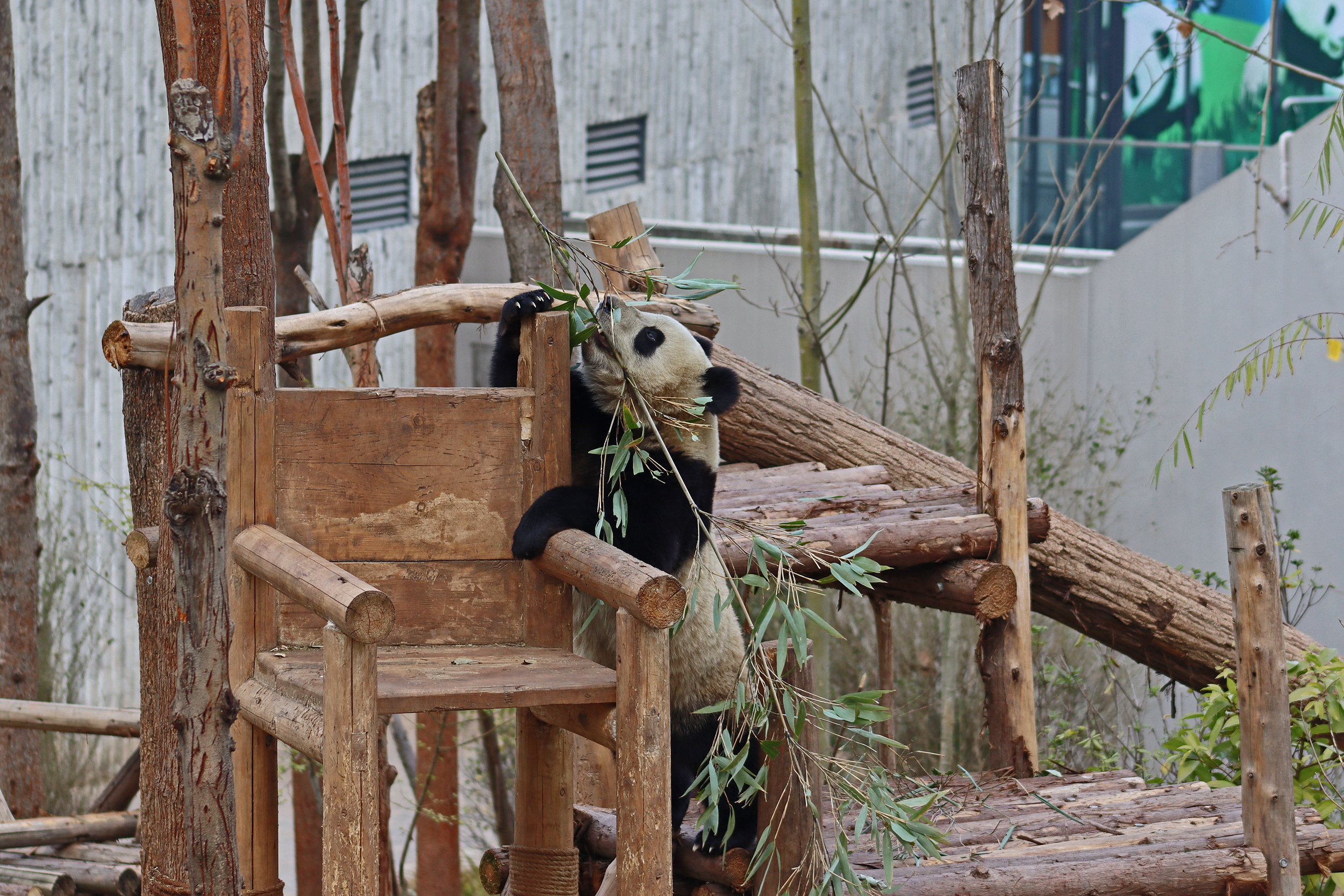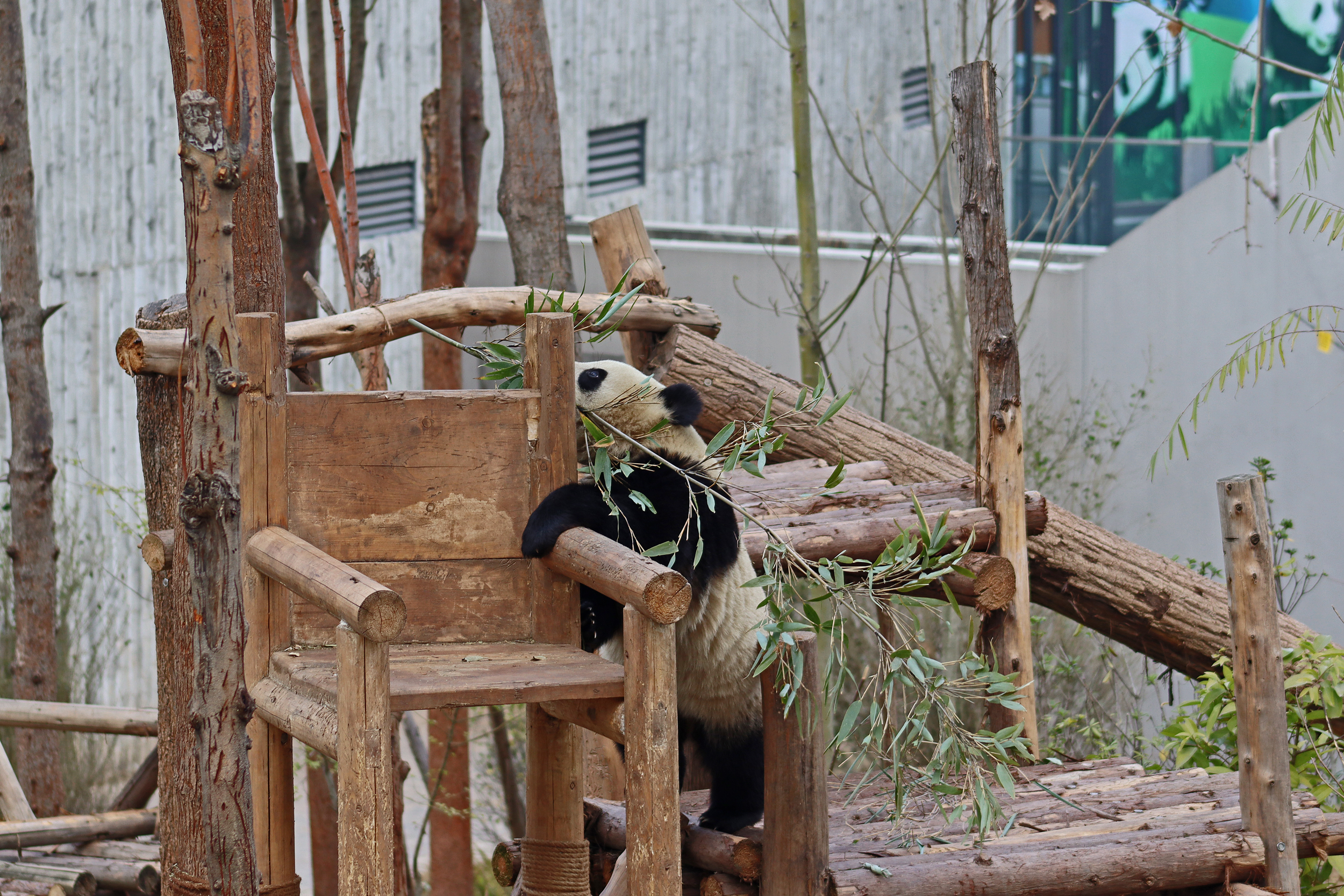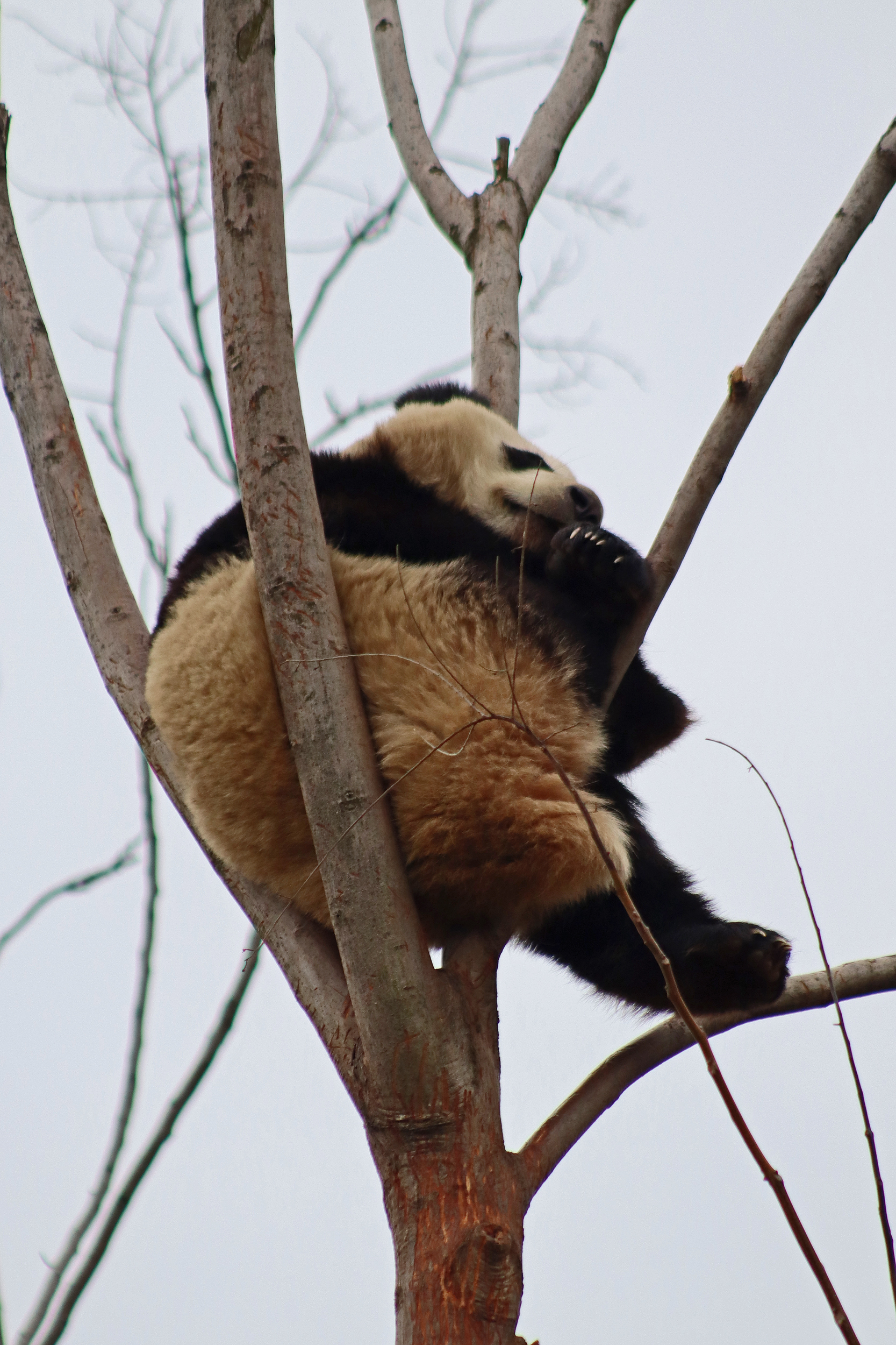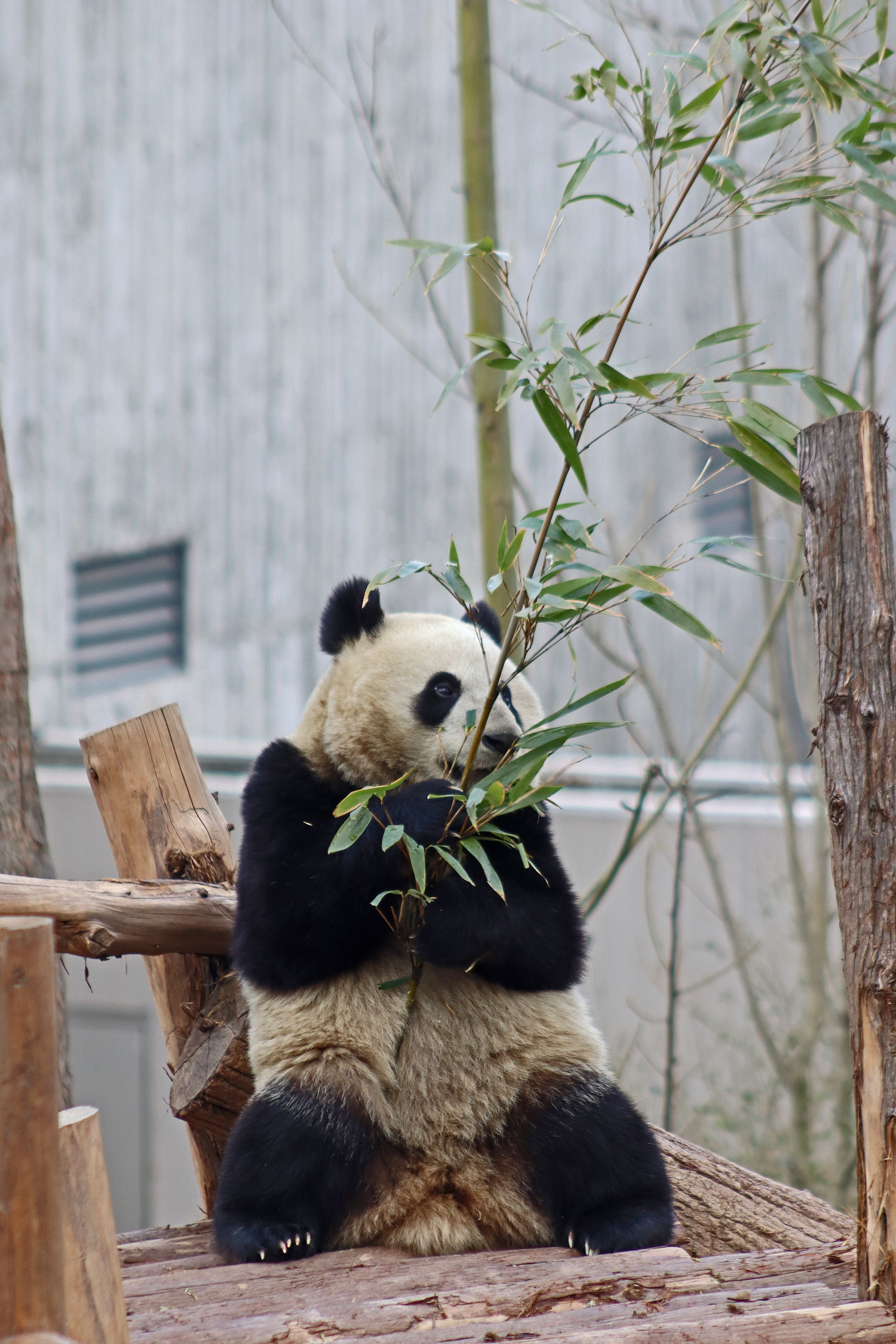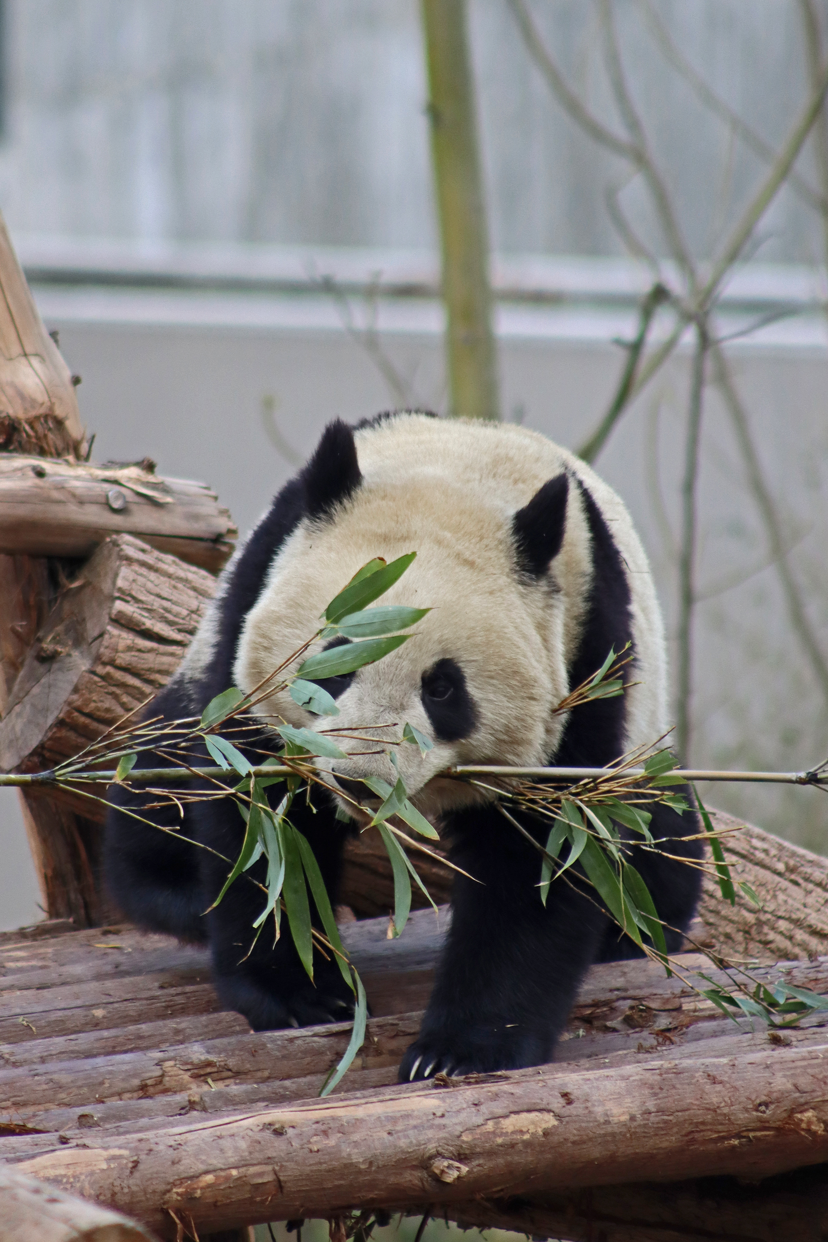 Lun Wu is the panda with the very fluffy round face – he seems a bit more shy and reserved, preferring to stay closer to the back of the yard and more hidden amongst the plants. Jin Dou is the panda who spent most of the day all the way up in the tree and only coming down when the keeper threw in some more bamboo! It was very cute seeing bamboo being collected quickly and then taken all the way up the tree to eat, it’s some skill being able to carry a mouthful of bamboo stems all the way up a tree^ I got lucky towards the end of the afternoon and Lun Wu had settled onto the wooden chair in a relatively plant-less view in the middle of the yard and could get some good photos – this yard is large and has a lot of plants, so it was quite tricky to get photos if the pandas were further back or slightly hidden from view. Then I ended the day seeing both of them settled in for a snooze up the same tree despite there being plenty of tree choices – so cute =D