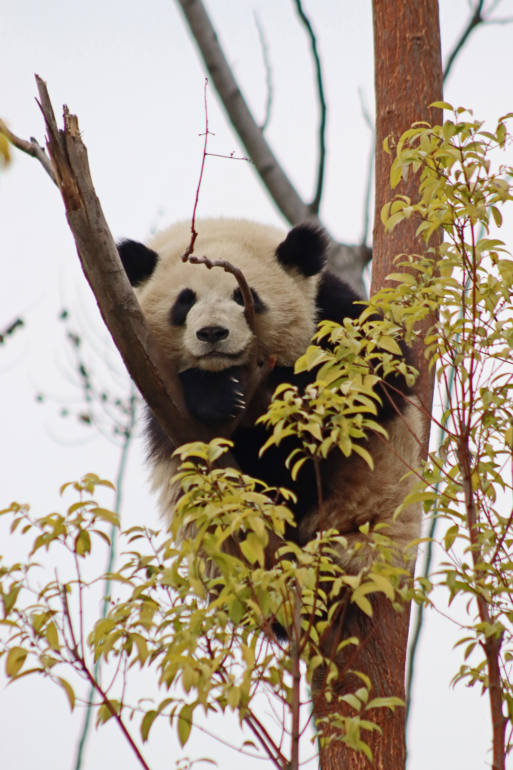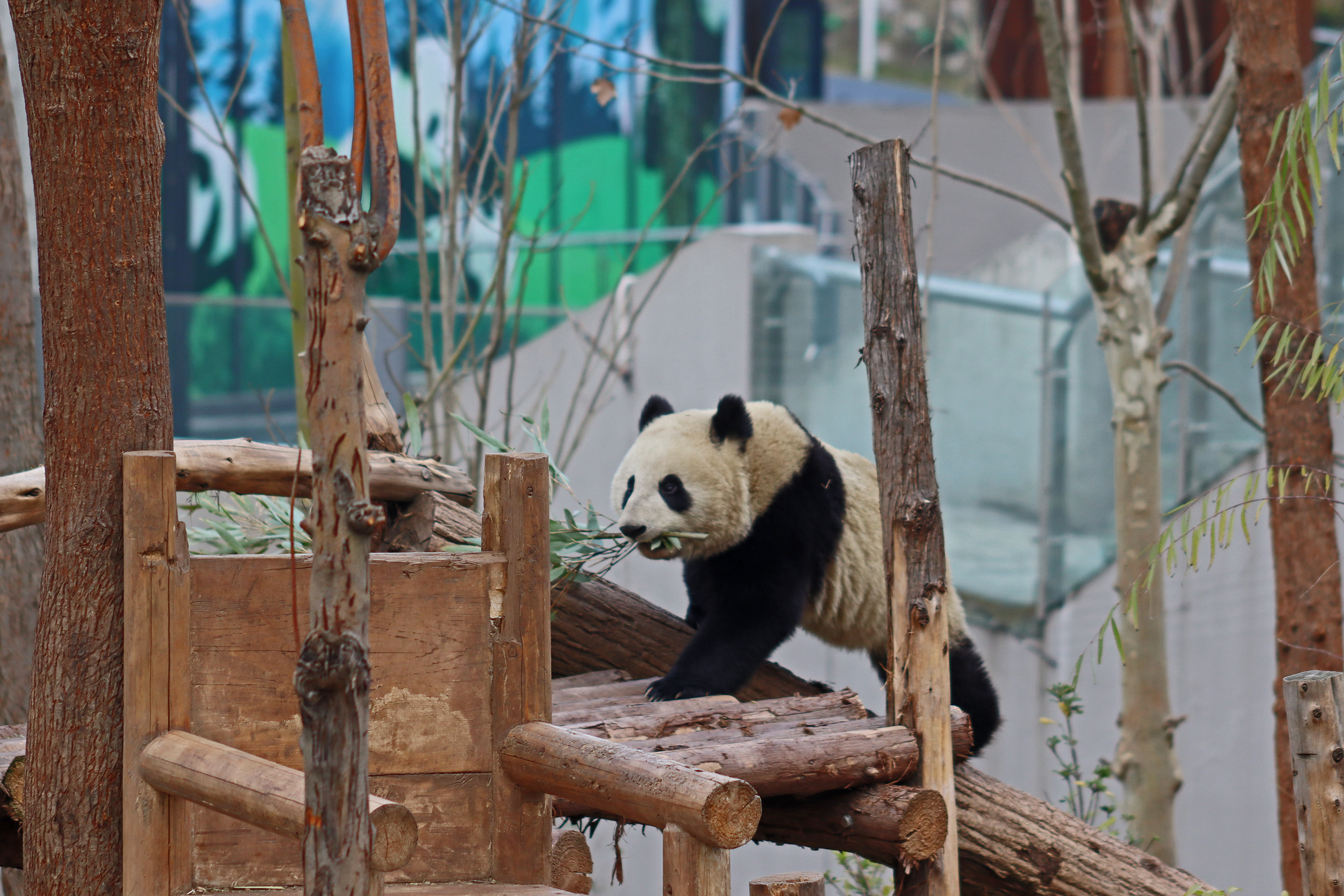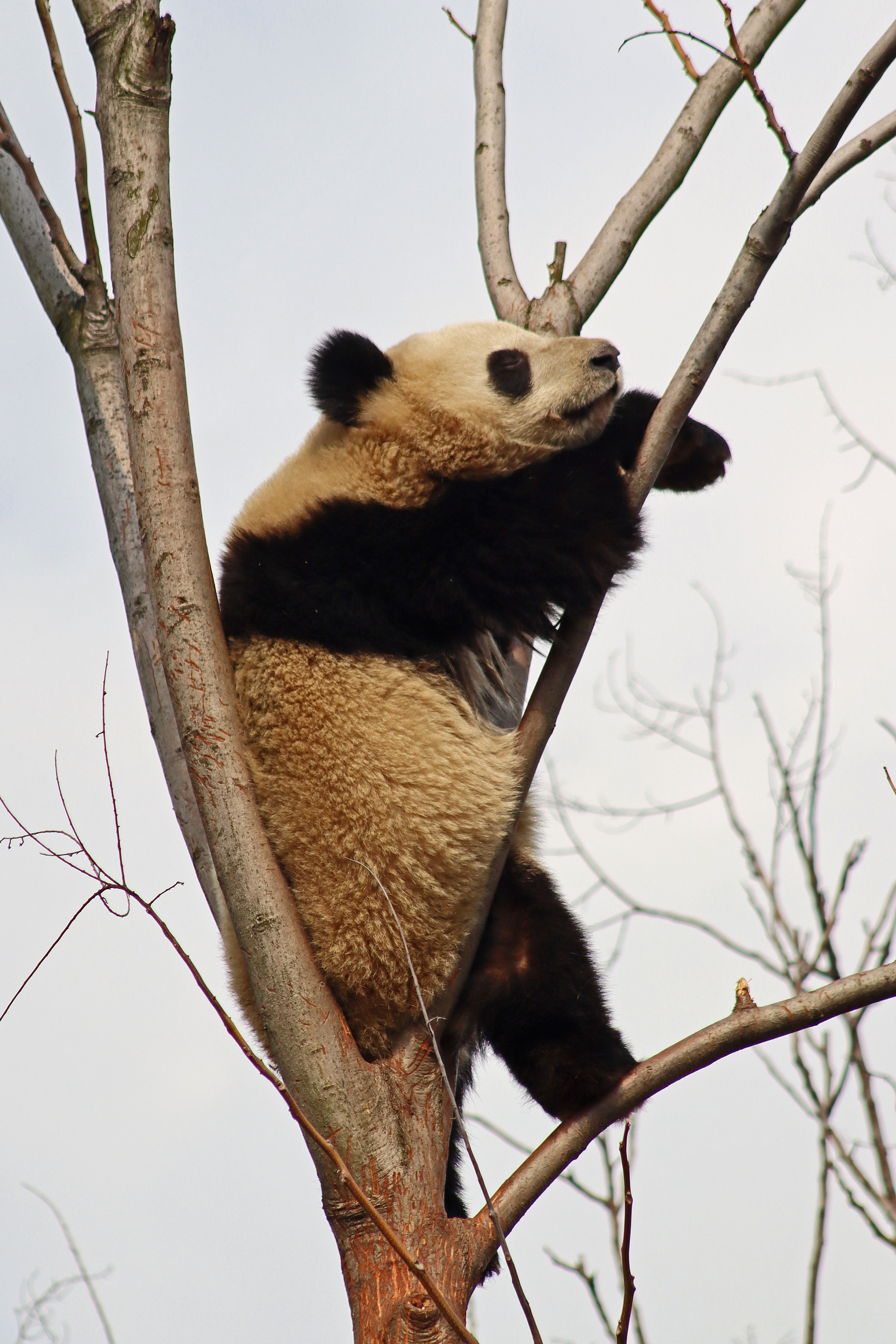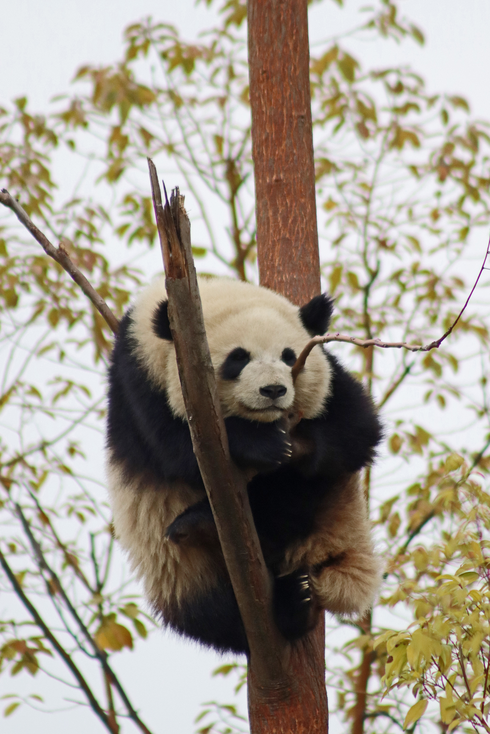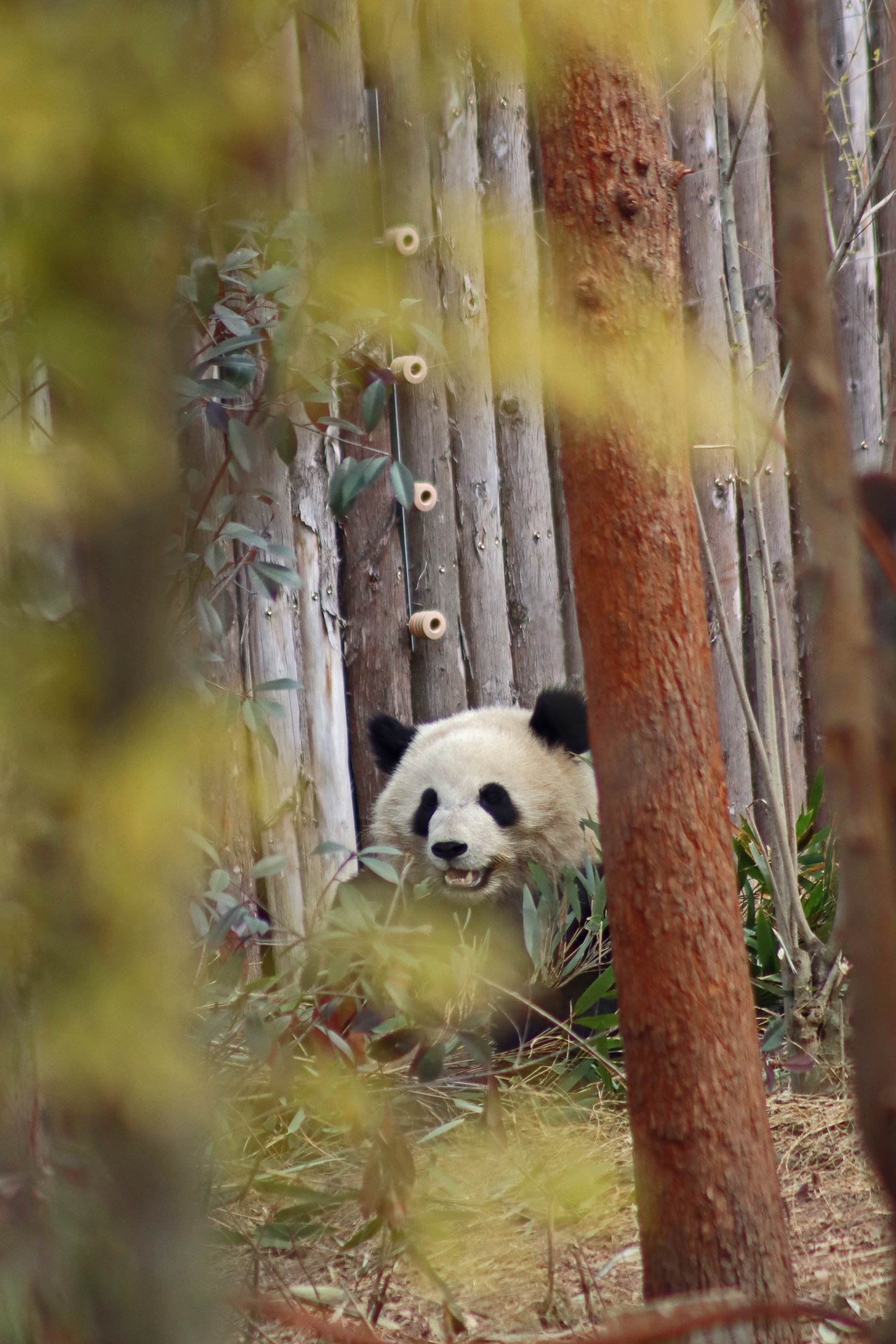 Lun Wu is the panda with the very fluffy round face – he seems a bit more shy and reserved, preferring to stay closer to the back of the yard and more hidden amongst the plants. Jin Dou is the panda who spent most of the day all the way up in the tree and only coming down when the keeper threw in some more bamboo! It was very cute seeing bamboo being collected quickly and then taken all the way up the tree to eat, it’s some skill being able to carry a mouthful of bamboo stems all the way up a tree^ I got lucky towards the end of the afternoon and Lun Wu had settled onto the wooden chair in a relatively plant-less view in the middle of the yard and could get some good photos – this yard is large and has a lot of plants, so it was quite tricky to get photos if the pandas were further back or slightly hidden from view. Then I ended the day seeing both of them settled in for a snooze up the same tree despite there being plenty of tree choices – so cute =D