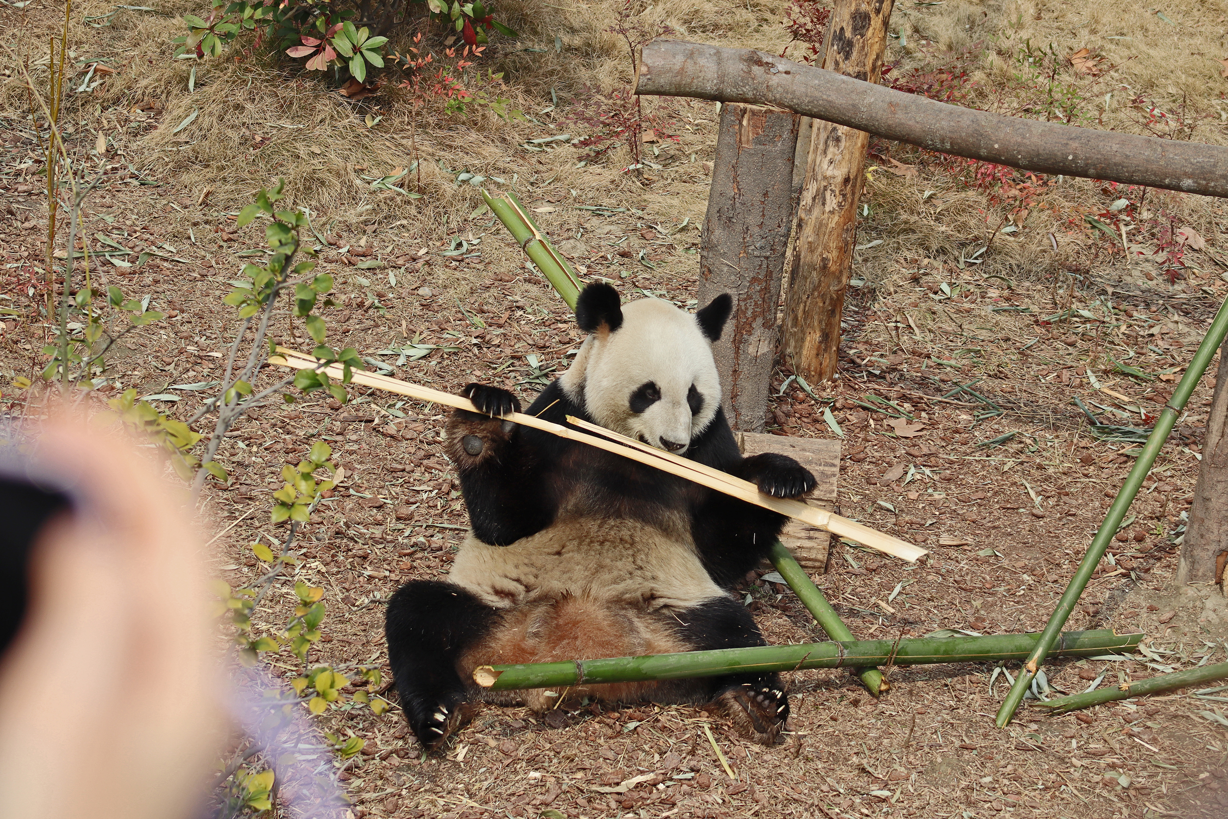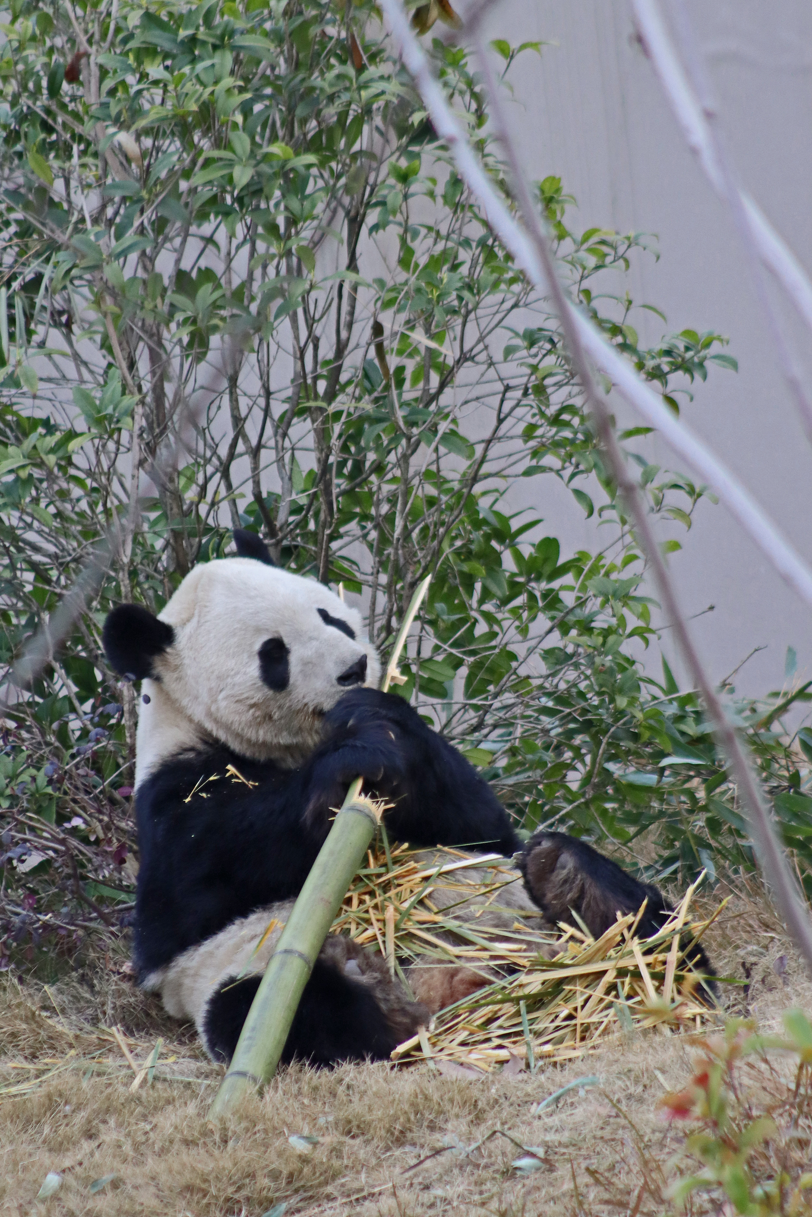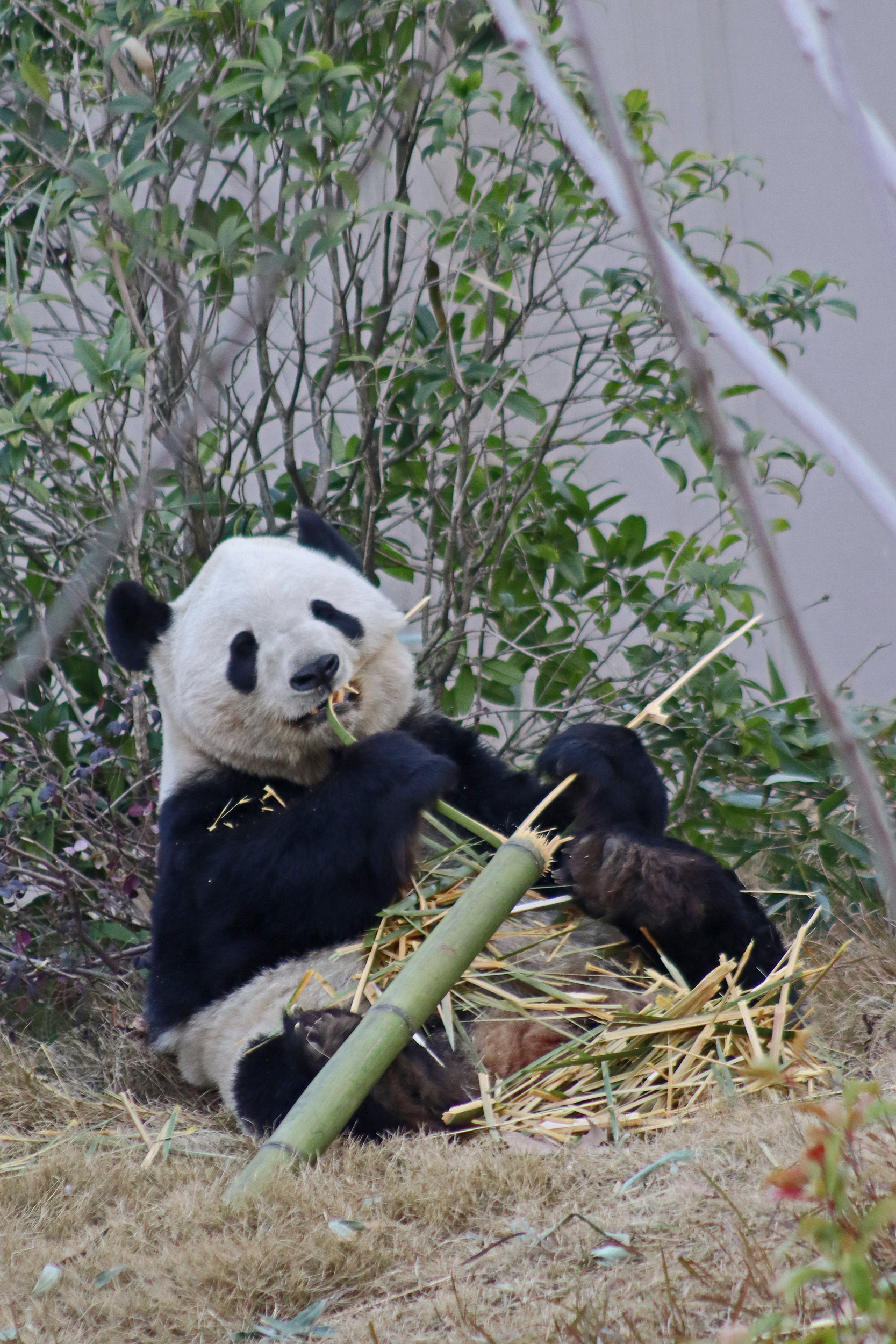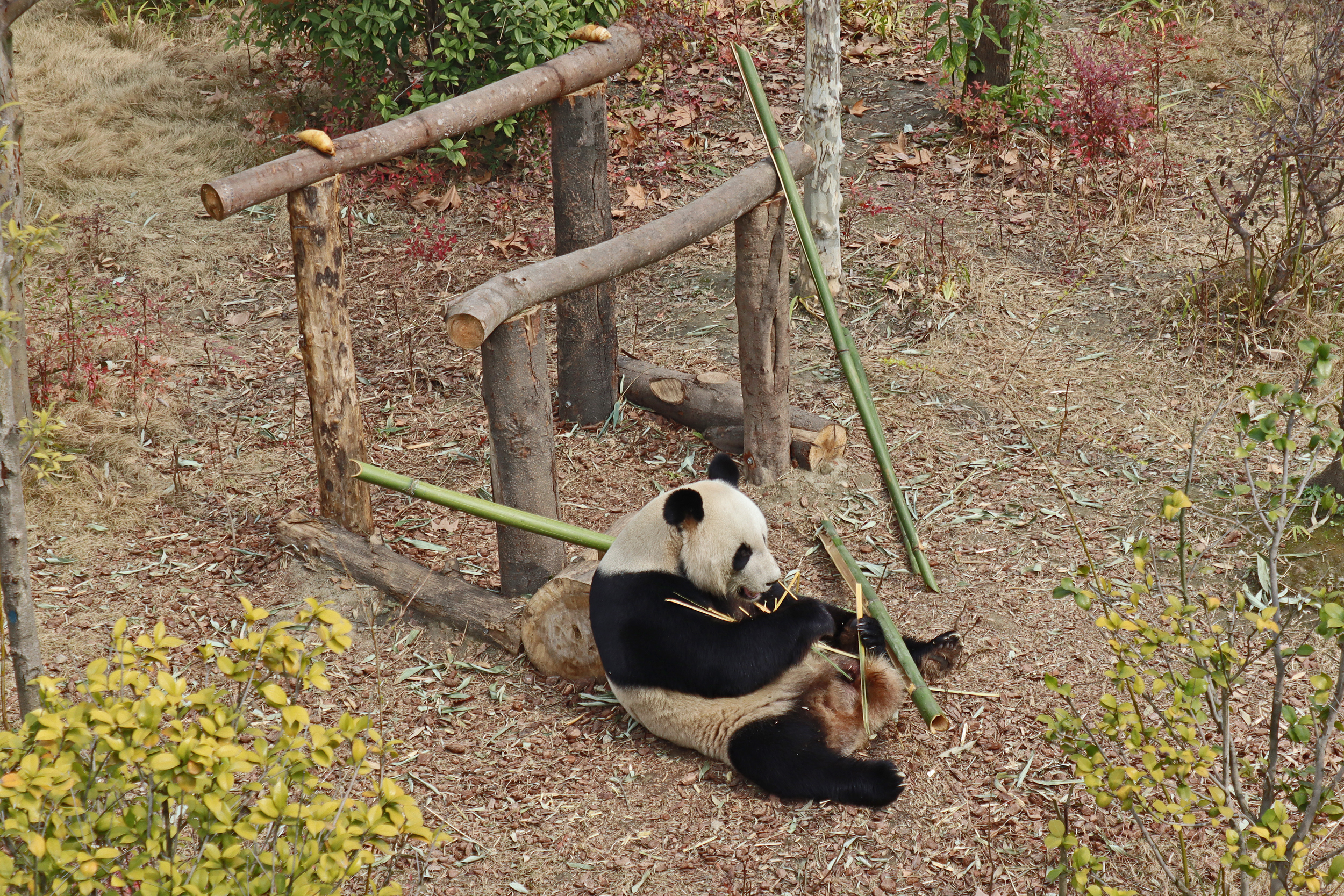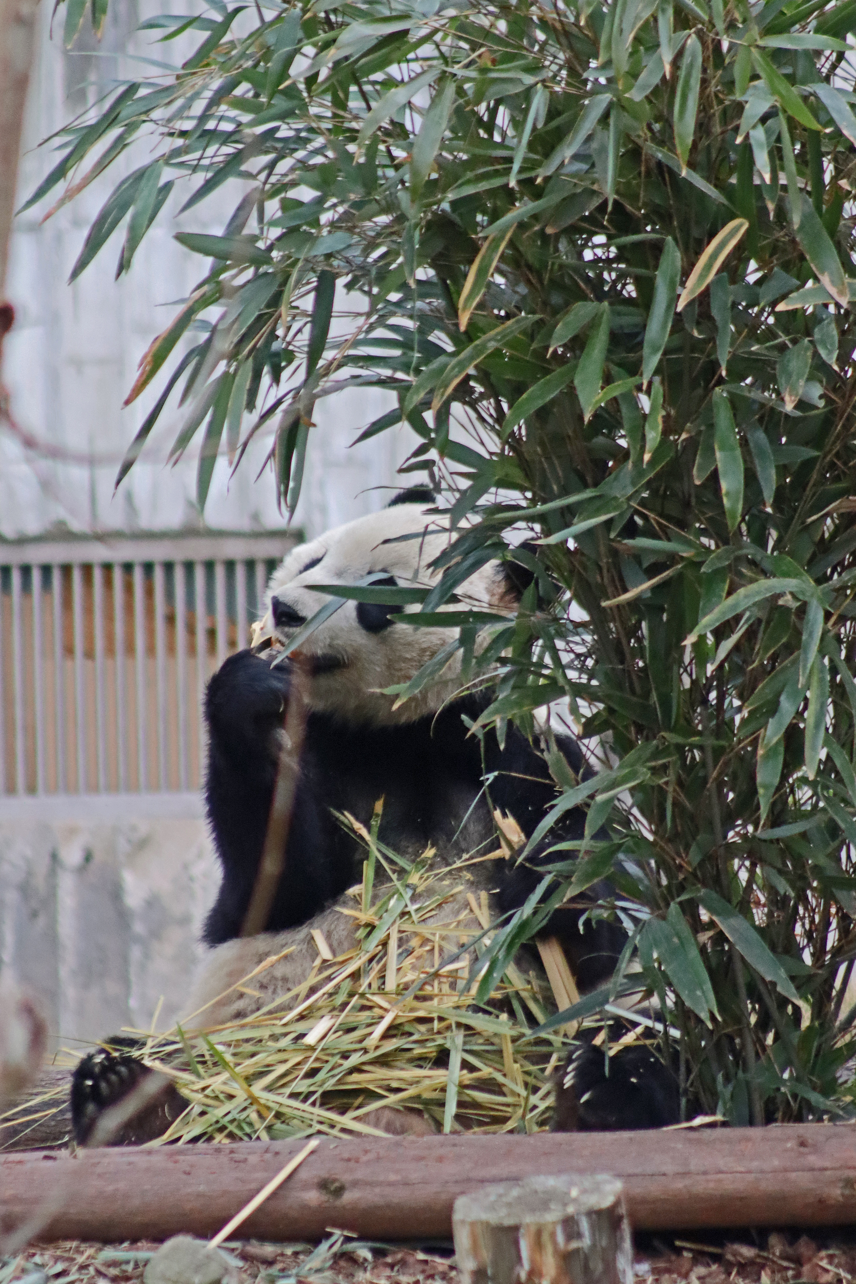 Jing Jing 晶晶 was the panda ‘yard-sharing’ with Bing Bing, and I ended up seeing Jing Jing on the first day and the morning of the second day of my visit. She’s an older girl at 19 years old and was thoroughly enjoying her bamboo each time that I saw her! I liked this yard as it was a little off the beaten track, round a corner that most people didn’t seem to go around, so it was a bit quieter here. She has had quite a calm life, having been born, and always lived, here at the Chengdu Base – despite a page online saying she has lived at a few different Chinese zoos and also the Ya’an Bifengxia Base (the studbook doesn’t lie!). She perhaps has been involved in the breeding season this year, living in one of the nursery houses – her last cub was born in 2017 (Jing Liang, who I actually saw on my last trip!) and before that she had twins in 2015. She was a lovely panda to watch and hopefully I’ll see her again