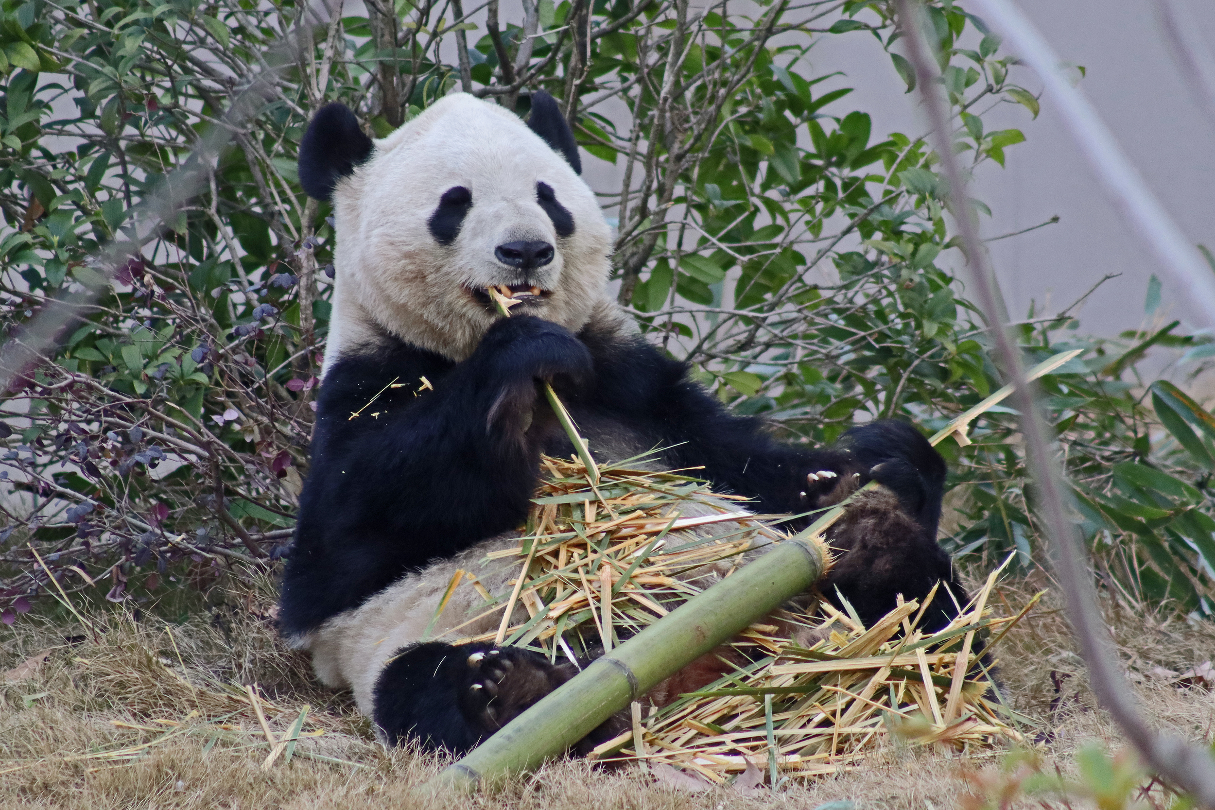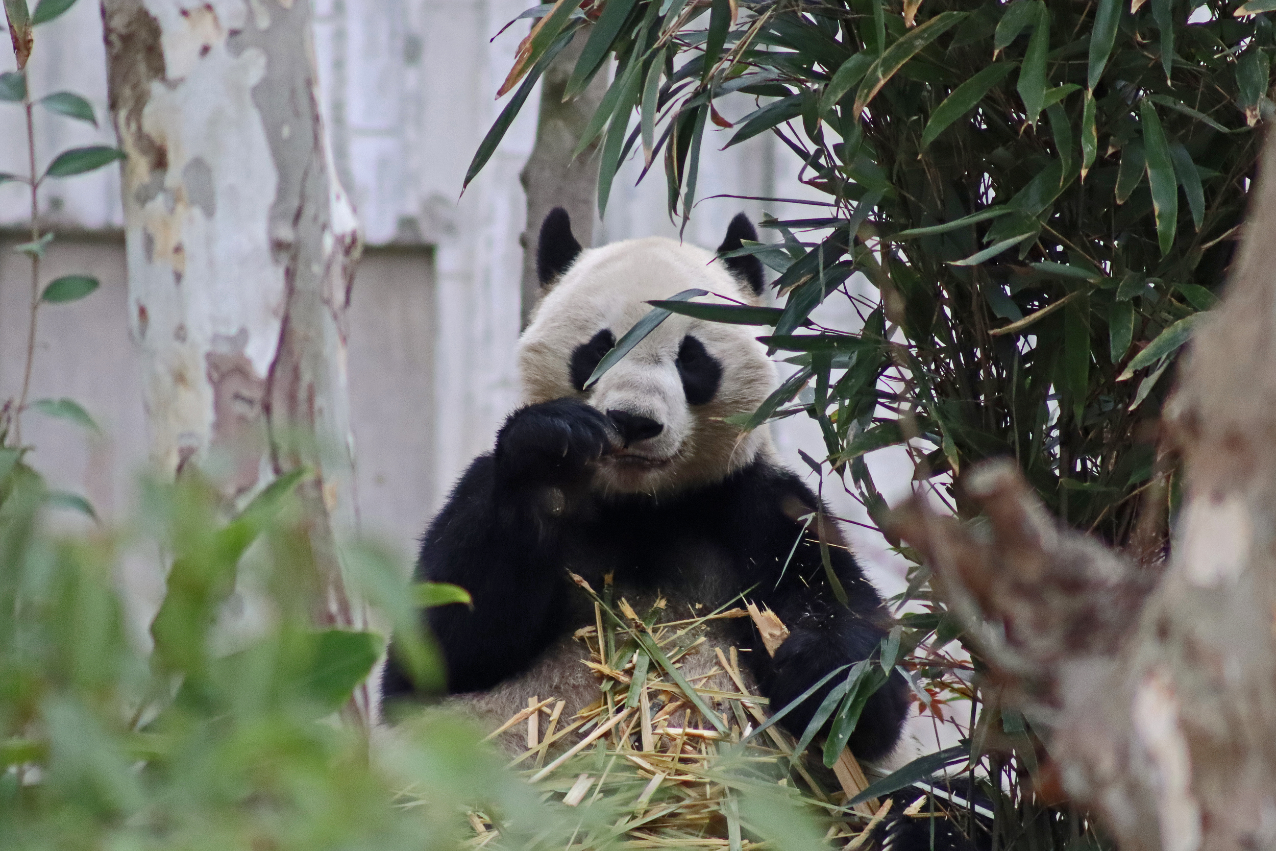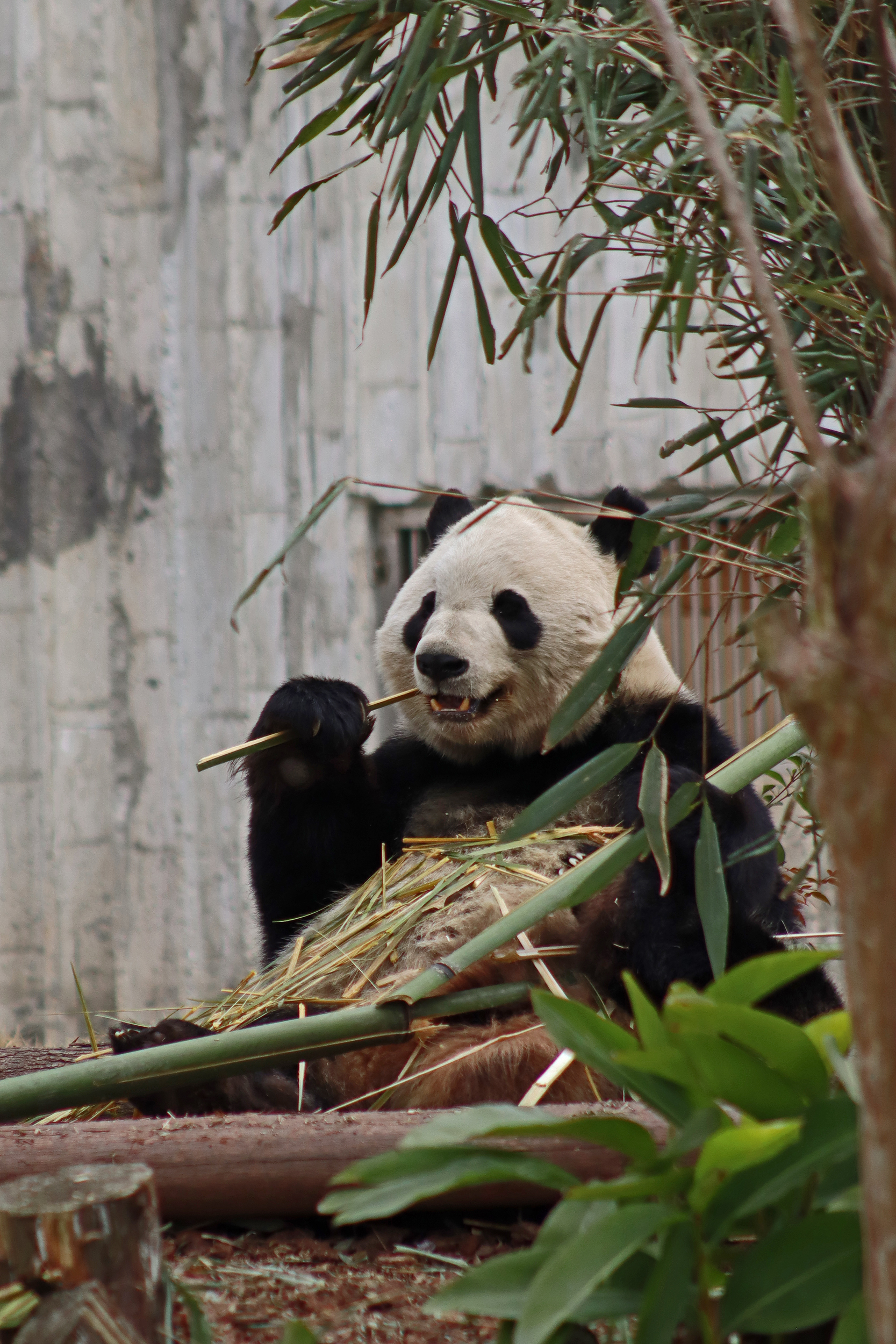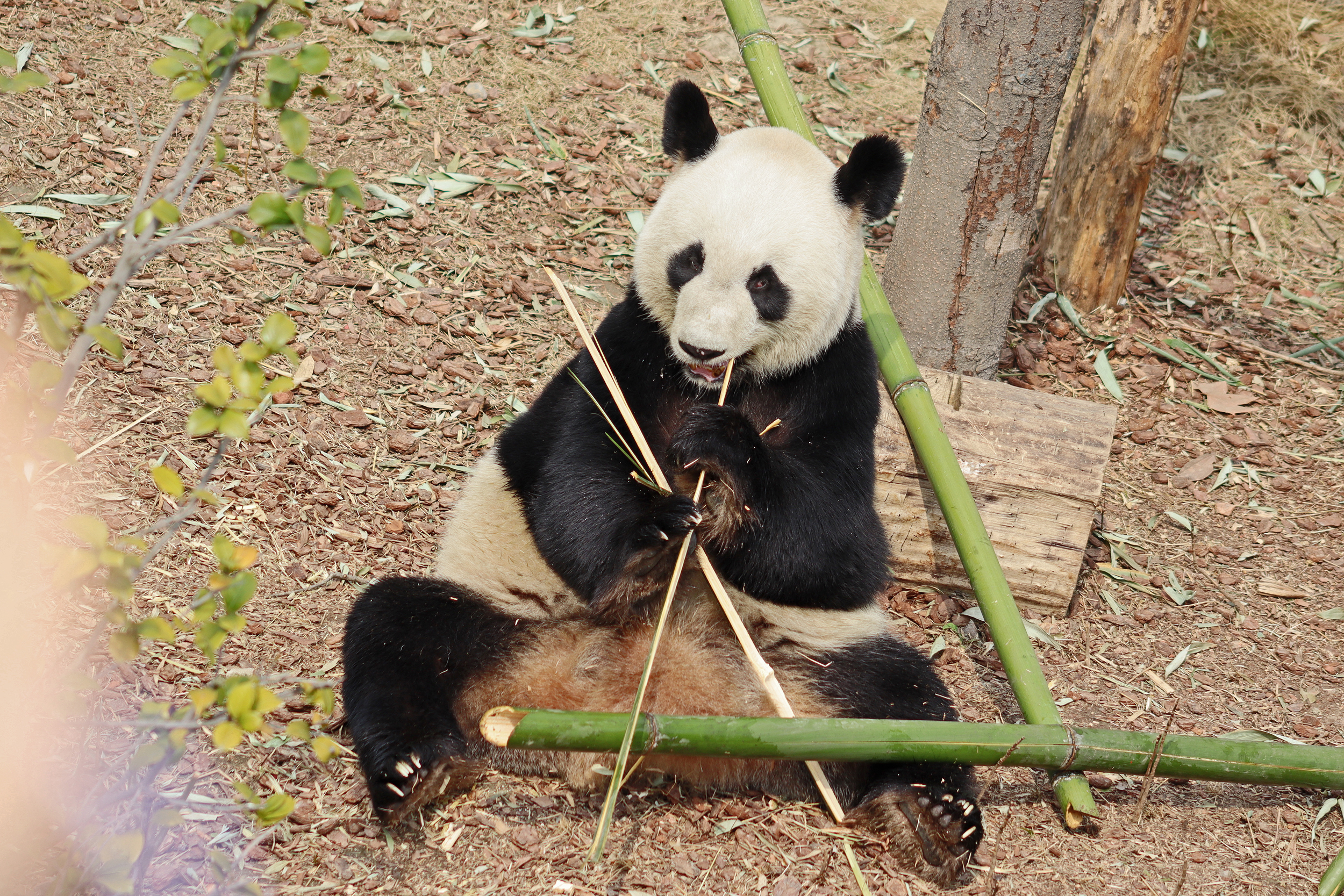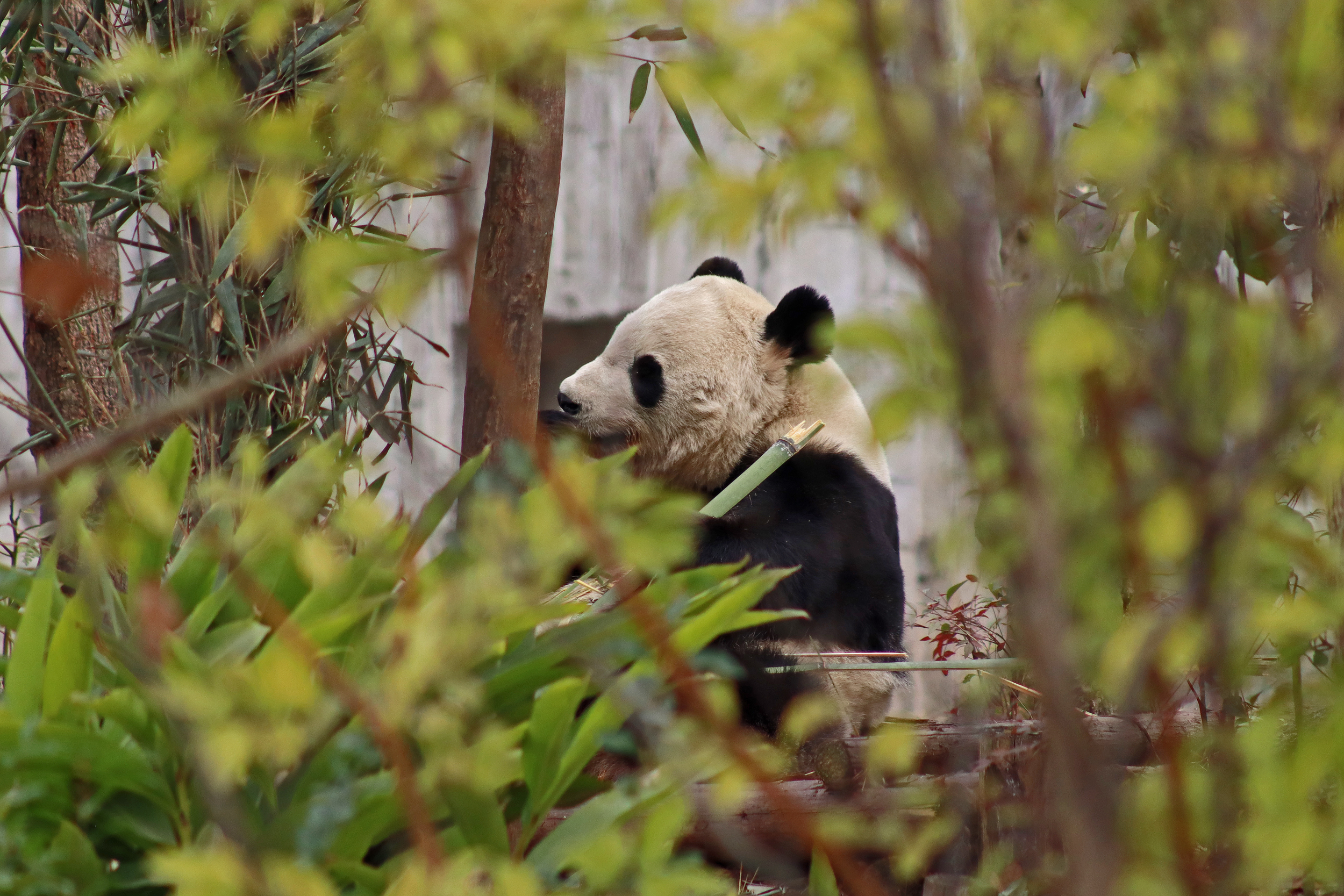 Jing Jing 晶晶 was the panda ‘yard-sharing’ with Bing Bing, and I ended up seeing Jing Jing on the first day and the morning of the second day of my visit. She’s an older girl at 19 years old and was thoroughly enjoying her bamboo each time that I saw her! I liked this yard as it was a little off the beaten track, round a corner that most people didn’t seem to go around, so it was a bit quieter here. She has had quite a calm life, having been born, and always lived, here at the Chengdu Base – despite a page online saying she has lived at a few different Chinese zoos and also the Ya’an Bifengxia Base (the studbook doesn’t lie!). She perhaps has been involved in the breeding season this year, living in one of the nursery houses – her last cub was born in 2017 (Jing Liang, who I actually saw on my last trip!) and before that she had twins in 2015. She was a lovely panda to watch and hopefully I’ll see her again