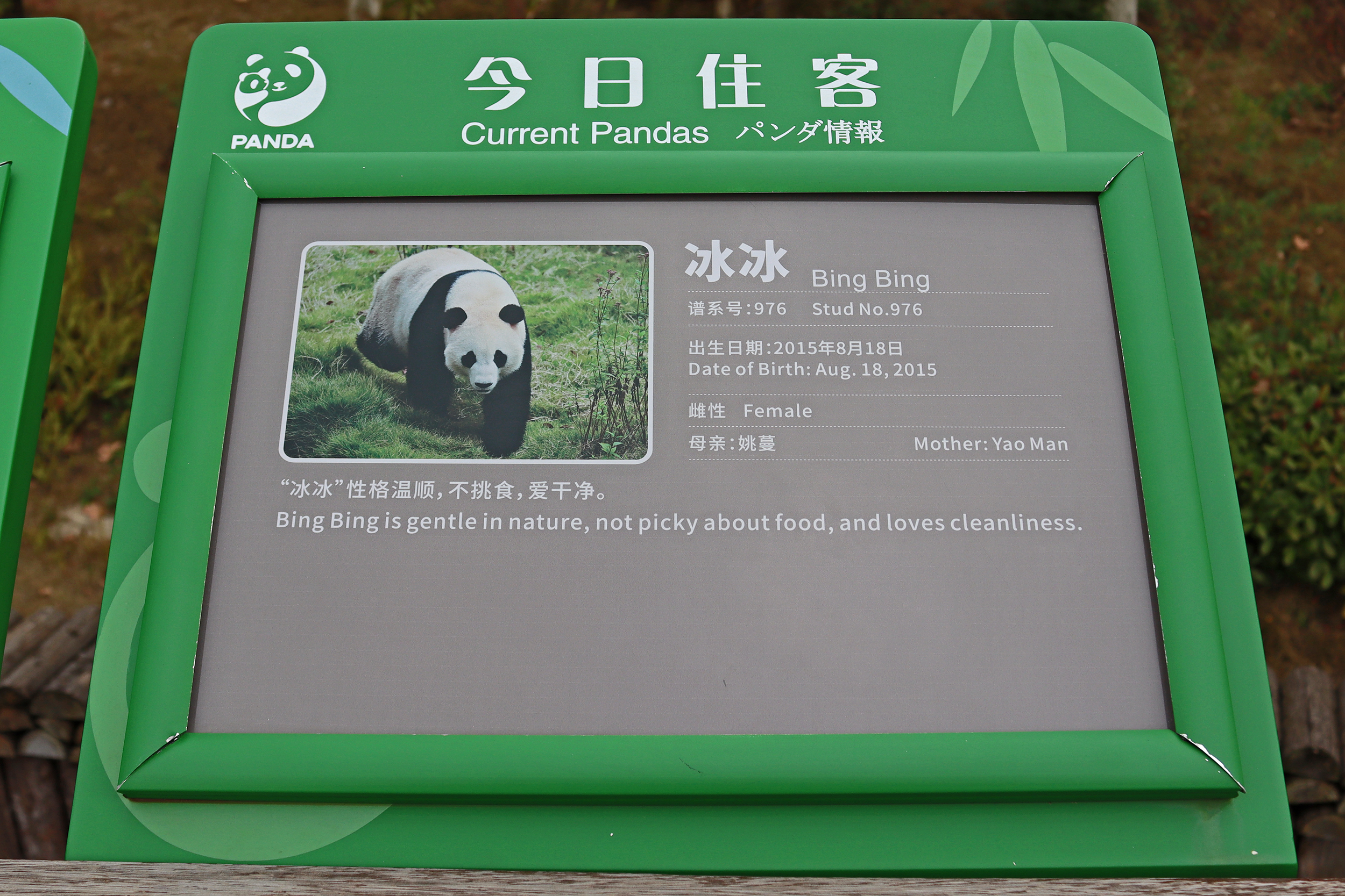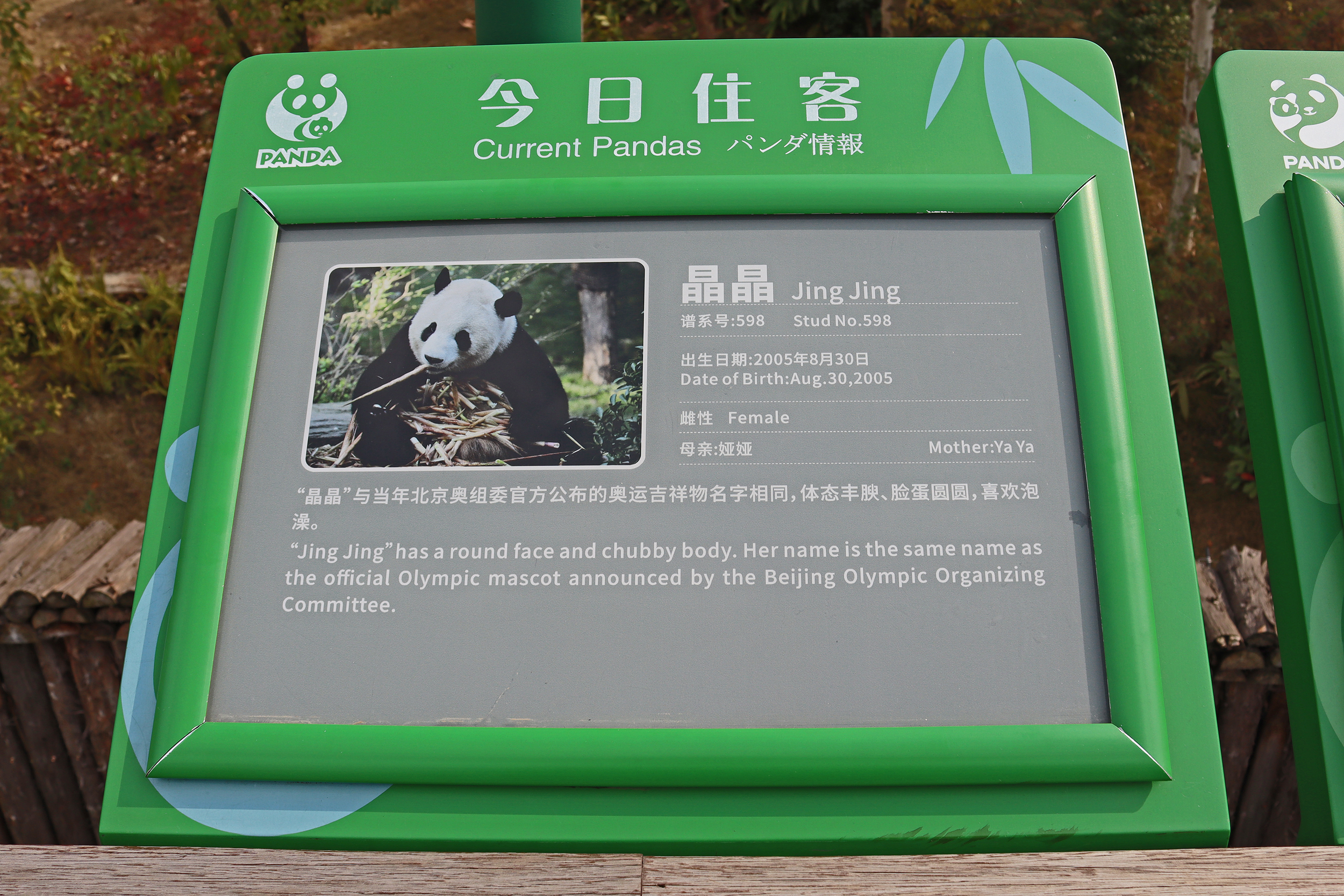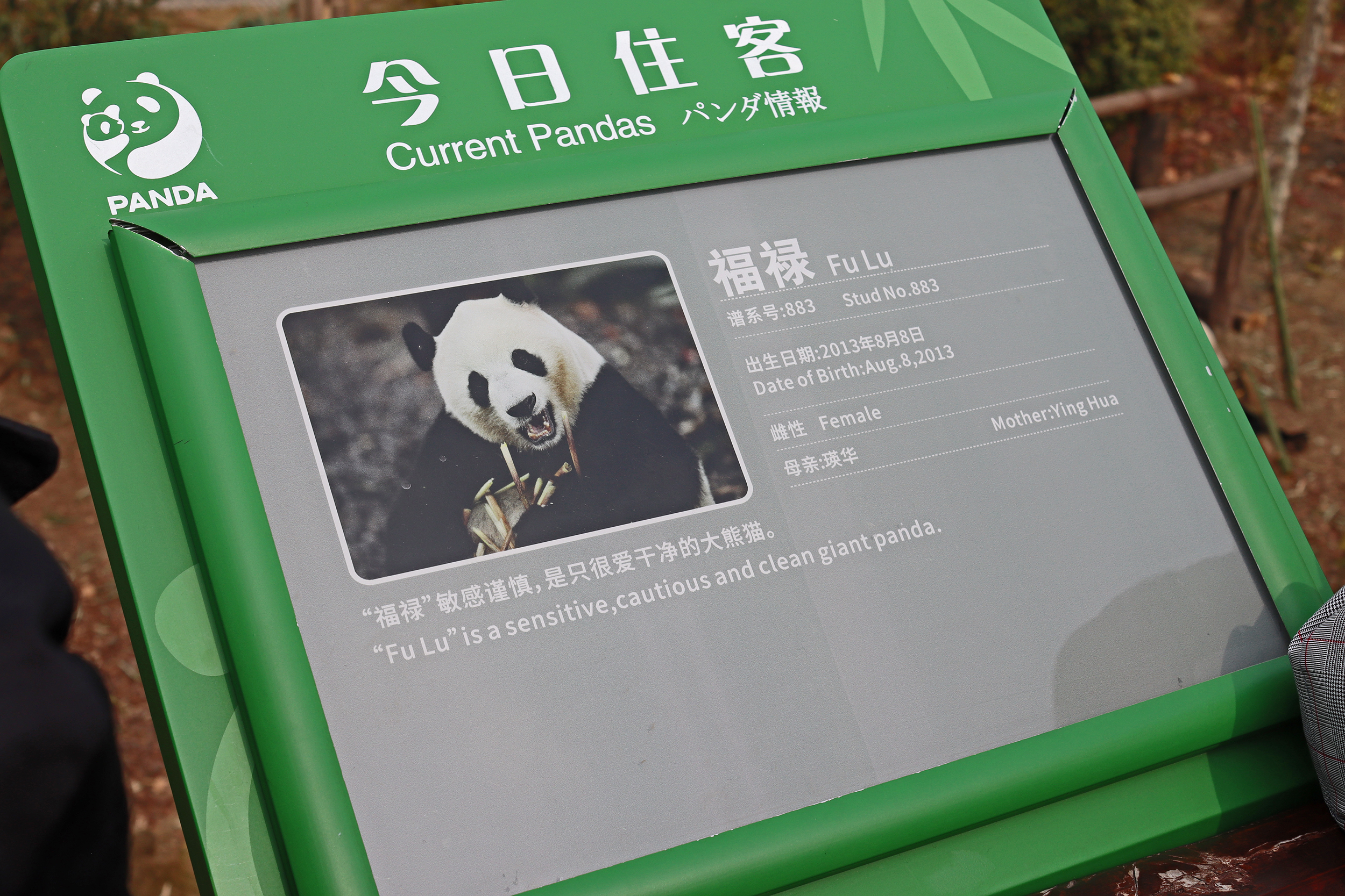 The first panda I saw was Fu Lu 福禄, an 11 year old female – I only saw her on the first day of my visit and only quite briefly while she was eating. And she was very popular, it was quite busy at the viewing space and I had to fight a little to hold my spot. I found she looks quite distinct, and more like a CCRCGP panda, and seeing her mothers name is Ying Hua, I was sure her name was in my research from either Dujiangyan or Bifengxia bases – well that’s correct. Fu Lu was born at the Bifengxia base however Beijing Zoo had ownership of her and she moved there in 2014, so perhaps I saw her on my 2017 and/or 2018 trips there. In 2019 she was then exchanged with Chengdu Base where she moved and joined the breeding programme. She has been successful in the programme having had pregnancies in 2020 and 2022. Sadly one of her 2022-born twins, Fu Ru, passed away in 2024. The other twin Fu Wan is widely known – she was born with a congenital spinal condition which has impacted her hind legs, luckily she seems to be doing well with specialist help and care.