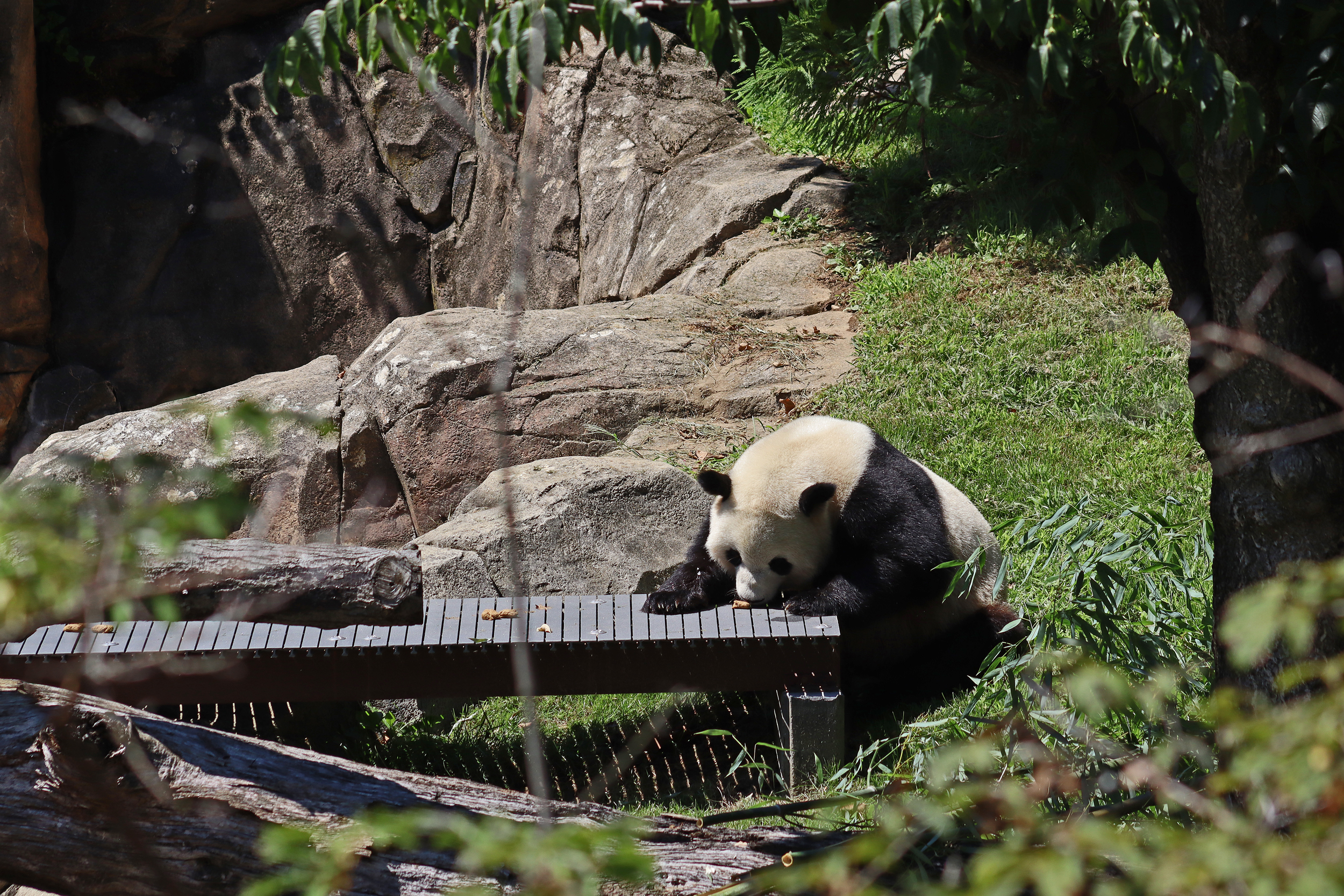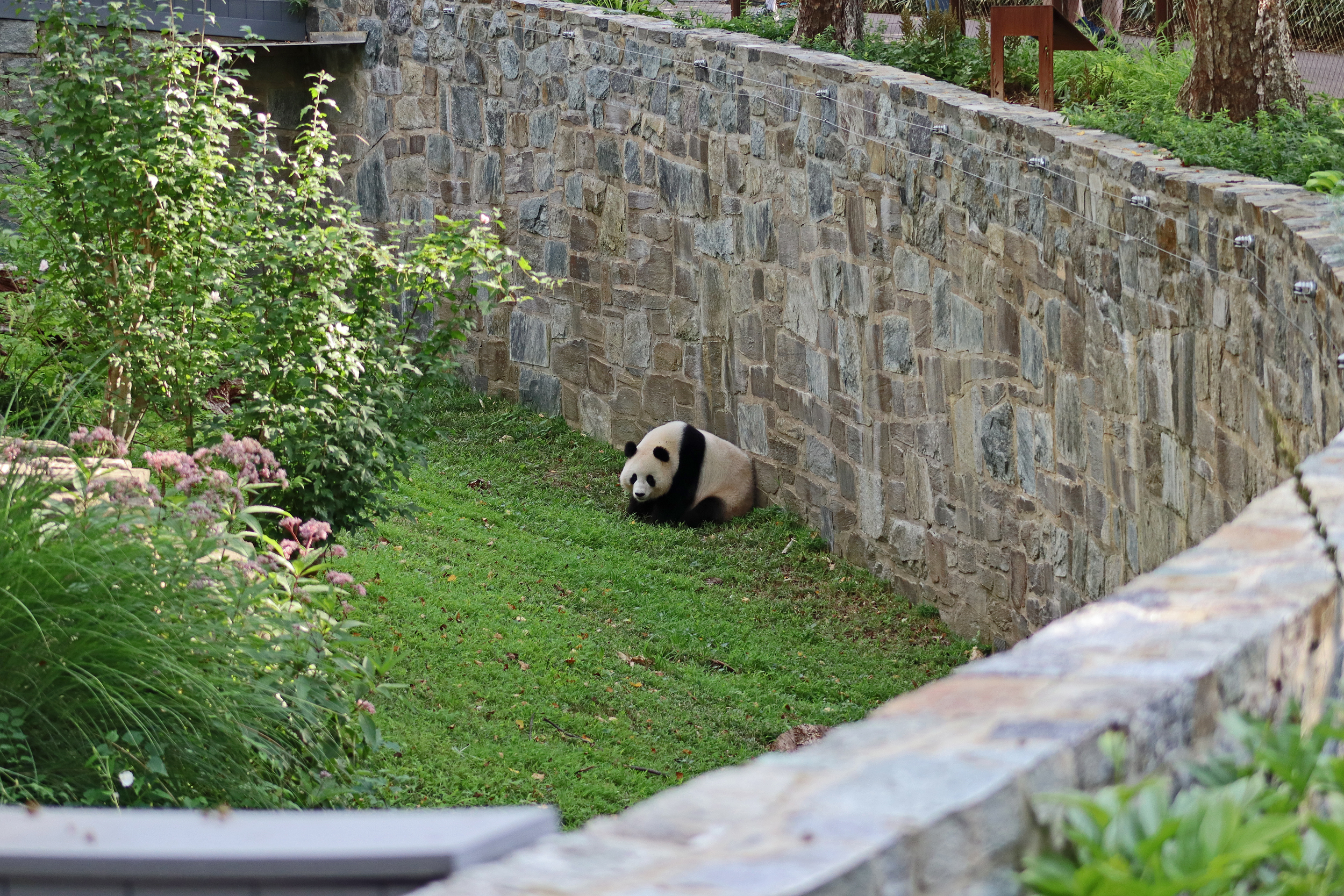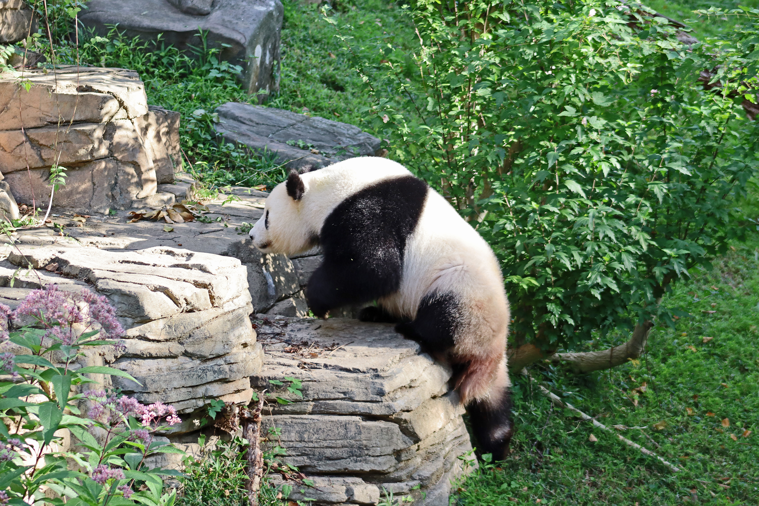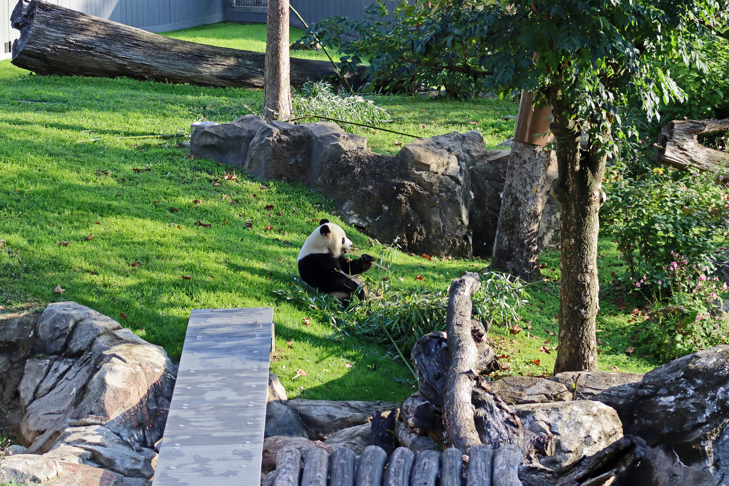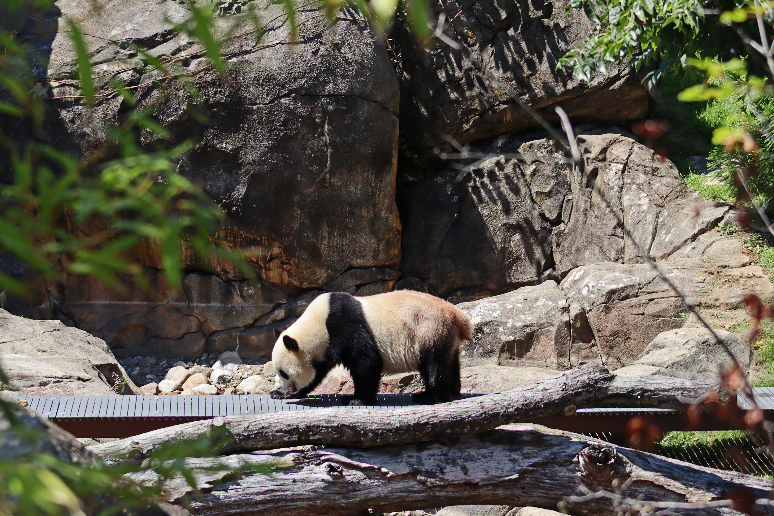 Overall the panda area at the Smithsonian National Zoo hasn’t changed too much – although there were a few things I didn’t remember from before. I think maybe last time there was some renovation work going on so we couldn’t view the pandas from the overlook or the path coming from the Asia Trail direction because I don’t remember this at all and I really had a great view from up there on this trip. There is a one-way system in place at the panda habitat, first you go past the outdoor yards – these had some new climbing frames since my last visit. There are 3 yards, 2 of which were connected when I was there so the panda could enjoy either space, the 3rd yard was much larger, so overall both of them had around the same amount of outside space. Lots of trees and foliage, and of course enrichment opportunities. Most of the outdoor viewing is barrier-free, but there is one section at two of the yards where you can view through glass. After viewing the outside, you work your way around to the building – depending on time and crowds there may be a line to get in. I was there on a weekend and found it to be a bit quieter in the mornings and I needed to line up in the afternoons, however the line was never very long and I don’t think I waited more than 15 minutes or so. Inside there are 4 separate spaces, however these are currently set up into 2 linked spaces for each panda, again they have some indoor environment options as well. In here there were new climbing frames and I think some of the previous rock-work had also changed.