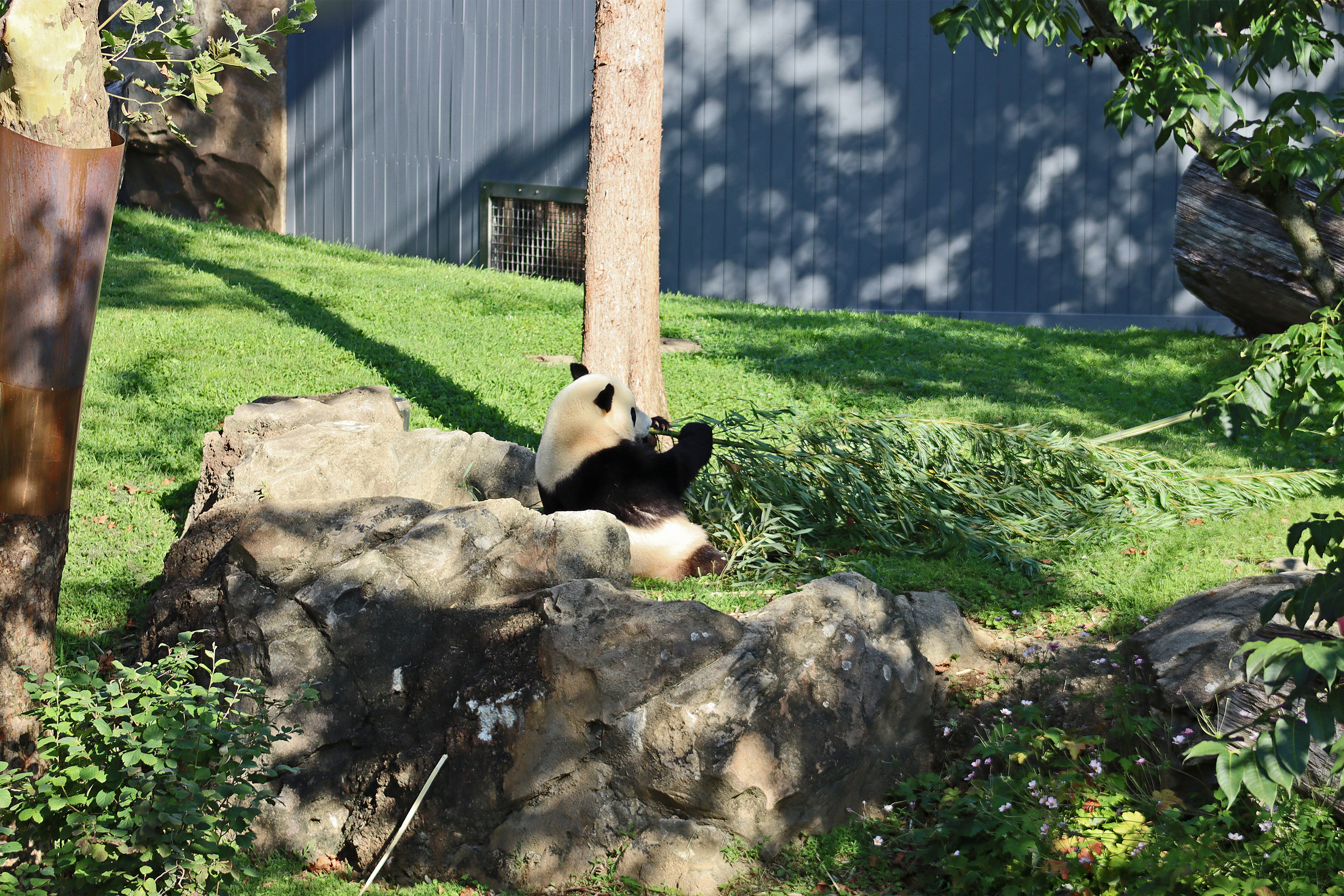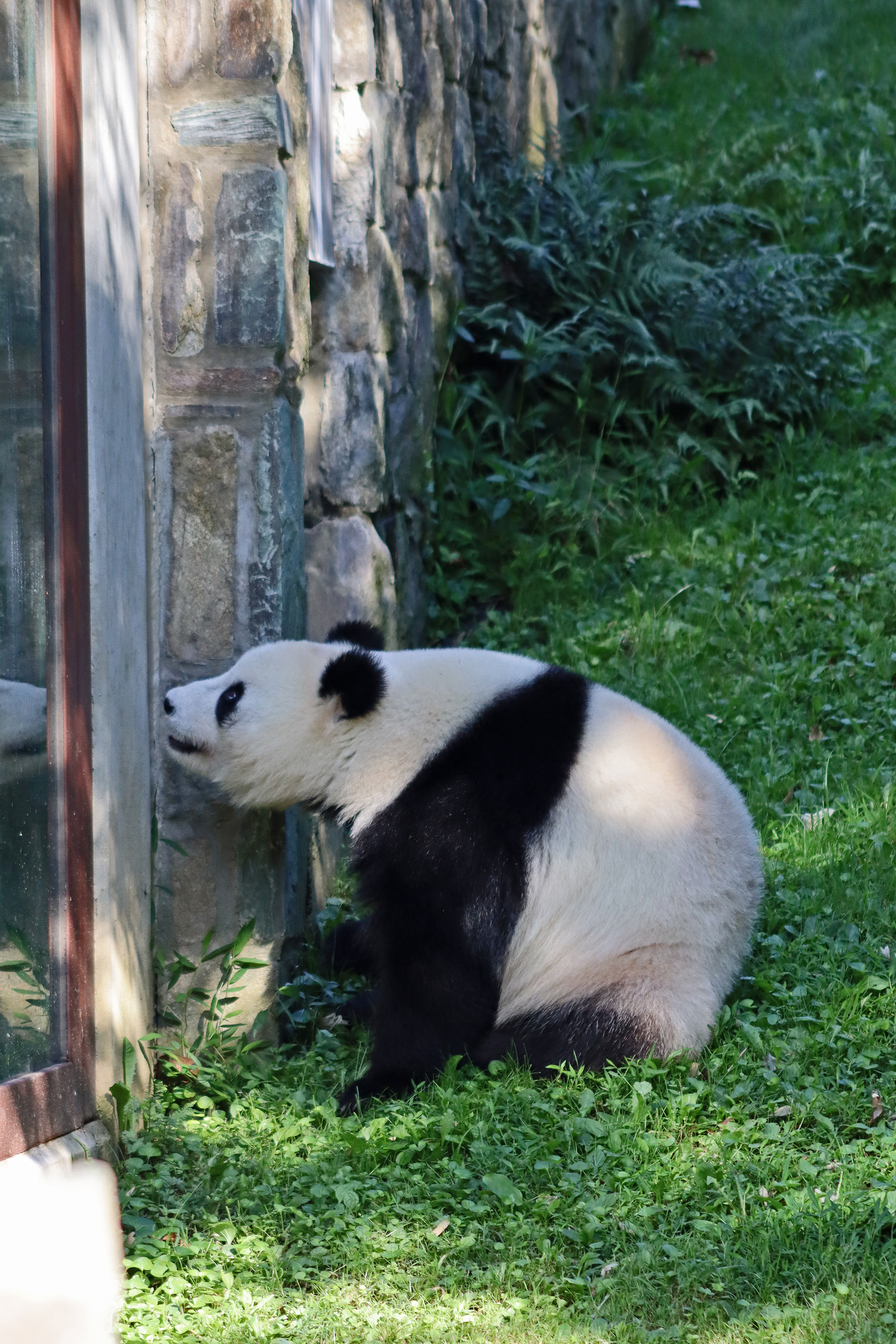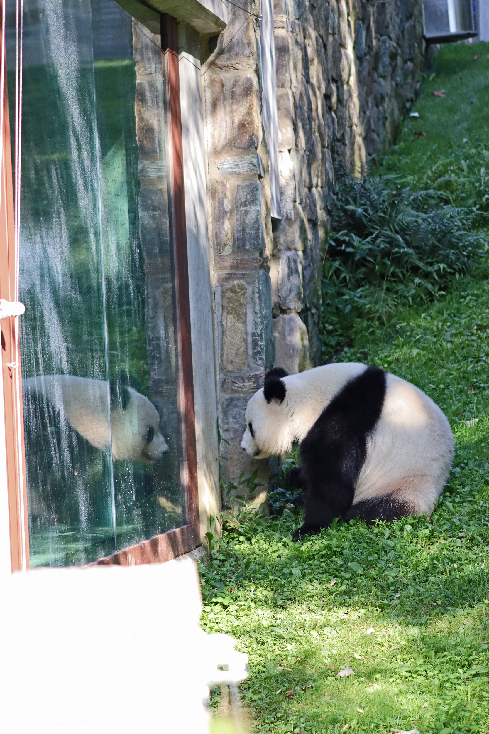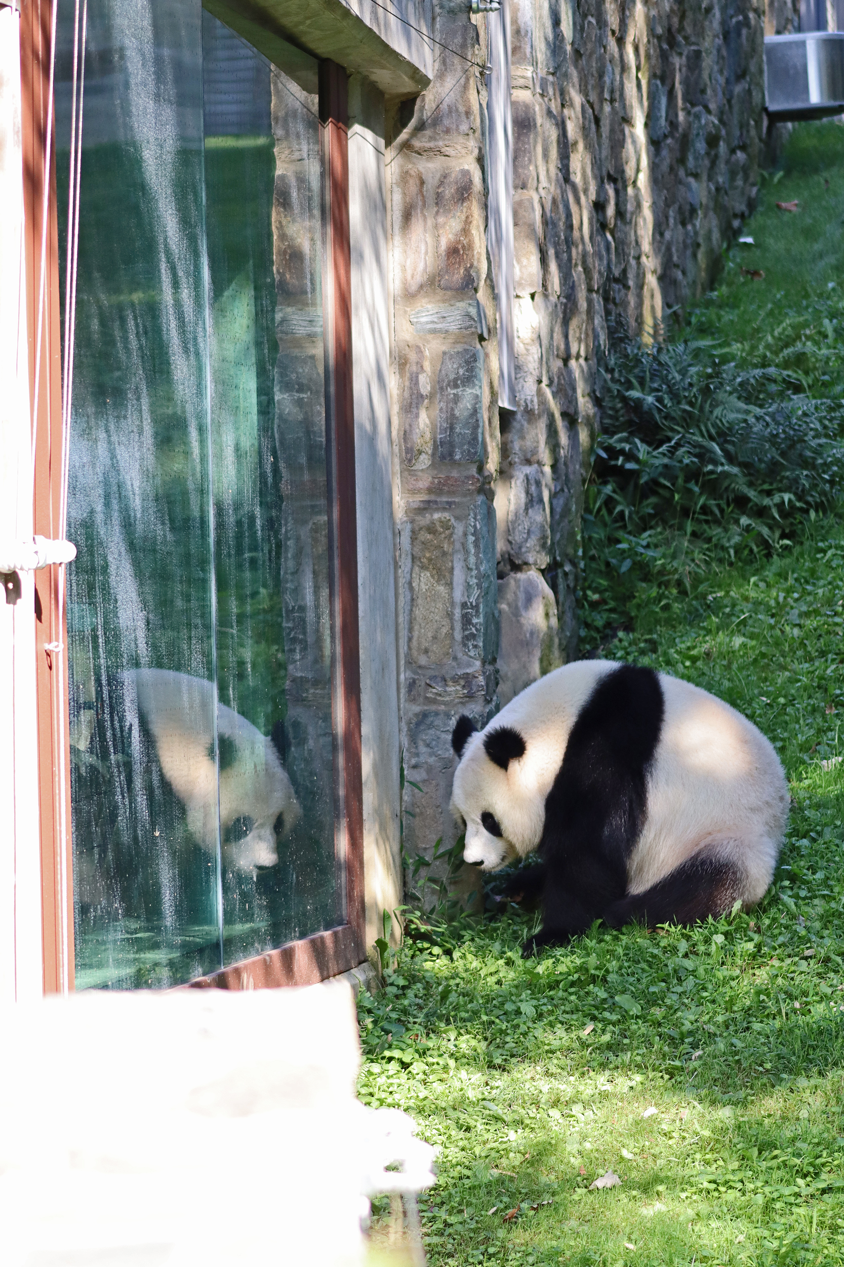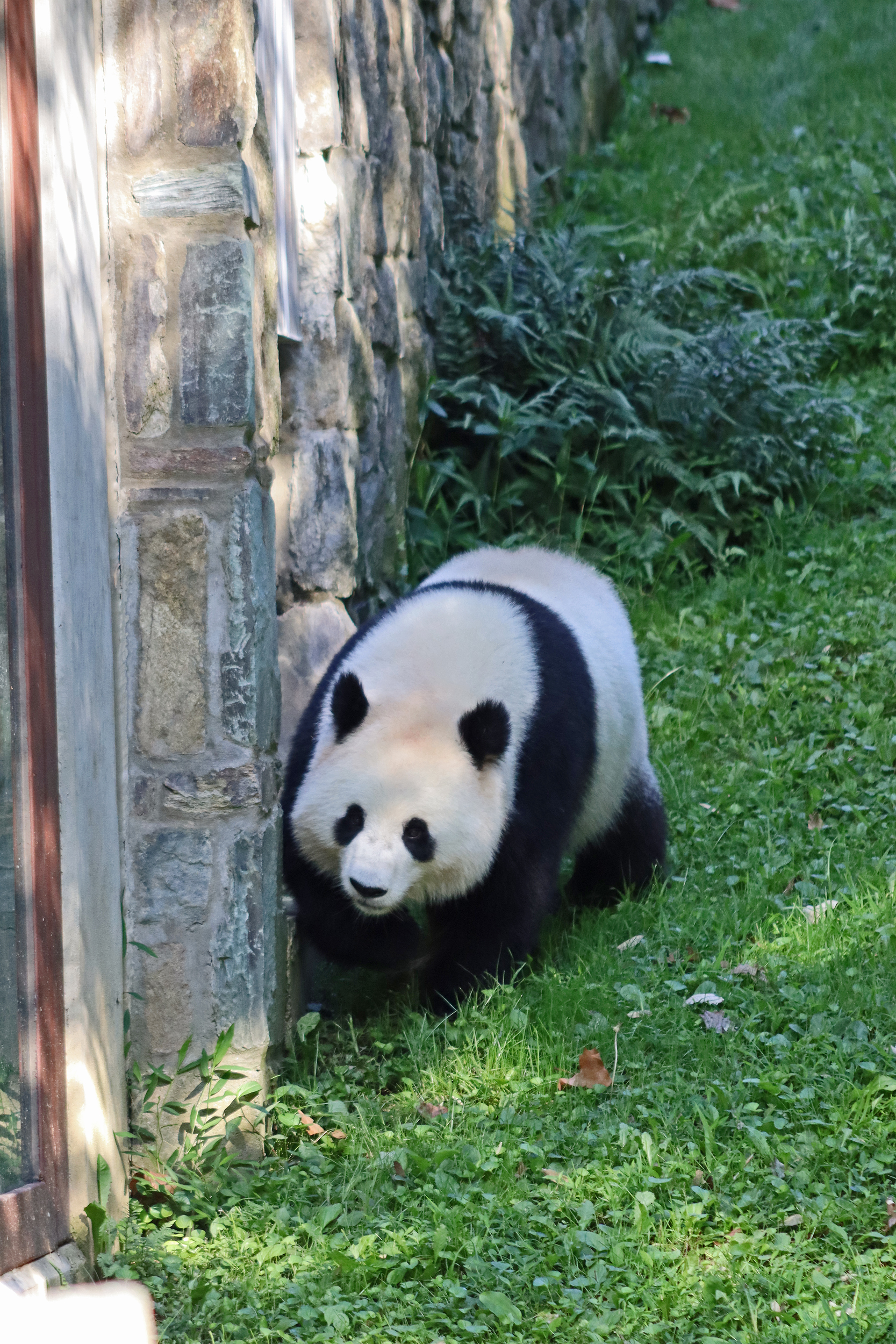 Overall the panda area at the Smithsonian National Zoo hasn’t changed too much – although there were a few things I didn’t remember from before. I think maybe last time there was some renovation work going on so we couldn’t view the pandas from the overlook or the path coming from the Asia Trail direction because I don’t remember this at all and I really had a great view from up there on this trip. There is a one-way system in place at the panda habitat, first you go past the outdoor yards – these had some new climbing frames since my last visit. There are 3 yards, 2 of which were connected when I was there so the panda could enjoy either space, the 3rd yard was much larger, so overall both of them had around the same amount of outside space. Lots of trees and foliage, and of course enrichment opportunities. Most of the outdoor viewing is barrier-free, but there is one section at two of the yards where you can view through glass. After viewing the outside, you work your way around to the building – depending on time and crowds there may be a line to get in. I was there on a weekend and found it to be a bit quieter in the mornings and I needed to line up in the afternoons, however the line was never very long and I don’t think I waited more than 15 minutes or so. Inside there are 4 separate spaces, however these are currently set up into 2 linked spaces for each panda, again they have some indoor environment options as well. In here there were new climbing frames and I think some of the previous rock-work had also changed.