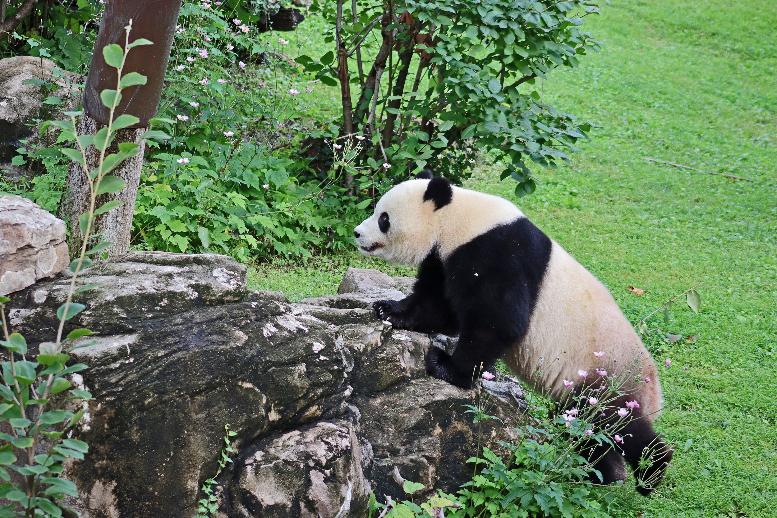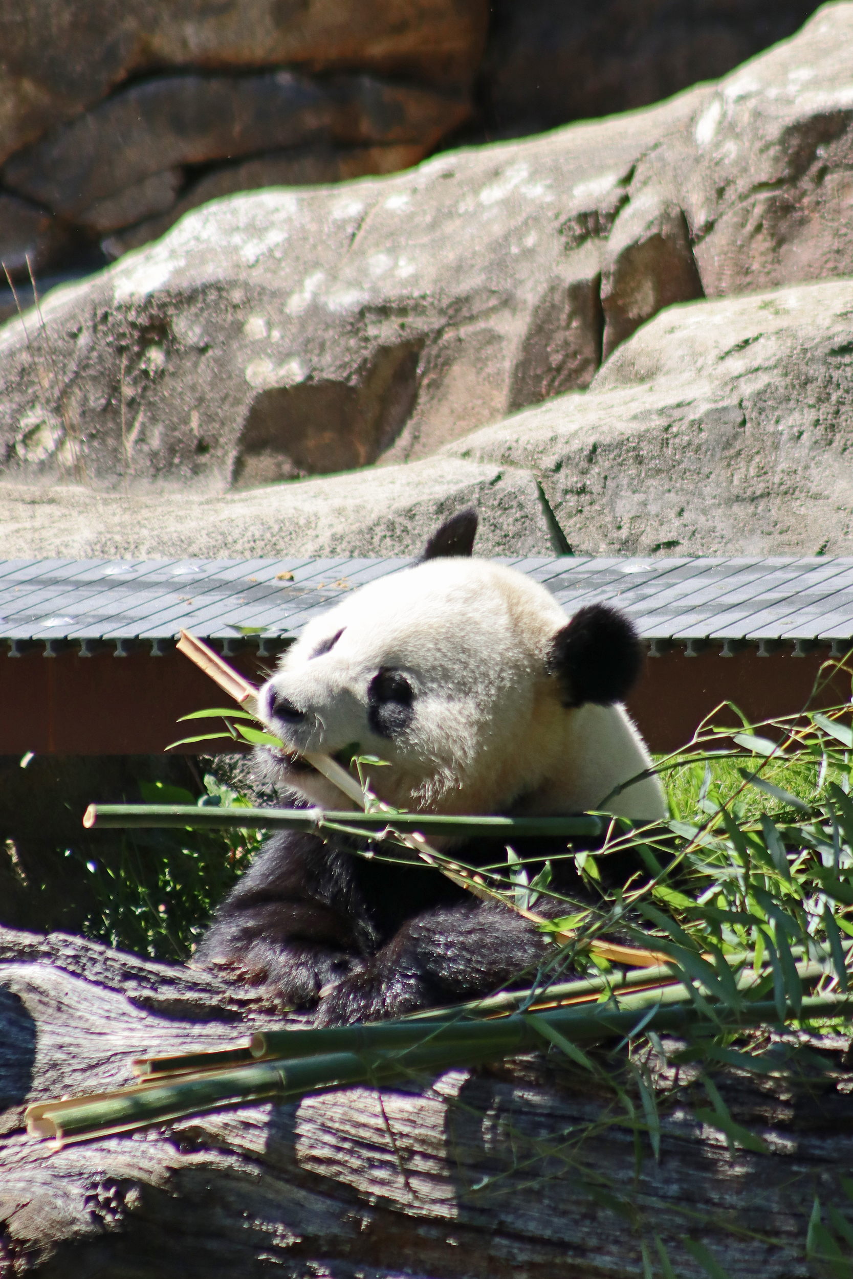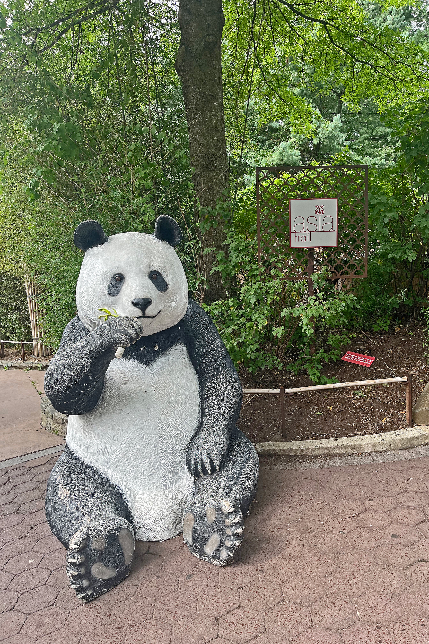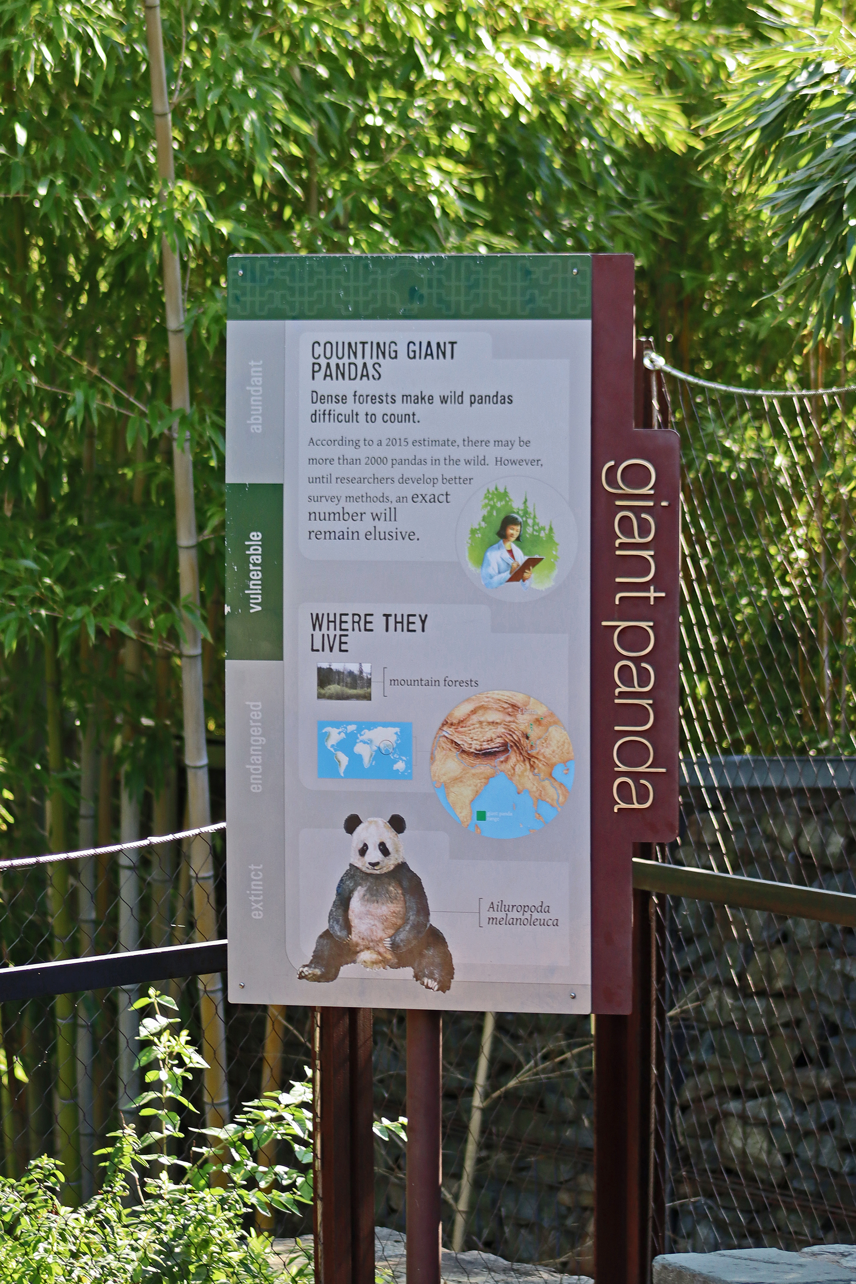 Overall the panda area at the Smithsonian National Zoo hasn’t changed too much – although there were a few things I didn’t remember from before. I think maybe last time there was some renovation work going on so we couldn’t view the pandas from the overlook or the path coming from the Asia Trail direction because I don’t remember this at all and I really had a great view from up there on this trip. There is a one-way system in place at the panda habitat, first you go past the outdoor yards – these had some new climbing frames since my last visit. There are 3 yards, 2 of which were connected when I was there so the panda could enjoy either space, the 3rd yard was much larger, so overall both of them had around the same amount of outside space. Lots of trees and foliage, and of course enrichment opportunities. Most of the outdoor viewing is barrier-free, but there is one section at two of the yards where you can view through glass. After viewing the outside, you work your way around to the building – depending on time and crowds there may be a line to get in. I was there on a weekend and found it to be a bit quieter in the mornings and I needed to line up in the afternoons, however the line was never very long and I don’t think I waited more than 15 minutes or so. Inside there are 4 separate spaces, however these are currently set up into 2 linked spaces for each panda, again they have some indoor environment options as well. In here there were new climbing frames and I think some of the previous rock-work had also changed.