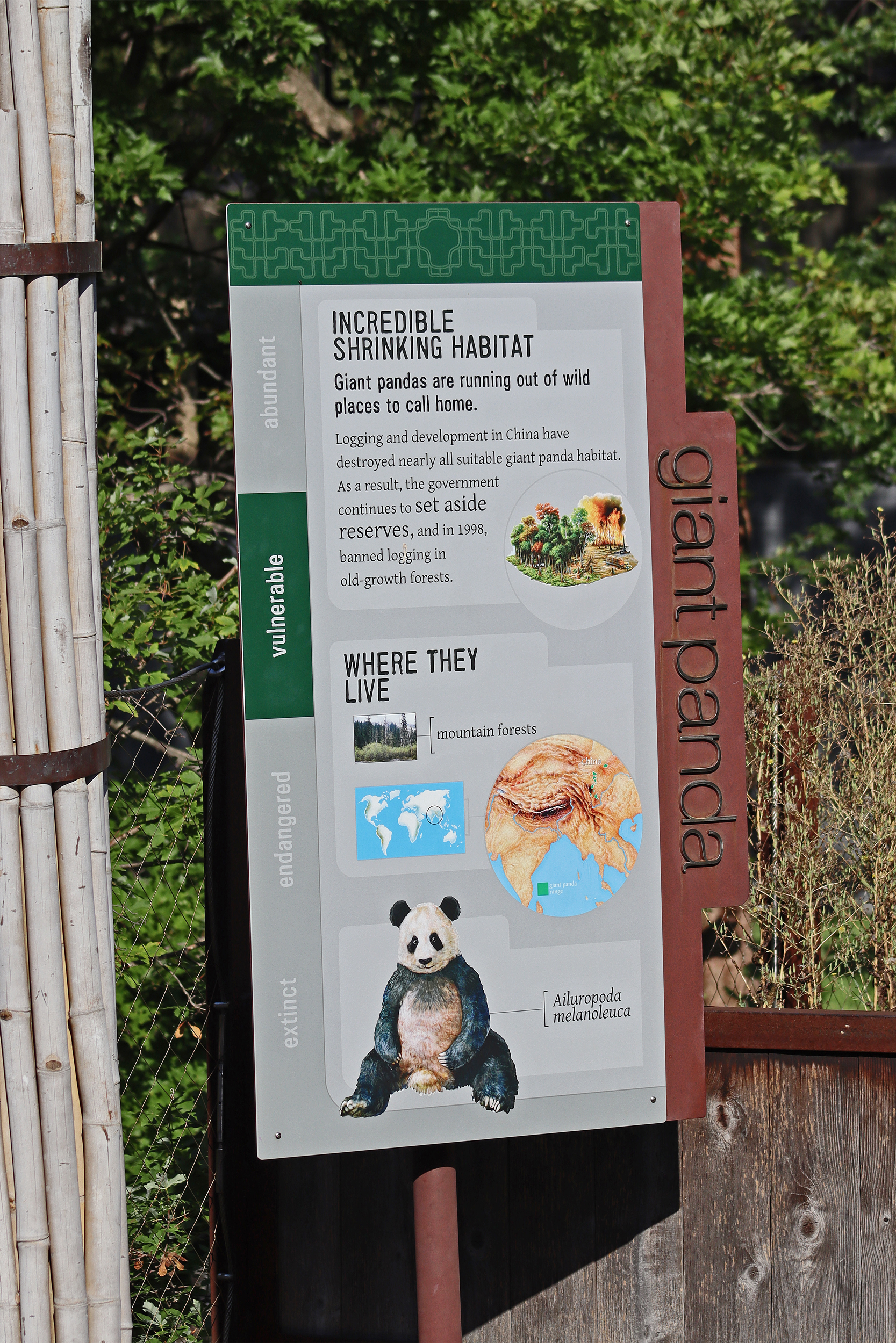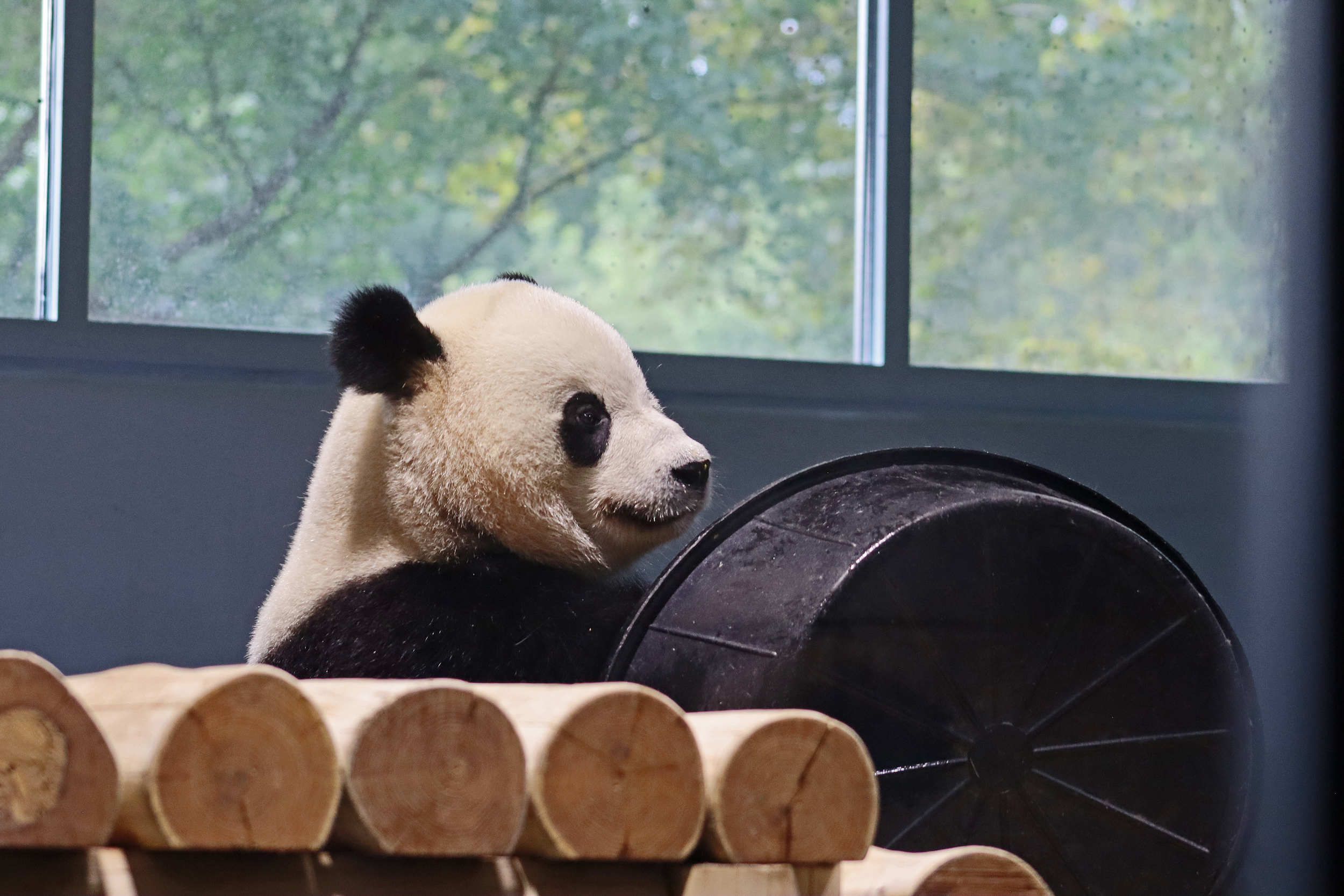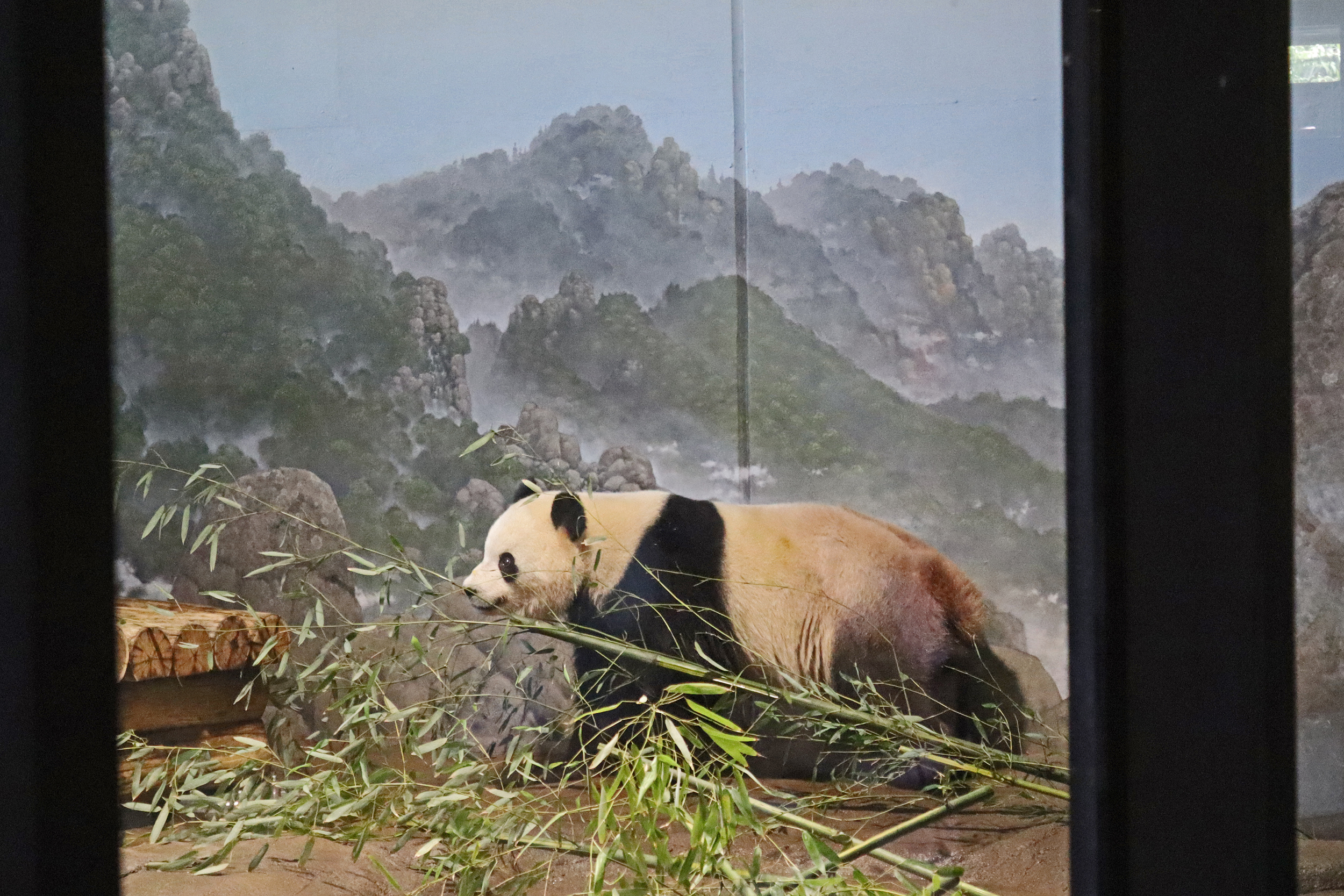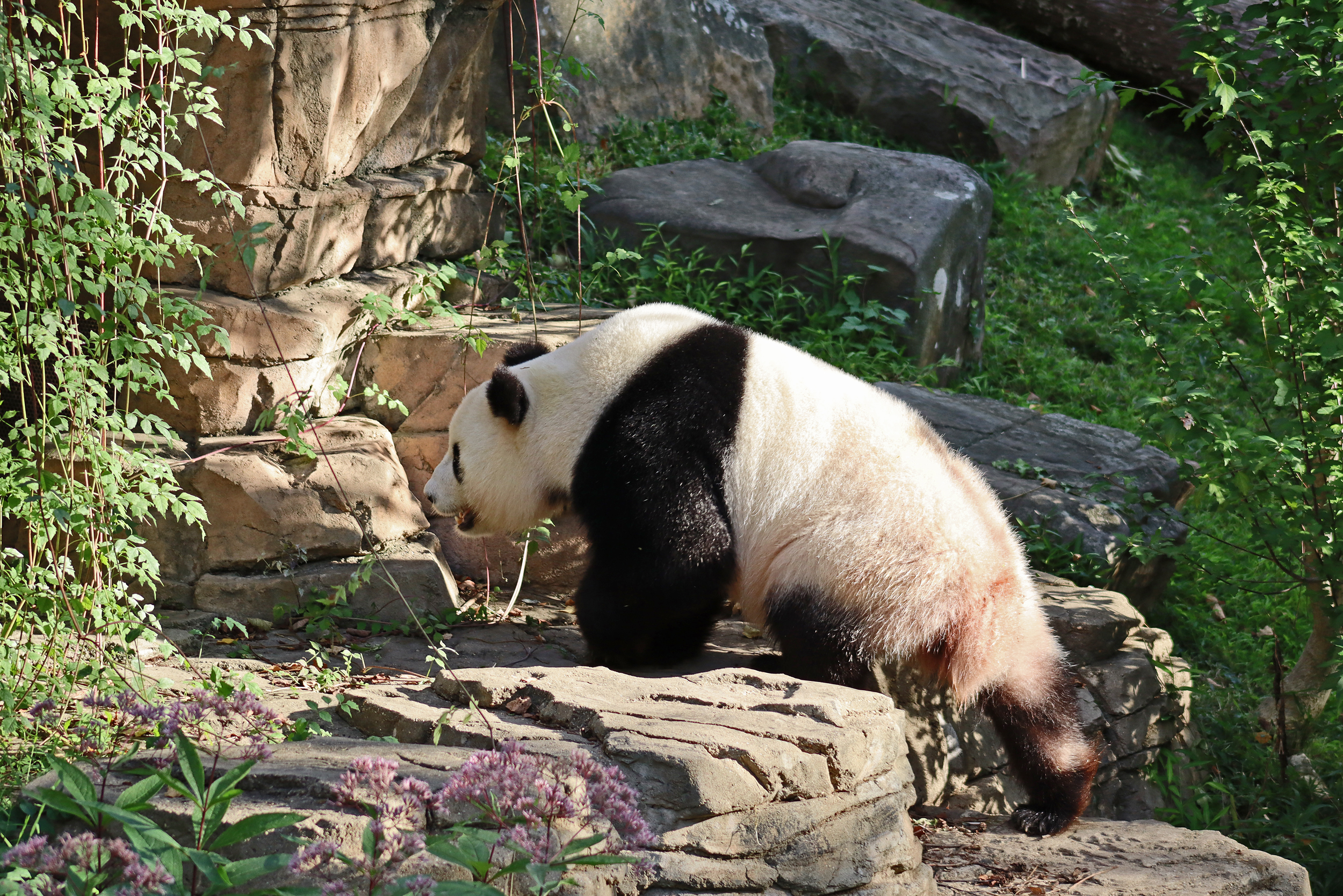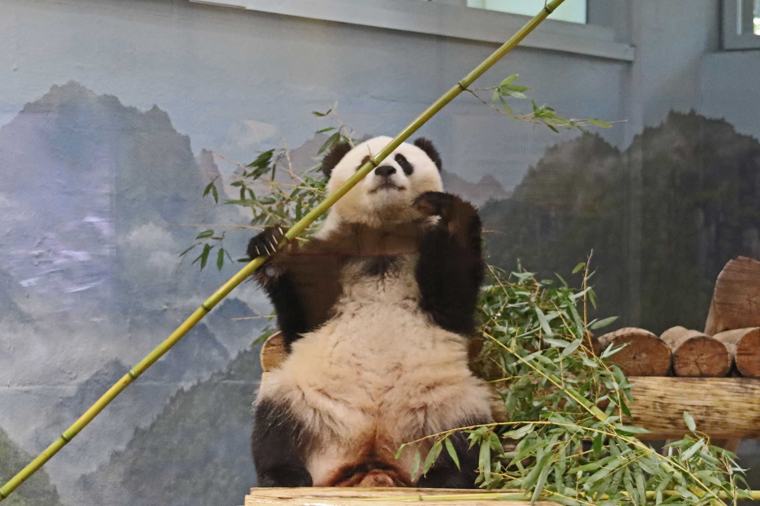 Overall the panda area at the Smithsonian National Zoo hasn’t changed too much – although there were a few things I didn’t remember from before. I think maybe last time there was some renovation work going on so we couldn’t view the pandas from the overlook or the path coming from the Asia Trail direction because I don’t remember this at all and I really had a great view from up there on this trip. There is a one-way system in place at the panda habitat, first you go past the outdoor yards – these had some new climbing frames since my last visit. There are 3 yards, 2 of which were connected when I was there so the panda could enjoy either space, the 3rd yard was much larger, so overall both of them had around the same amount of outside space. Lots of trees and foliage, and of course enrichment opportunities. Most of the outdoor viewing is barrier-free, but there is one section at two of the yards where you can view through glass. After viewing the outside, you work your way around to the building – depending on time and crowds there may be a line to get in. I was there on a weekend and found it to be a bit quieter in the mornings and I needed to line up in the afternoons, however the line was never very long and I don’t think I waited more than 15 minutes or so. Inside there are 4 separate spaces, however these are currently set up into 2 linked spaces for each panda, again they have some indoor environment options as well. In here there were new climbing frames and I think some of the previous rock-work had also changed.