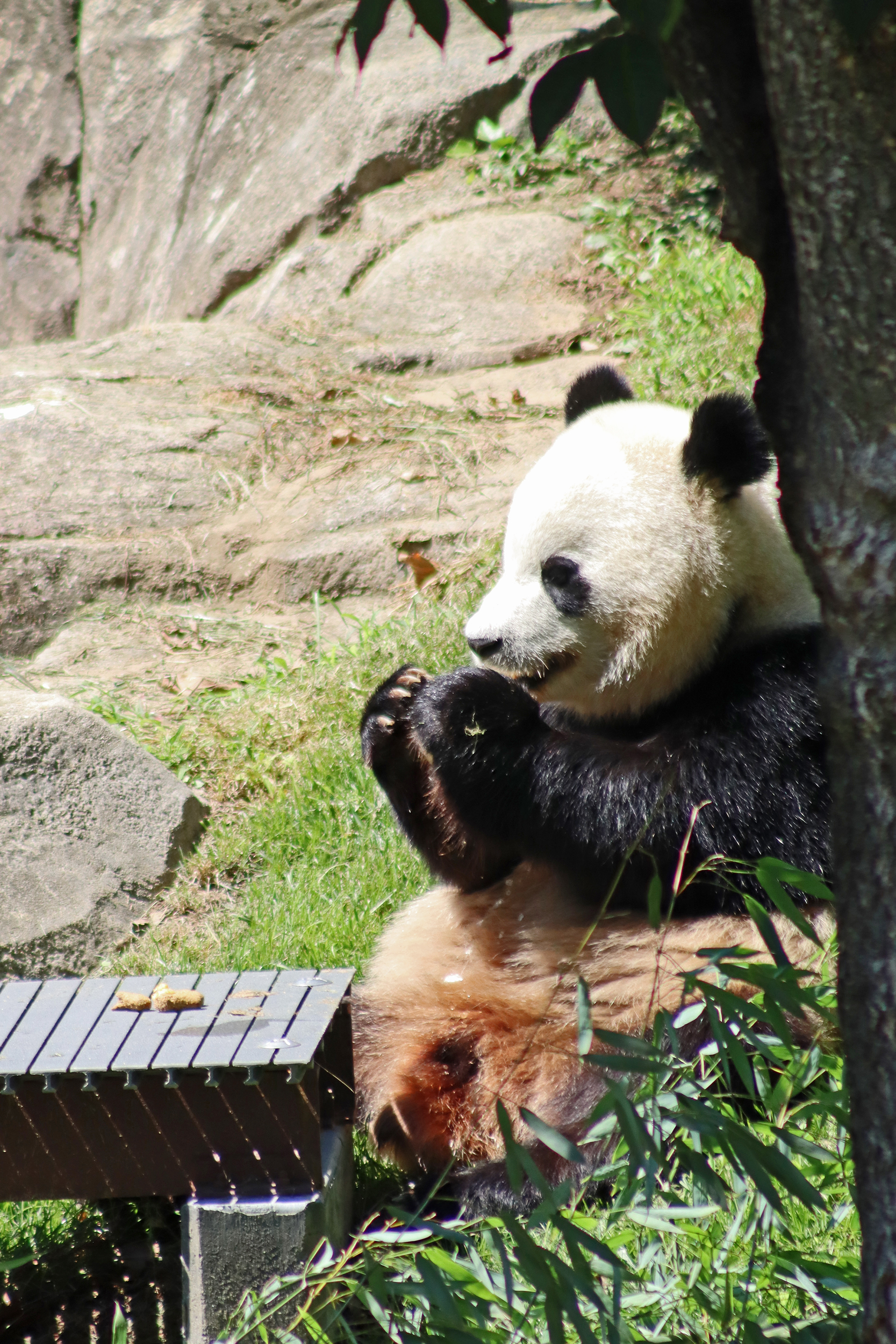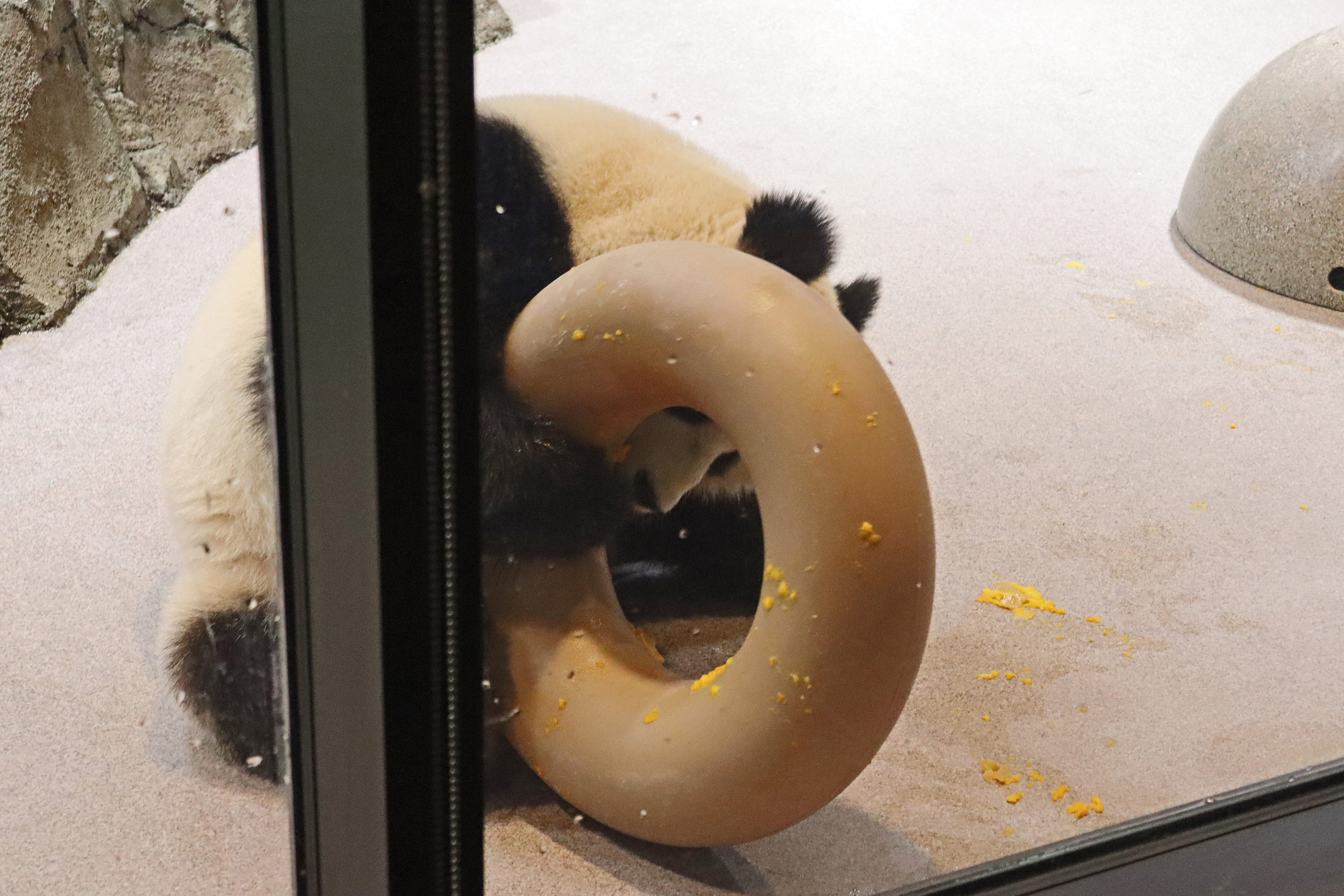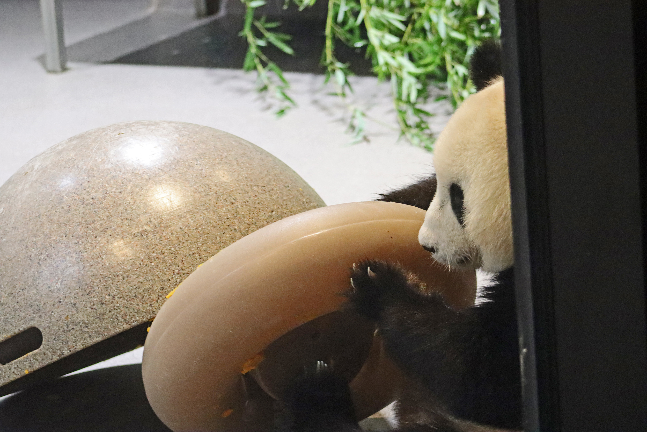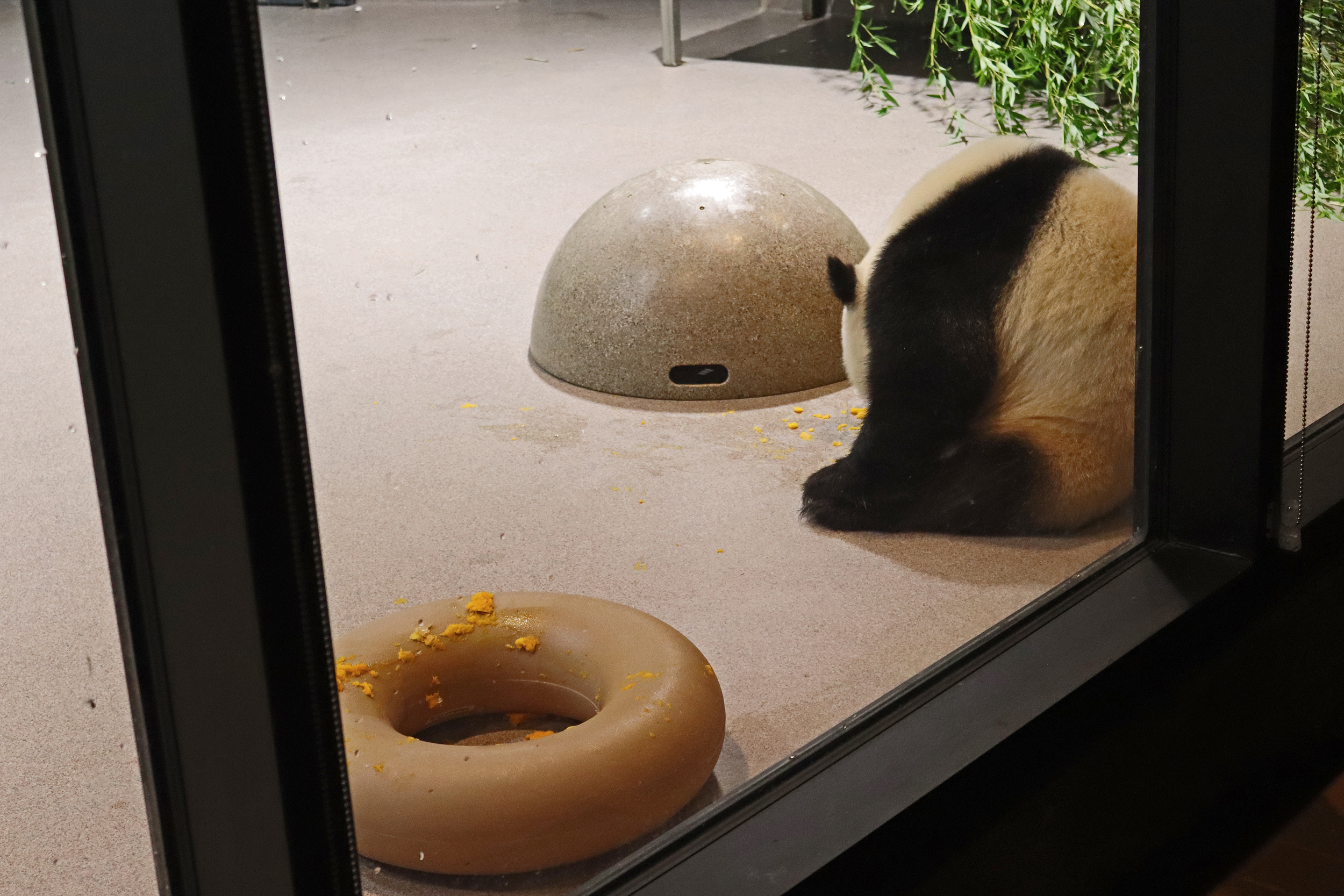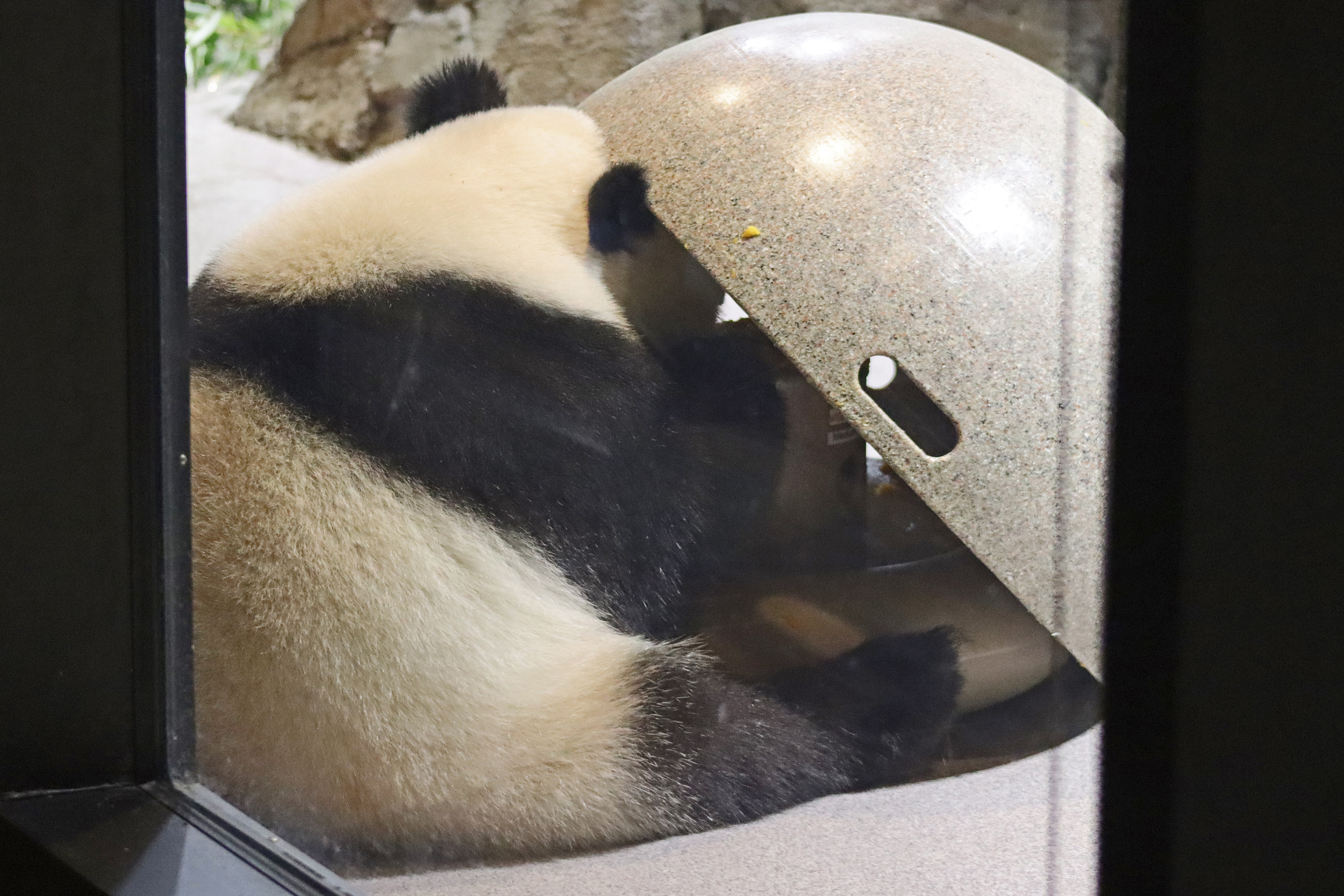 When I first arrived both mornings he was outside enjoying his breakfast – overall he spent his days pretty equally between the inside and outside yards and I saw him a good proportion of my time in each, giving me a nice variety of photos. With this yard, you do see him a bit better from the upper path viewing, and there was plenty of space for lots of people to get a good view of him. He had some different enrichment toys both outside and inside and on both the days, so lots of puzzles to figure out for treats. On the afternoon of the first day he got a fruit ice treat and he seemed to really love this, I sure loved watching this as I saw grandpa Tian Tian get the same treat on my last visit! On the second day the highlight was seeing him having an absolute whale of a time with a big plastic basin which must of had some sort of treat rubbed inside it – he spent at least 30mins focusing on the basin, giving it a very thorough lick and holding it on his head XD