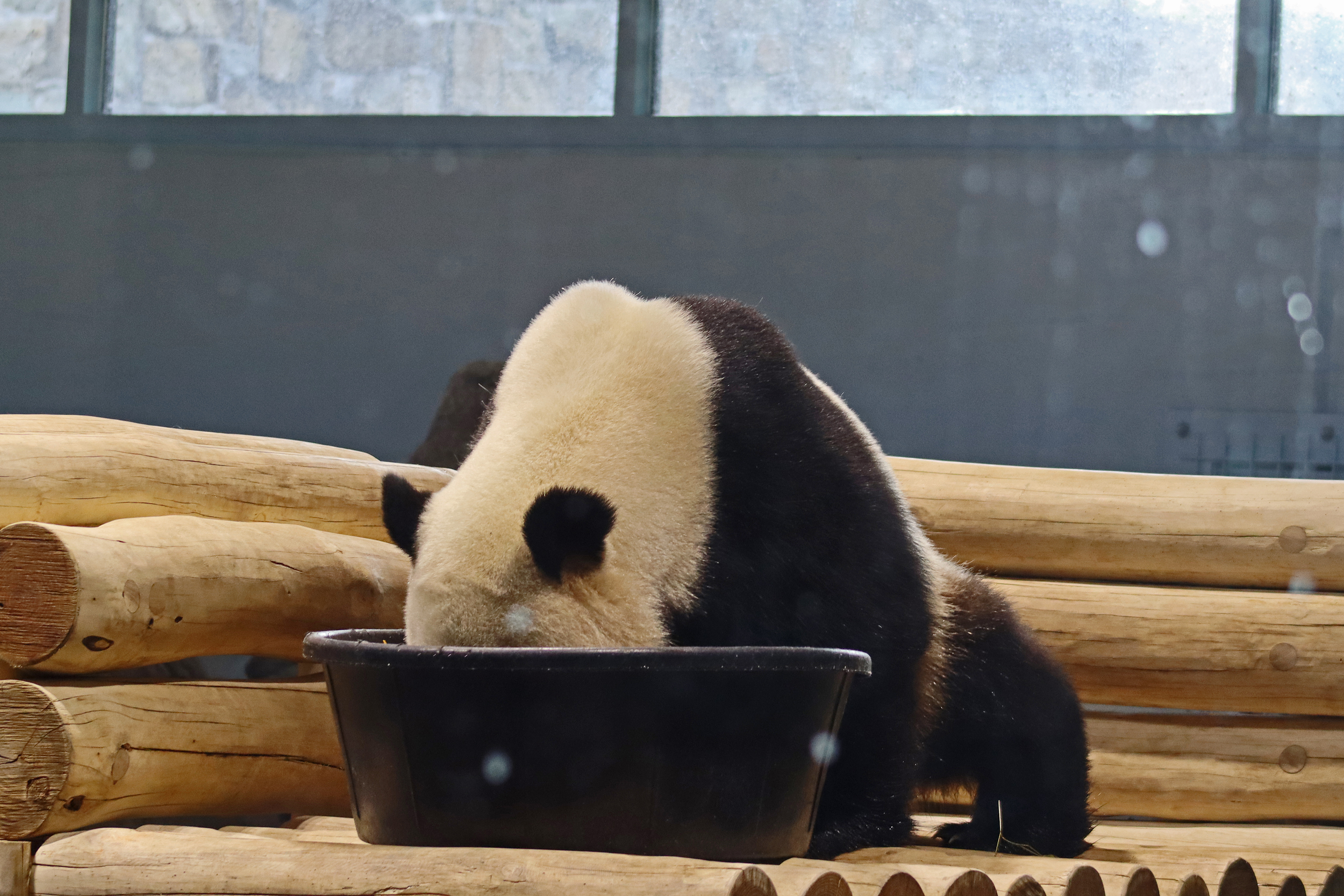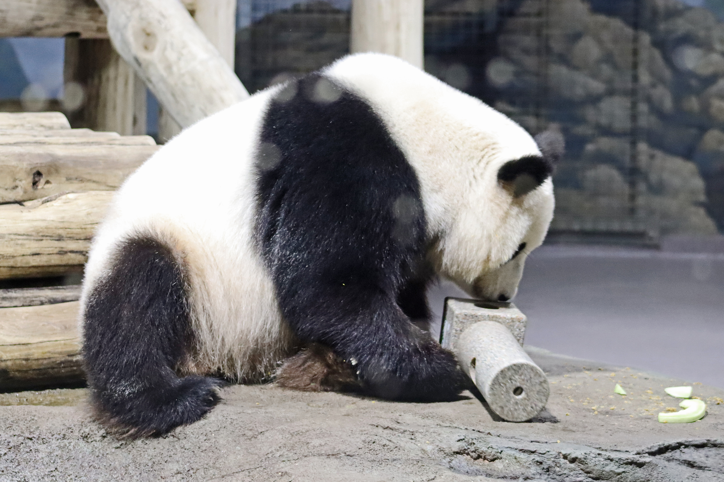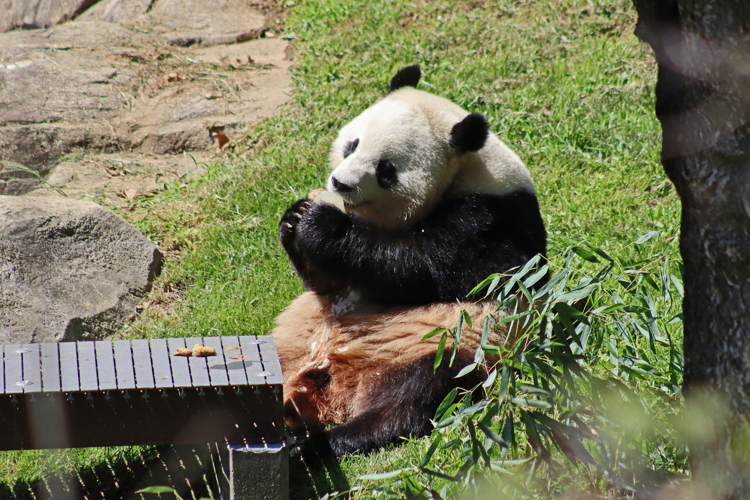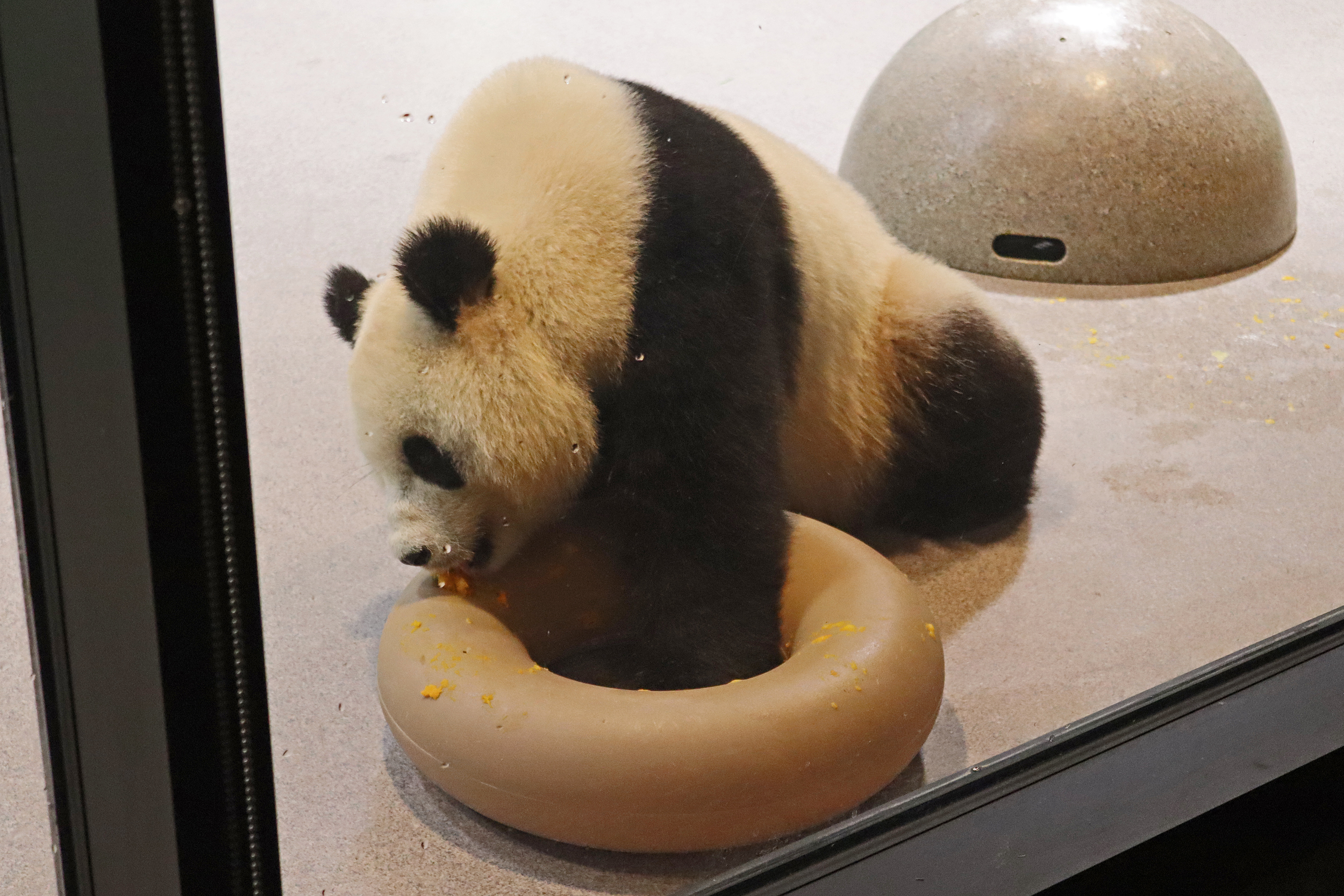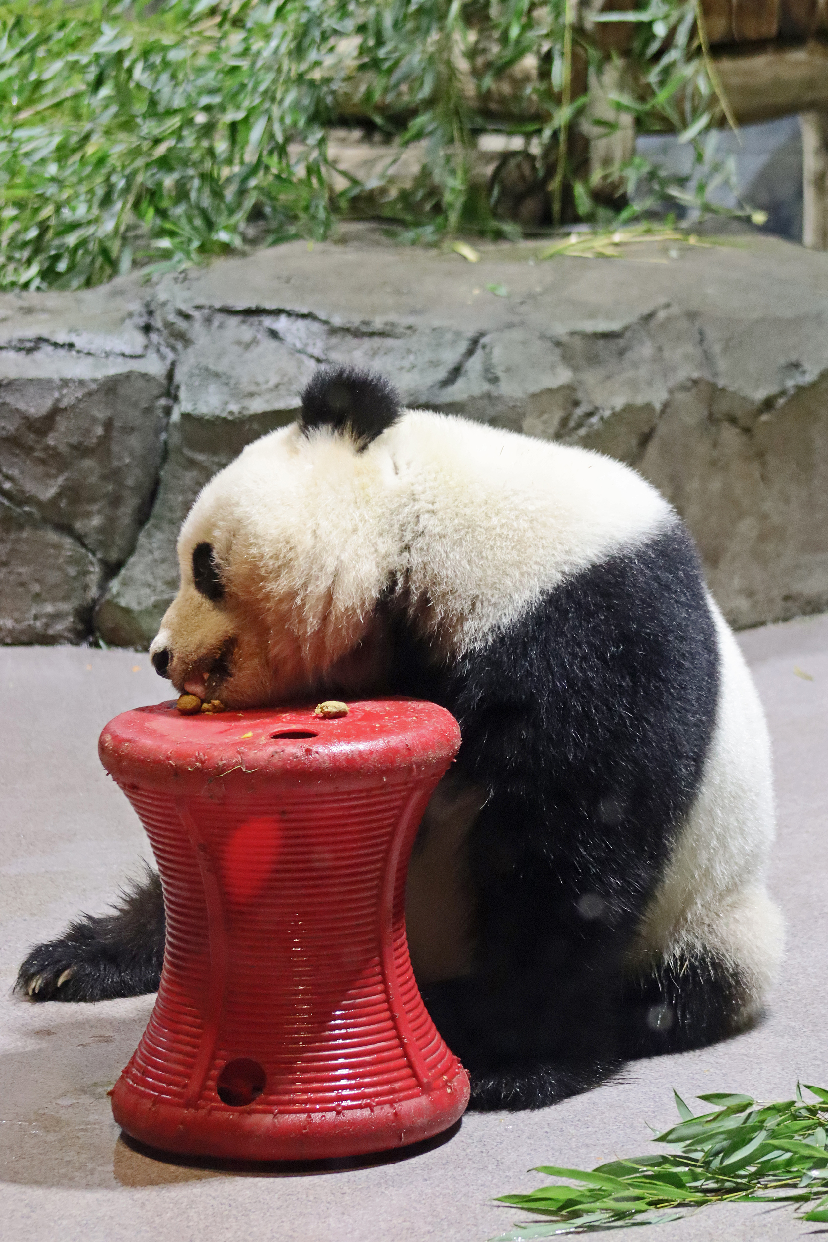 When I first arrived both mornings he was outside enjoying his breakfast – overall he spent his days pretty equally between the inside and outside yards and I saw him a good proportion of my time in each, giving me a nice variety of photos. With this yard, you do see him a bit better from the upper path viewing, and there was plenty of space for lots of people to get a good view of him. He had some different enrichment toys both outside and inside and on both the days, so lots of puzzles to figure out for treats. On the afternoon of the first day he got a fruit ice treat and he seemed to really love this, I sure loved watching this as I saw grandpa Tian Tian get the same treat on my last visit! On the second day the highlight was seeing him having an absolute whale of a time with a big plastic basin which must of had some sort of treat rubbed inside it – he spent at least 30mins focusing on the basin, giving it a very thorough lick and holding it on his head XD