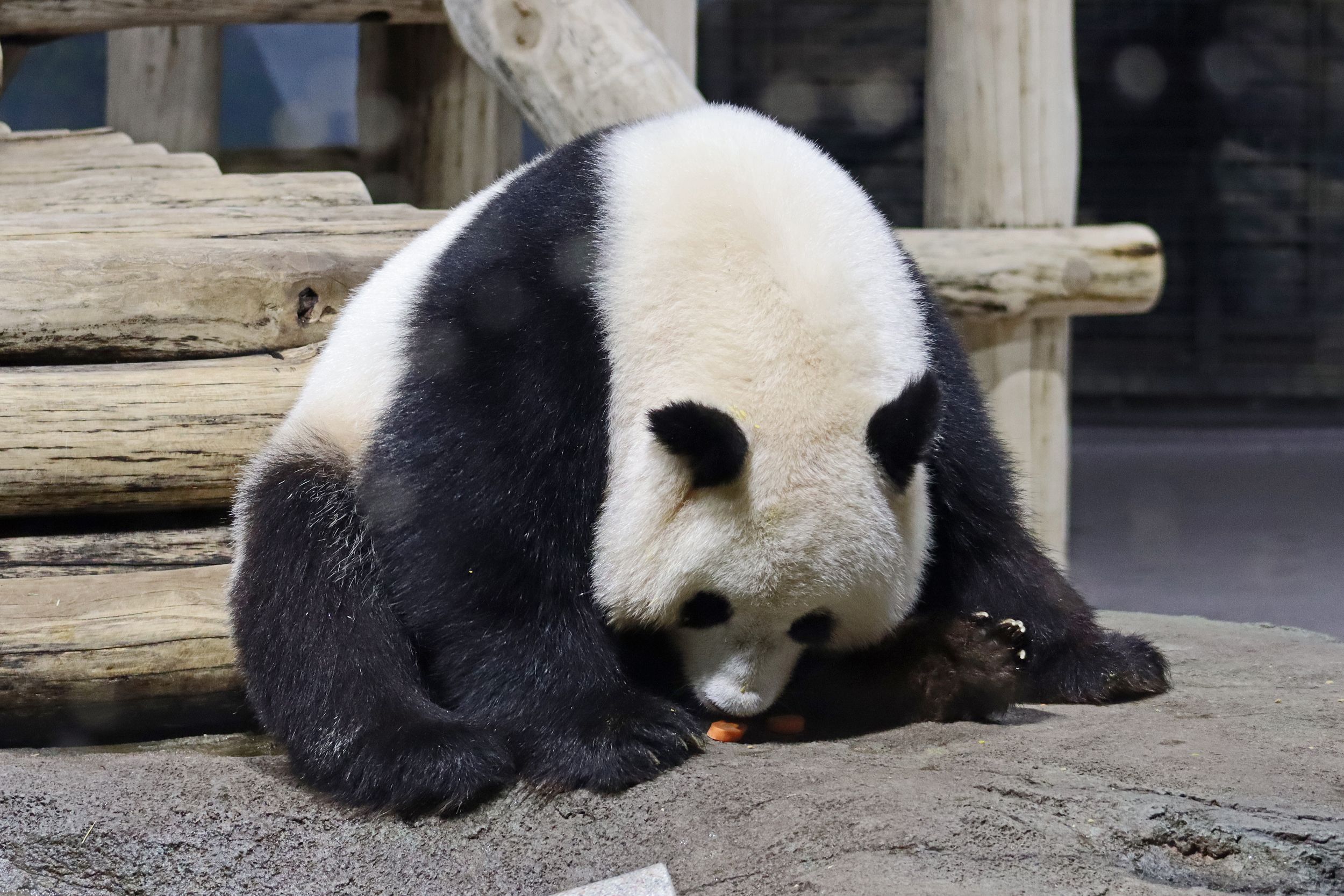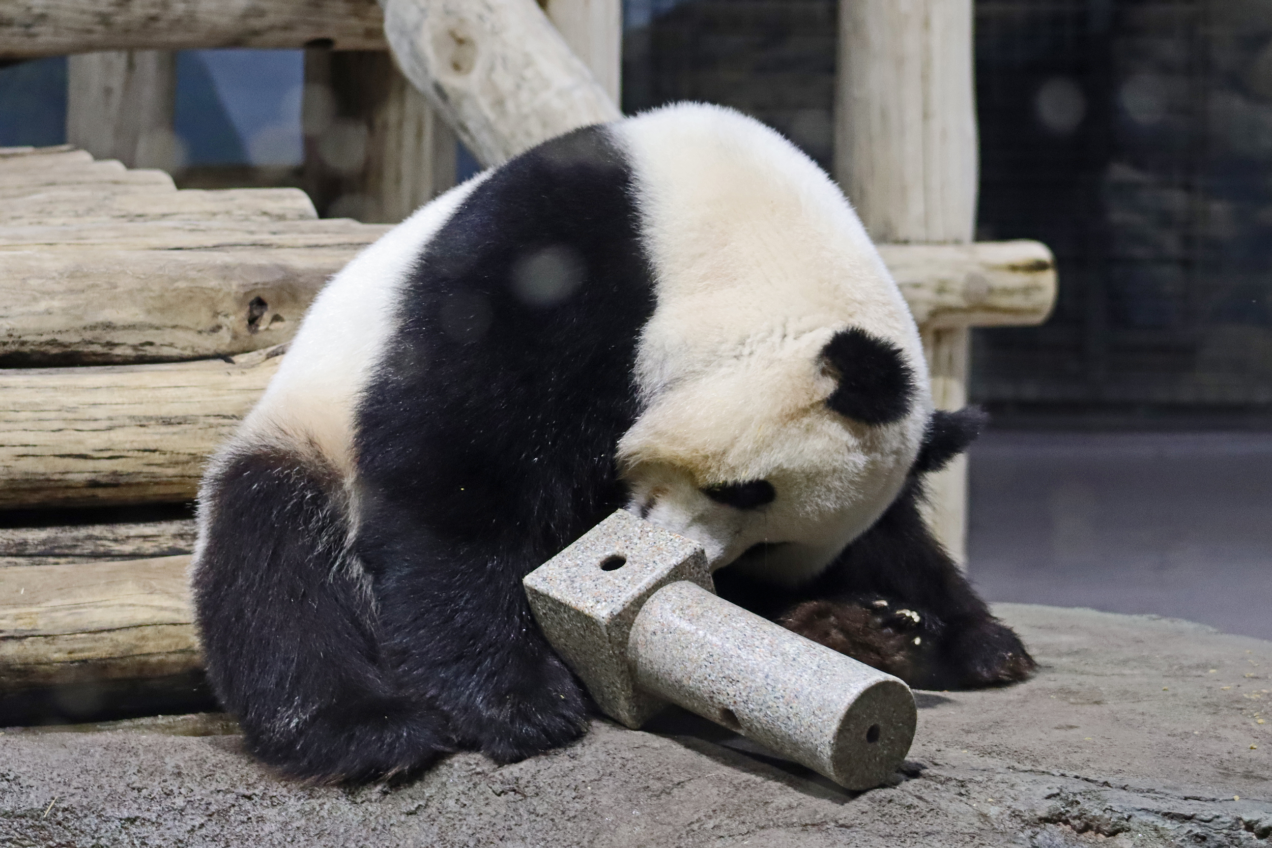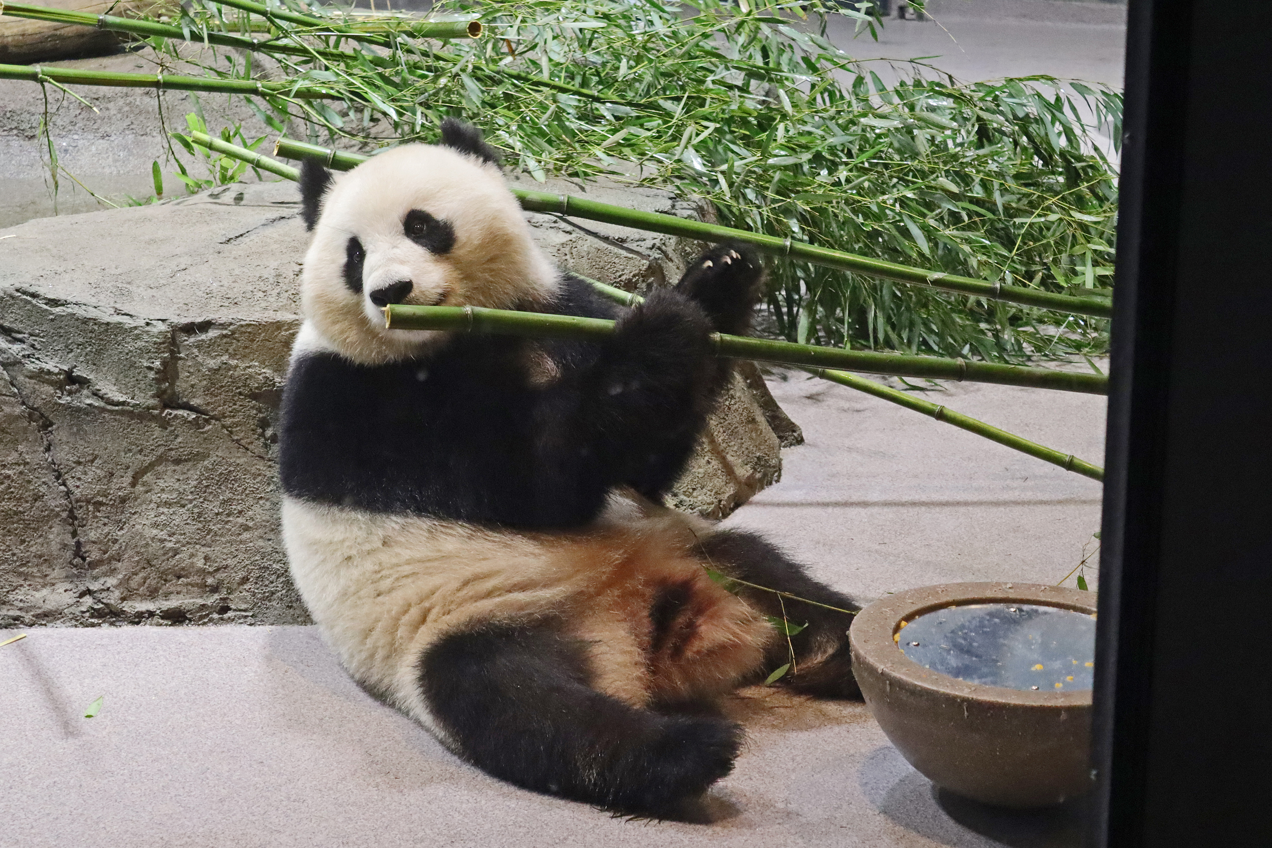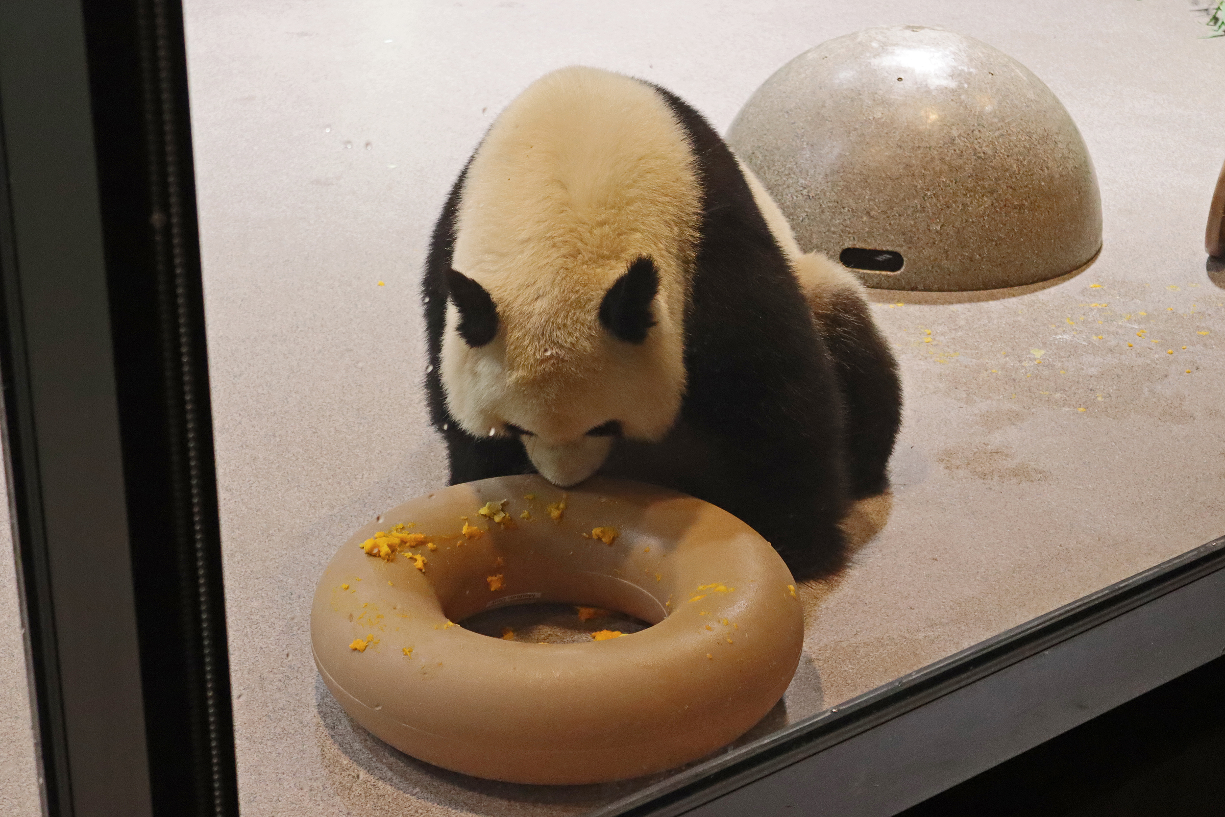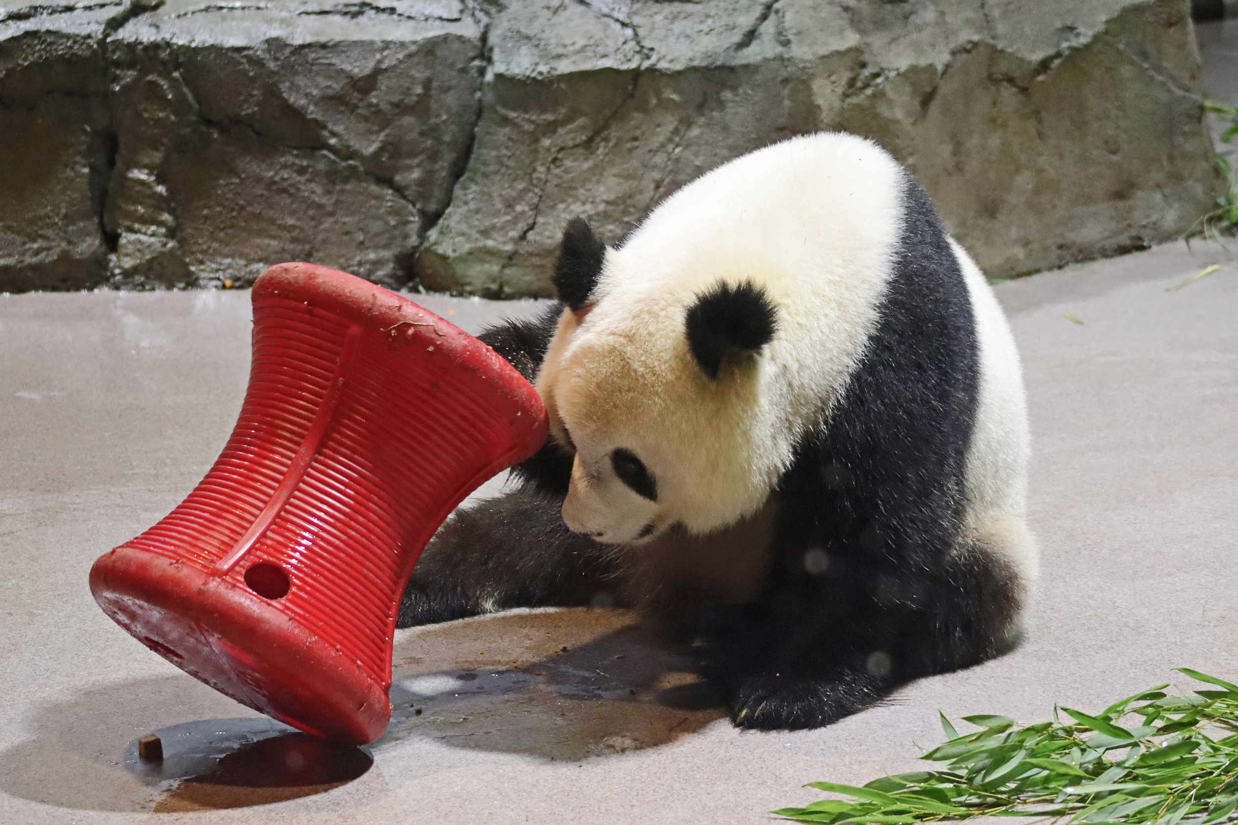 When I first arrived both mornings he was outside enjoying his breakfast – overall he spent his days pretty equally between the inside and outside yards and I saw him a good proportion of my time in each, giving me a nice variety of photos. With this yard, you do see him a bit better from the upper path viewing, and there was plenty of space for lots of people to get a good view of him. He had some different enrichment toys both outside and inside and on both the days, so lots of puzzles to figure out for treats. On the afternoon of the first day he got a fruit ice treat and he seemed to really love this, I sure loved watching this as I saw grandpa Tian Tian get the same treat on my last visit! On the second day the highlight was seeing him having an absolute whale of a time with a big plastic basin which must of had some sort of treat rubbed inside it – he spent at least 30mins focusing on the basin, giving it a very thorough lick and holding it on his head XD