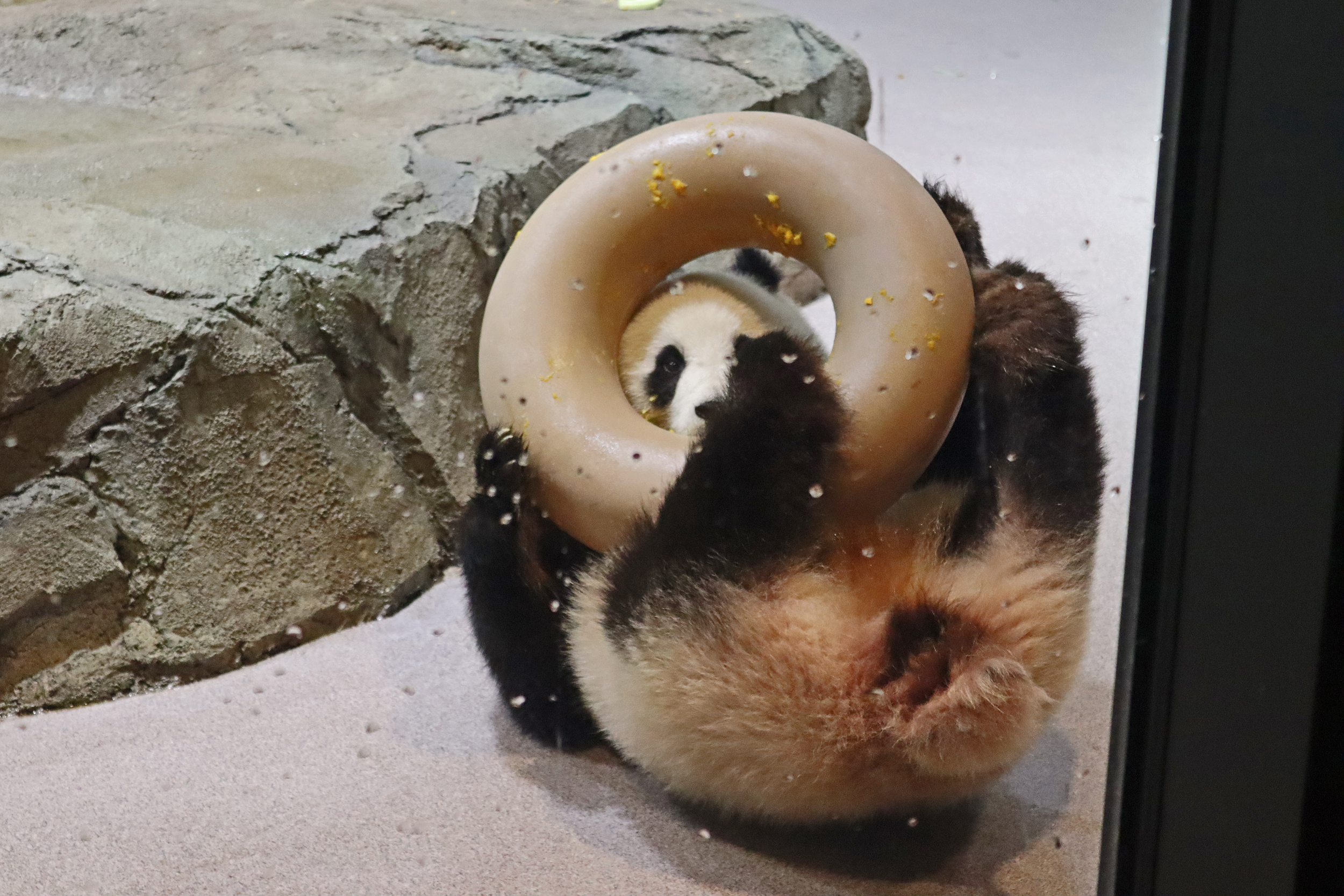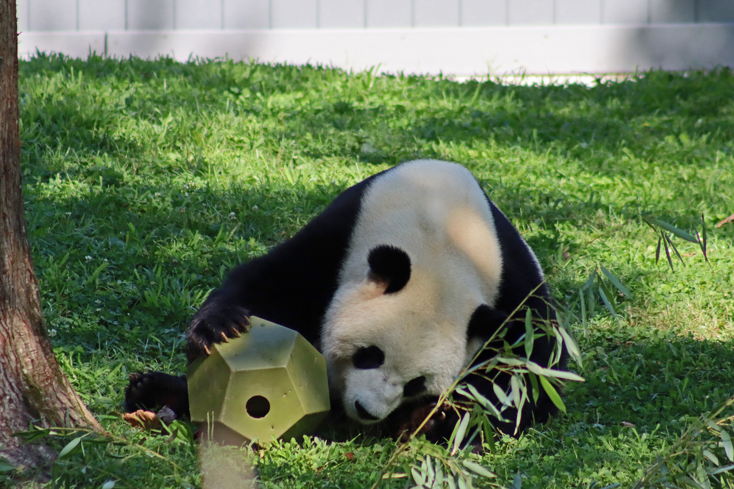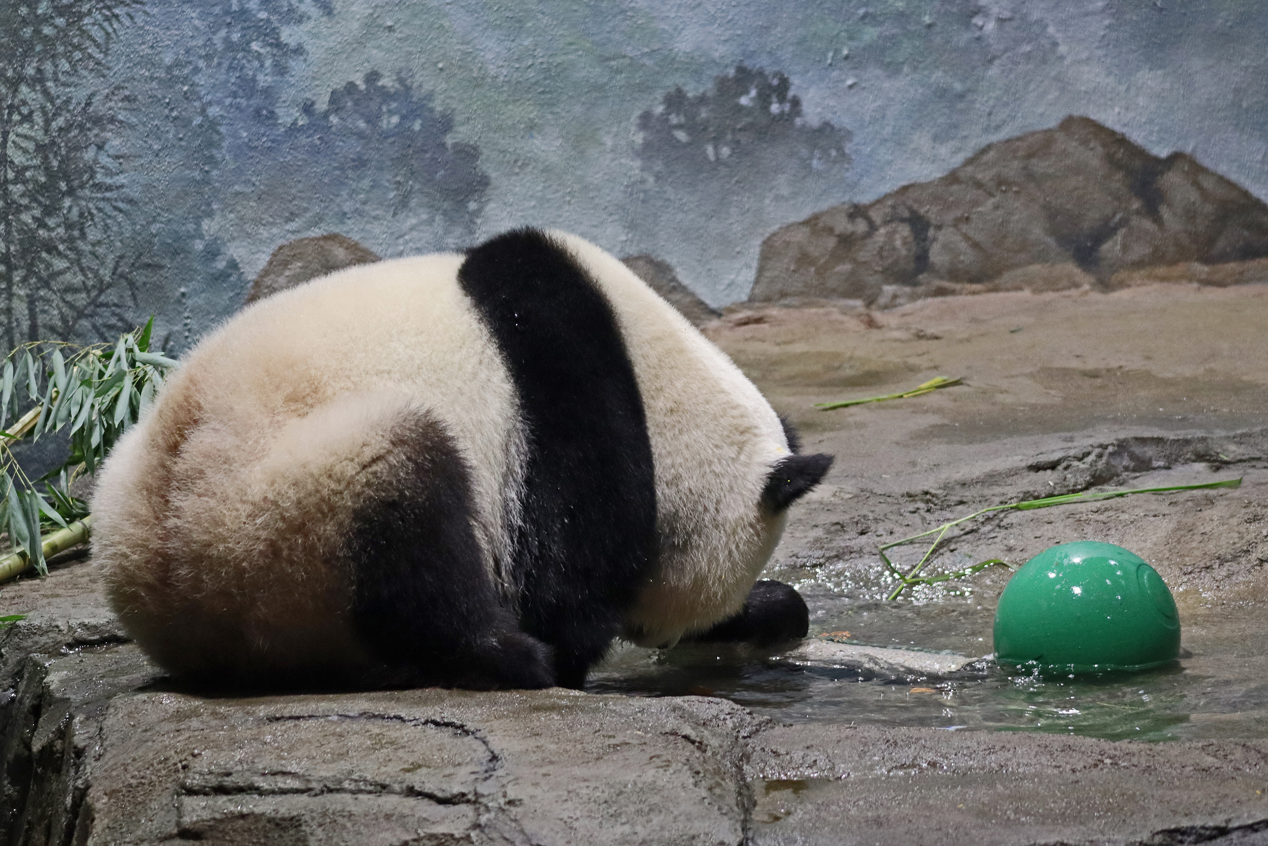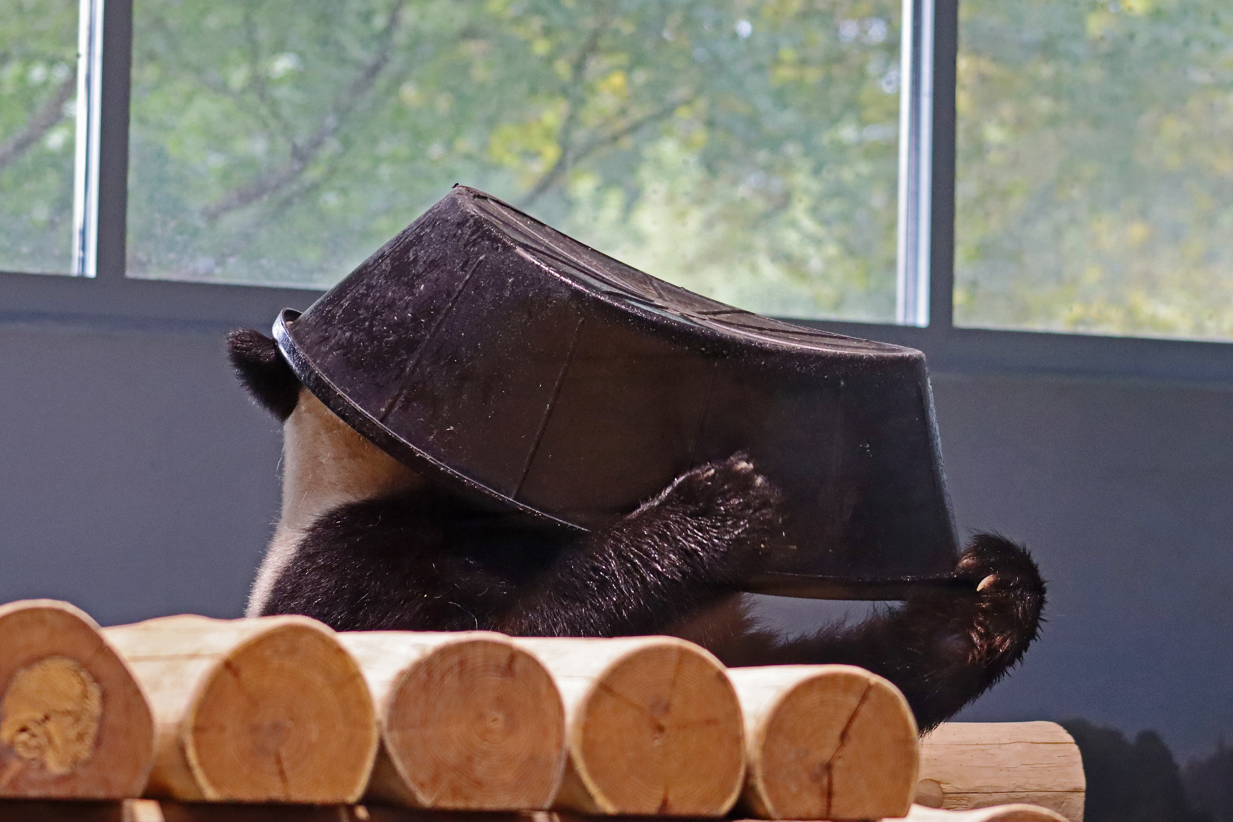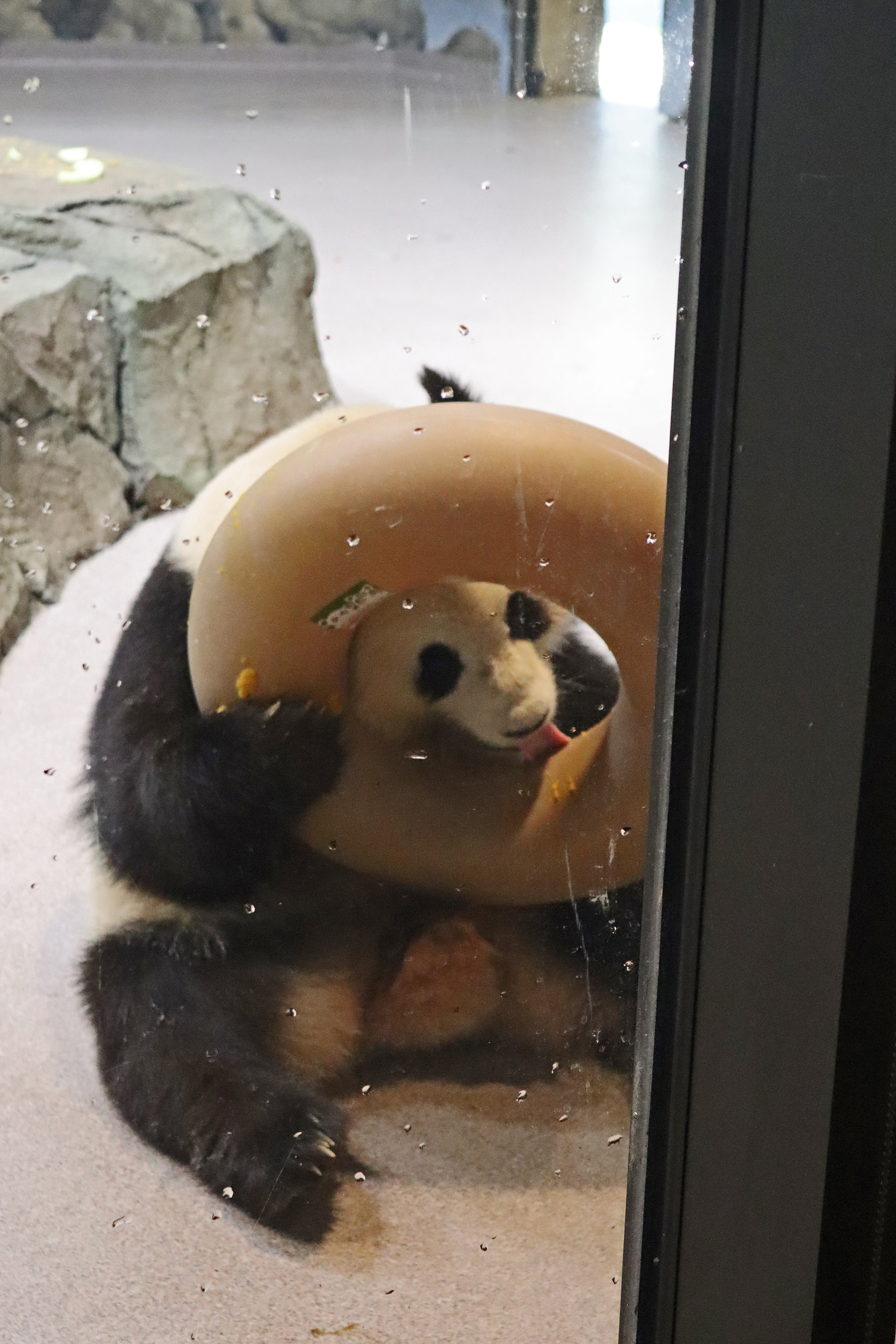 When I first arrived both mornings he was outside enjoying his breakfast – overall he spent his days pretty equally between the inside and outside yards and I saw him a good proportion of my time in each, giving me a nice variety of photos. With this yard, you do see him a bit better from the upper path viewing, and there was plenty of space for lots of people to get a good view of him. He had some different enrichment toys both outside and inside and on both the days, so lots of puzzles to figure out for treats. On the afternoon of the first day he got a fruit ice treat and he seemed to really love this, I sure loved watching this as I saw grandpa Tian Tian get the same treat on my last visit! On the second day the highlight was seeing him having an absolute whale of a time with a big plastic basin which must of had some sort of treat rubbed inside it – he spent at least 30mins focusing on the basin, giving it a very thorough lick and holding it on his head XD