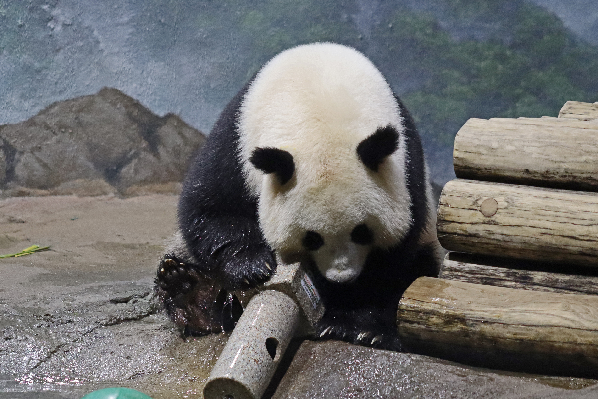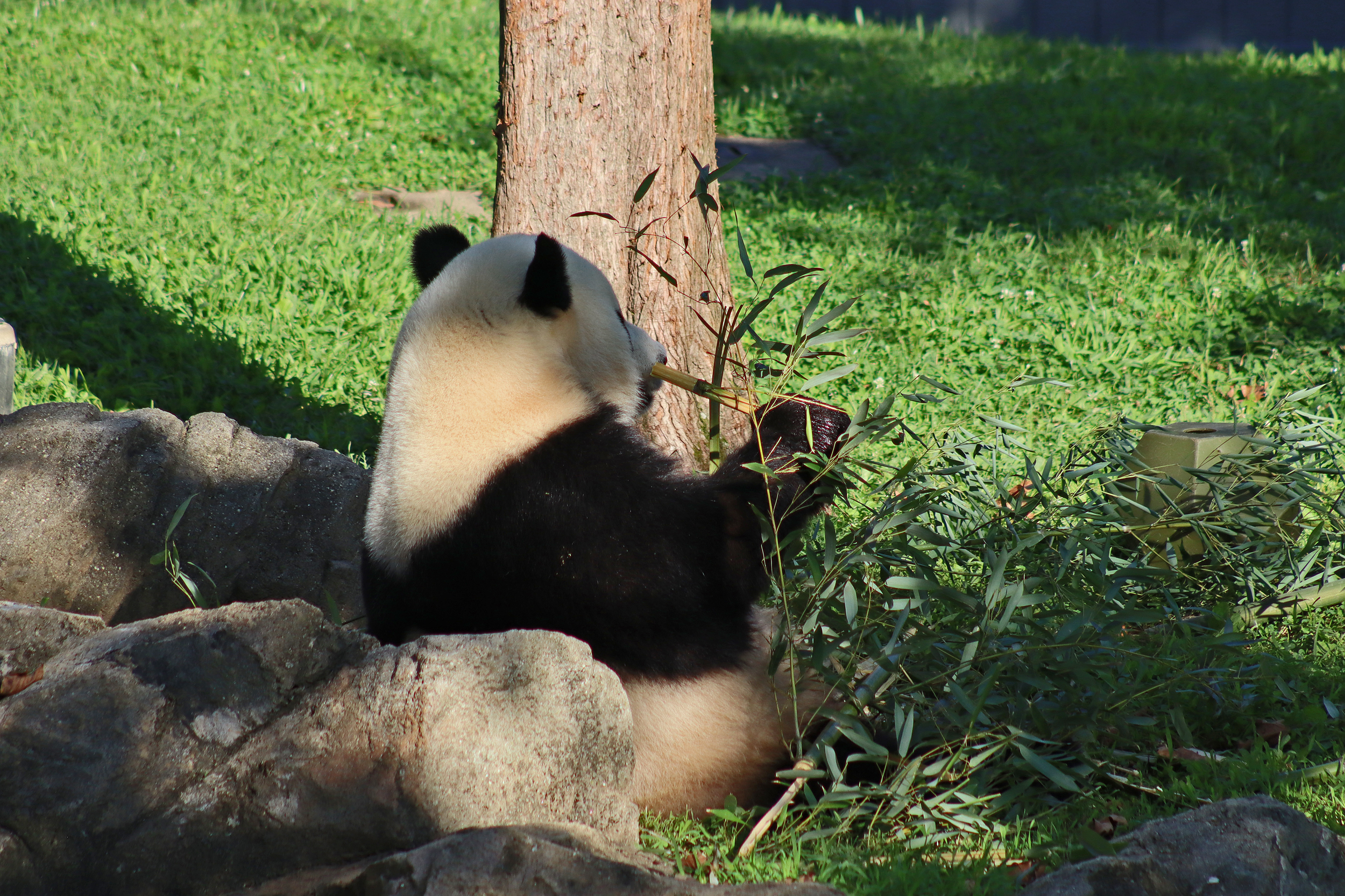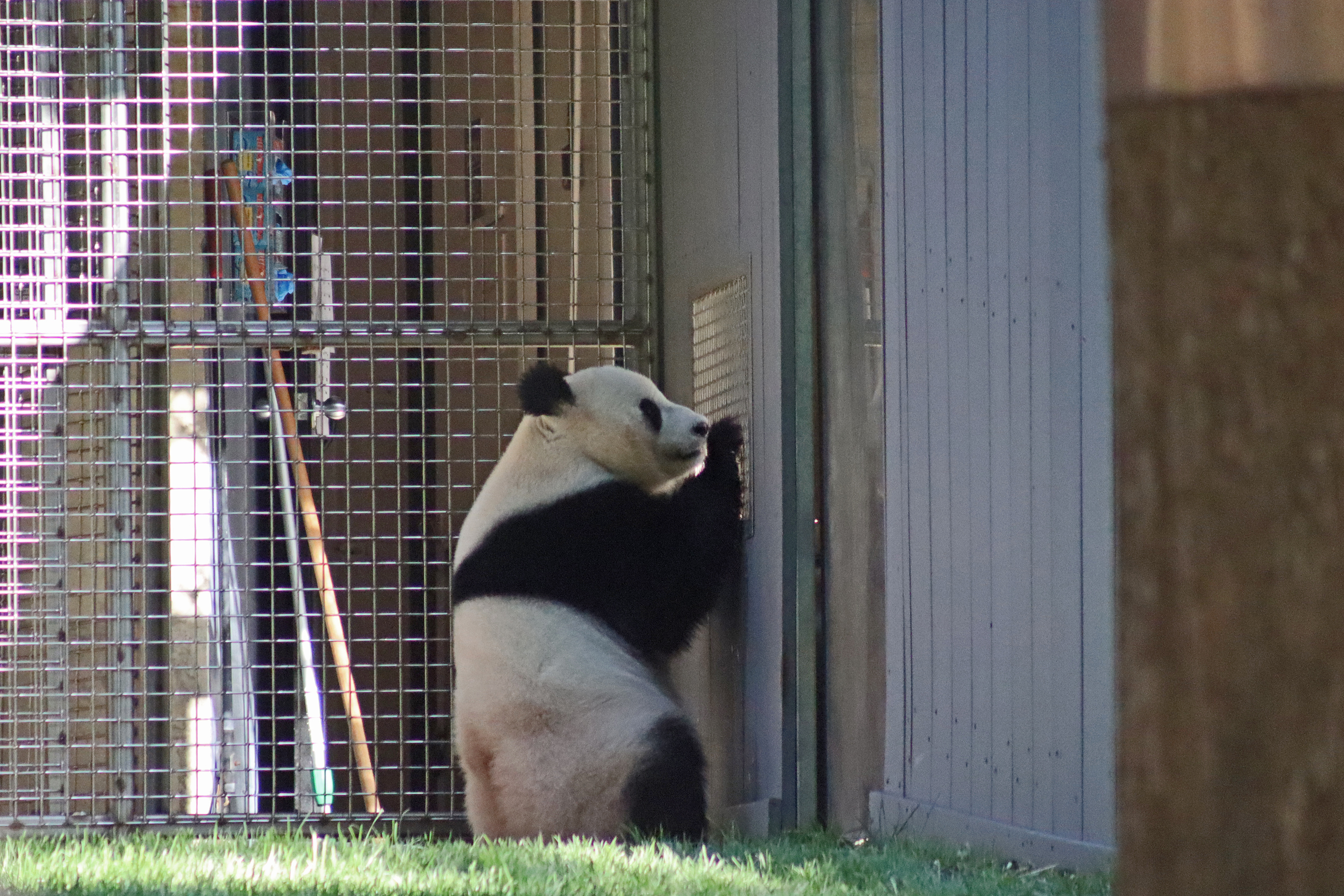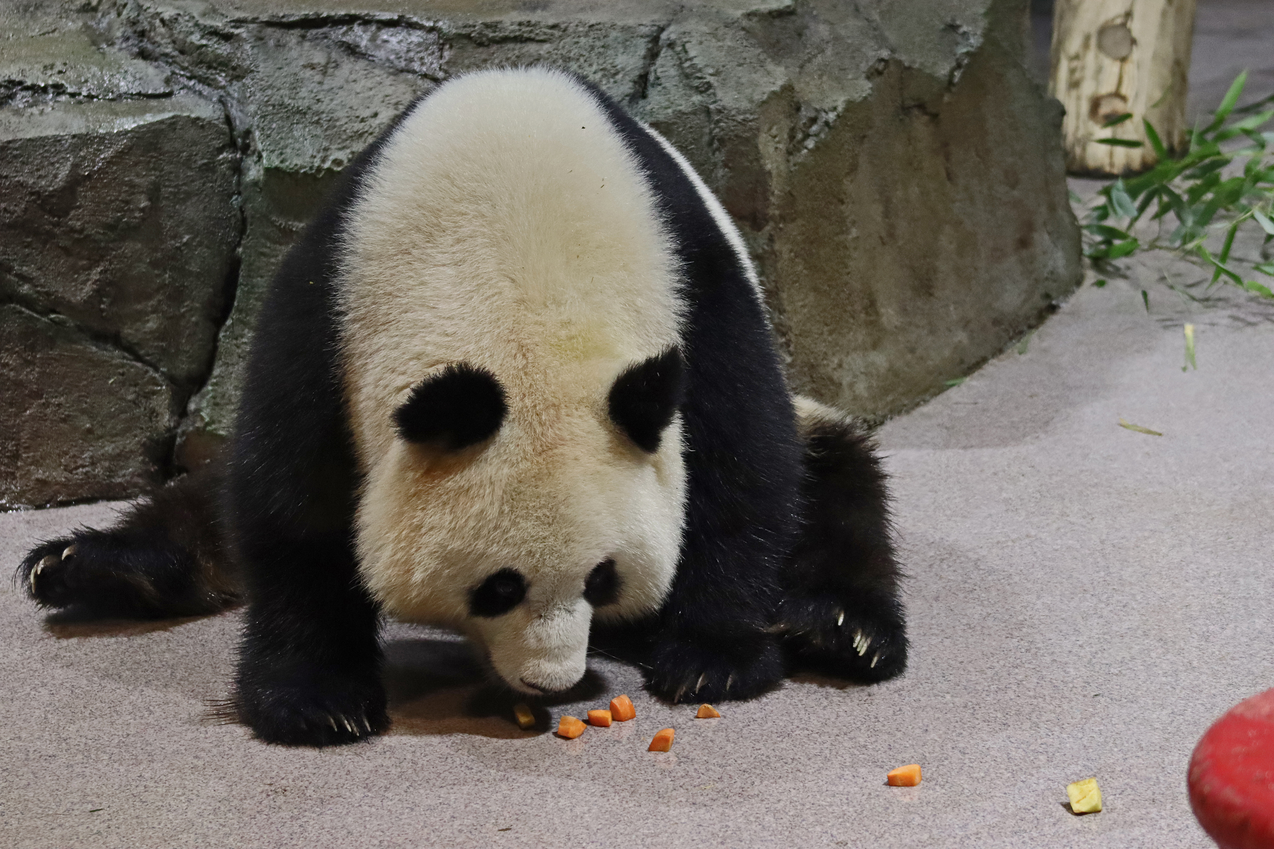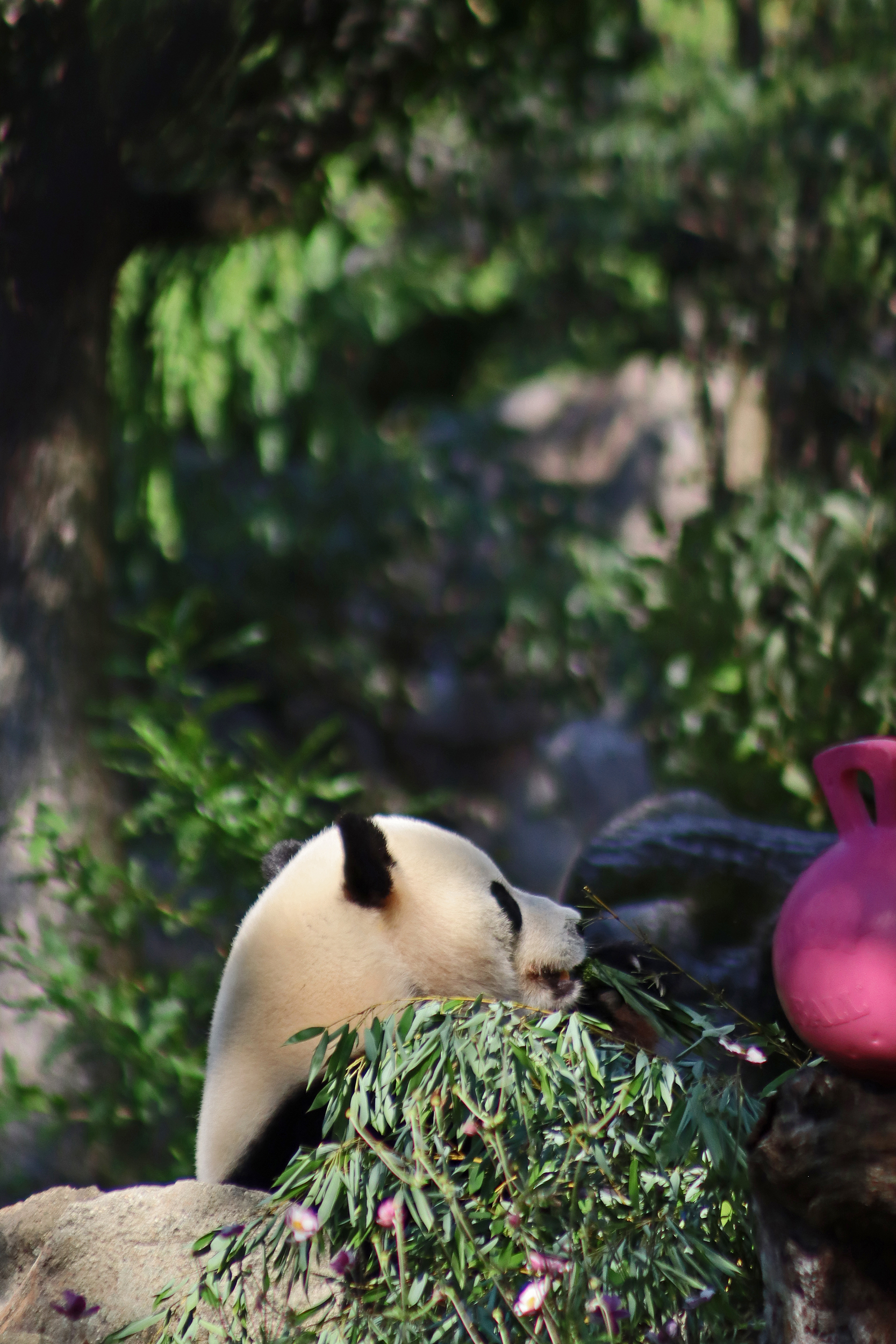 When I first arrived both mornings he was outside enjoying his breakfast – overall he spent his days pretty equally between the inside and outside yards and I saw him a good proportion of my time in each, giving me a nice variety of photos. With this yard, you do see him a bit better from the upper path viewing, and there was plenty of space for lots of people to get a good view of him. He had some different enrichment toys both outside and inside and on both the days, so lots of puzzles to figure out for treats. On the afternoon of the first day he got a fruit ice treat and he seemed to really love this, I sure loved watching this as I saw grandpa Tian Tian get the same treat on my last visit! On the second day the highlight was seeing him having an absolute whale of a time with a big plastic basin which must of had some sort of treat rubbed inside it – he spent at least 30mins focusing on the basin, giving it a very thorough lick and holding it on his head XD
