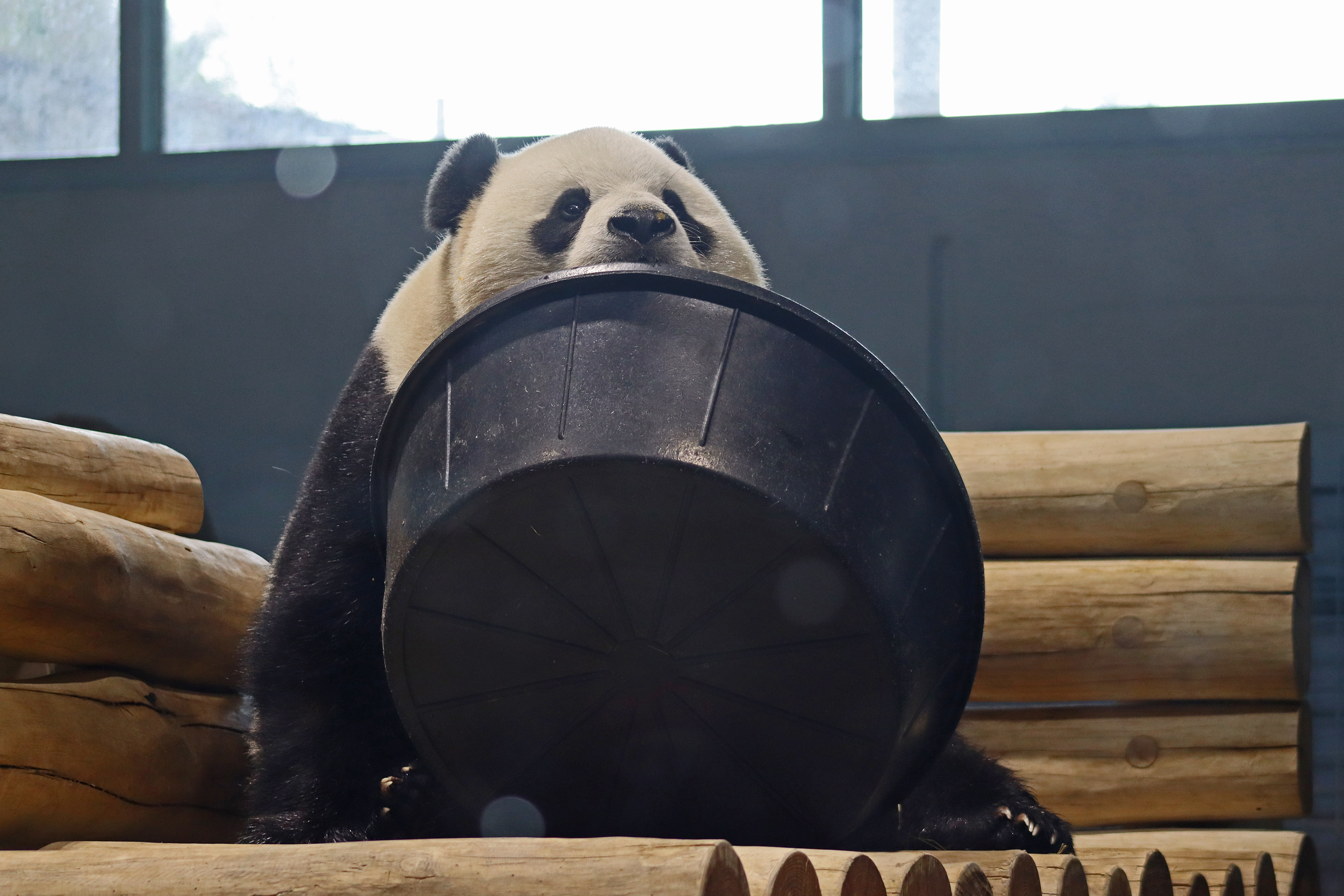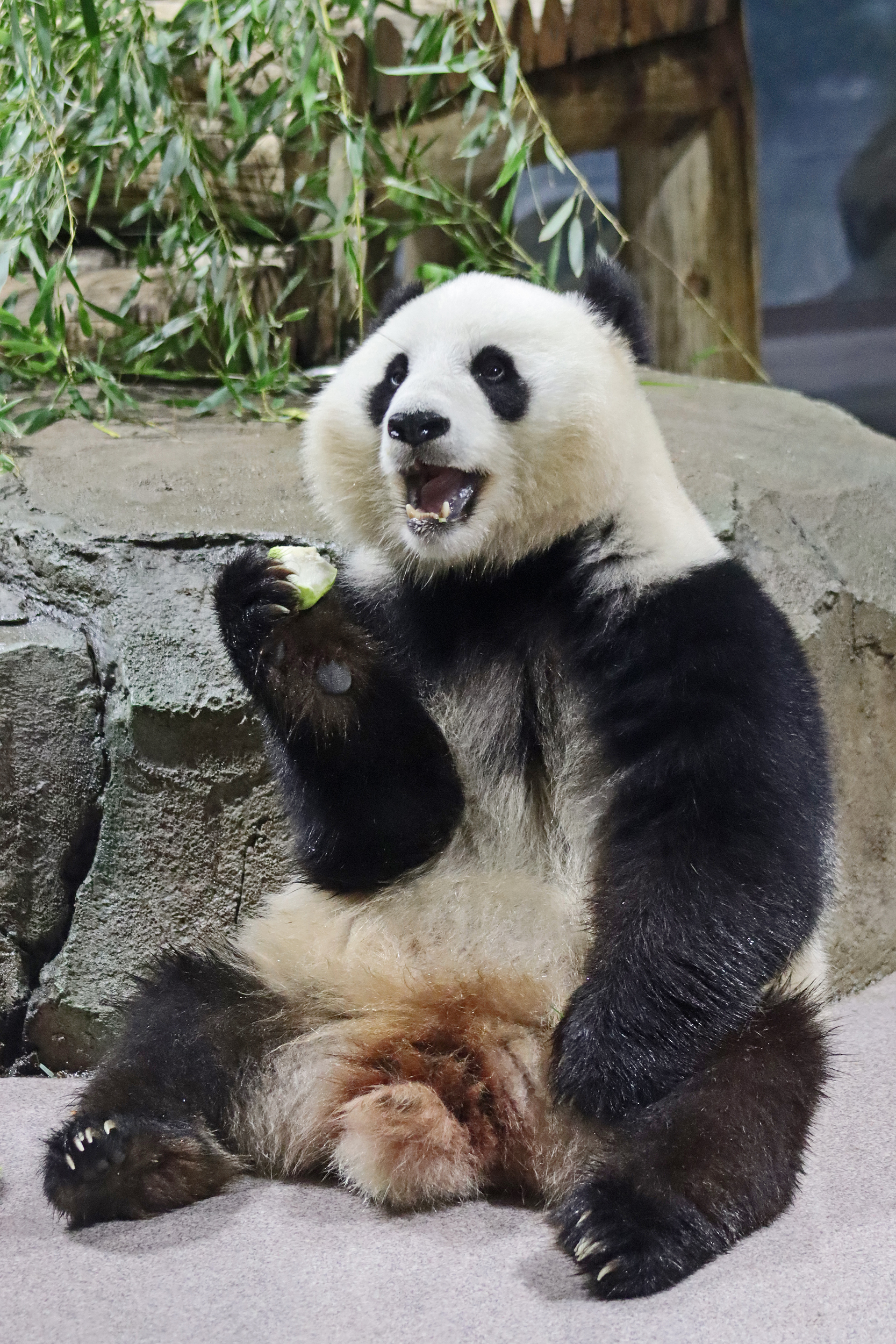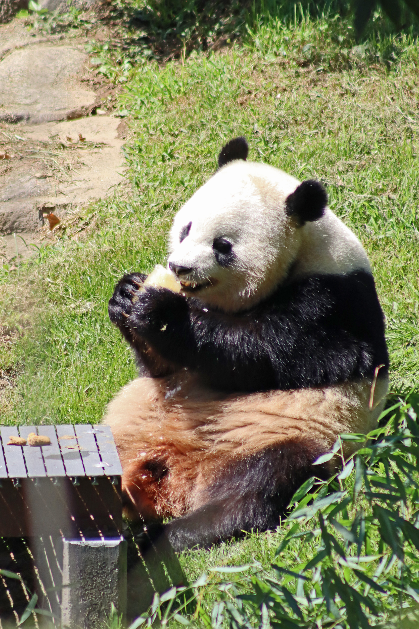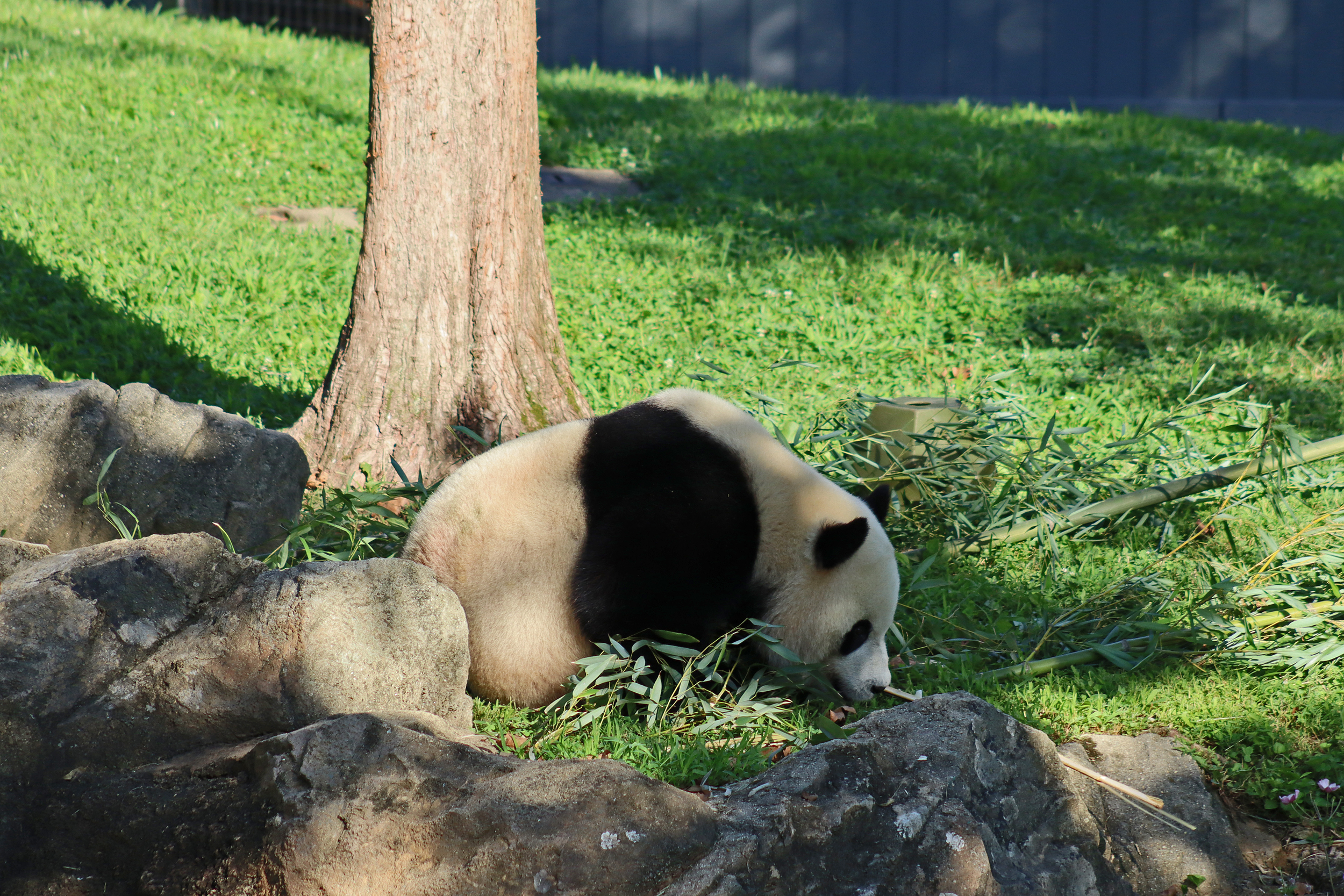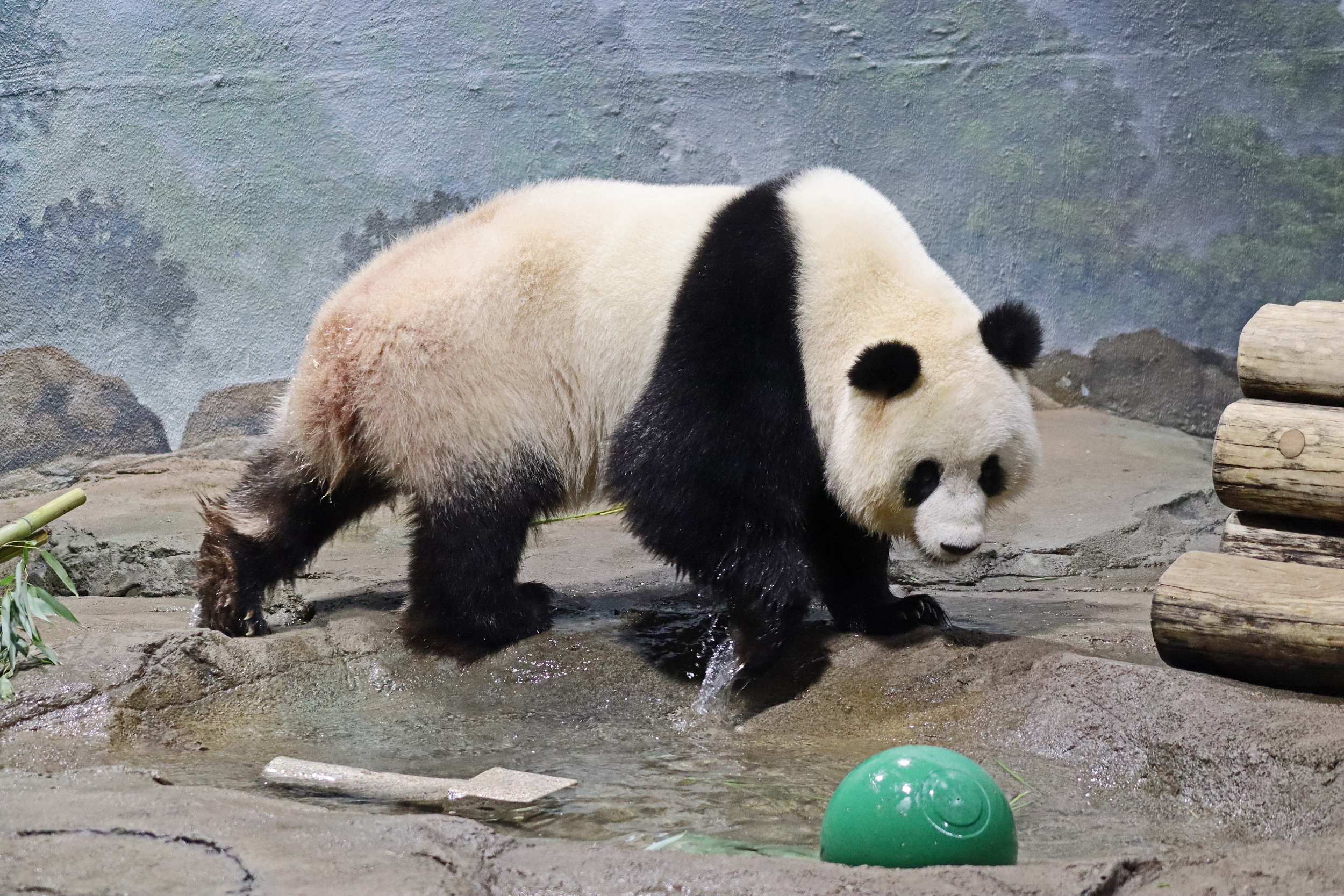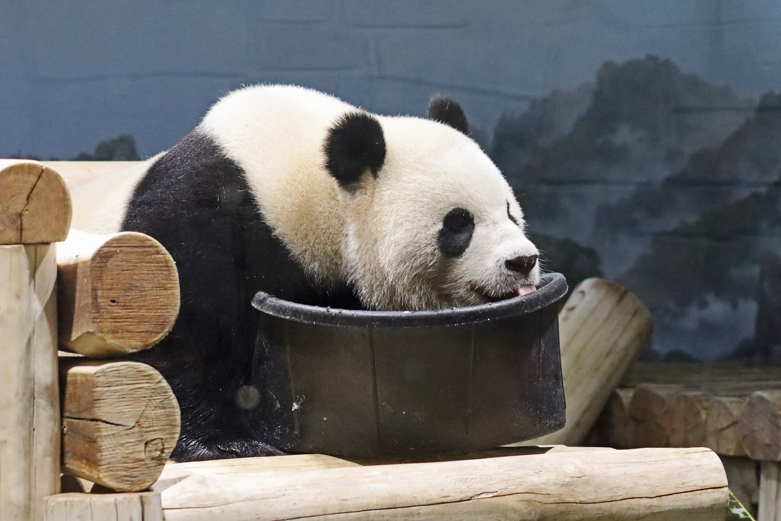 When I first arrived both mornings he was outside enjoying his breakfast – overall he spent his days pretty equally between the inside and outside yards and I saw him a good proportion of my time in each, giving me a nice variety of photos. With this yard, you do see him a bit better from the upper path viewing, and there was plenty of space for lots of people to get a good view of him. He had some different enrichment toys both outside and inside and on both the days, so lots of puzzles to figure out for treats. On the afternoon of the first day he got a fruit ice treat and he seemed to really love this, I sure loved watching this as I saw grandpa Tian Tian get the same treat on my last visit! On the second day the highlight was seeing him having an absolute whale of a time with a big plastic basin which must of had some sort of treat rubbed inside it – he spent at least 30mins focusing on the basin, giving it a very thorough lick and holding it on his head XD