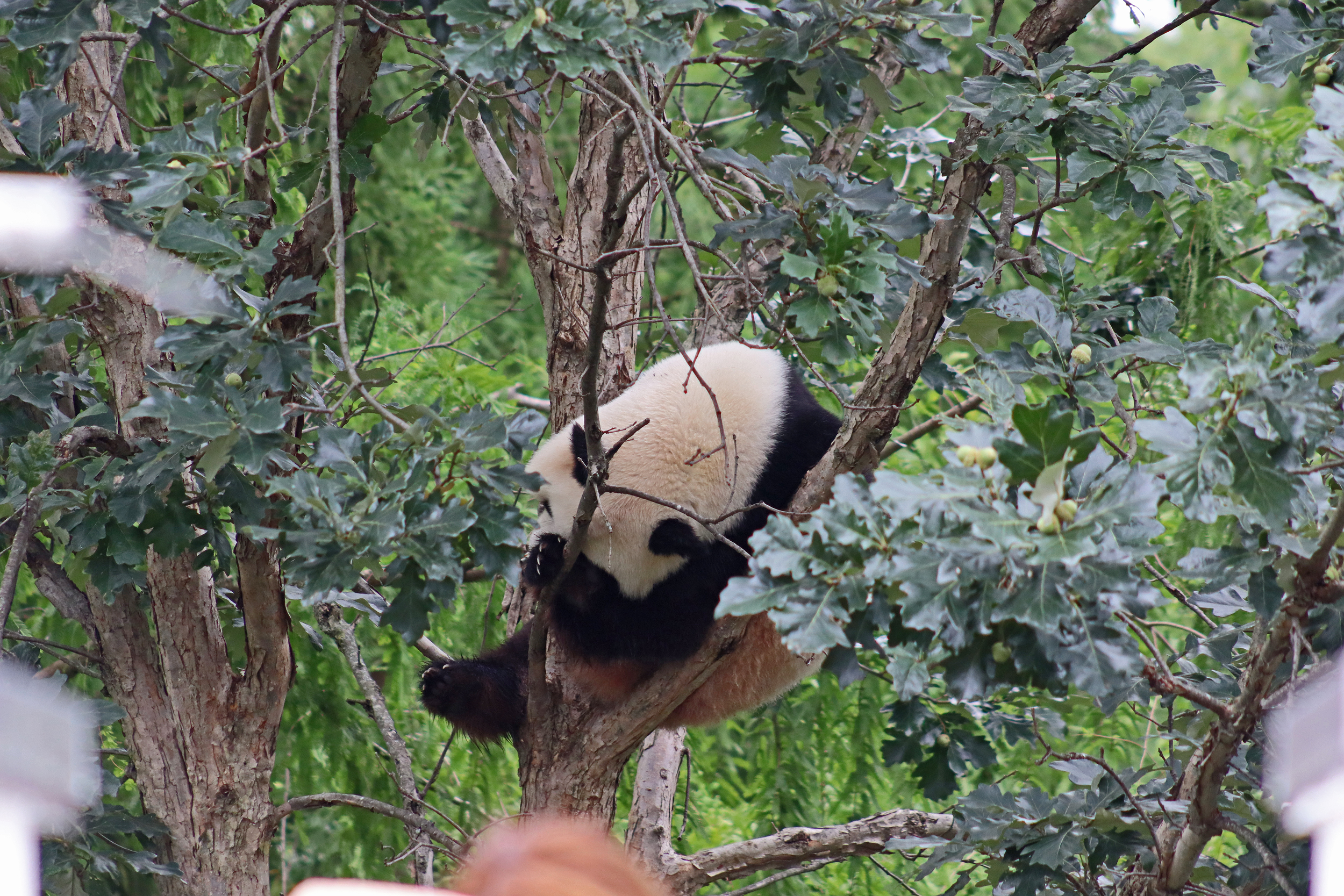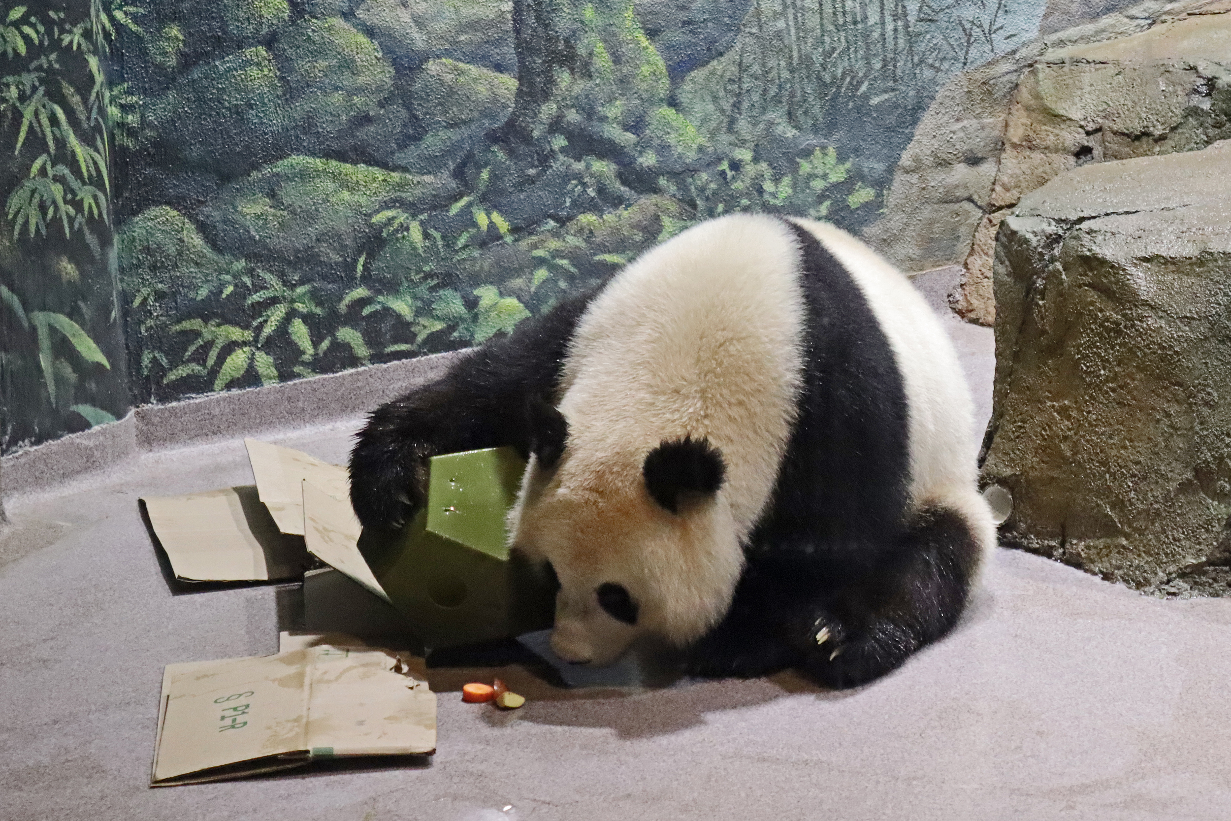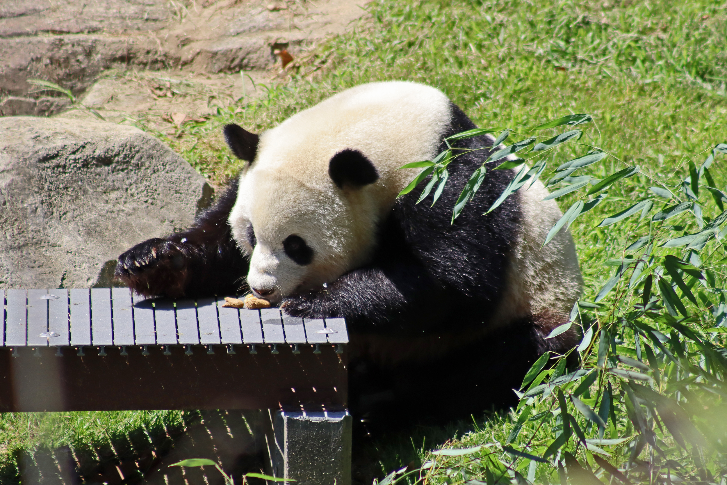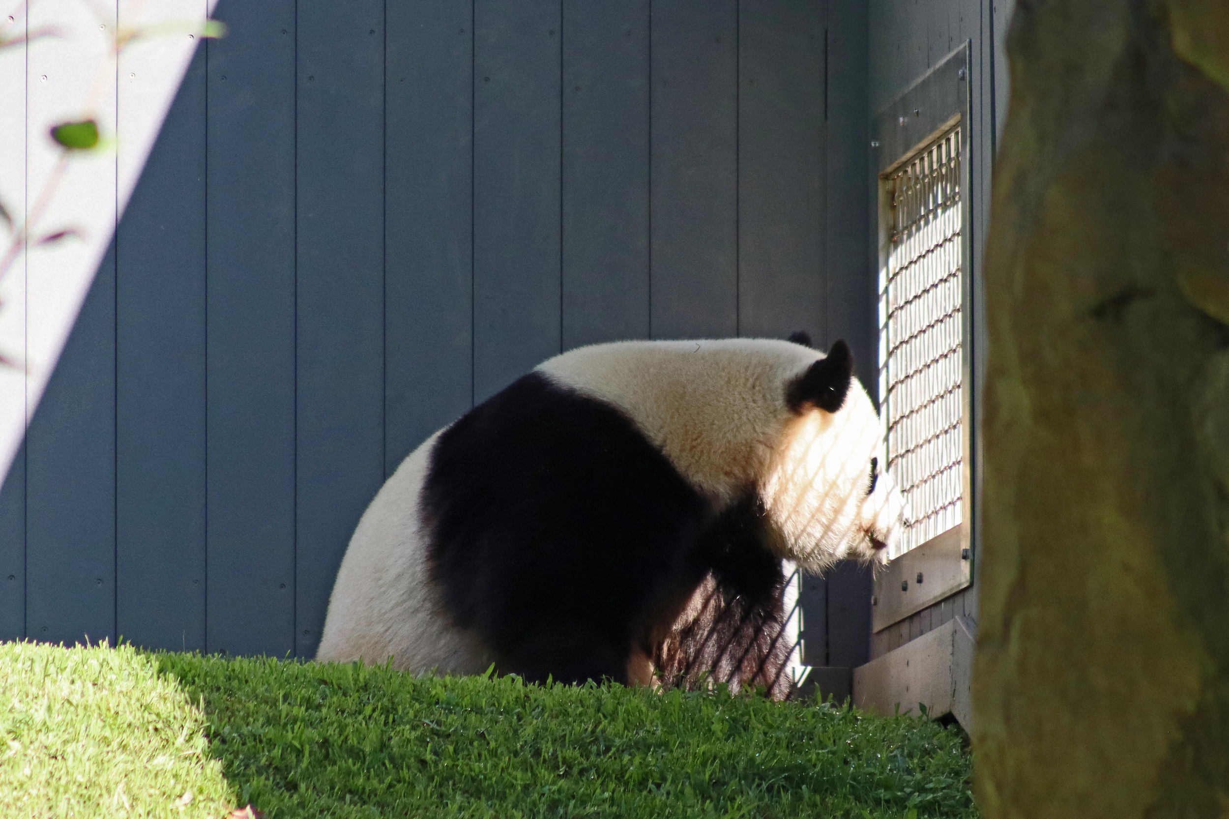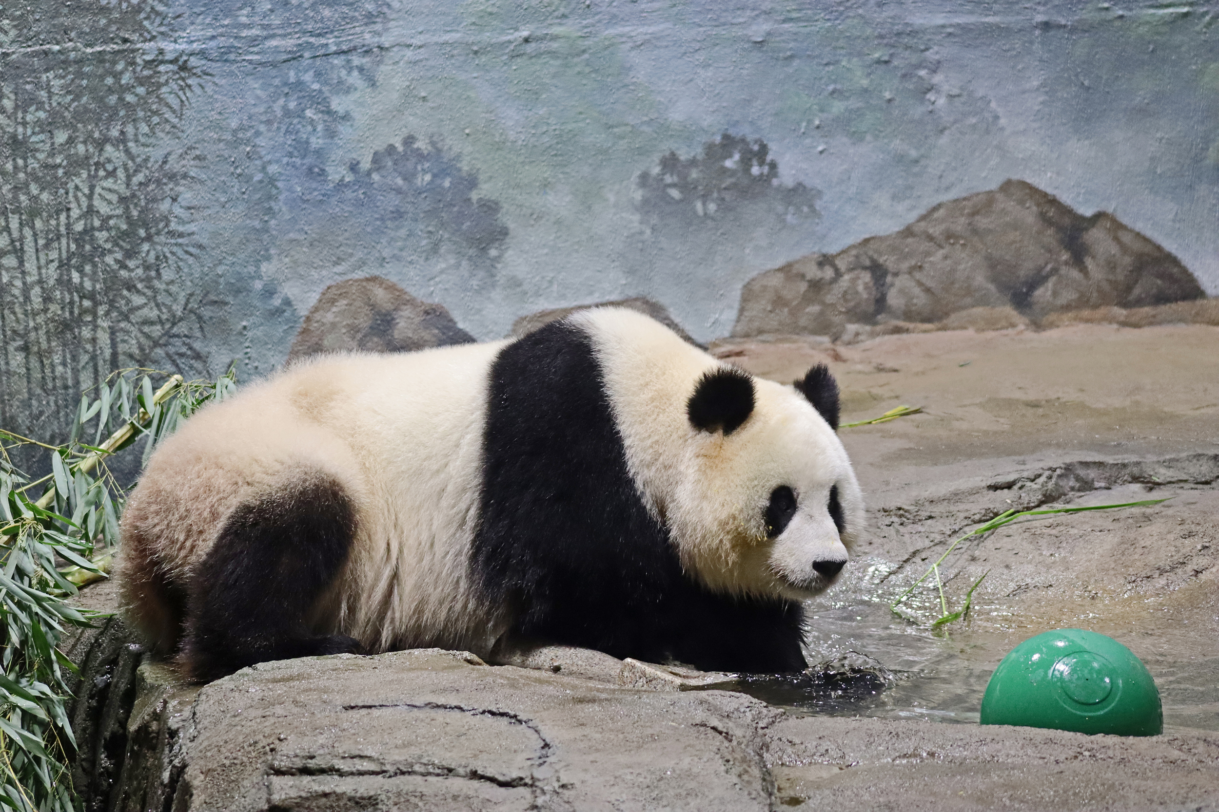 When I first arrived both mornings he was outside enjoying his breakfast – overall he spent his days pretty equally between the inside and outside yards and I saw him a good proportion of my time in each, giving me a nice variety of photos. With this yard, you do see him a bit better from the upper path viewing, and there was plenty of space for lots of people to get a good view of him. He had some different enrichment toys both outside and inside and on both the days, so lots of puzzles to figure out for treats. On the afternoon of the first day he got a fruit ice treat and he seemed to really love this, I sure loved watching this as I saw grandpa Tian Tian get the same treat on my last visit! On the second day the highlight was seeing him having an absolute whale of a time with a big plastic basin which must of had some sort of treat rubbed inside it – he spent at least 30mins focusing on the basin, giving it a very thorough lick and holding it on his head XD