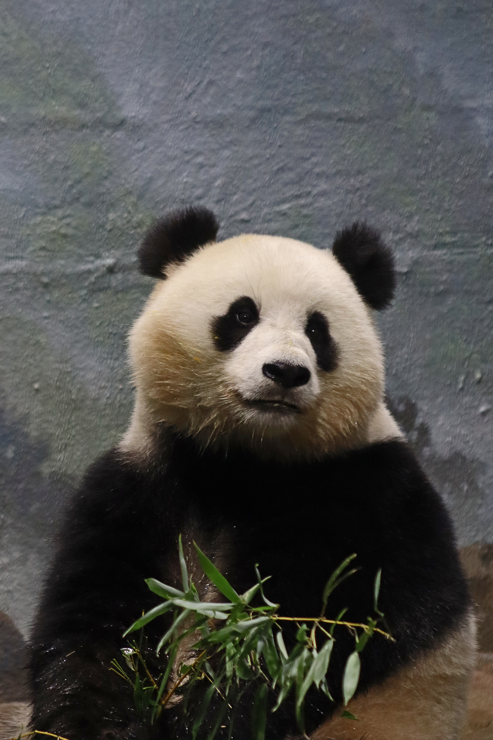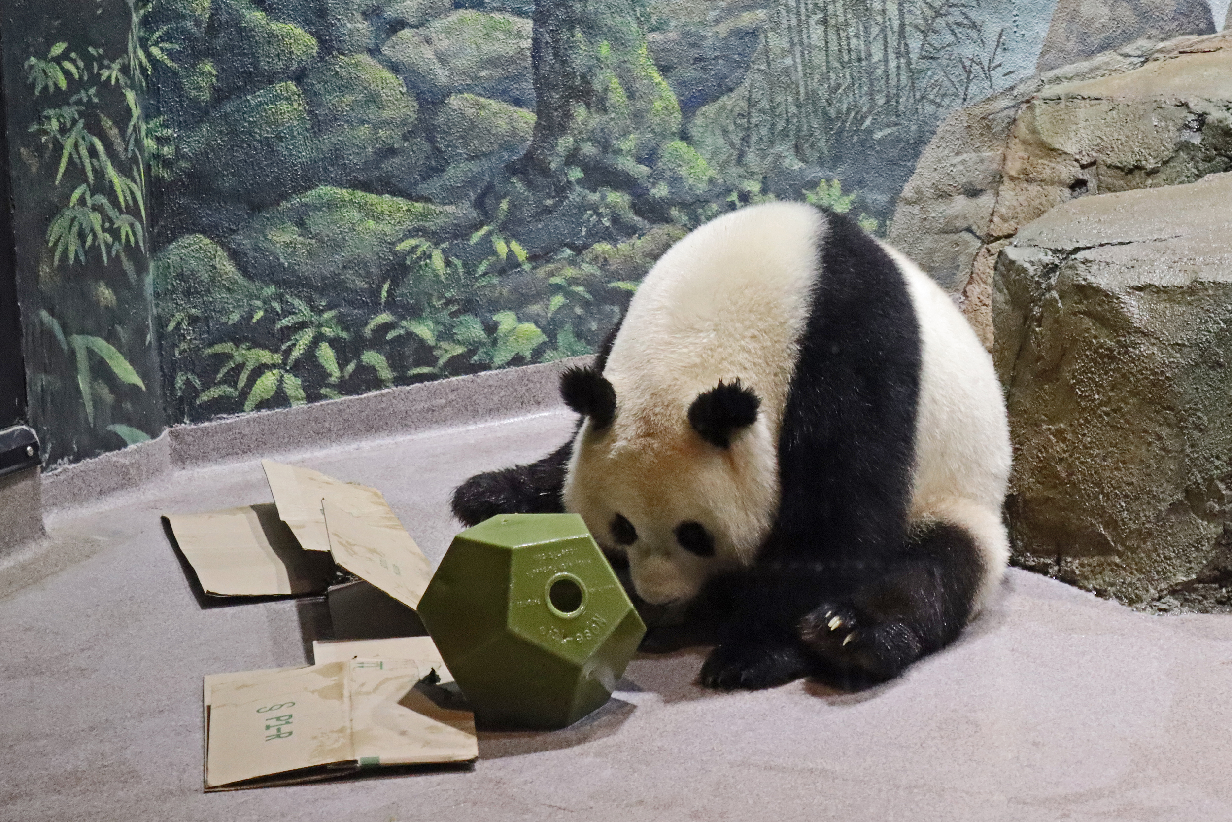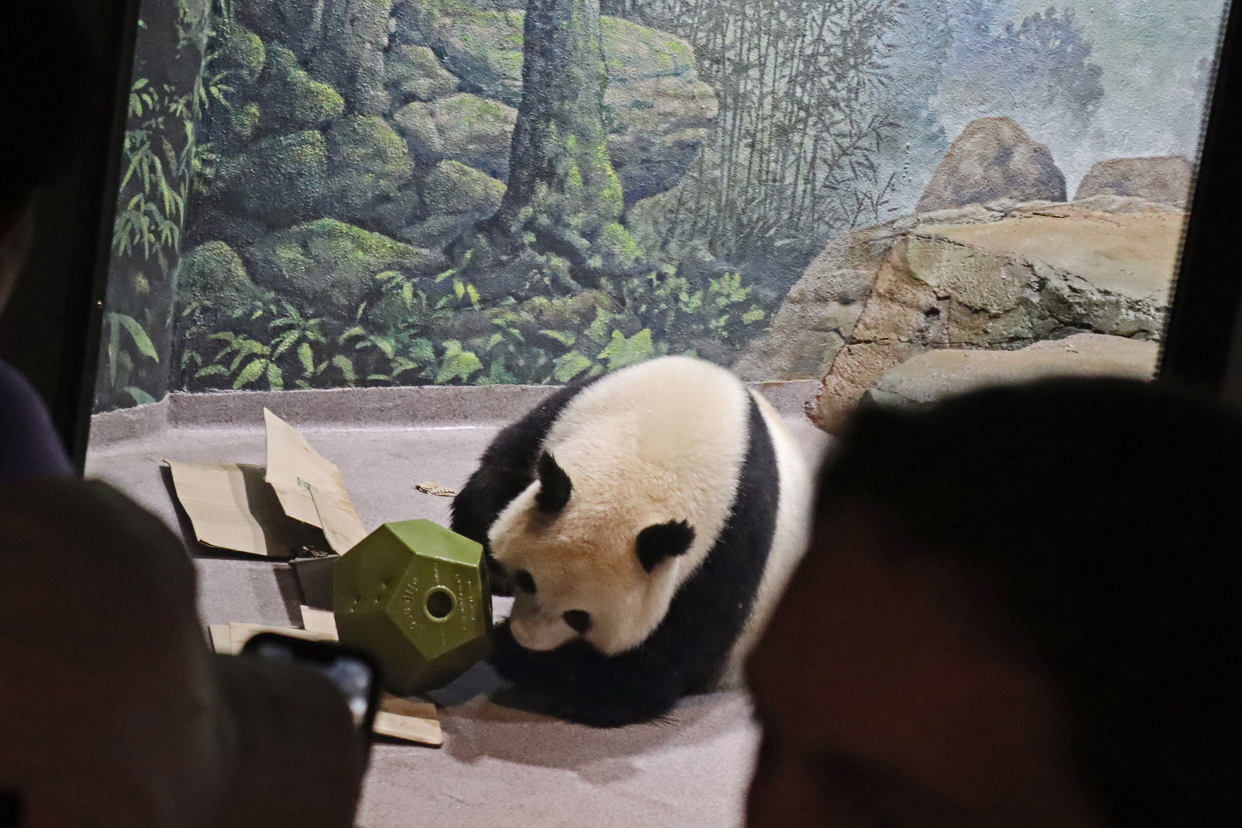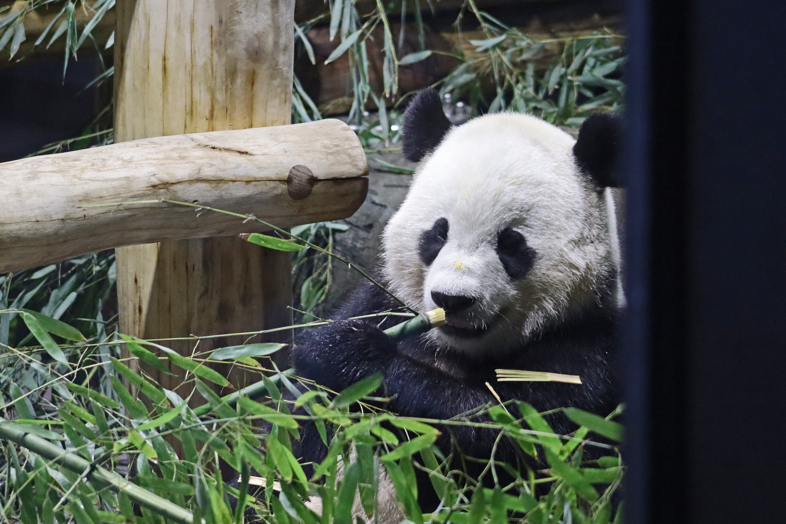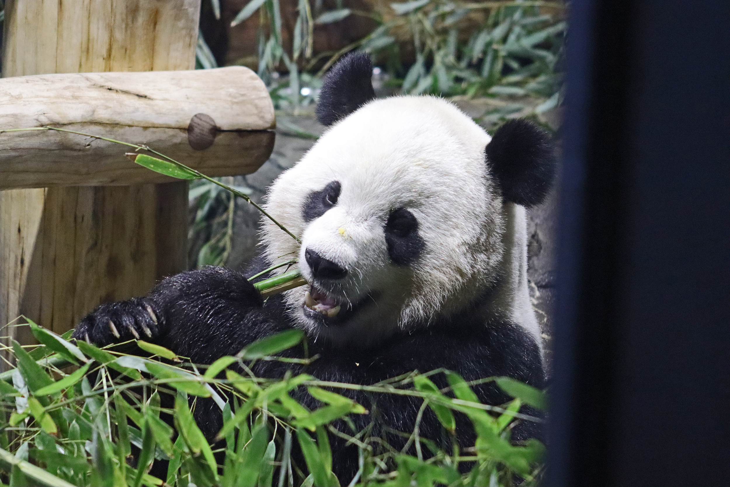 When I first arrived both mornings he was outside enjoying his breakfast – overall he spent his days pretty equally between the inside and outside yards and I saw him a good proportion of my time in each, giving me a nice variety of photos. With this yard, you do see him a bit better from the upper path viewing, and there was plenty of space for lots of people to get a good view of him. He had some different enrichment toys both outside and inside and on both the days, so lots of puzzles to figure out for treats. On the afternoon of the first day he got a fruit ice treat and he seemed to really love this, I sure loved watching this as I saw grandpa Tian Tian get the same treat on my last visit! On the second day the highlight was seeing him having an absolute whale of a time with a big plastic basin which must of had some sort of treat rubbed inside it – he spent at least 30mins focusing on the basin, giving it a very thorough lick and holding it on his head XD
