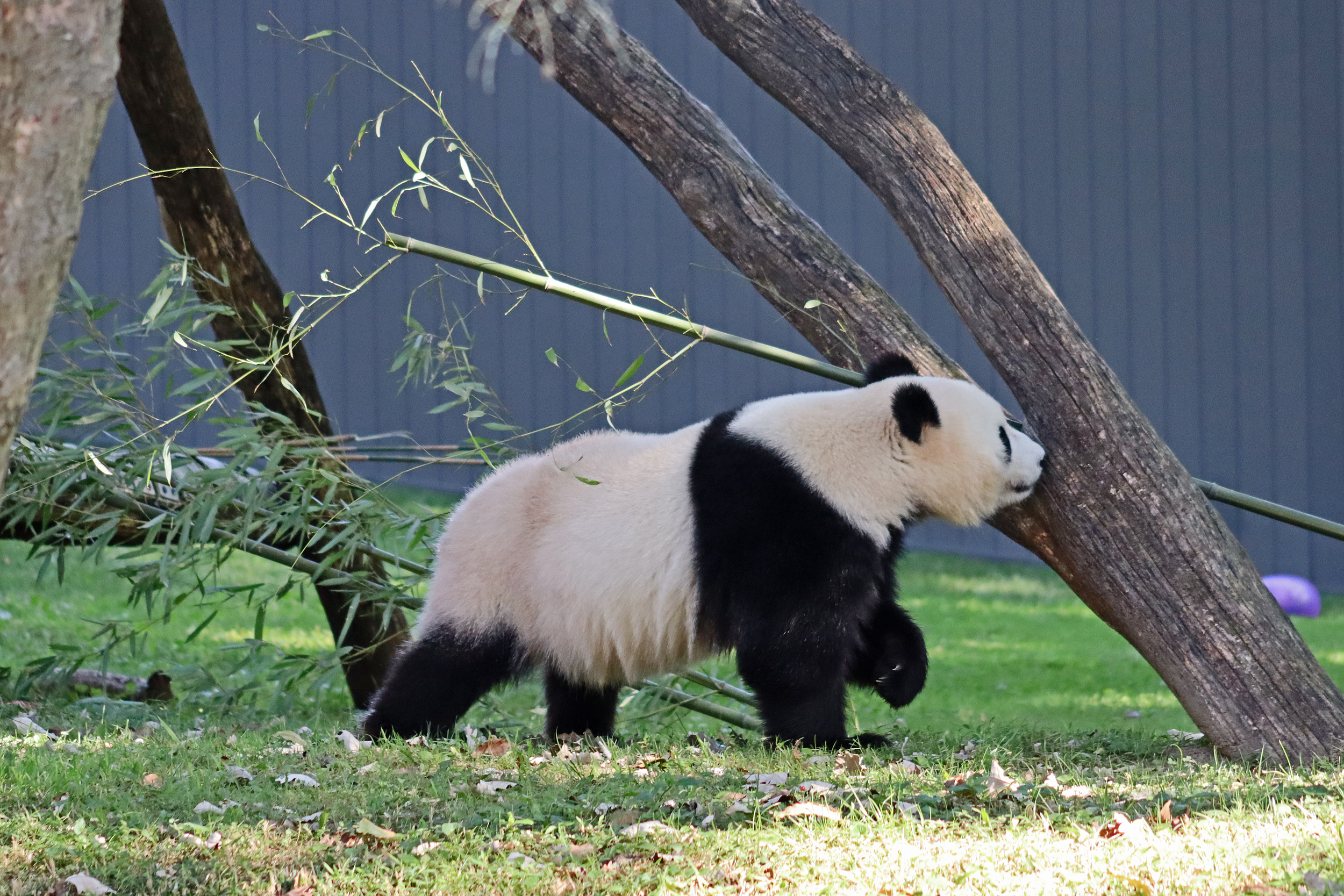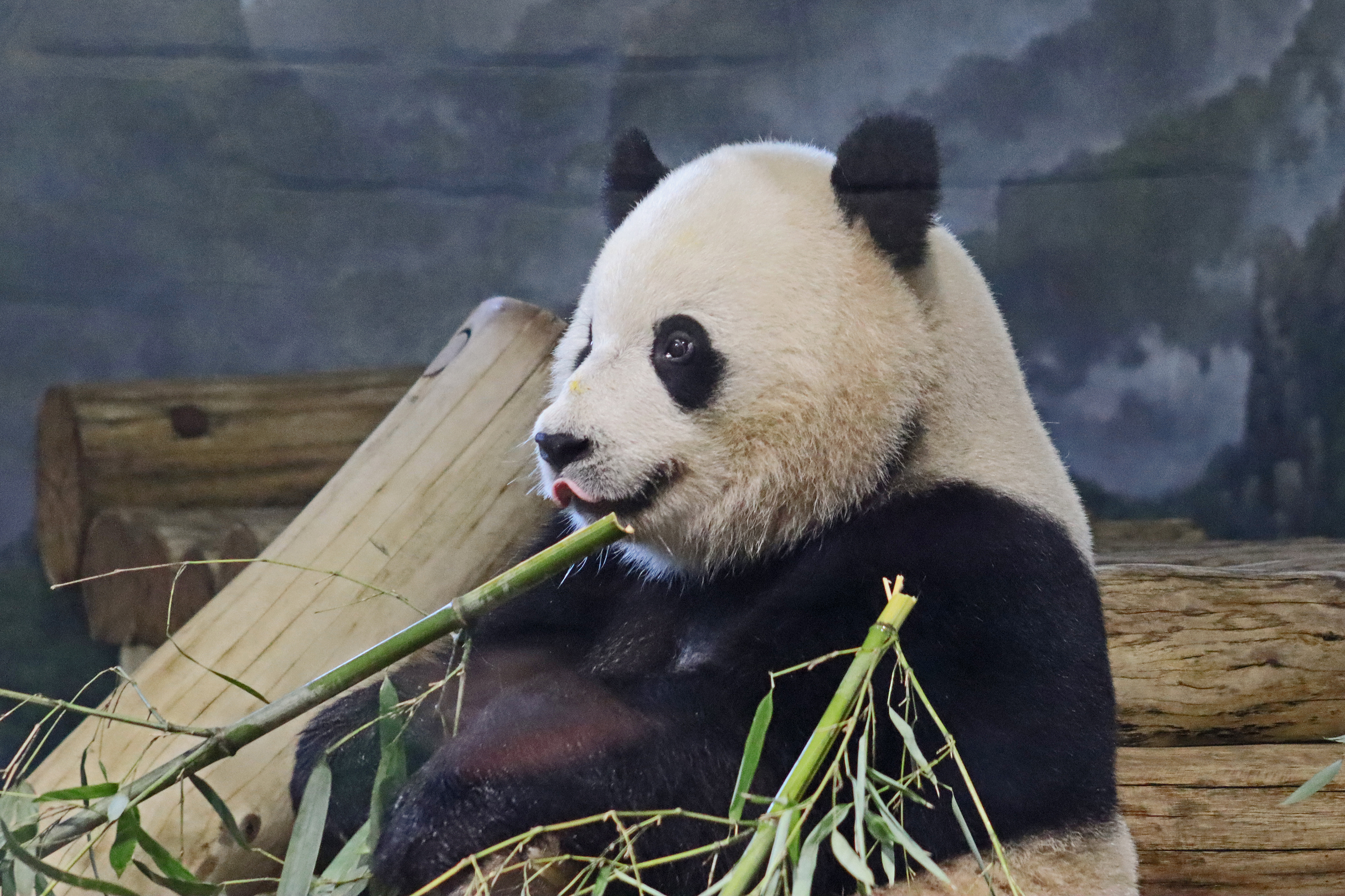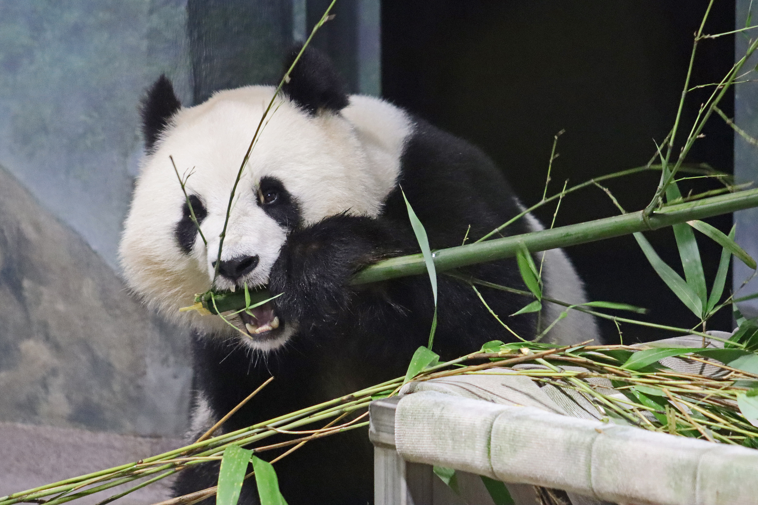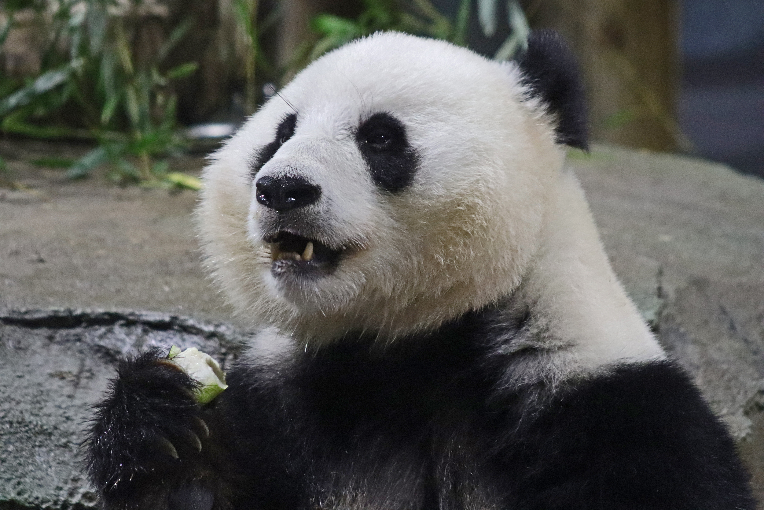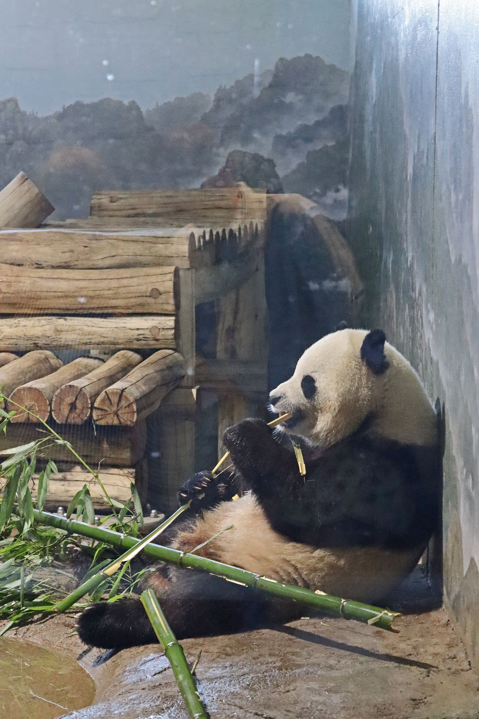 When I first arrived both mornings he was outside enjoying his breakfast – overall he spent his days pretty equally between the inside and outside yards and I saw him a good proportion of my time in each, giving me a nice variety of photos. With this yard, you do see him a bit better from the upper path viewing, and there was plenty of space for lots of people to get a good view of him. He had some different enrichment toys both outside and inside and on both the days, so lots of puzzles to figure out for treats. On the afternoon of the first day he got a fruit ice treat and he seemed to really love this, I sure loved watching this as I saw grandpa Tian Tian get the same treat on my last visit! On the second day the highlight was seeing him having an absolute whale of a time with a big plastic basin which must of had some sort of treat rubbed inside it – he spent at least 30mins focusing on the basin, giving it a very thorough lick and holding it on his head XD