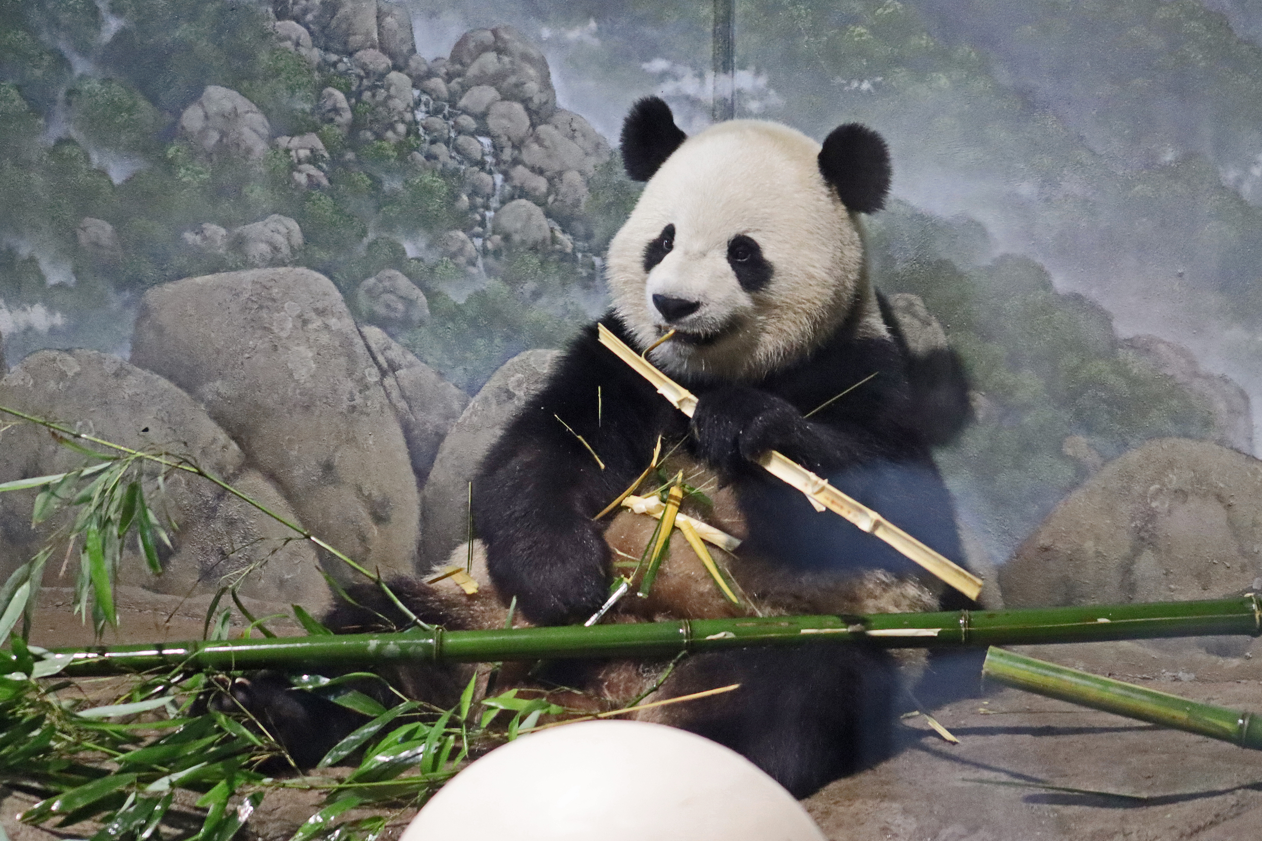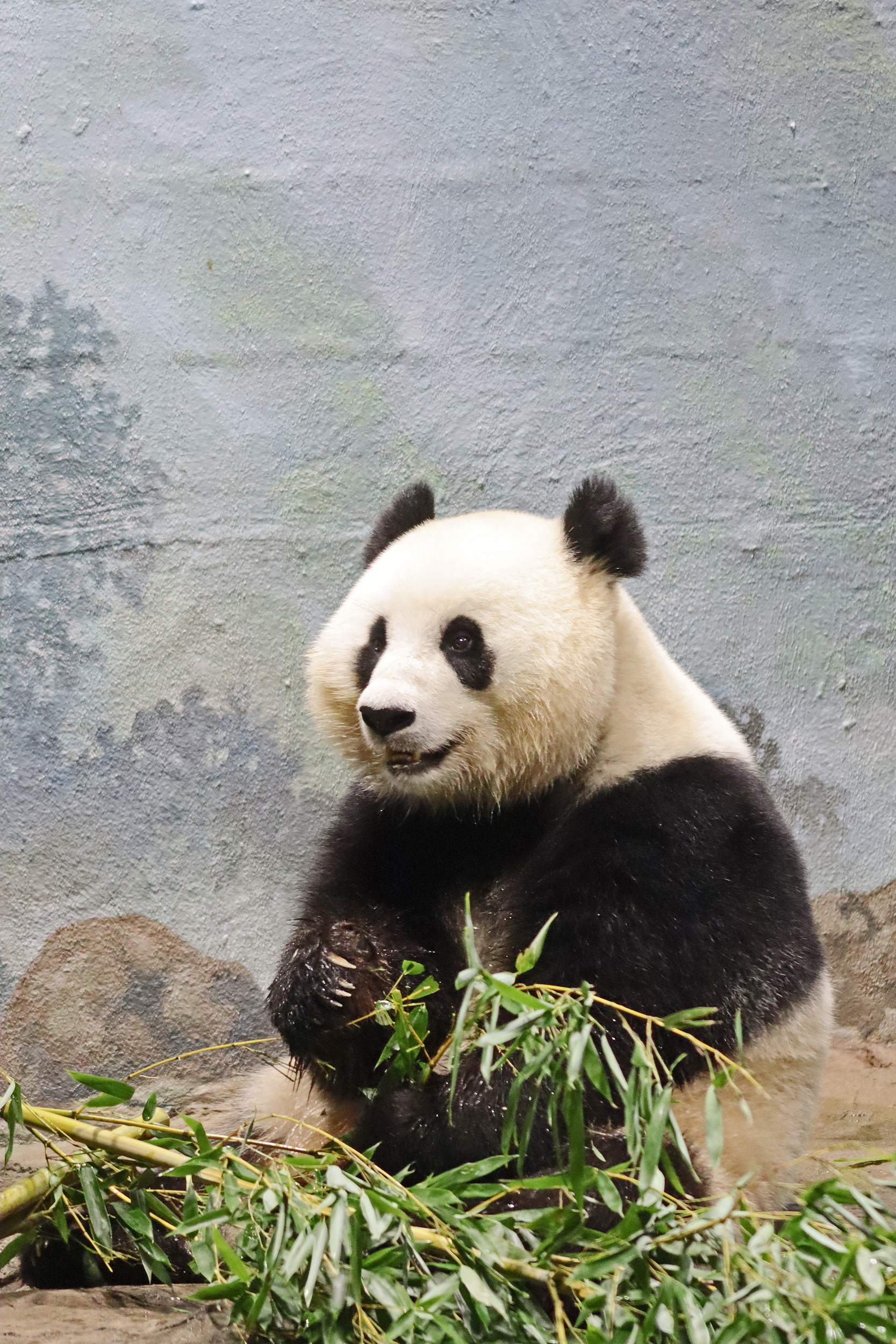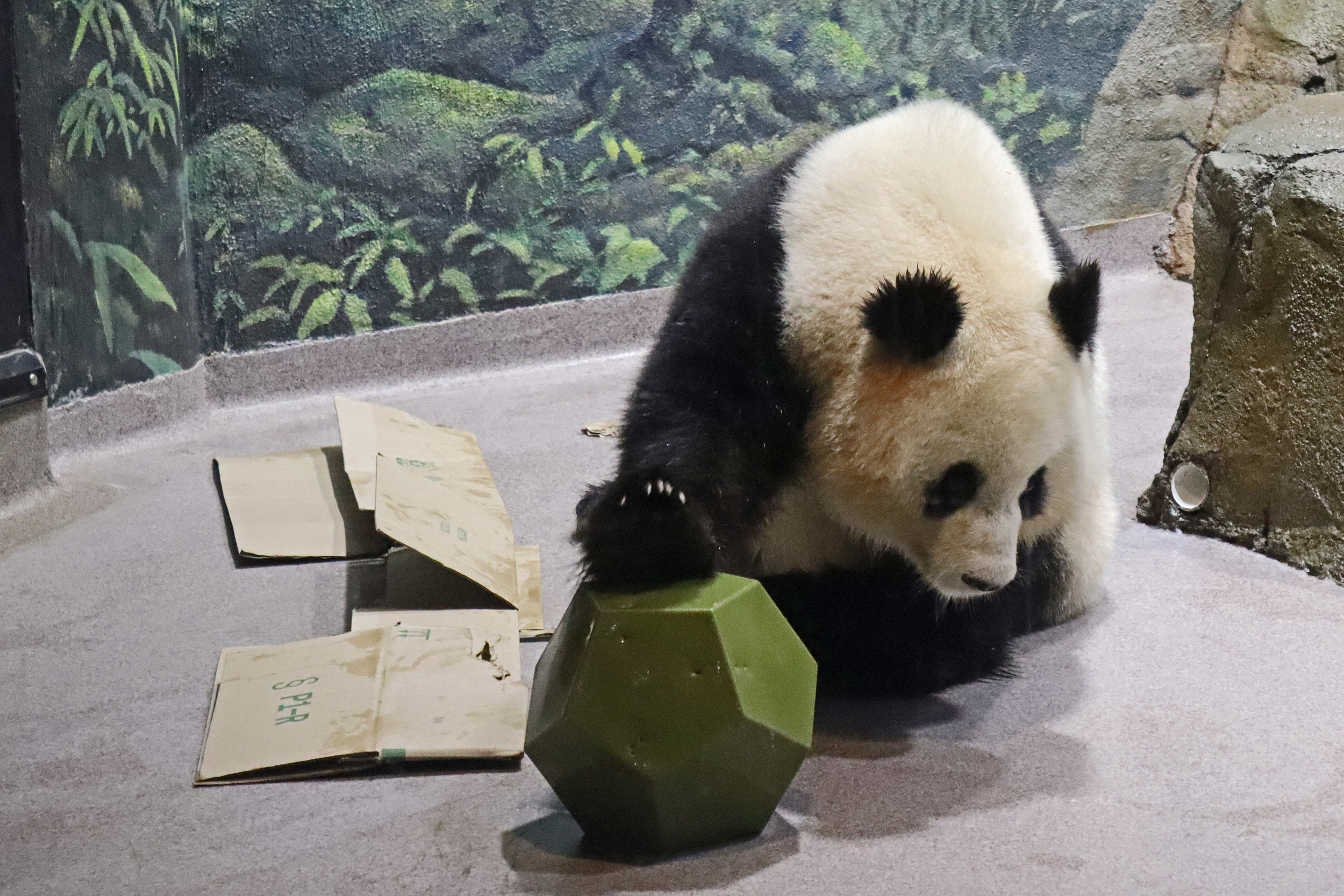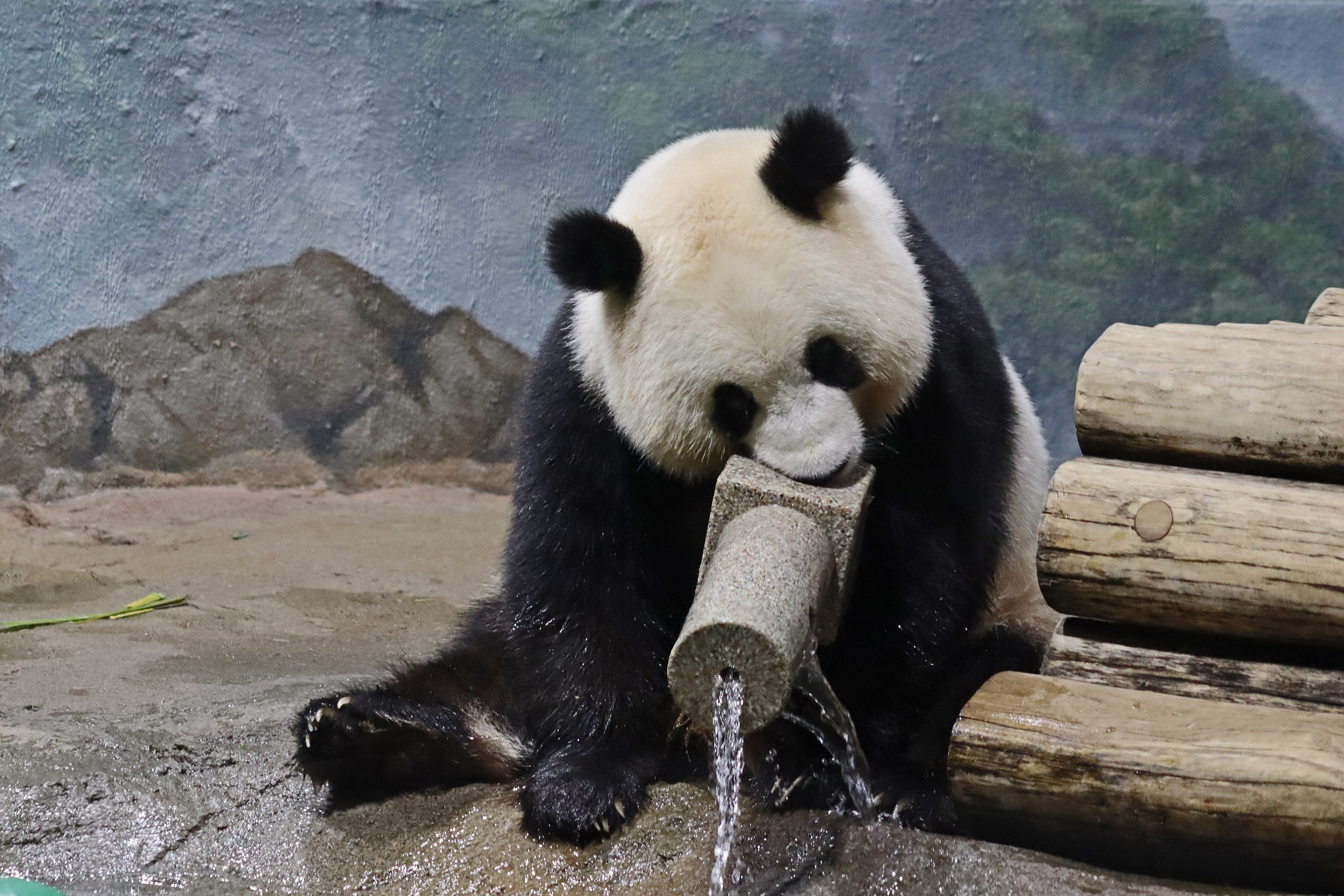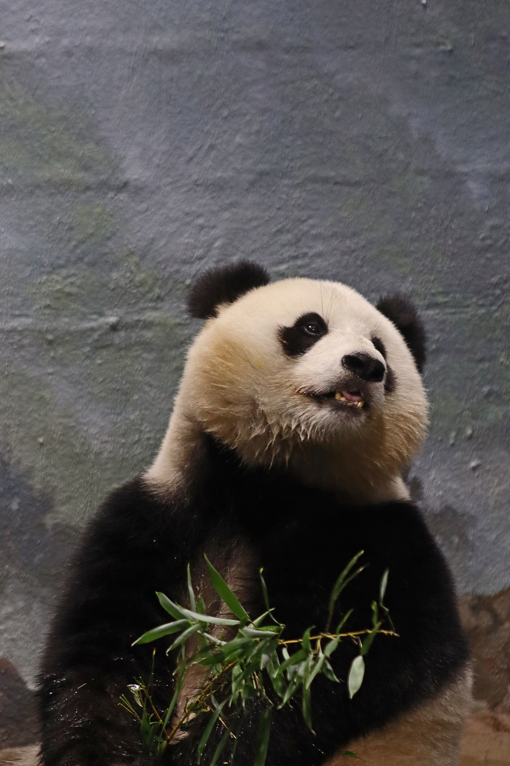 When I first arrived both mornings he was outside enjoying his breakfast – overall he spent his days pretty equally between the inside and outside yards and I saw him a good proportion of my time in each, giving me a nice variety of photos. With this yard, you do see him a bit better from the upper path viewing, and there was plenty of space for lots of people to get a good view of him. He had some different enrichment toys both outside and inside and on both the days, so lots of puzzles to figure out for treats. On the afternoon of the first day he got a fruit ice treat and he seemed to really love this, I sure loved watching this as I saw grandpa Tian Tian get the same treat on my last visit! On the second day the highlight was seeing him having an absolute whale of a time with a big plastic basin which must of had some sort of treat rubbed inside it – he spent at least 30mins focusing on the basin, giving it a very thorough lick and holding it on his head XD