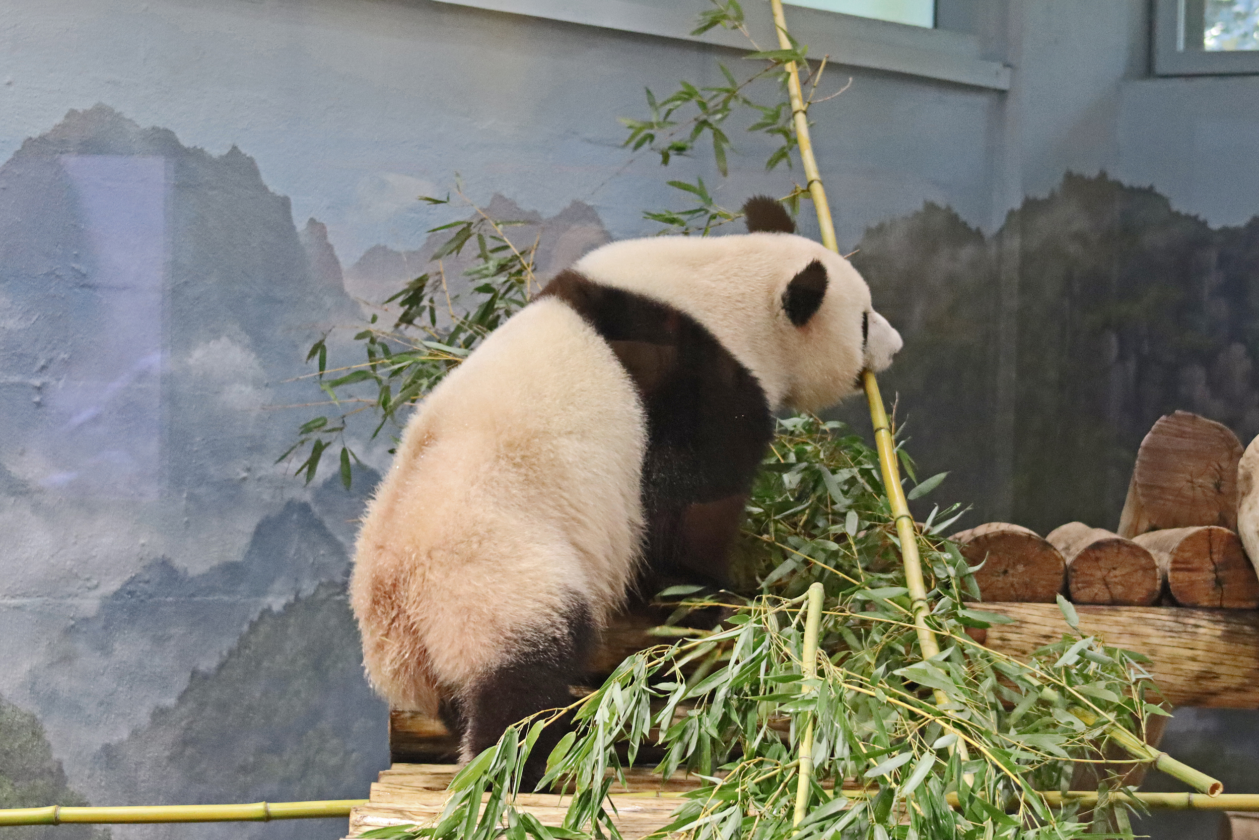 First up, male Bao Li 宝力! Bao Li is a very special choice for the Smithsonian National Zoo – his mum is Bao Bao, who was born in the zoo in 2013 to parents Mei Xiang and Tian Tian. She was the first surviving cub in a number of years, so hers was a very special birth, and now she’s contributing to the population as a very successful mother herself. Bao Li is from her second pregnancy, and he has a twin brother who I’ve also been lucky enough to see earlier this year in the Dujiangyan Base! Bao Li was born in 2021, so had just turned 4 years old when I saw him on this trip, he’s still just as fun and playful as when I saw him in China^ He has such a lovely personality and was so chilled out across the two days of my visit.