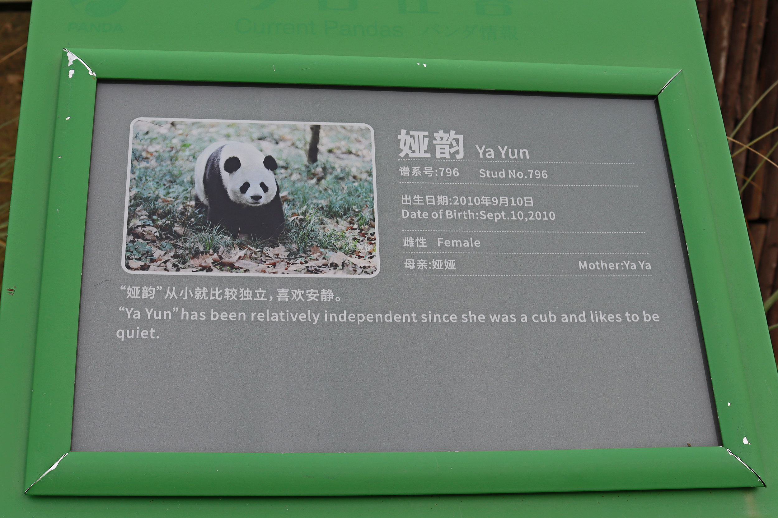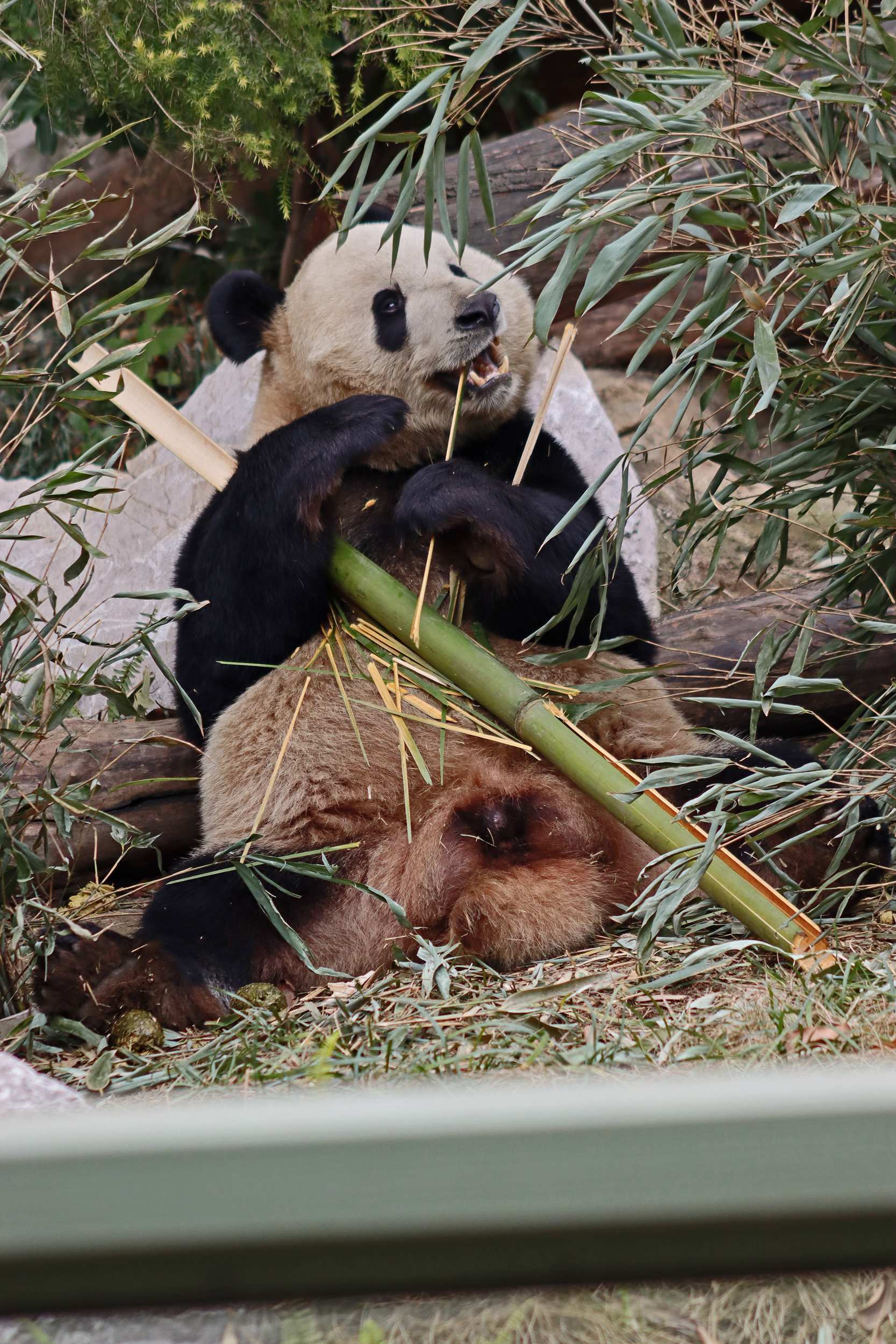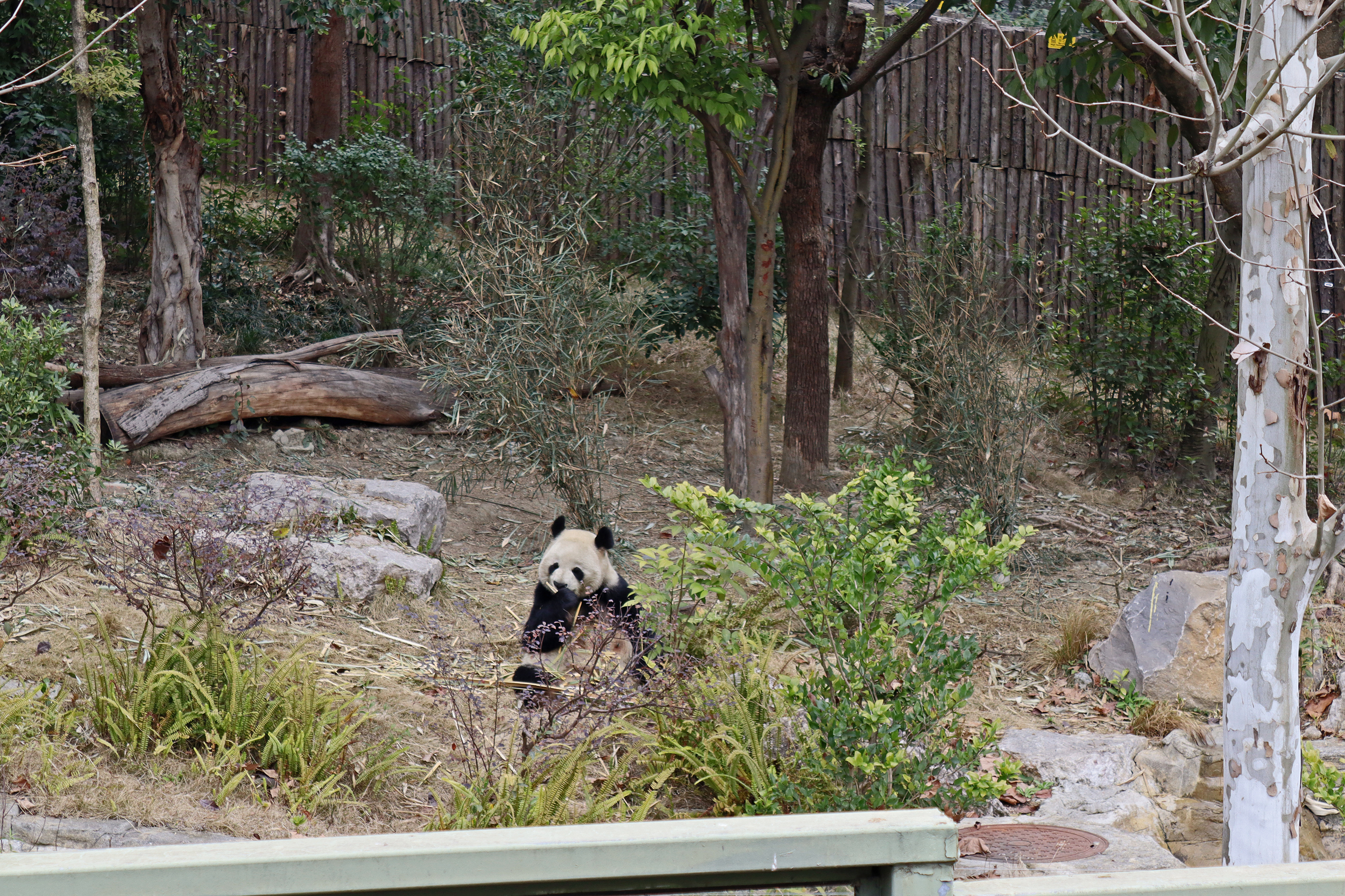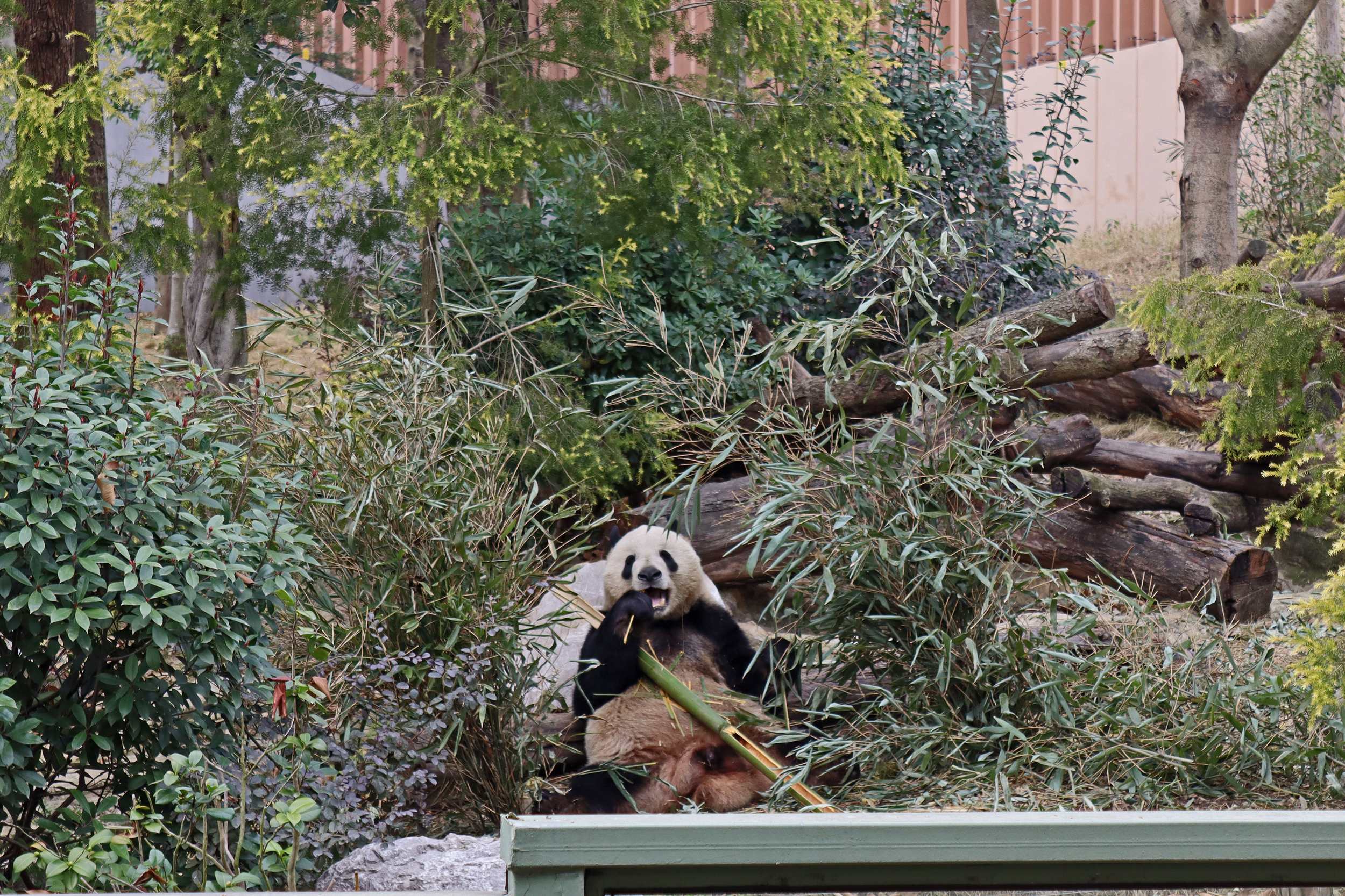 Ya Yun 娅韵 was also enjoying her bamboo when I saw her, at least she wasn’t as difficult to see as she was sat right in the open near the front of the yard. Her sign says she likes to be quiet and I think she was happy to sit out because it was so quiet with almost no visitors. She became a mother for the first time in 2018 to twins, one of whom I also saw in the same pavilion (Yun Wen, although I only saw her sleeping on a platform half way back into the yard). She then had a second pregnancy in 2023 with one cub, Xing Yun, but she also was surrogate mother to Lun Wen, one of the twins of Mei Lun (born at Zoo Atlanta) who were born in the same year – lots of pictures of these youngsters online!