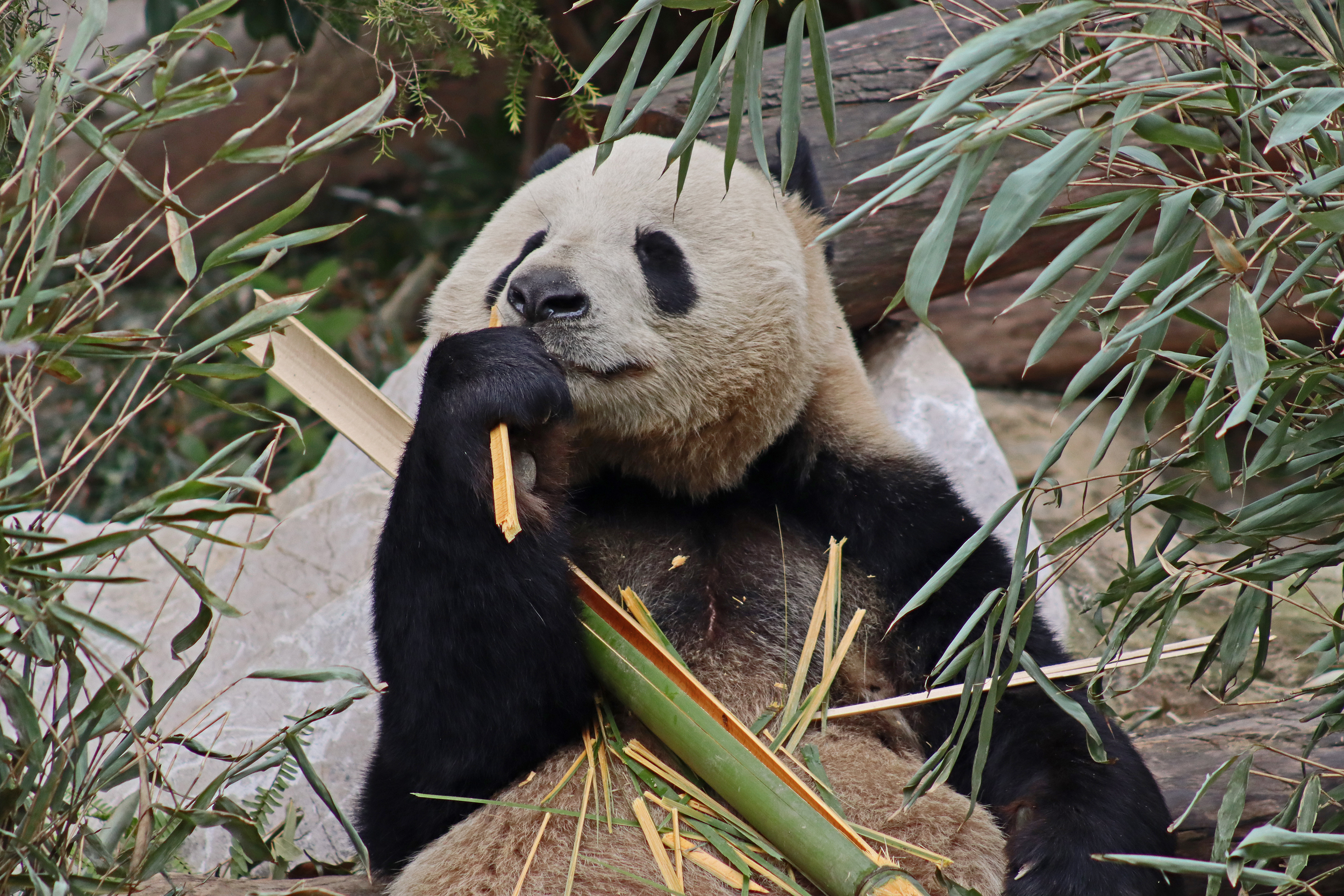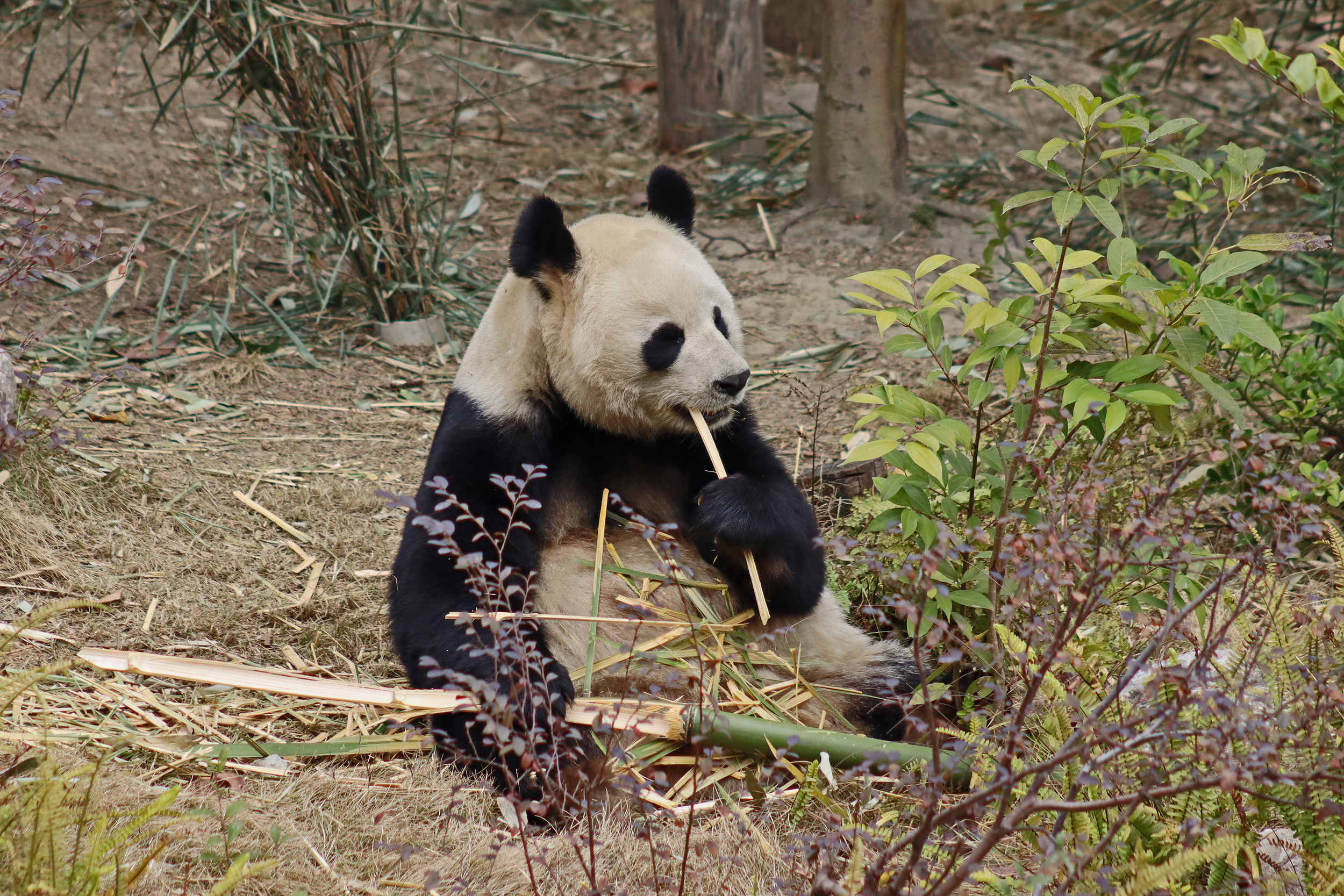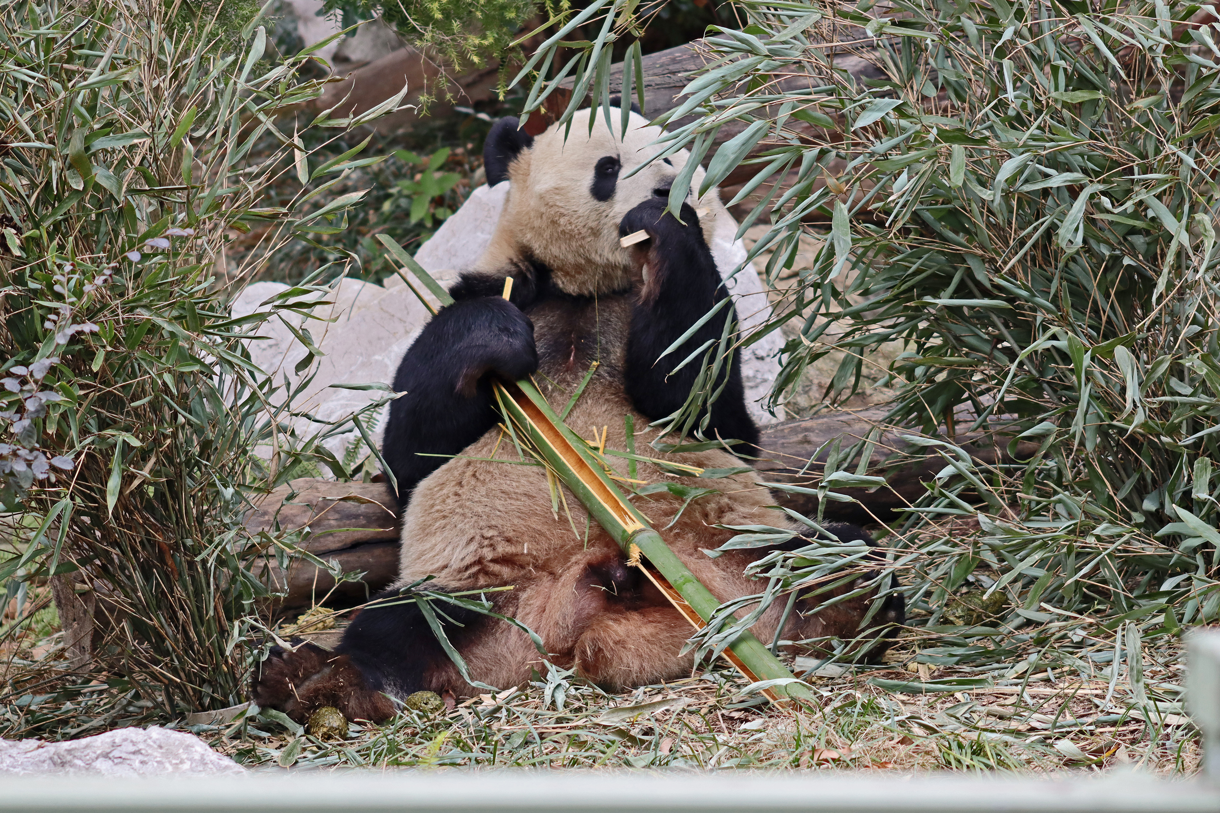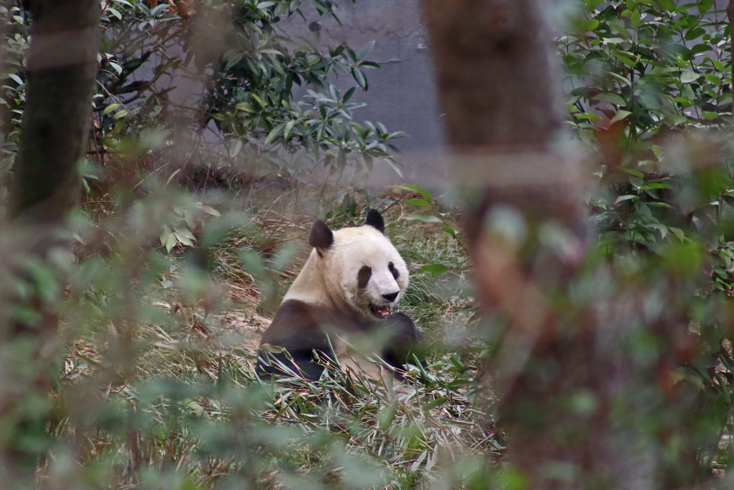 Ya Yun 娅韵 was also enjoying her bamboo when I saw her, at least she wasn’t as difficult to see as she was sat right in the open near the front of the yard. Her sign says she likes to be quiet and I think she was happy to sit out because it was so quiet with almost no visitors. She became a mother for the first time in 2018 to twins, one of whom I also saw in the same pavilion (Yun Wen, although I only saw her sleeping on a platform half way back into the yard). She then had a second pregnancy in 2023 with one cub, Xing Yun, but she also was surrogate mother to Lun Wen, one of the twins of Mei Lun (born at Zoo Atlanta) who were born in the same year – lots of pictures of these youngsters online!