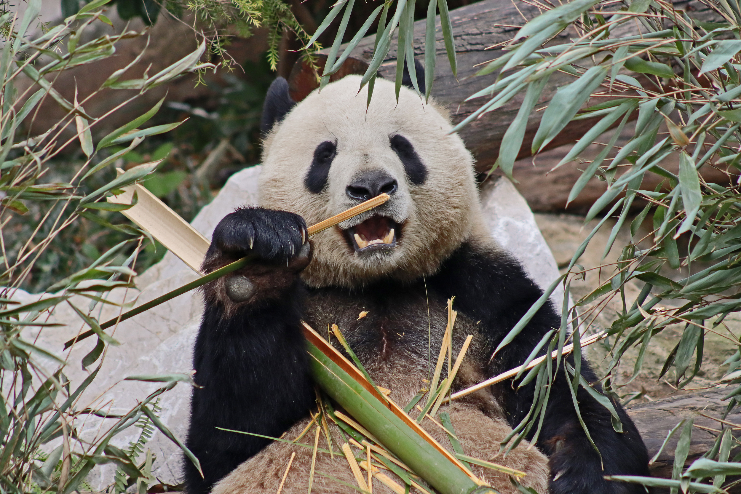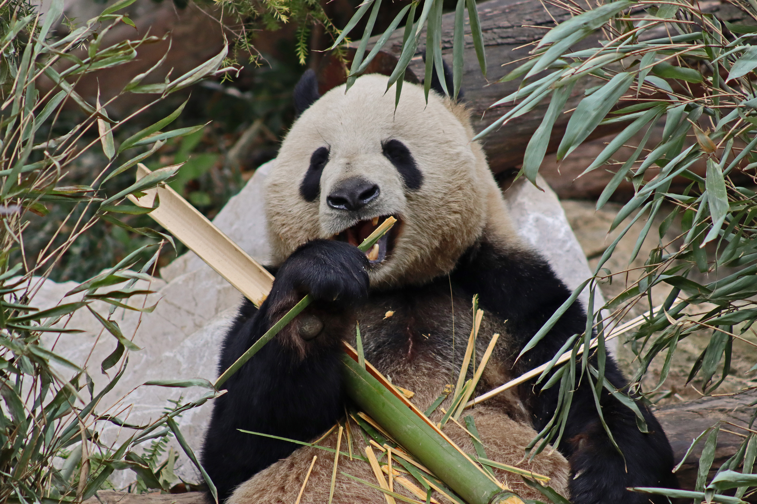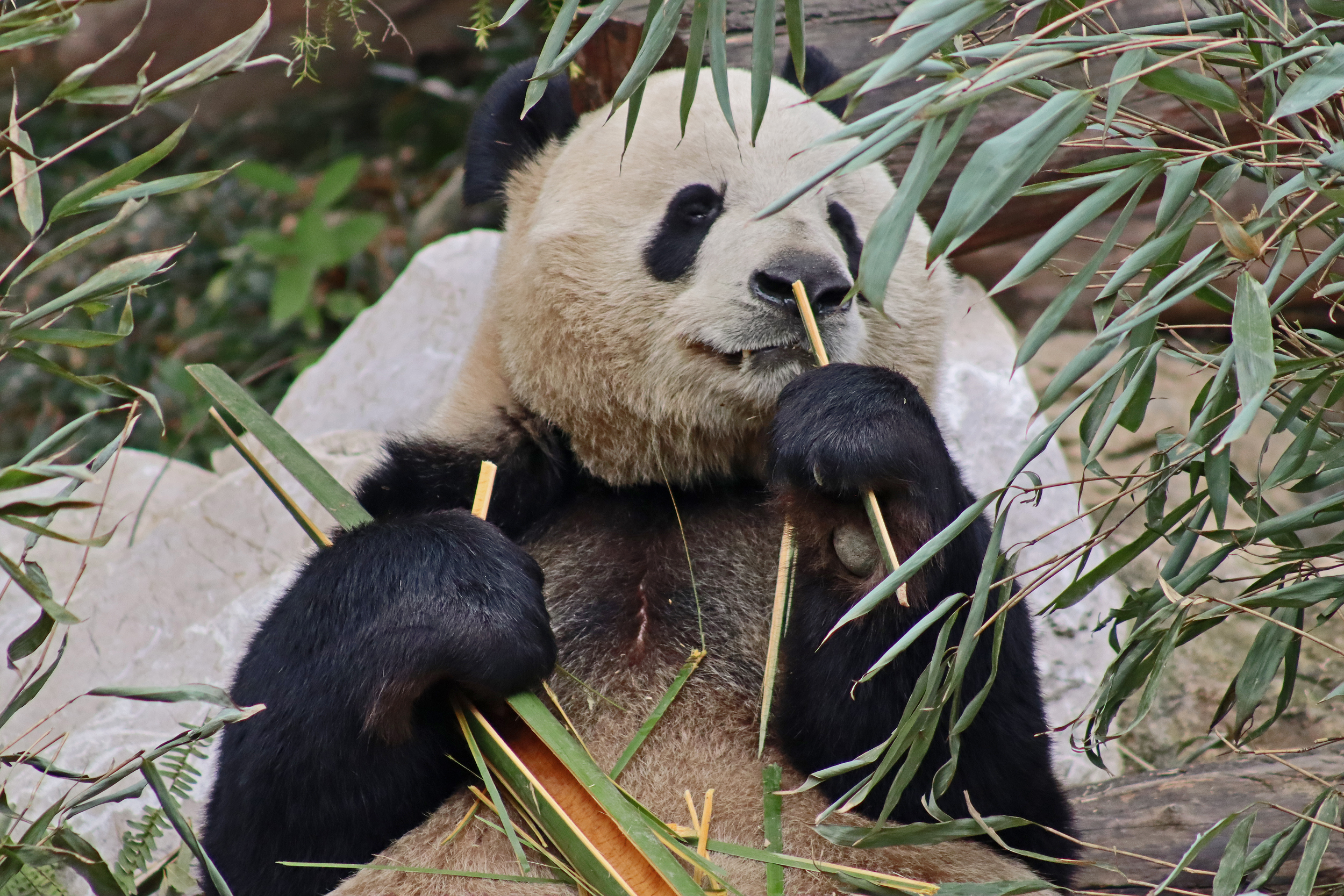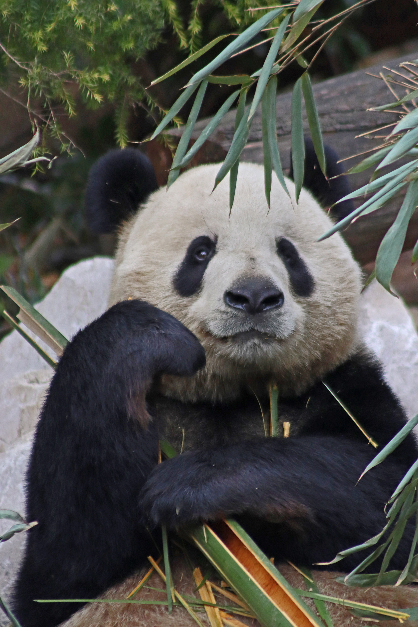 Ya Yun 娅韵 was also enjoying her bamboo when I saw her, at least she wasn’t as difficult to see as she was sat right in the open near the front of the yard. Her sign says she likes to be quiet and I think she was happy to sit out because it was so quiet with almost no visitors. She became a mother for the first time in 2018 to twins, one of whom I also saw in the same pavilion (Yun Wen, although I only saw her sleeping on a platform half way back into the yard). She then had a second pregnancy in 2023 with one cub, Xing Yun, but she also was surrogate mother to Lun Wen, one of the twins of Mei Lun (born at Zoo Atlanta) who were born in the same year – lots of pictures of these youngsters online!