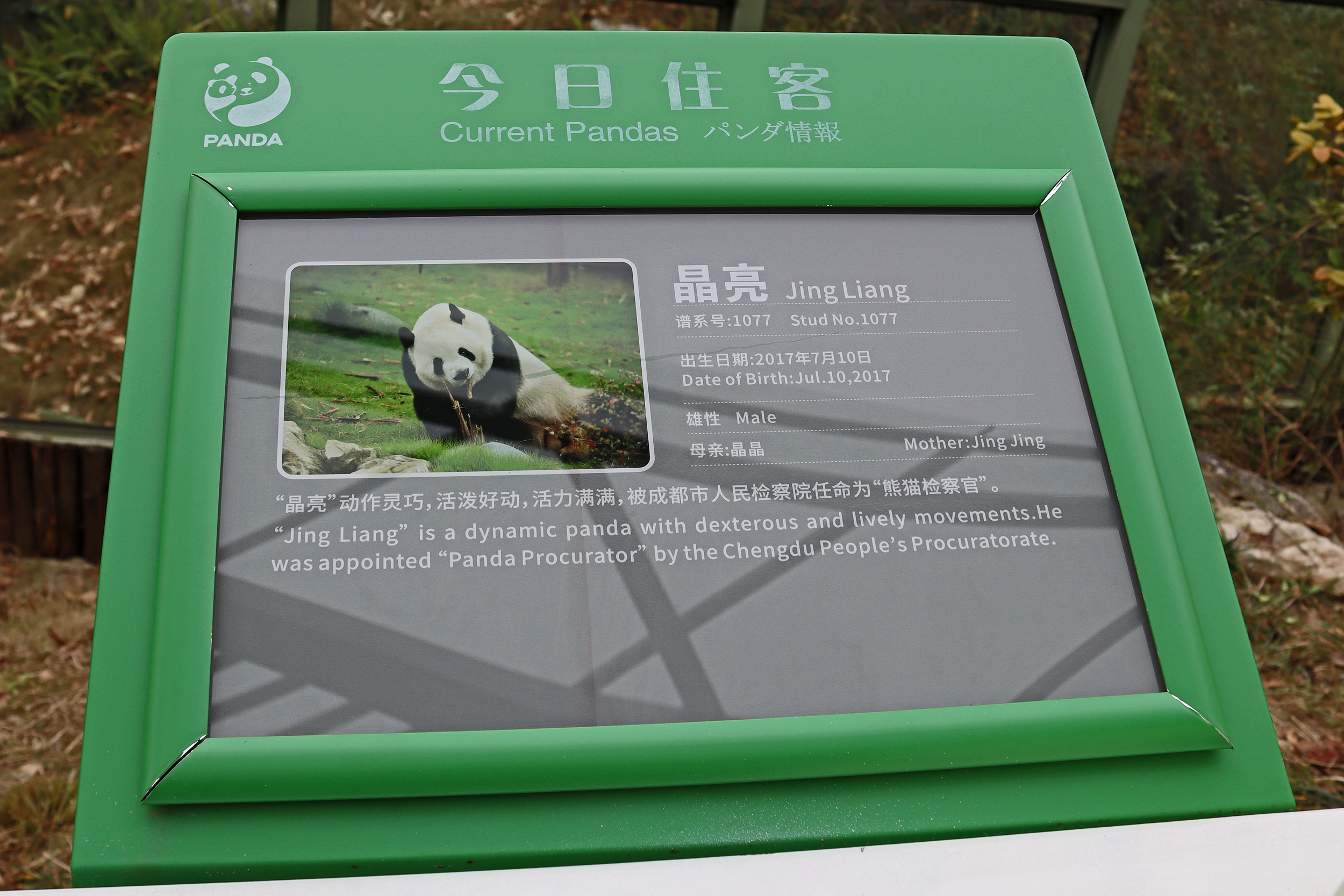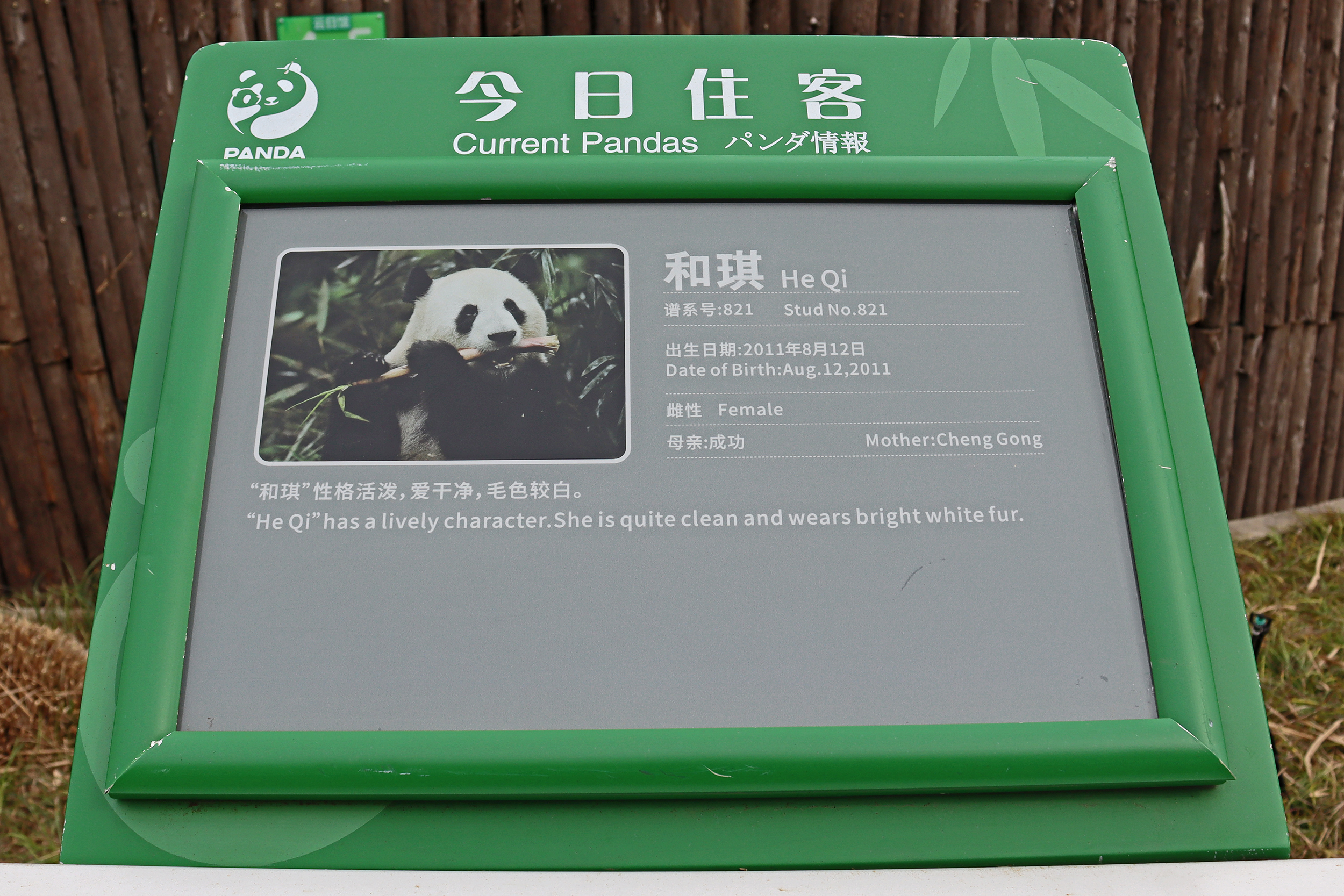He Qi 和琪 was very well tucked away through the trees and bushes in her yard, it was hard to spot her, so I guess any passing visitors might easily have just walked past thinking there was no panda to see. He Qi is a female, born in 2011, making her 13.5 years old on my visit. Like her sign says, I would agree that her fur is quite bright white, she really popped amongst the green of the leaves and trees. When I saw her she was just enjoying her bamboo. She is siblings to a number of well-known pandas through her mother, including one of my favourites Gong Zai and twins He Hua (aka Hua Hua) and He Ye.