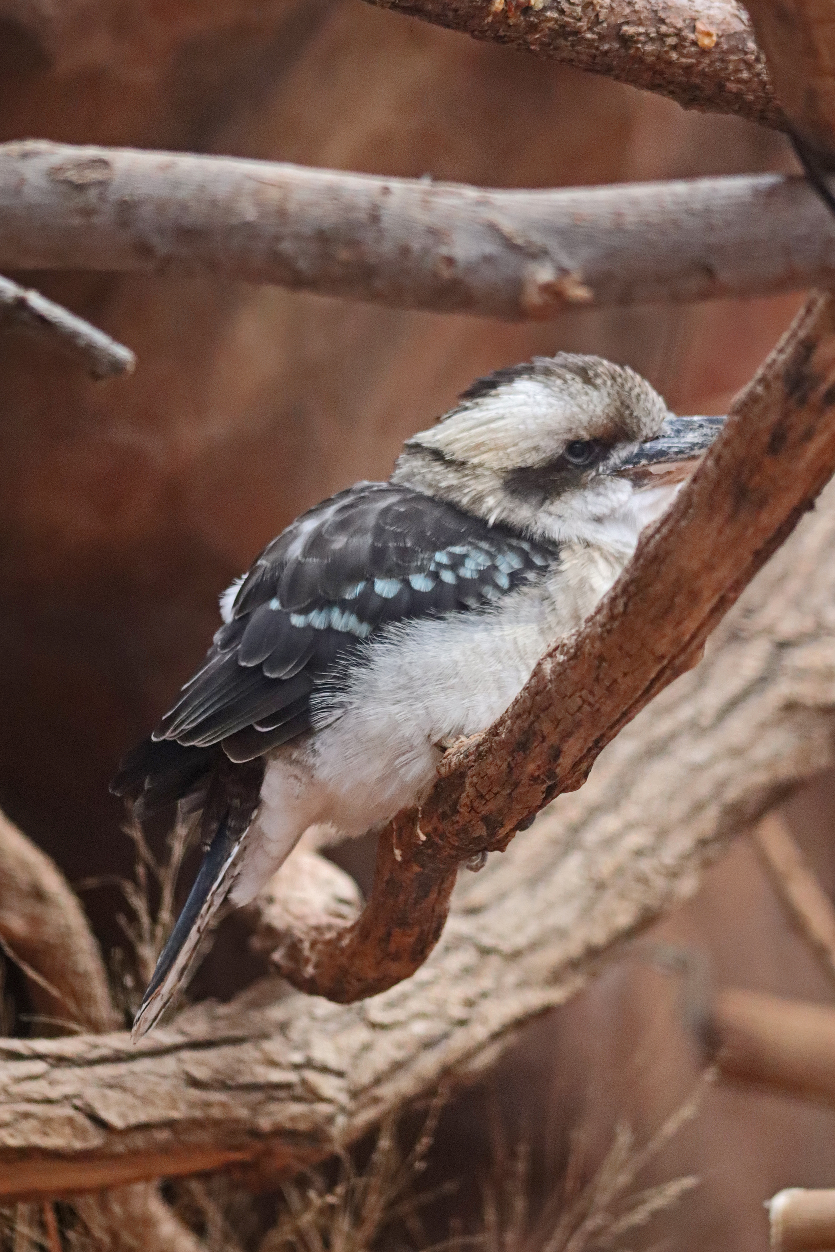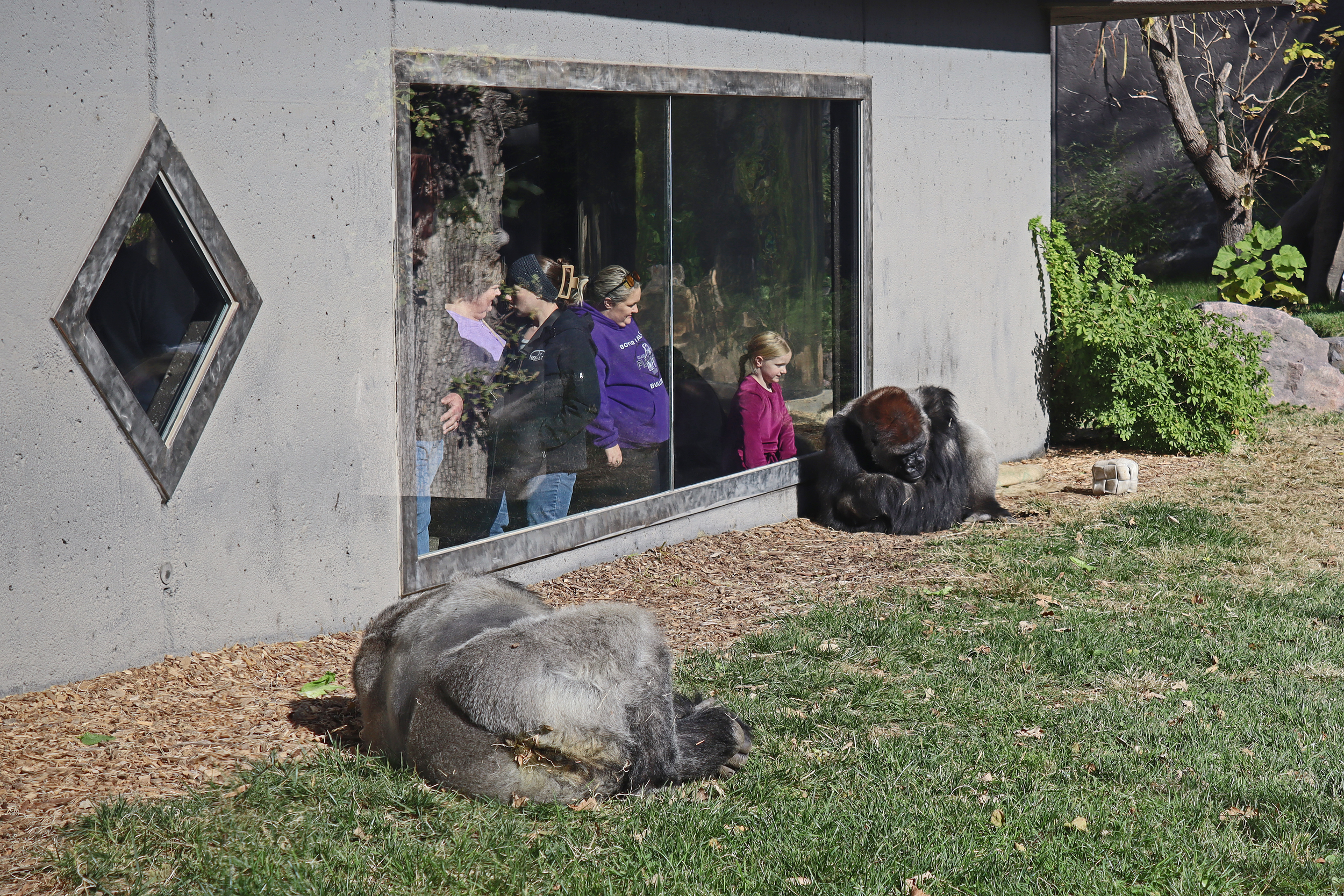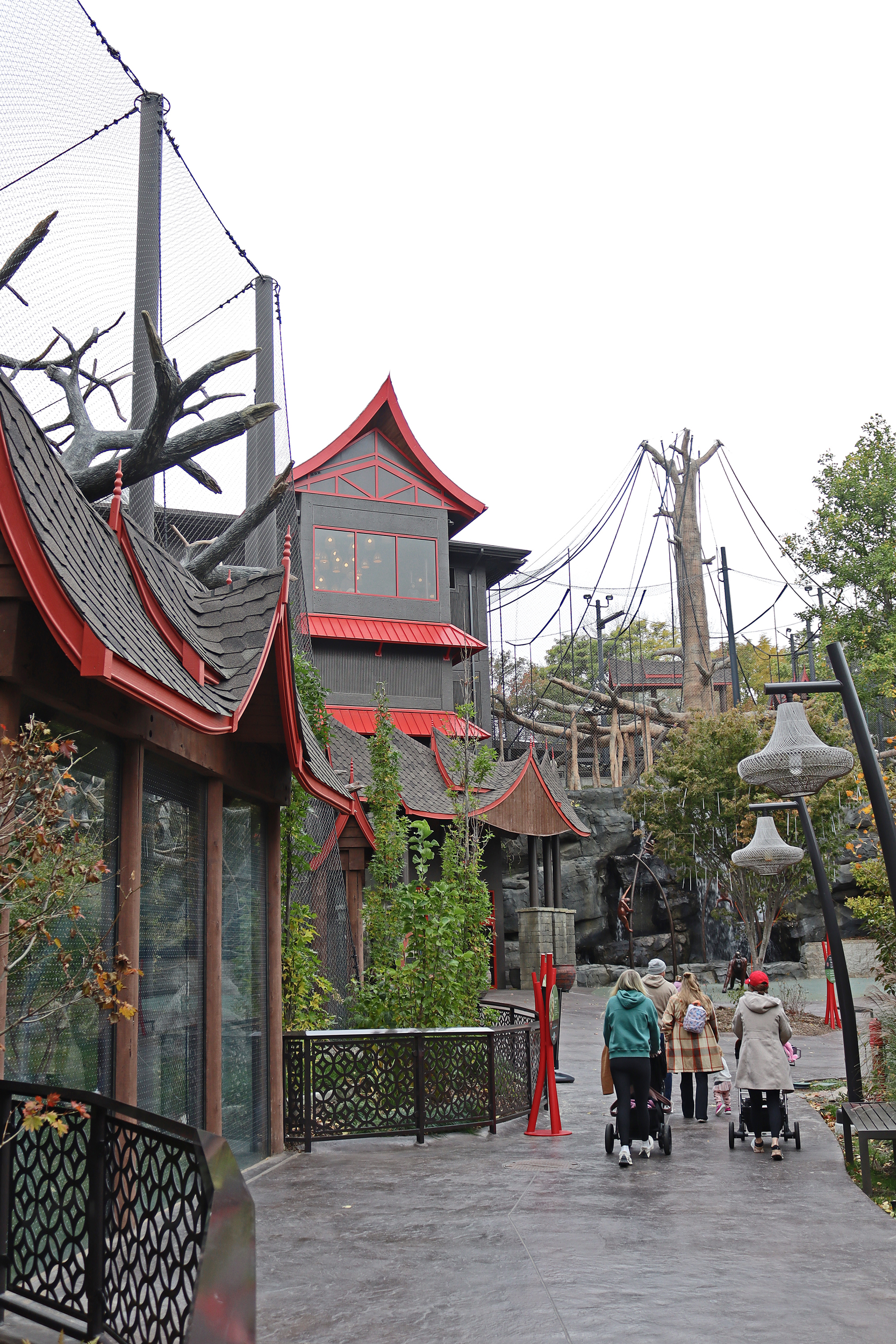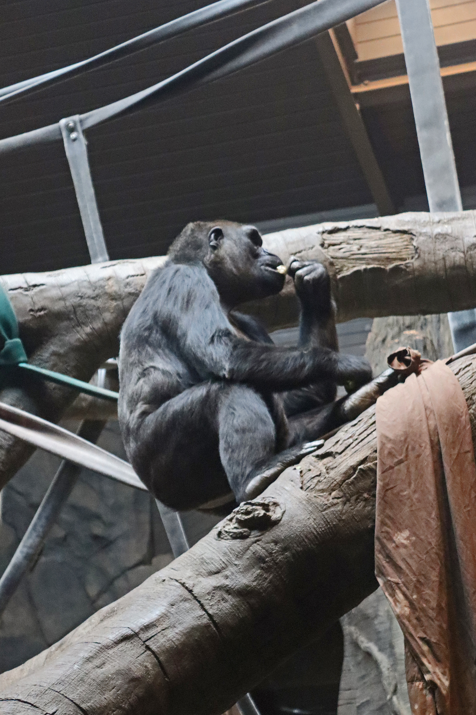 After leaving here I headed into the Gorilla Valley, less themed of a building but still clever with the layout of habitats in here. There were several different outdoor and indoor spaces, it was made to look like one continuous space, but did house different groups of animals, which I quite liked. One my first time through I only saw the gorillas inside, including a very impressive silverback, but on my second visit in the afternoon once the sun had come out a bit a few of the boys in the bachelor group had now come outside and were sitting right up against the viewing windows enjoying the sunshine on a chilly day. Also in this house there were some Abyssinian ground hornbills which were cool to see getting fed, and also what I think were gibbons, which caused some hilarity among a few children who were watching when one decided to hang right at the window and pee right in front of the children! Overall there was lots of inside space here, so a good option to hang out if it’s cold or rainy – plus seating, toilets and plenty of education.