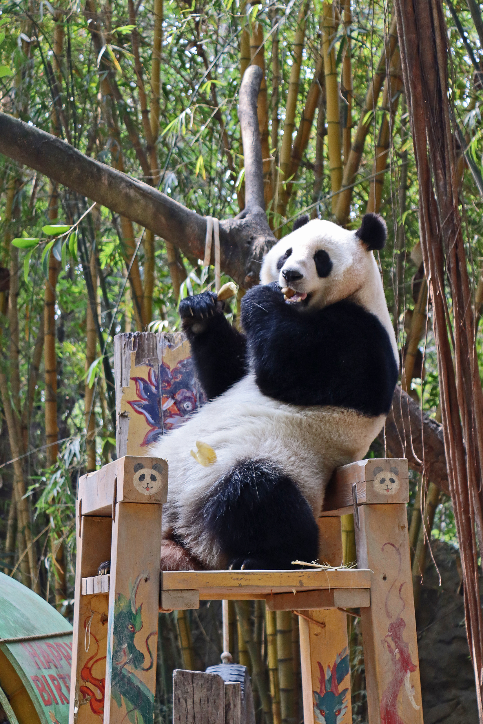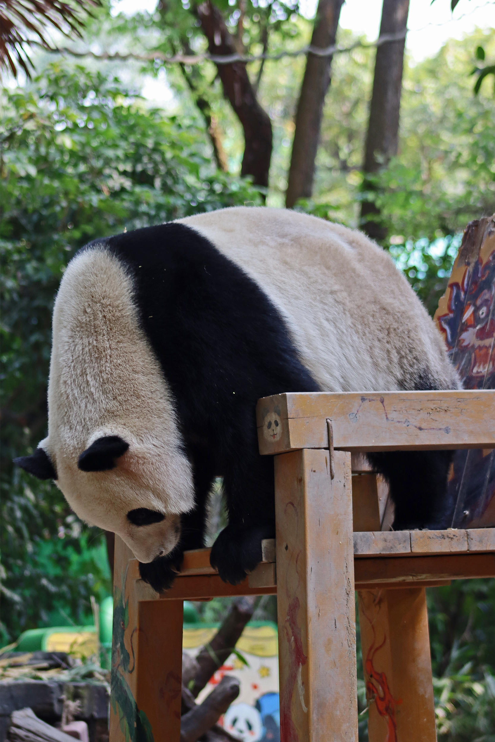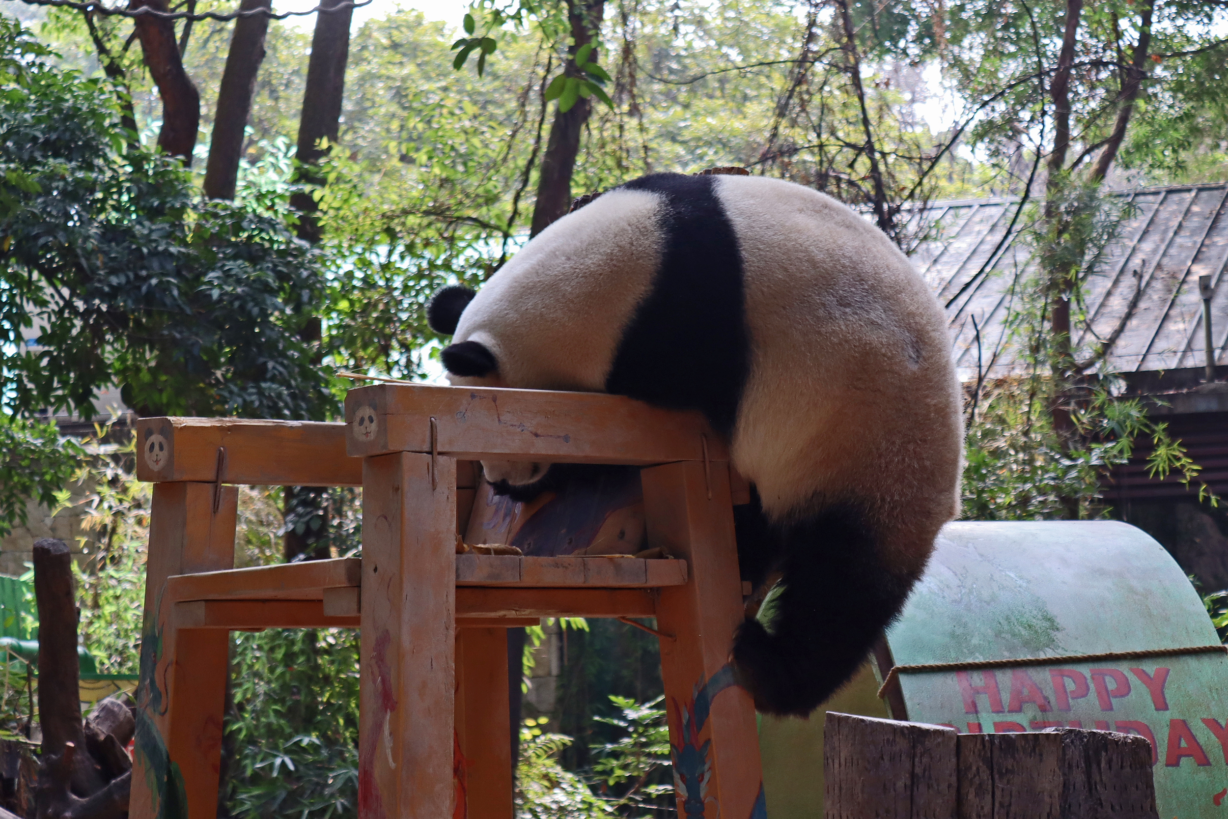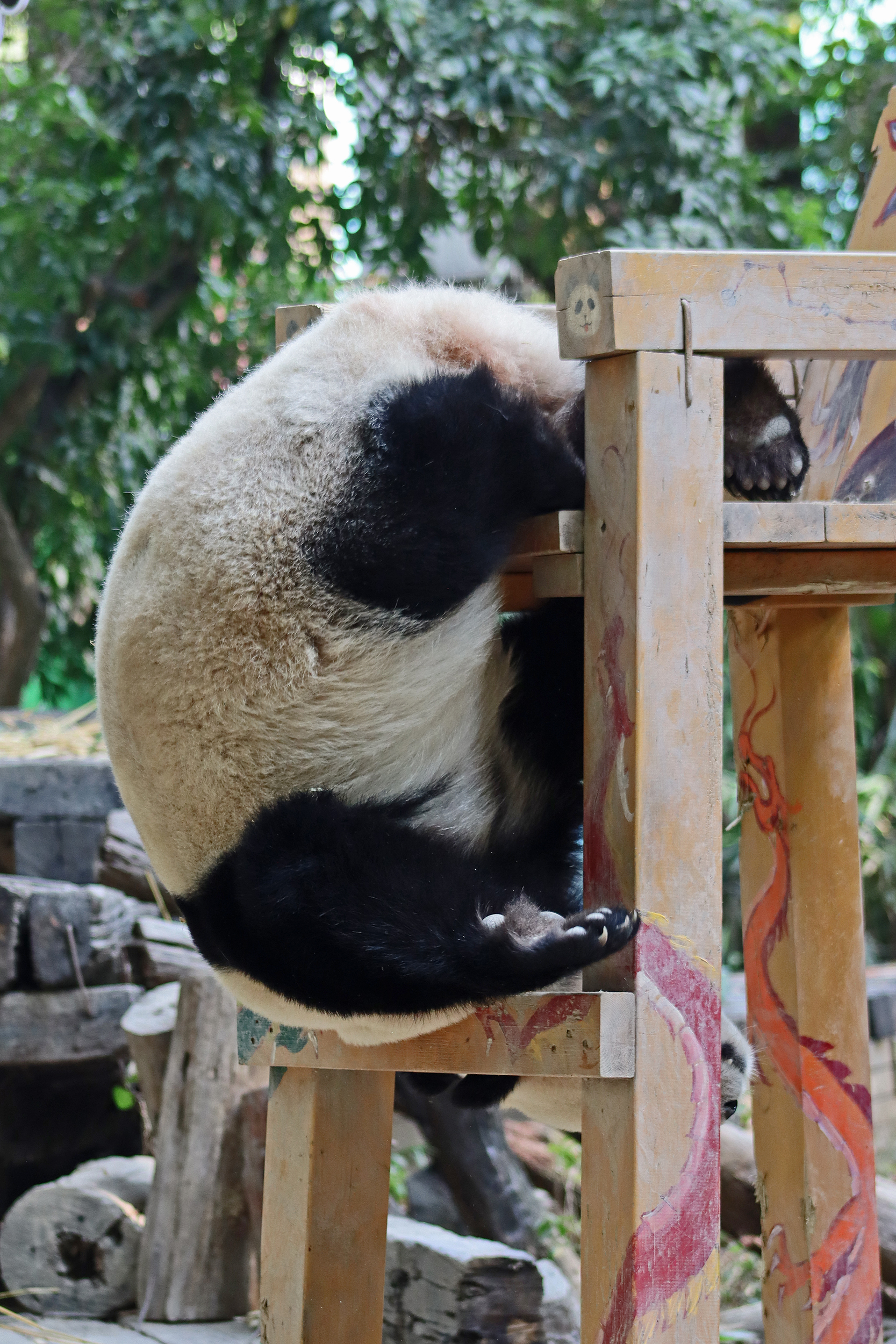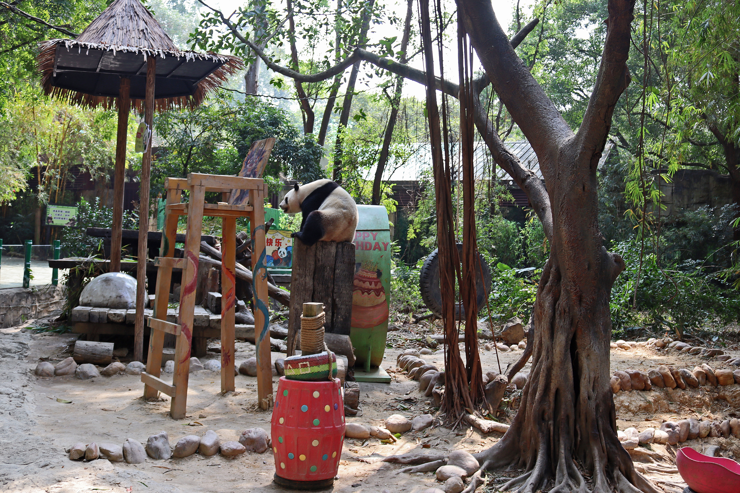 The final panda to share about at Chimelong Safari Park – it’s Guo Qing 国庆! Guo Qing was living in the separate section that you walked around to after viewing Meng Meng and Mei Zhu, and she was very very popular, always lots of people standing to watch her and I think she was loving the attention^ Guo Qing was 5.5 years old on my visit, so still quite young – she was very active and hungry, perhaps she’s been one of the only pandas I’ve not seen sleeping at all during my visit! She was very much enjoying climbing and being up high. The first time I went past she was sitting up on a log, then climbed over onto her high chair where there were some bamboo shoots to enjoy – so cute to see this, this was the sort of activity levels I was hoping for, and to see the chair getting used. She also played with her tire swing (treats were inside the tire), and then went into her wheel, where there was another enrichment ball tied up with treats inside too. She was very thorough in making sure she got every last one. Later she was up on a platform enjoying bamboo, and at the end of the day she was climbing again – so cute to see her dismount off the chair, opting for a head-first method and doing a roll mid-way before running off quickly once she got down!