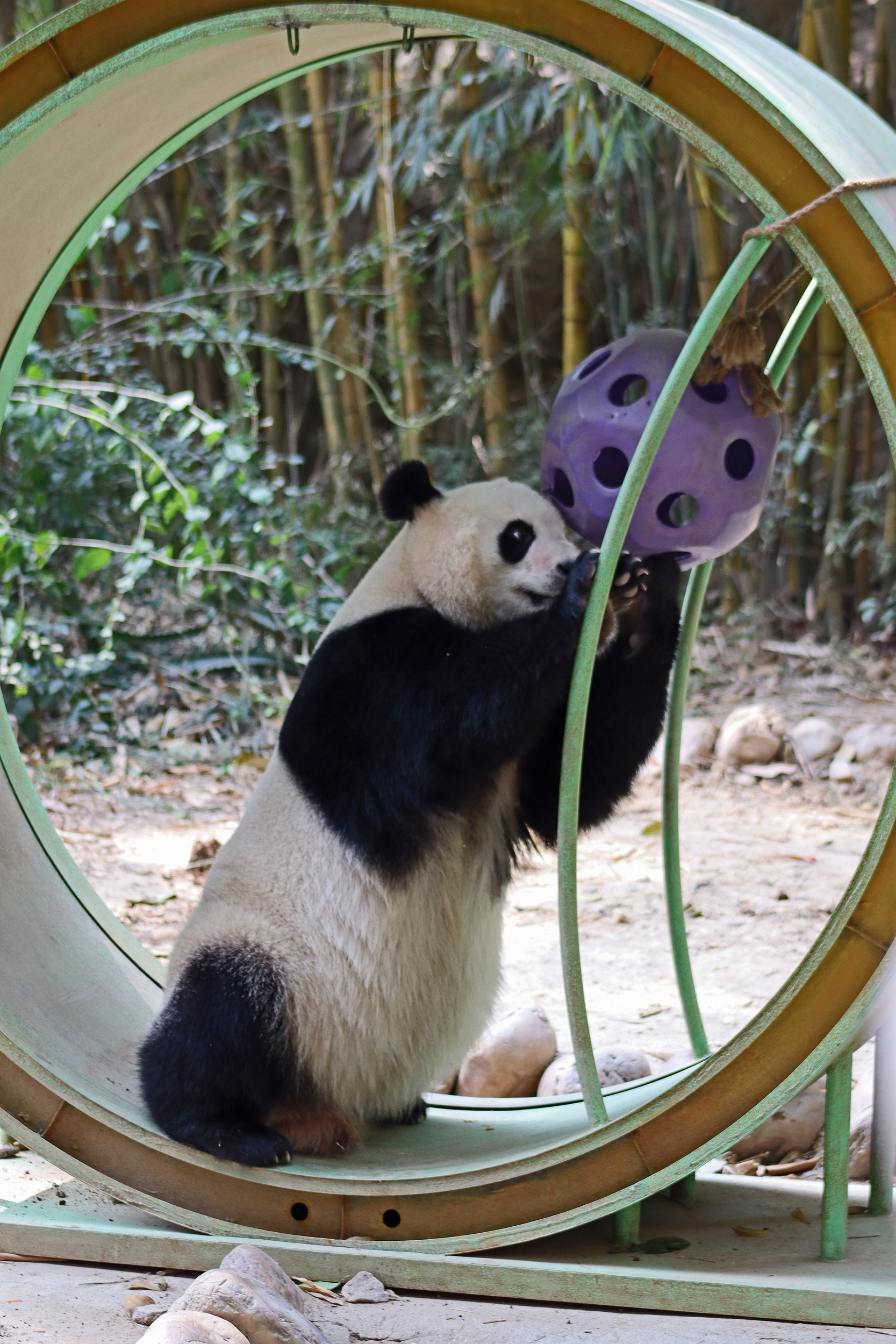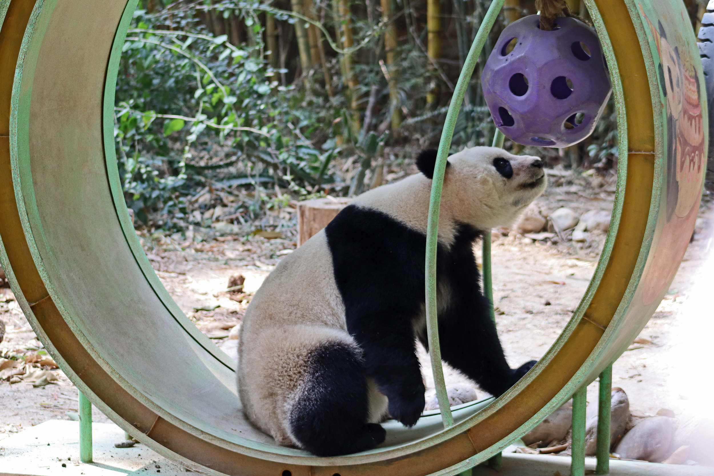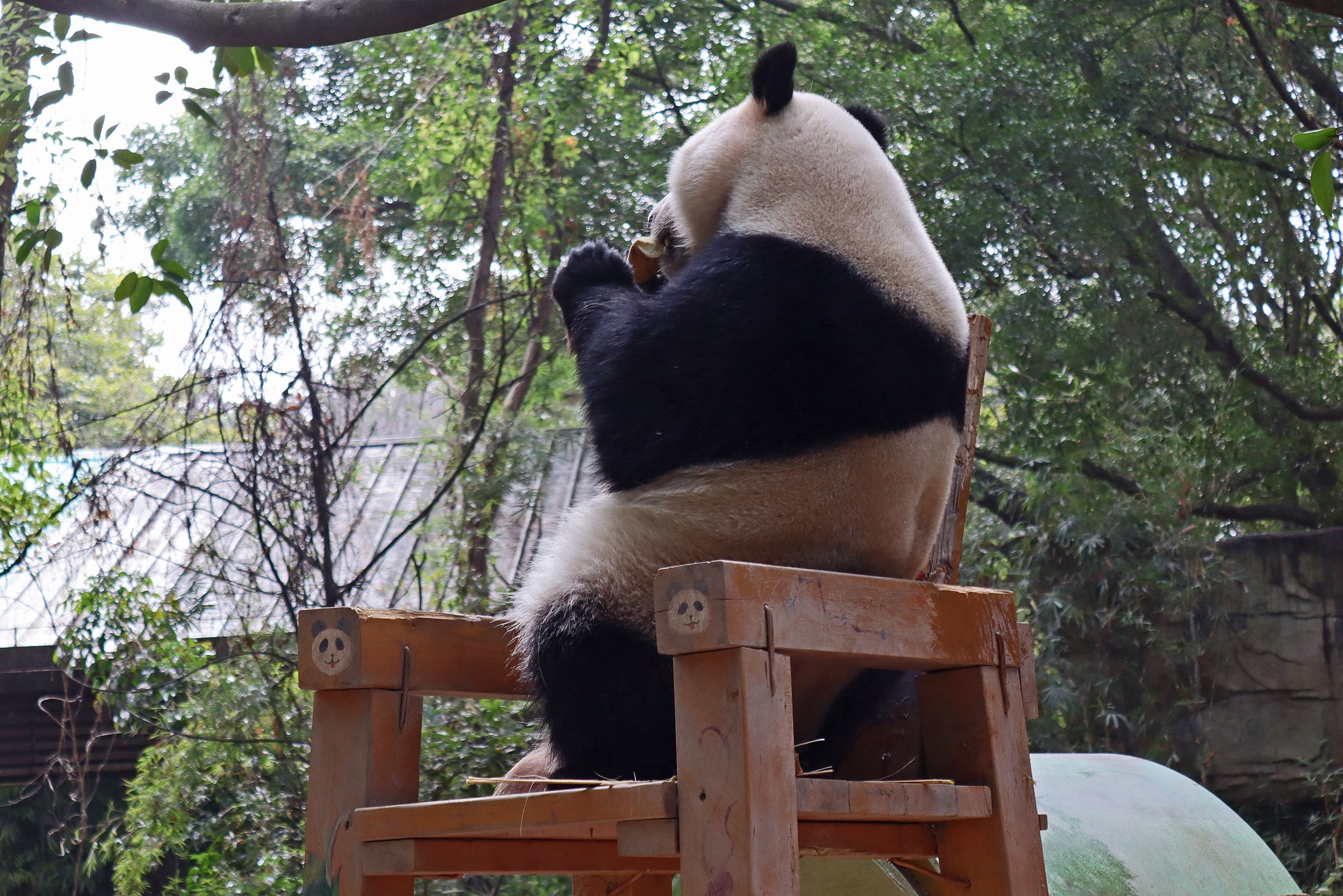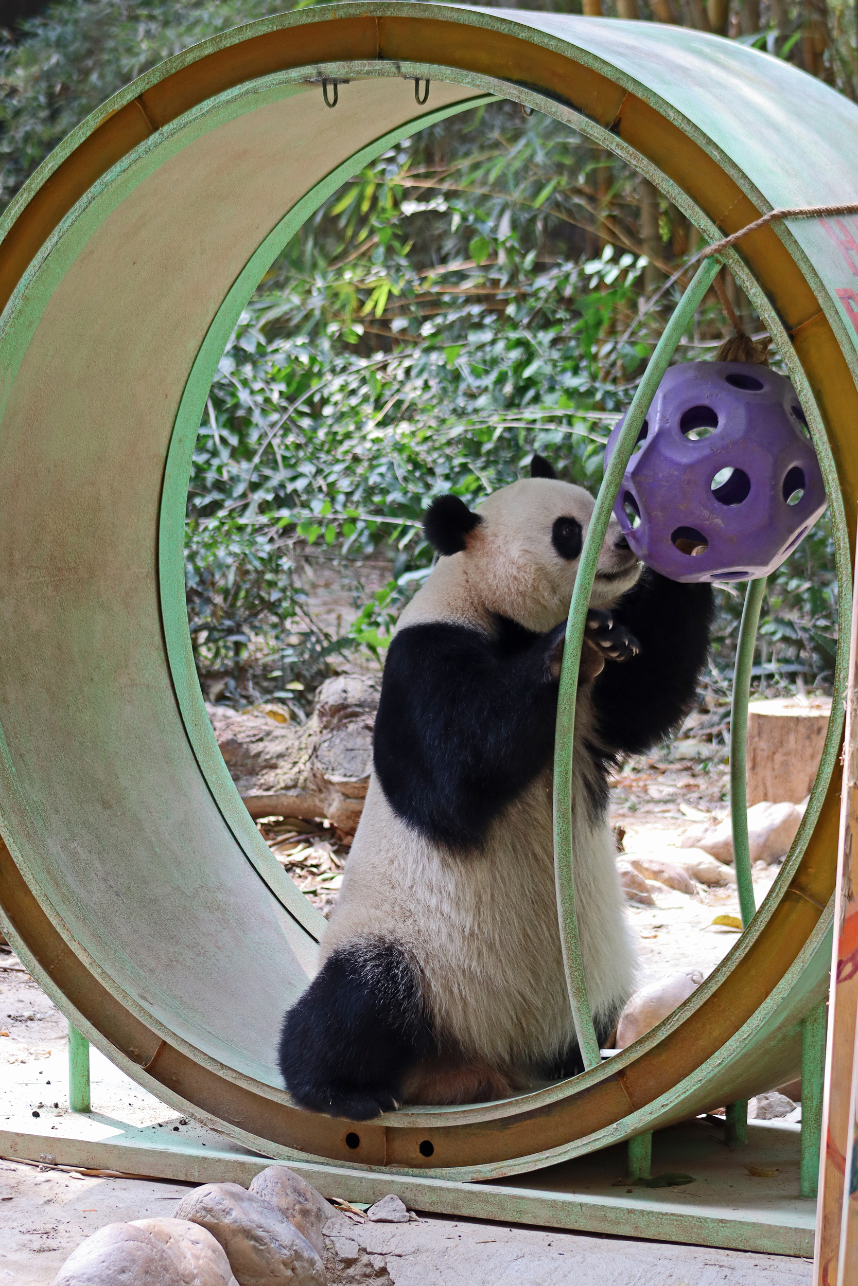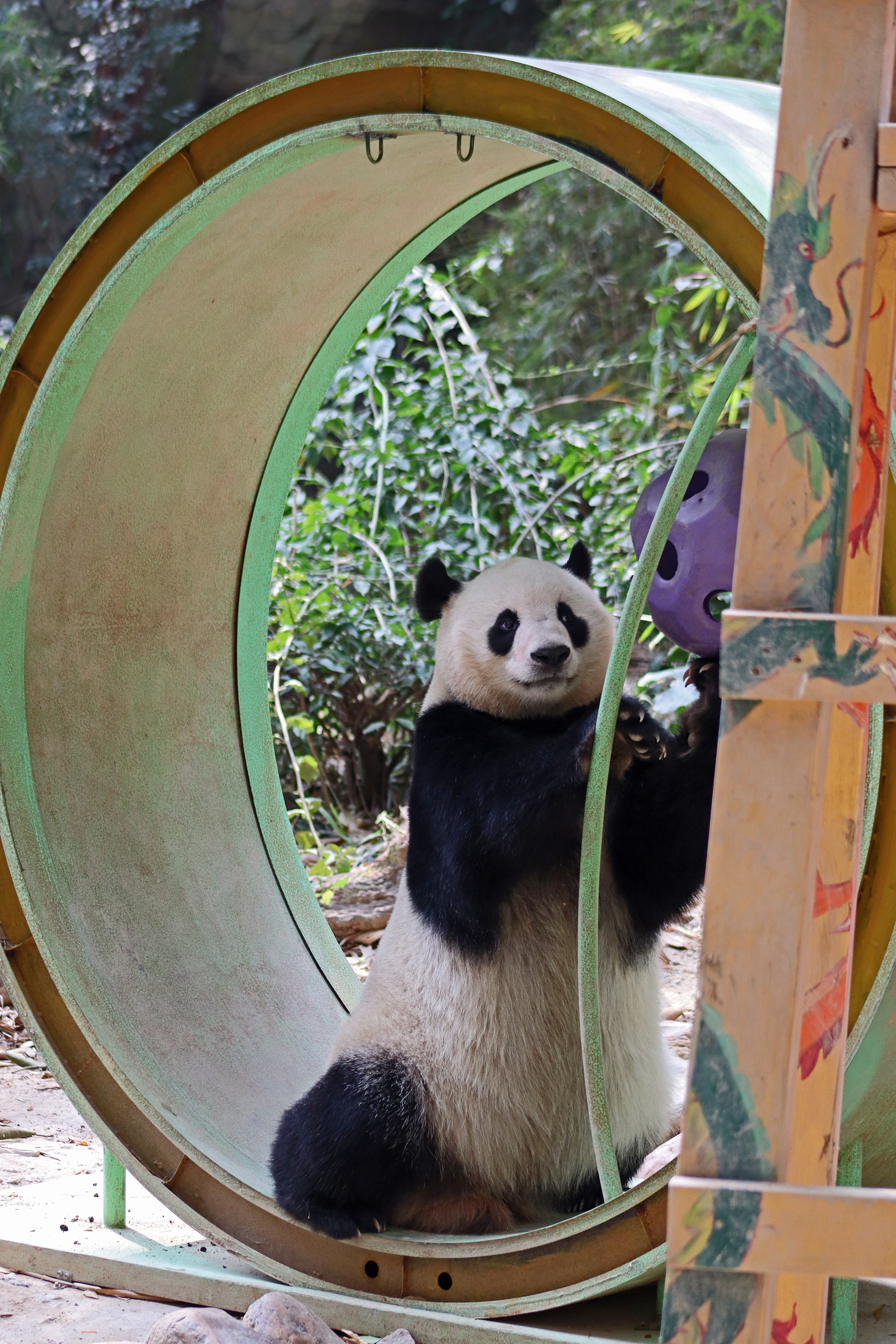 The final panda to share about at Chimelong Safari Park – it’s Guo Qing 国庆! Guo Qing was living in the separate section that you walked around to after viewing Meng Meng and Mei Zhu, and she was very very popular, always lots of people standing to watch her and I think she was loving the attention^ Guo Qing was 5.5 years old on my visit, so still quite young – she was very active and hungry, perhaps she’s been one of the only pandas I’ve not seen sleeping at all during my visit! She was very much enjoying climbing and being up high. The first time I went past she was sitting up on a log, then climbed over onto her high chair where there were some bamboo shoots to enjoy – so cute to see this, this was the sort of activity levels I was hoping for, and to see the chair getting used. She also played with her tire swing (treats were inside the tire), and then went into her wheel, where there was another enrichment ball tied up with treats inside too. She was very thorough in making sure she got every last one. Later she was up on a platform enjoying bamboo, and at the end of the day she was climbing again – so cute to see her dismount off the chair, opting for a head-first method and doing a roll mid-way before running off quickly once she got down!