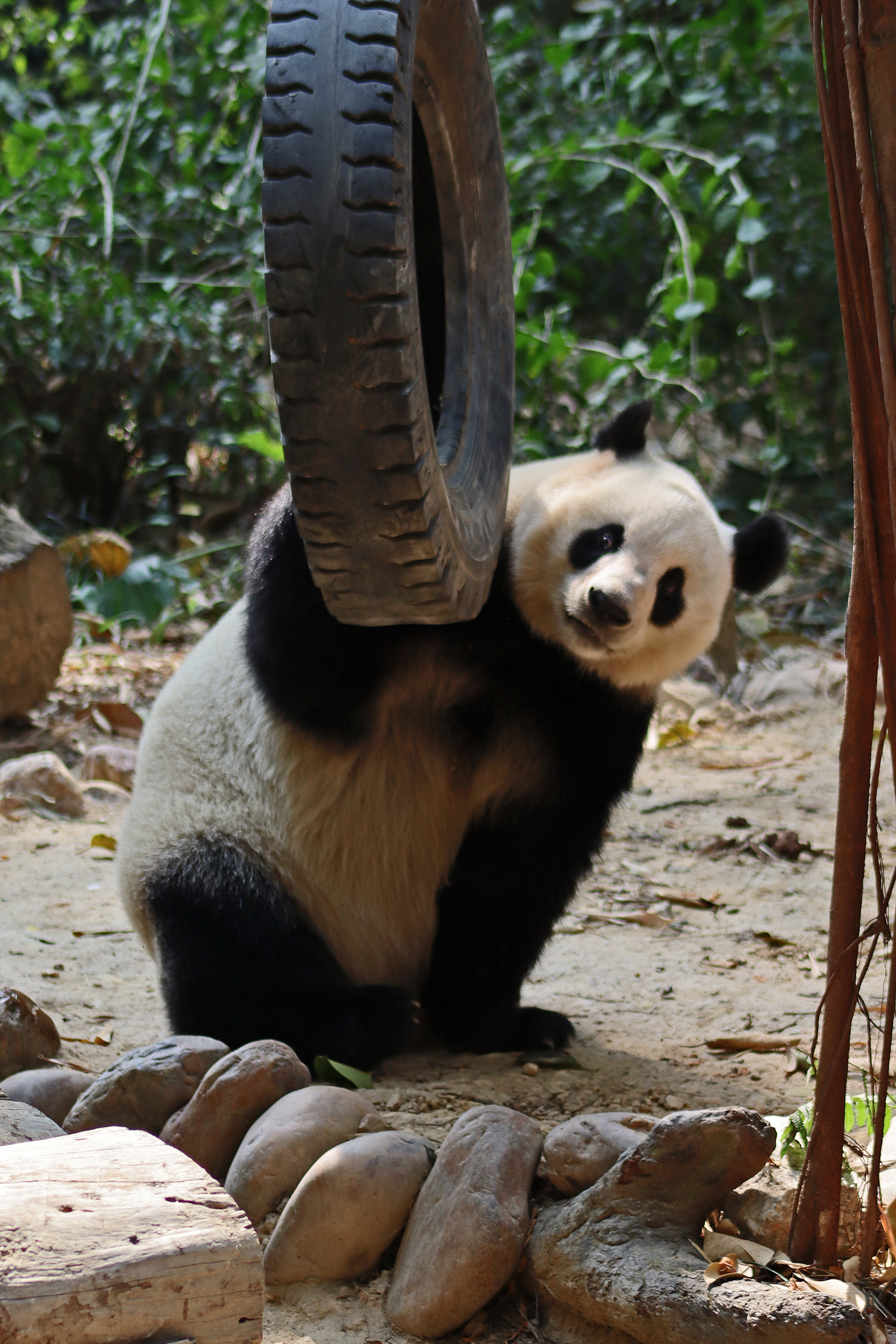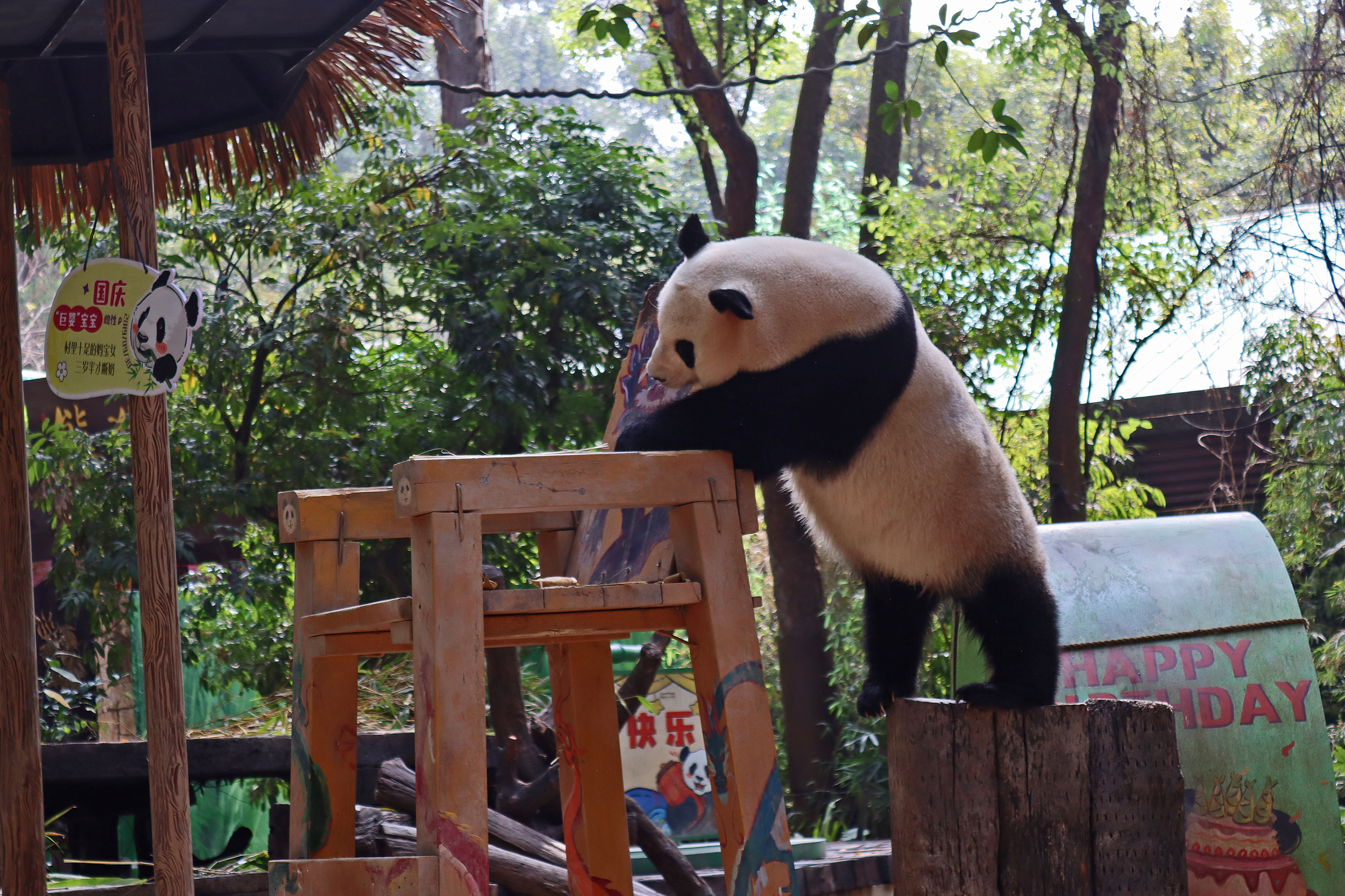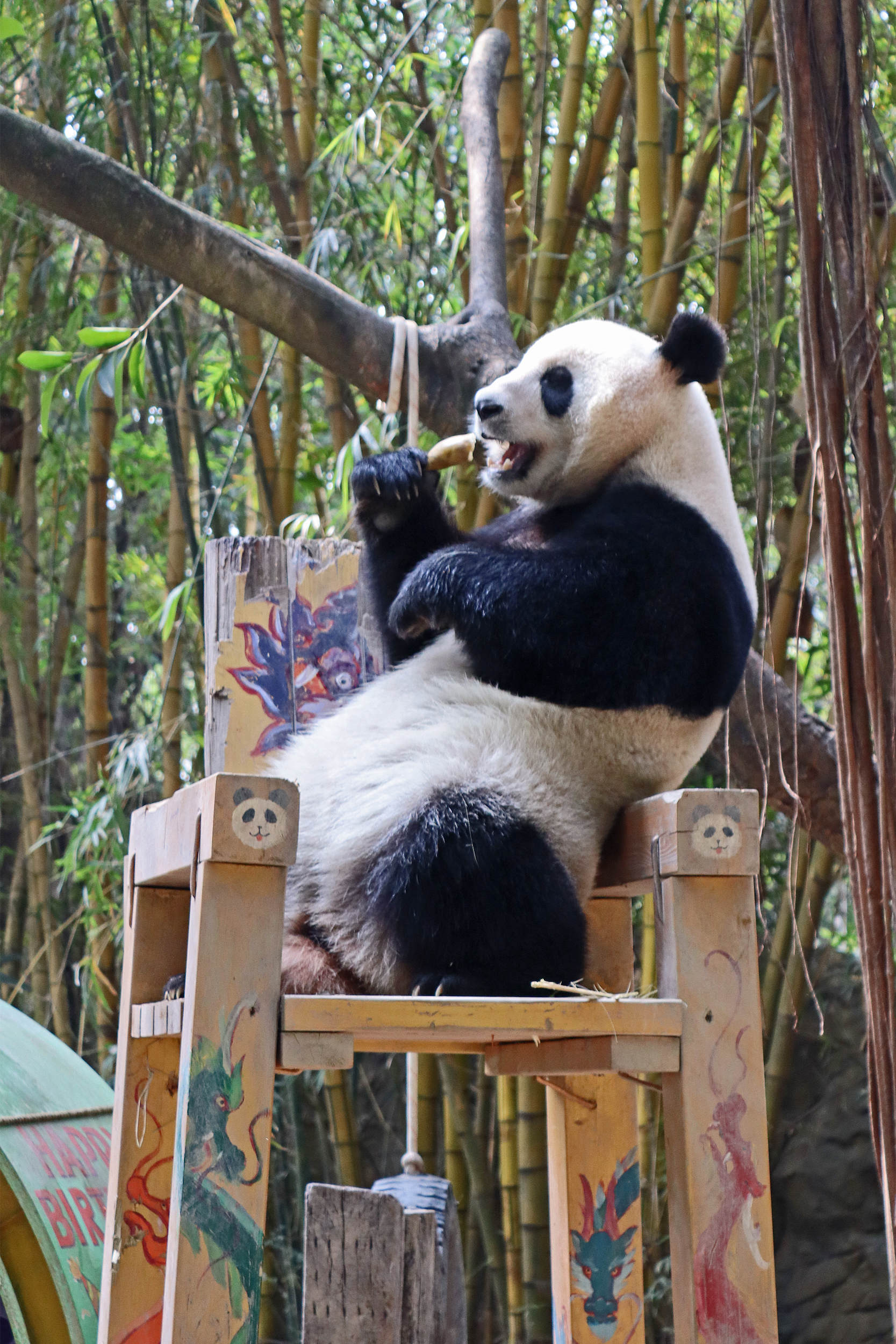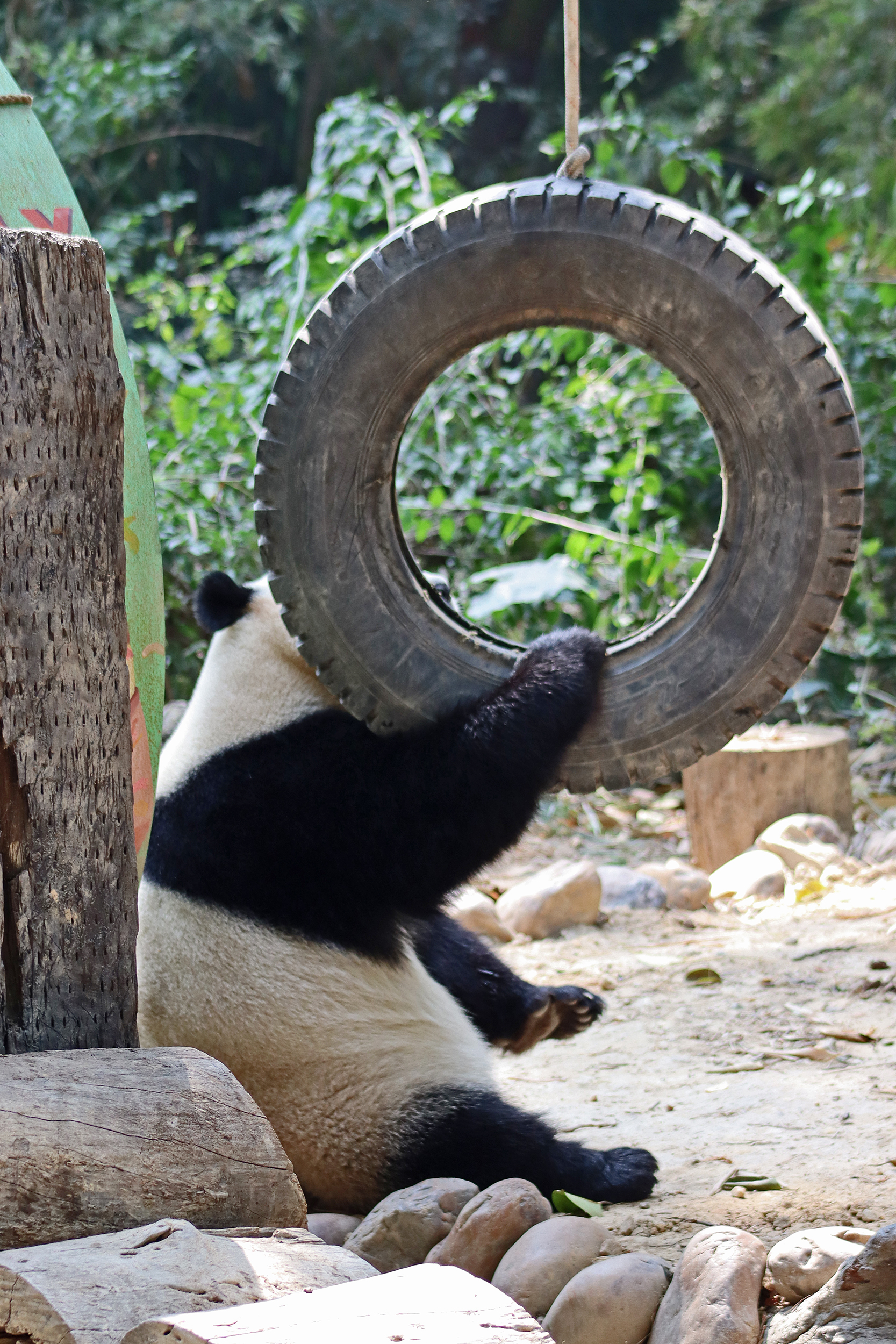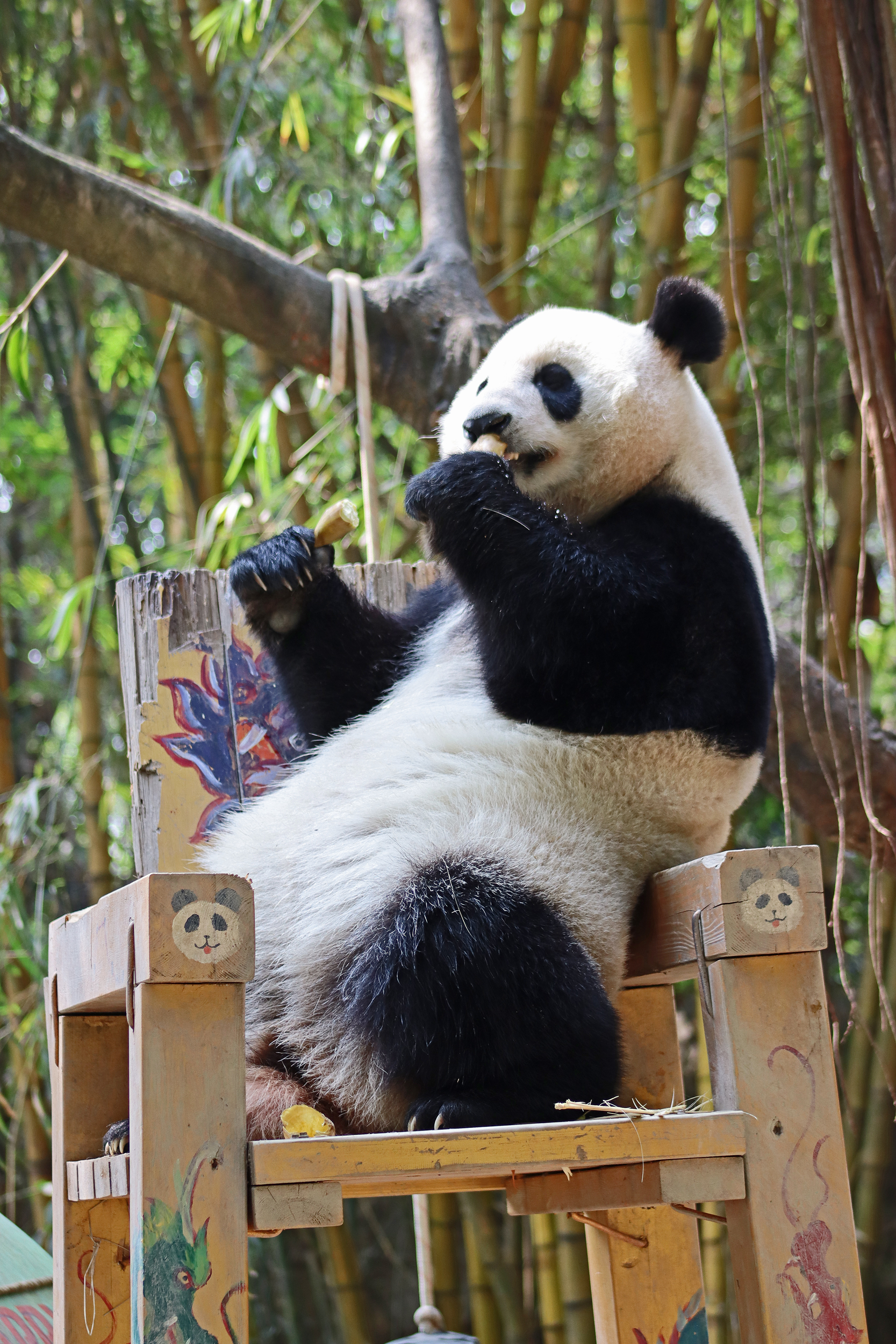 The final panda to share about at Chimelong Safari Park – it’s Guo Qing 国庆! Guo Qing was living in the separate section that you walked around to after viewing Meng Meng and Mei Zhu, and she was very very popular, always lots of people standing to watch her and I think she was loving the attention^ Guo Qing was 5.5 years old on my visit, so still quite young – she was very active and hungry, perhaps she’s been one of the only pandas I’ve not seen sleeping at all during my visit! She was very much enjoying climbing and being up high. The first time I went past she was sitting up on a log, then climbed over onto her high chair where there were some bamboo shoots to enjoy – so cute to see this, this was the sort of activity levels I was hoping for, and to see the chair getting used. She also played with her tire swing (treats were inside the tire), and then went into her wheel, where there was another enrichment ball tied up with treats inside too. She was very thorough in making sure she got every last one. Later she was up on a platform enjoying bamboo, and at the end of the day she was climbing again – so cute to see her dismount off the chair, opting for a head-first method and doing a roll mid-way before running off quickly once she got down!