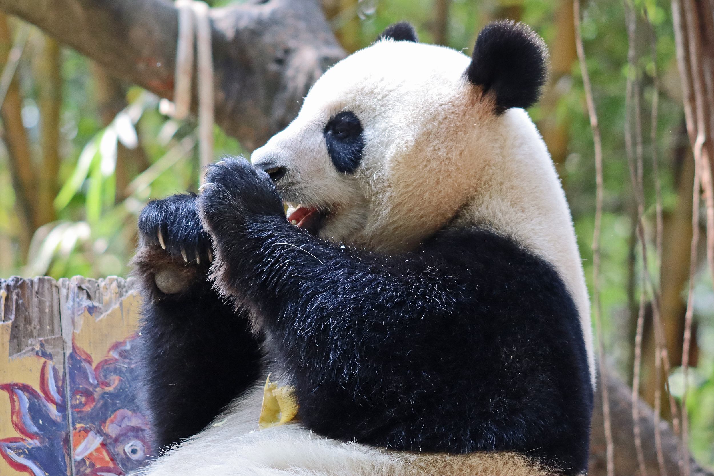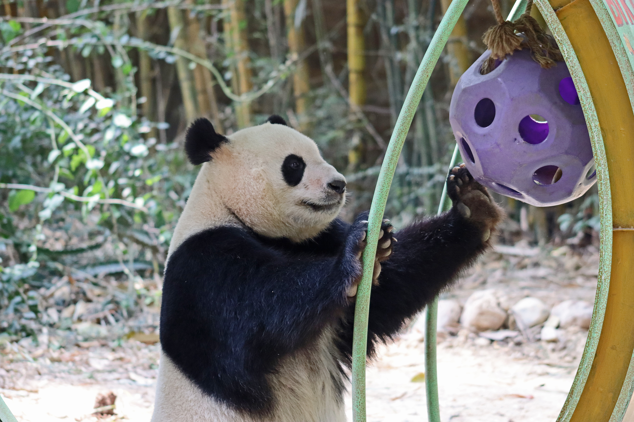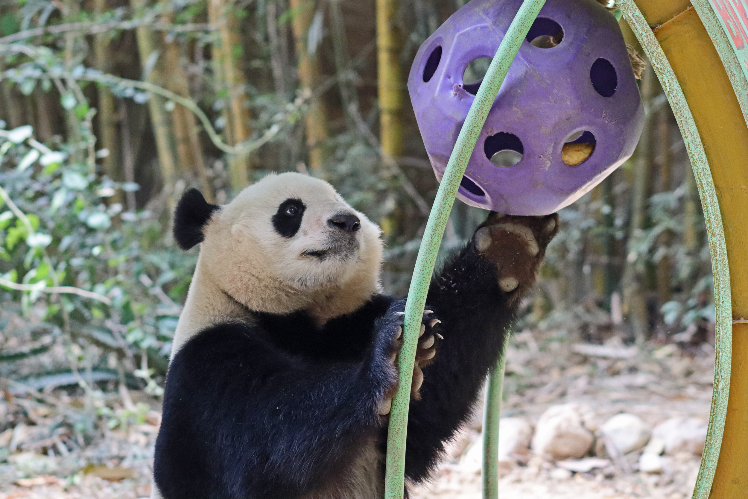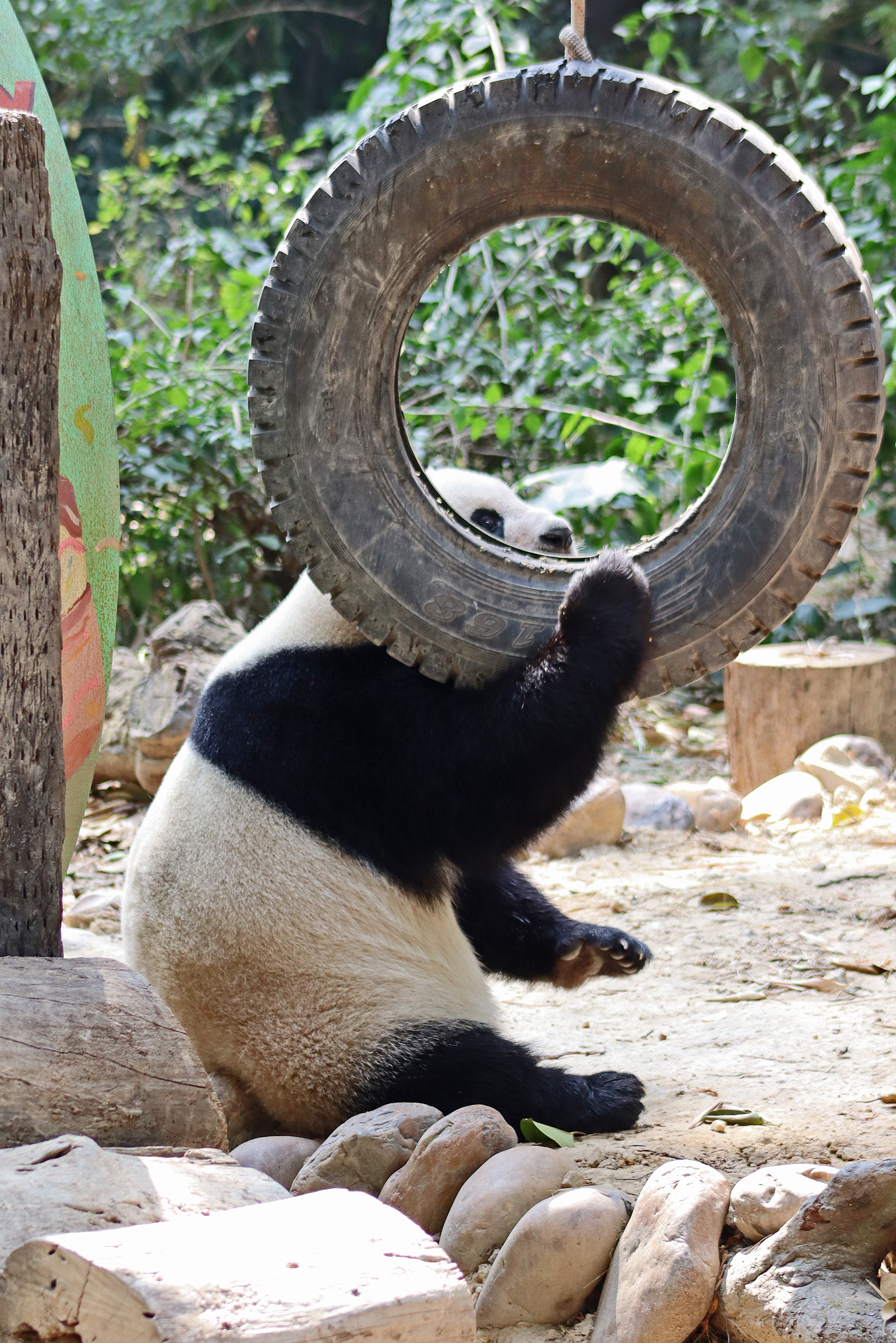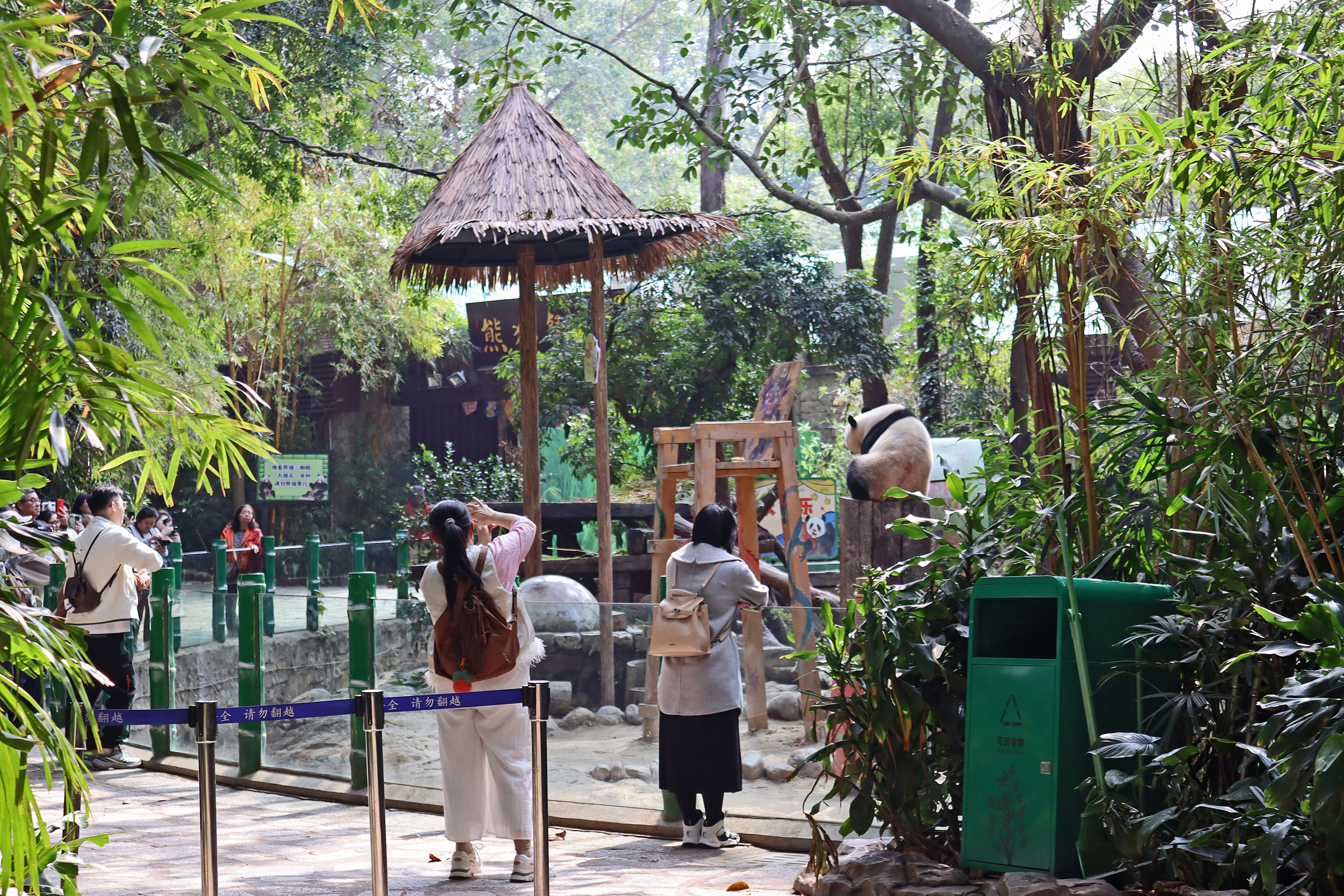 The final panda to share about at Chimelong Safari Park – it’s Guo Qing 国庆! Guo Qing was living in the separate section that you walked around to after viewing Meng Meng and Mei Zhu, and she was very very popular, always lots of people standing to watch her and I think she was loving the attention^ Guo Qing was 5.5 years old on my visit, so still quite young – she was very active and hungry, perhaps she’s been one of the only pandas I’ve not seen sleeping at all during my visit! She was very much enjoying climbing and being up high. The first time I went past she was sitting up on a log, then climbed over onto her high chair where there were some bamboo shoots to enjoy – so cute to see this, this was the sort of activity levels I was hoping for, and to see the chair getting used. She also played with her tire swing (treats were inside the tire), and then went into her wheel, where there was another enrichment ball tied up with treats inside too. She was very thorough in making sure she got every last one. Later she was up on a platform enjoying bamboo, and at the end of the day she was climbing again – so cute to see her dismount off the chair, opting for a head-first method and doing a roll mid-way before running off quickly once she got down!