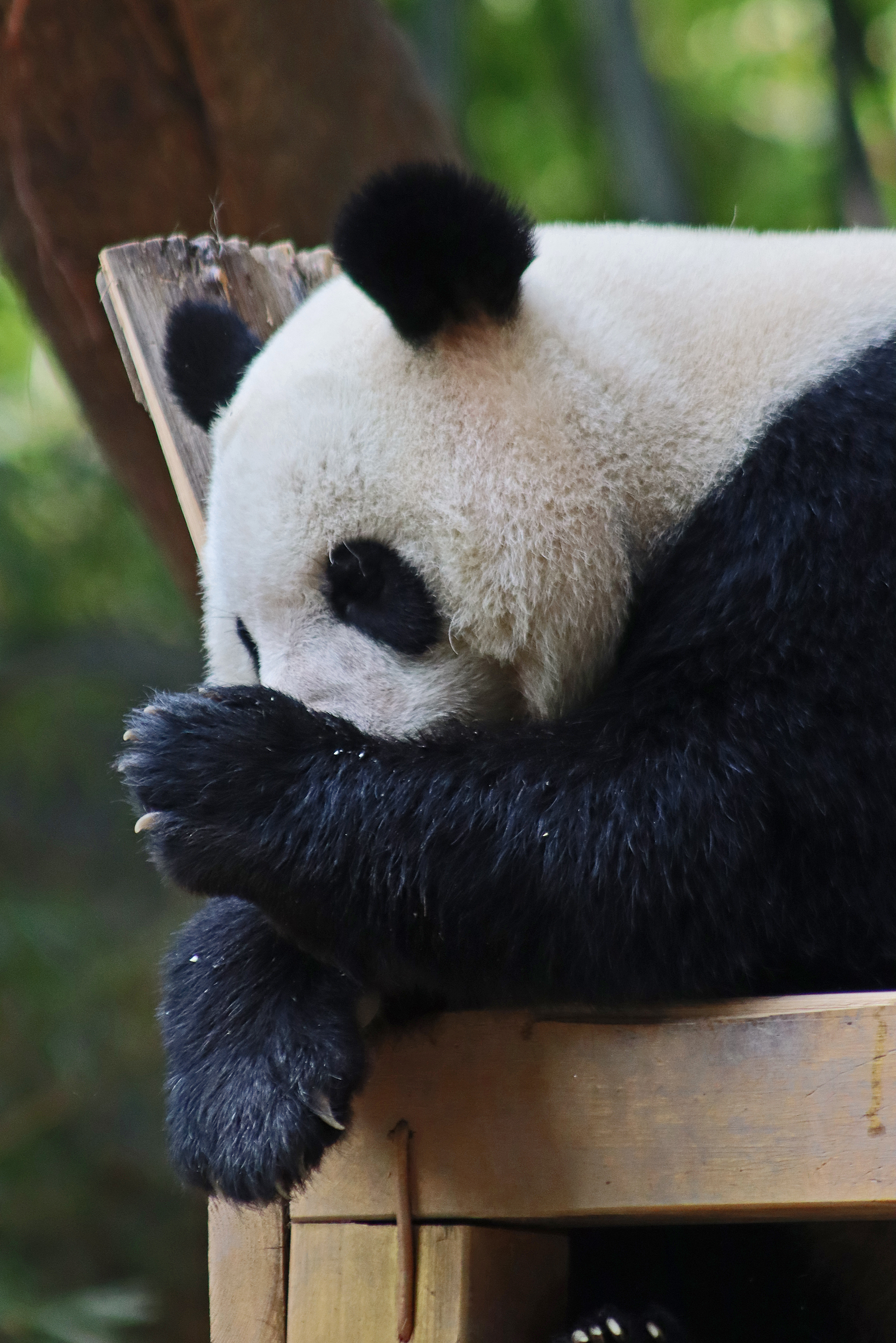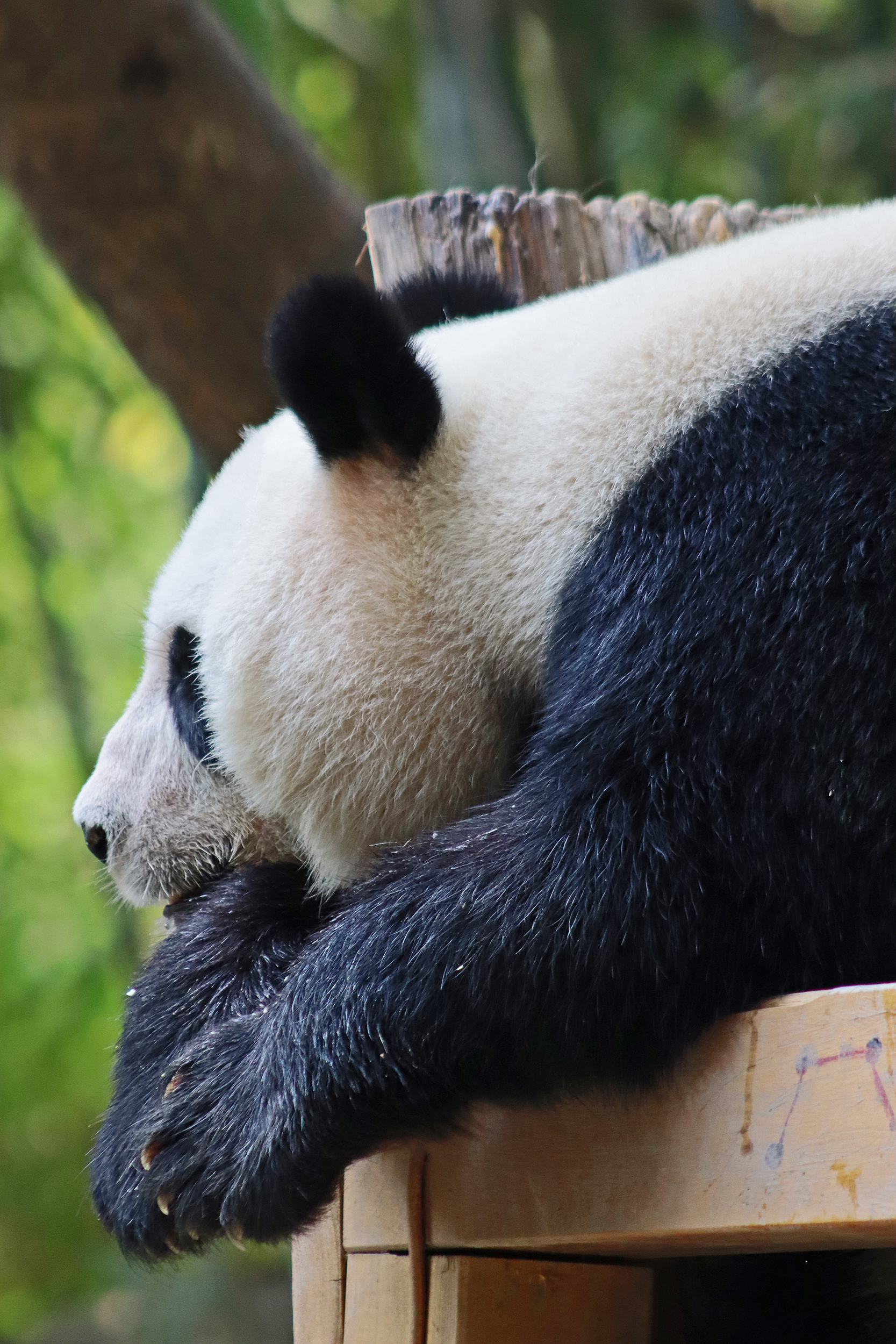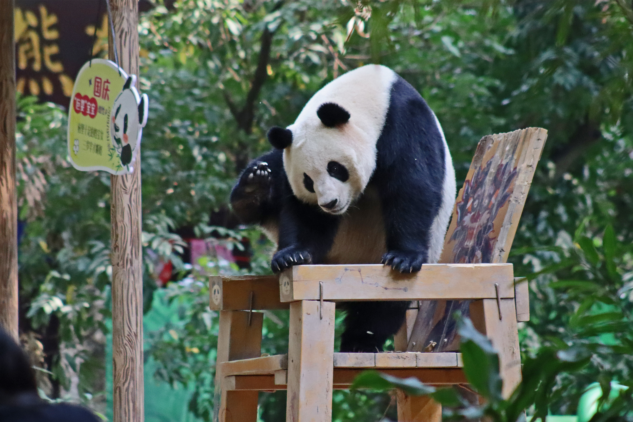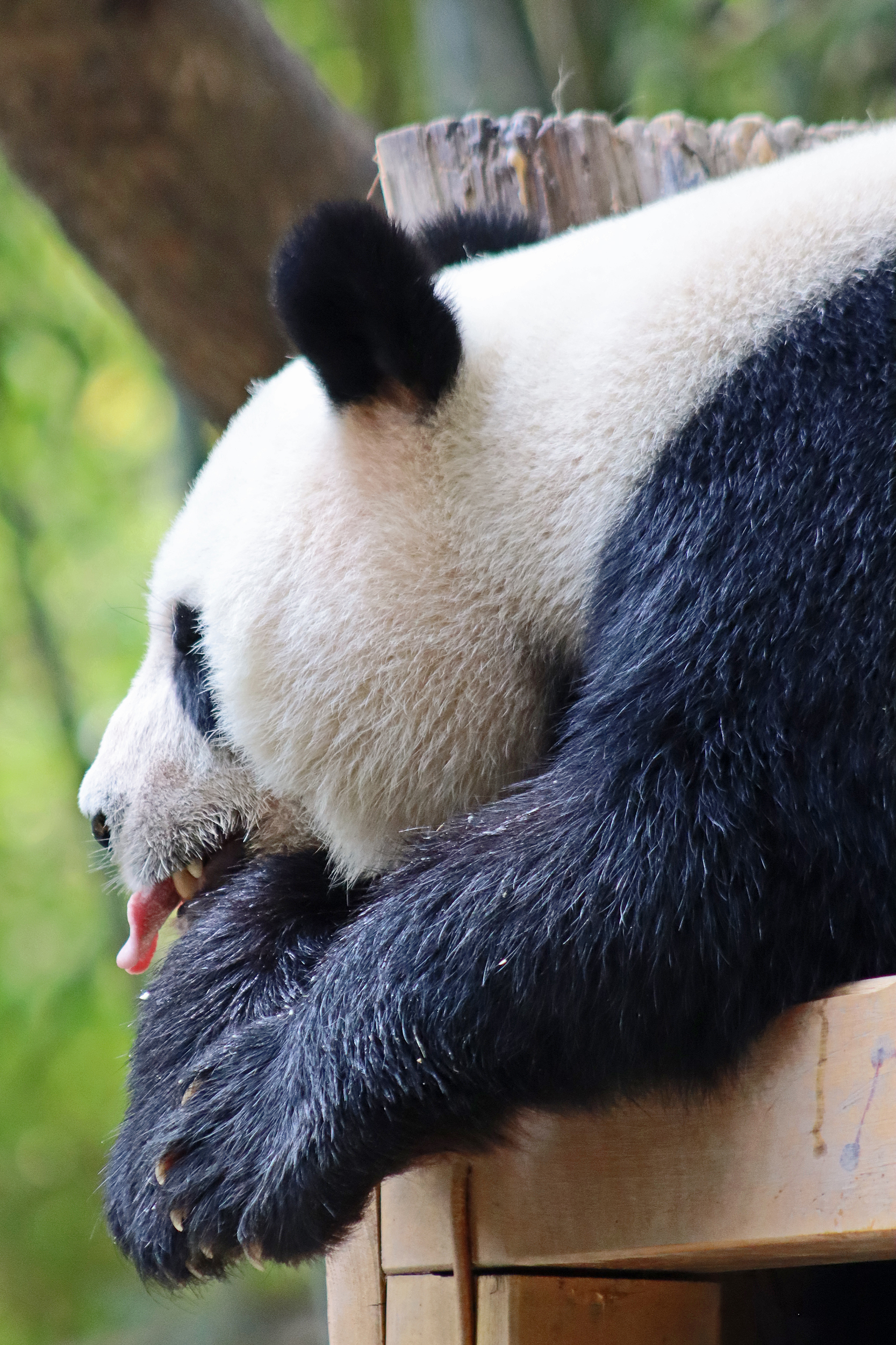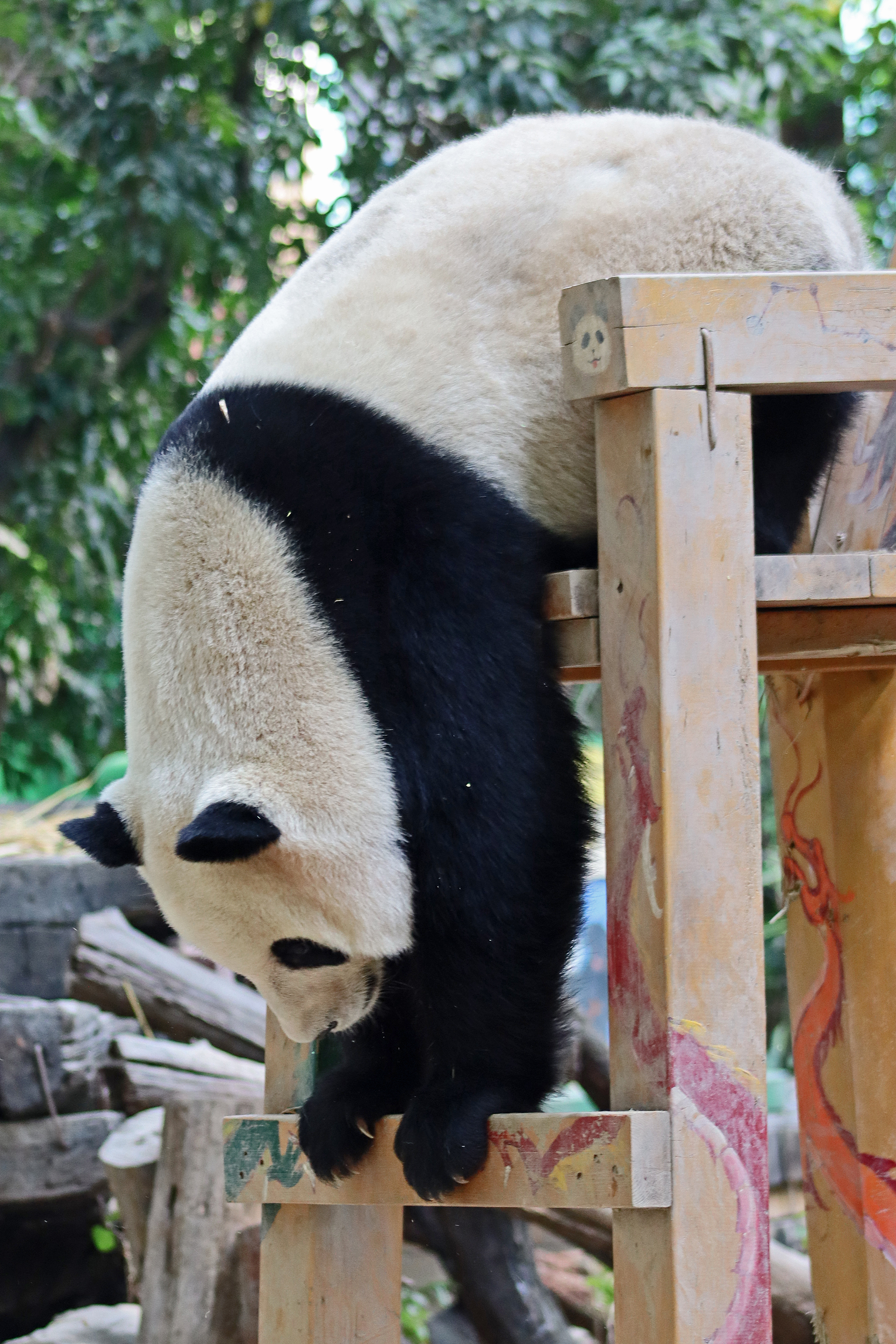 The final panda to share about at Chimelong Safari Park – it’s Guo Qing 国庆! Guo Qing was living in the separate section that you walked around to after viewing Meng Meng and Mei Zhu, and she was very very popular, always lots of people standing to watch her and I think she was loving the attention^ Guo Qing was 5.5 years old on my visit, so still quite young – she was very active and hungry, perhaps she’s been one of the only pandas I’ve not seen sleeping at all during my visit! She was very much enjoying climbing and being up high. The first time I went past she was sitting up on a log, then climbed over onto her high chair where there were some bamboo shoots to enjoy – so cute to see this, this was the sort of activity levels I was hoping for, and to see the chair getting used. She also played with her tire swing (treats were inside the tire), and then went into her wheel, where there was another enrichment ball tied up with treats inside too. She was very thorough in making sure she got every last one. Later she was up on a platform enjoying bamboo, and at the end of the day she was climbing again – so cute to see her dismount off the chair, opting for a head-first method and doing a roll mid-way before running off quickly once she got down!