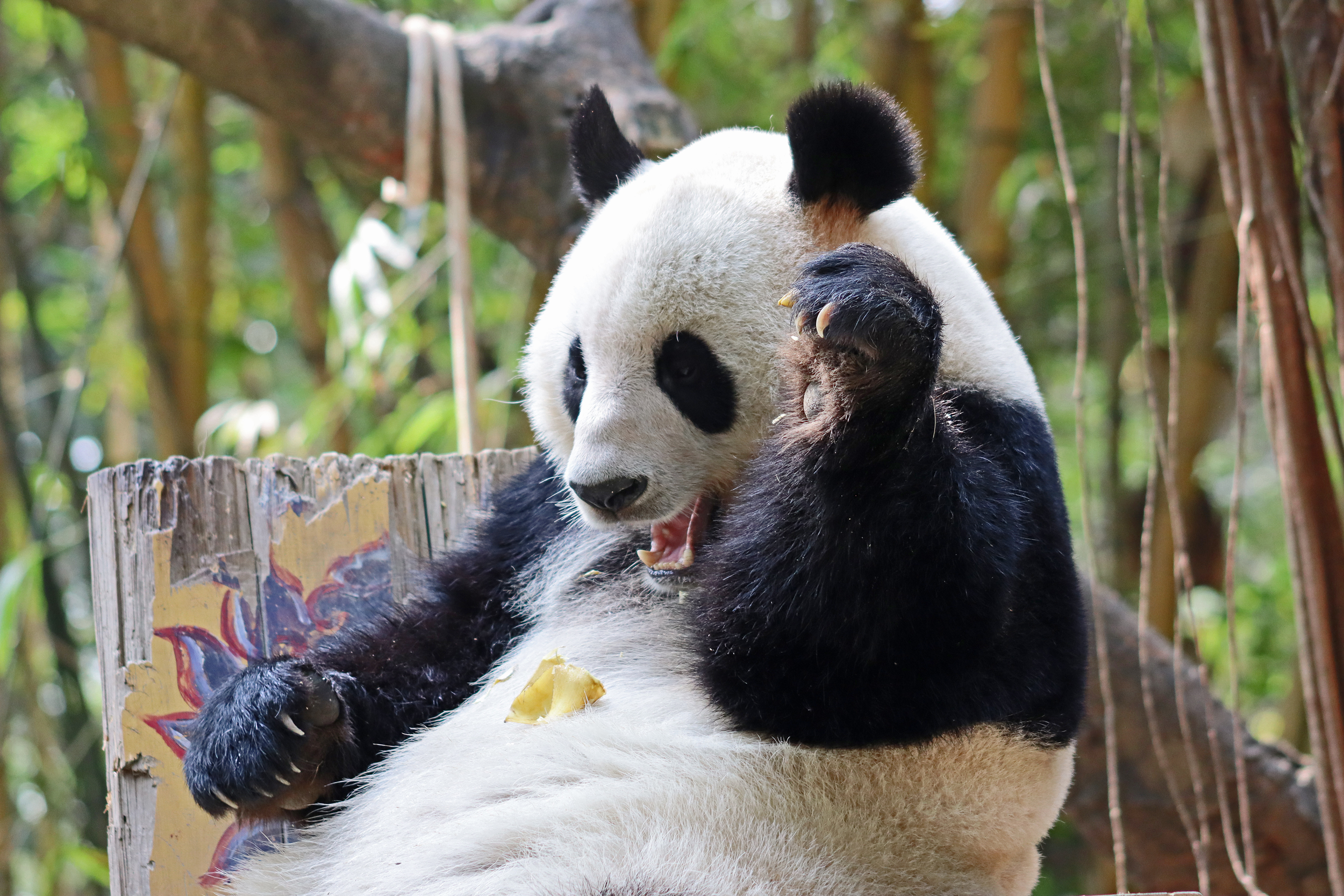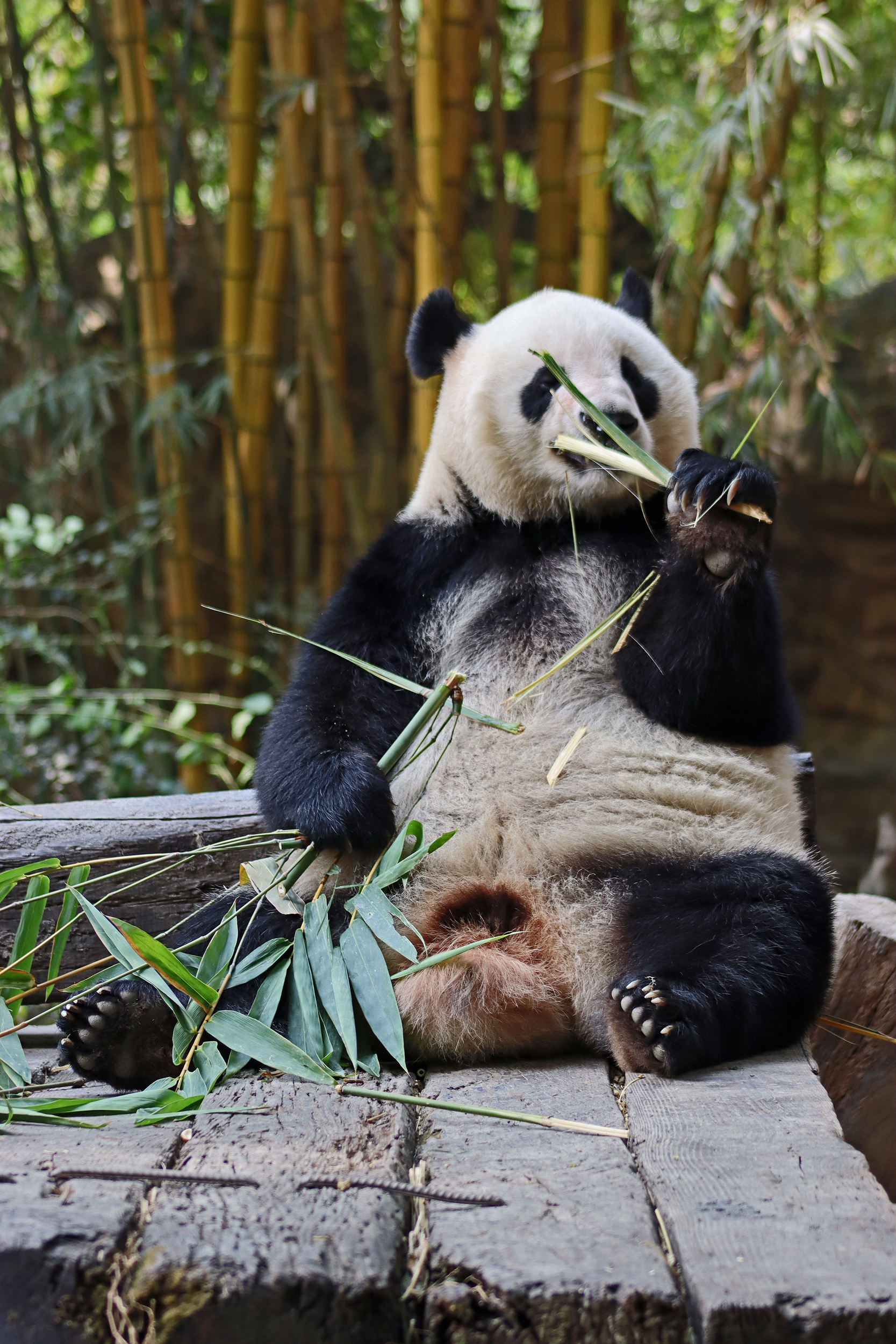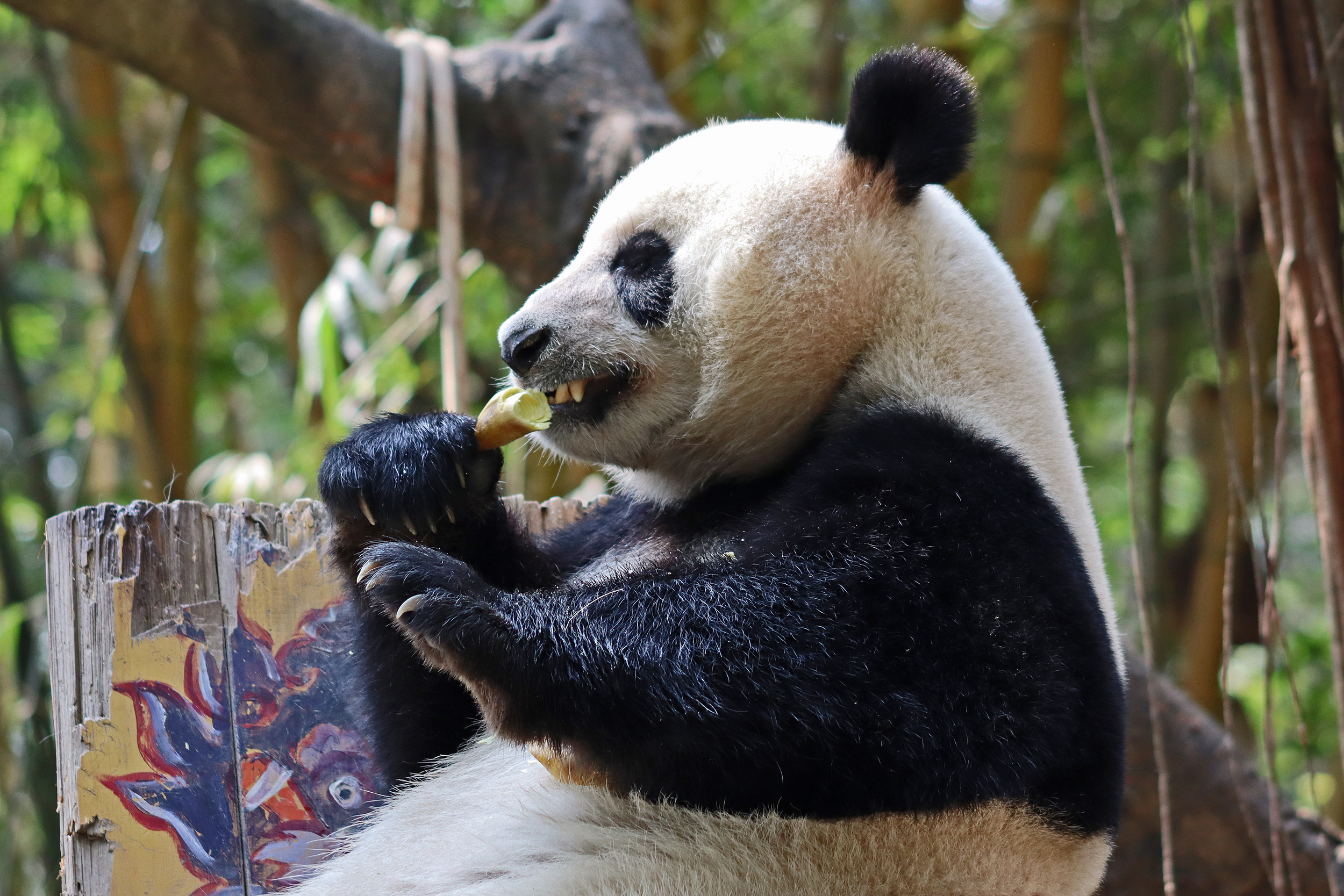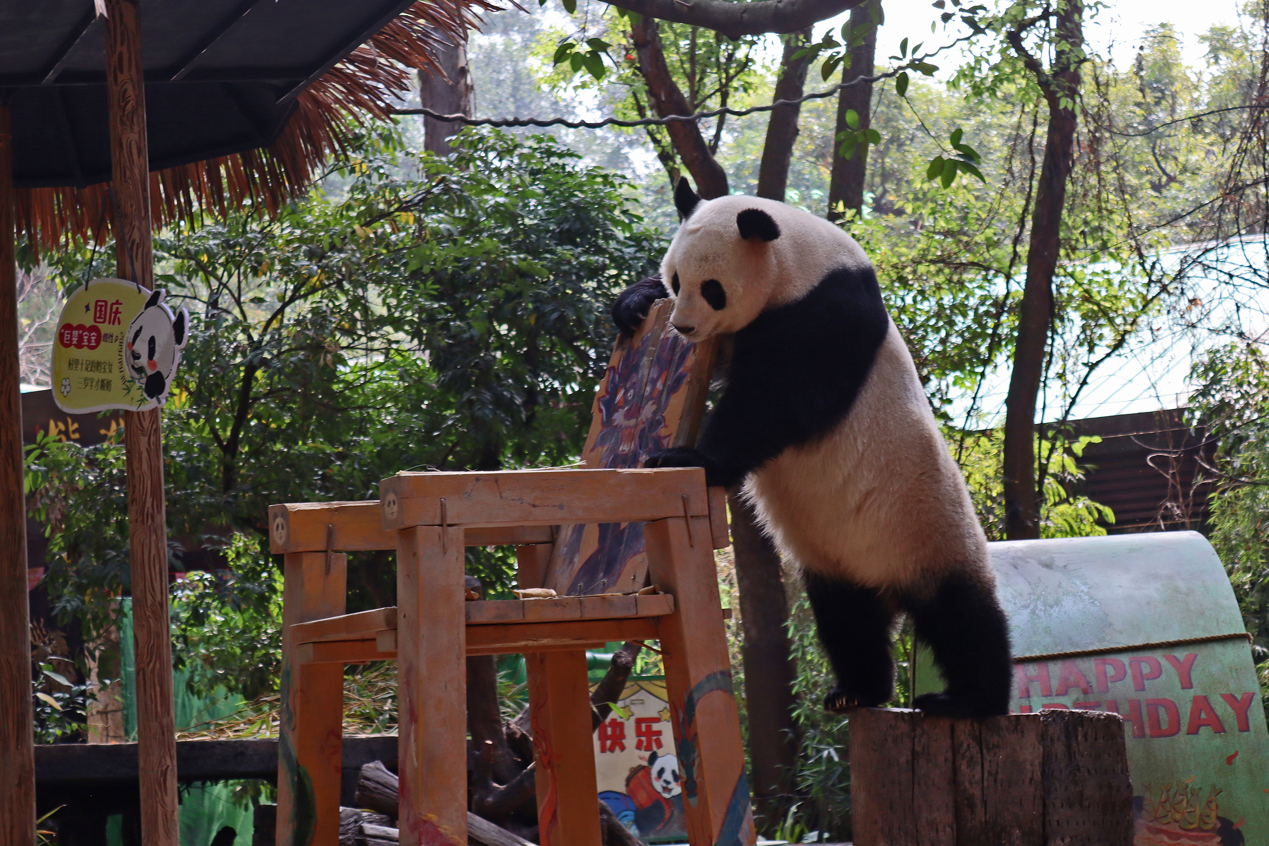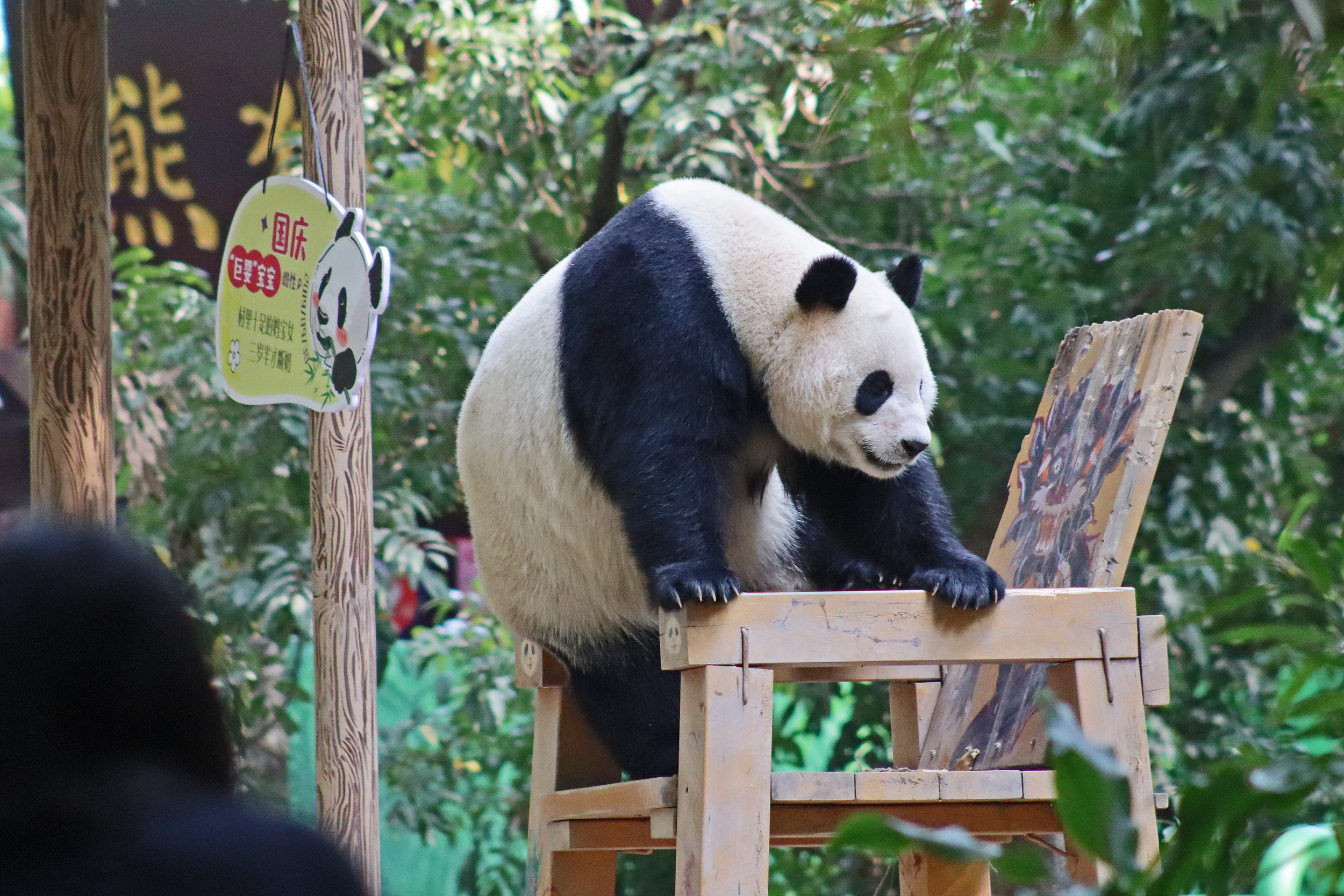 The final panda to share about at Chimelong Safari Park – it’s Guo Qing 国庆! Guo Qing was living in the separate section that you walked around to after viewing Meng Meng and Mei Zhu, and she was very very popular, always lots of people standing to watch her and I think she was loving the attention^ Guo Qing was 5.5 years old on my visit, so still quite young – she was very active and hungry, perhaps she’s been one of the only pandas I’ve not seen sleeping at all during my visit! She was very much enjoying climbing and being up high. The first time I went past she was sitting up on a log, then climbed over onto her high chair where there were some bamboo shoots to enjoy – so cute to see this, this was the sort of activity levels I was hoping for, and to see the chair getting used. She also played with her tire swing (treats were inside the tire), and then went into her wheel, where there was another enrichment ball tied up with treats inside too. She was very thorough in making sure she got every last one. Later she was up on a platform enjoying bamboo, and at the end of the day she was climbing again – so cute to see her dismount off the chair, opting for a head-first method and doing a roll mid-way before running off quickly once she got down!
