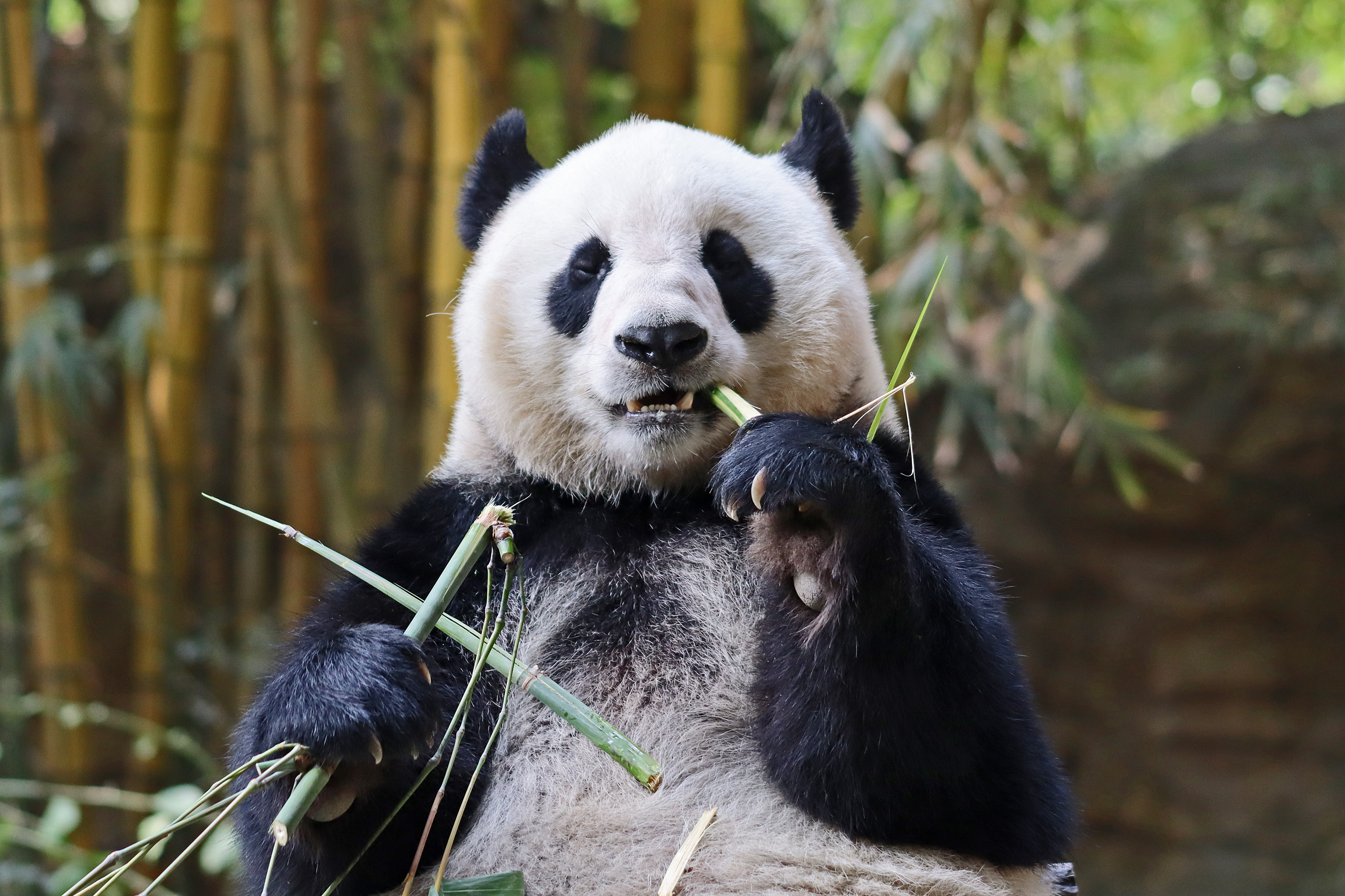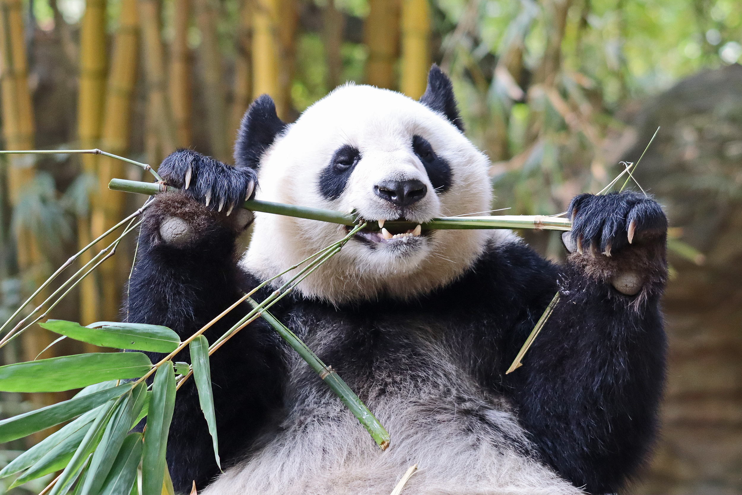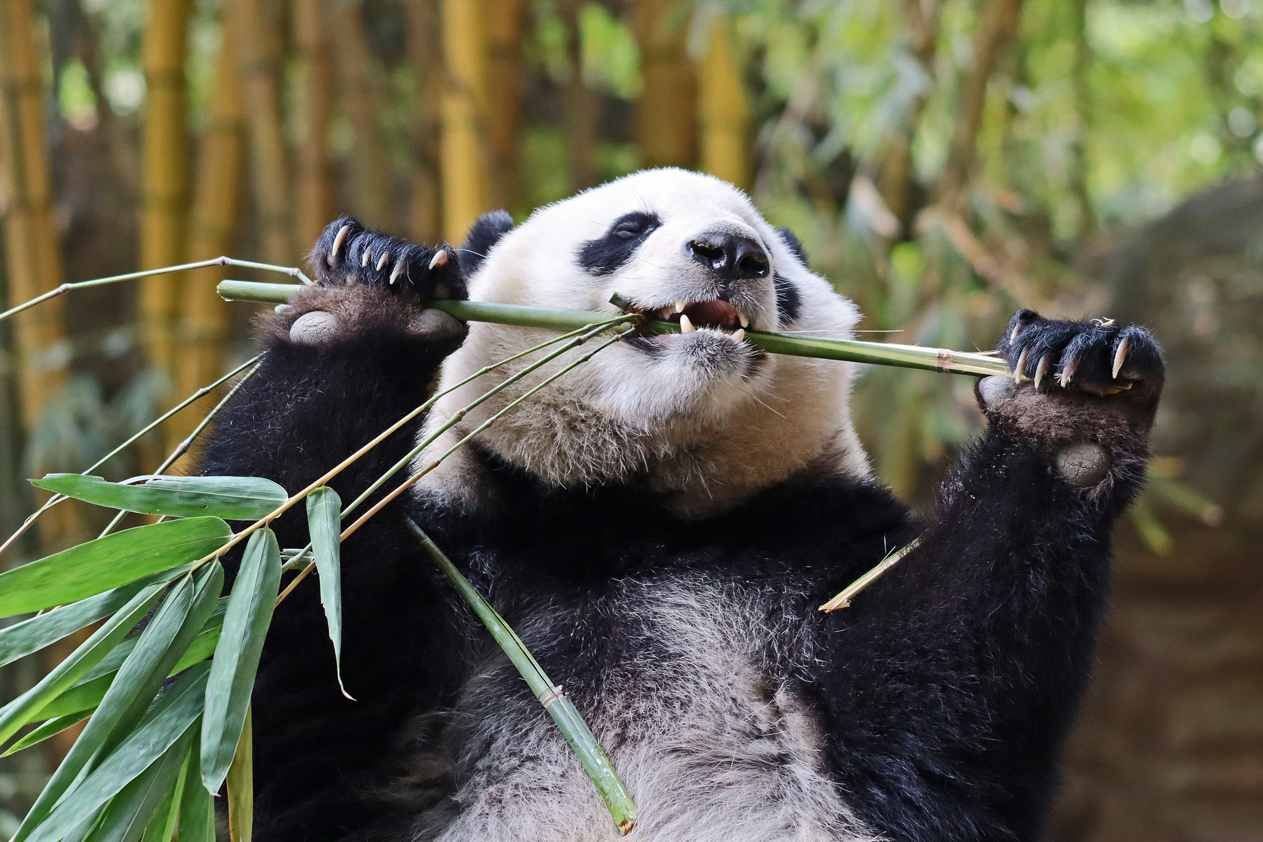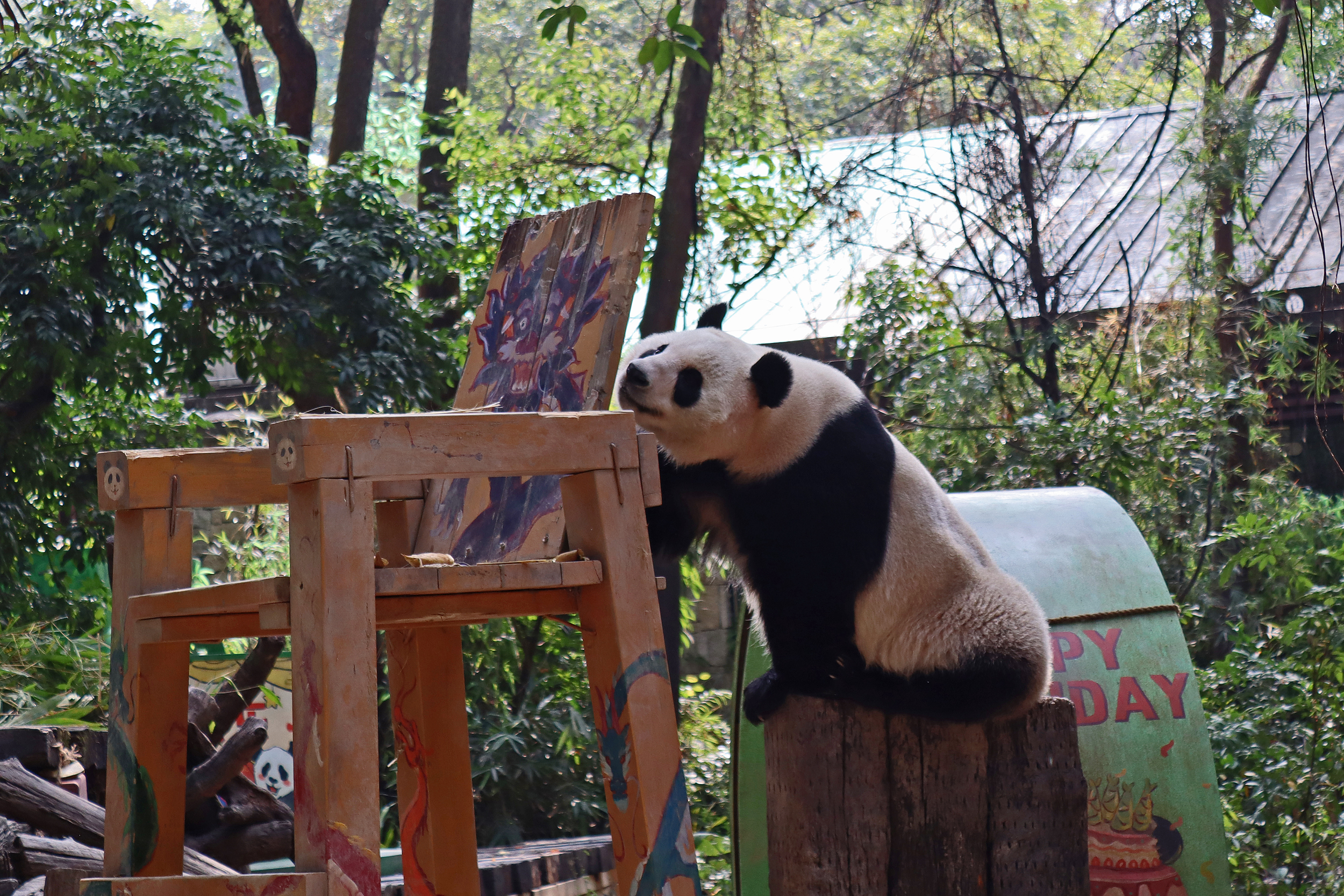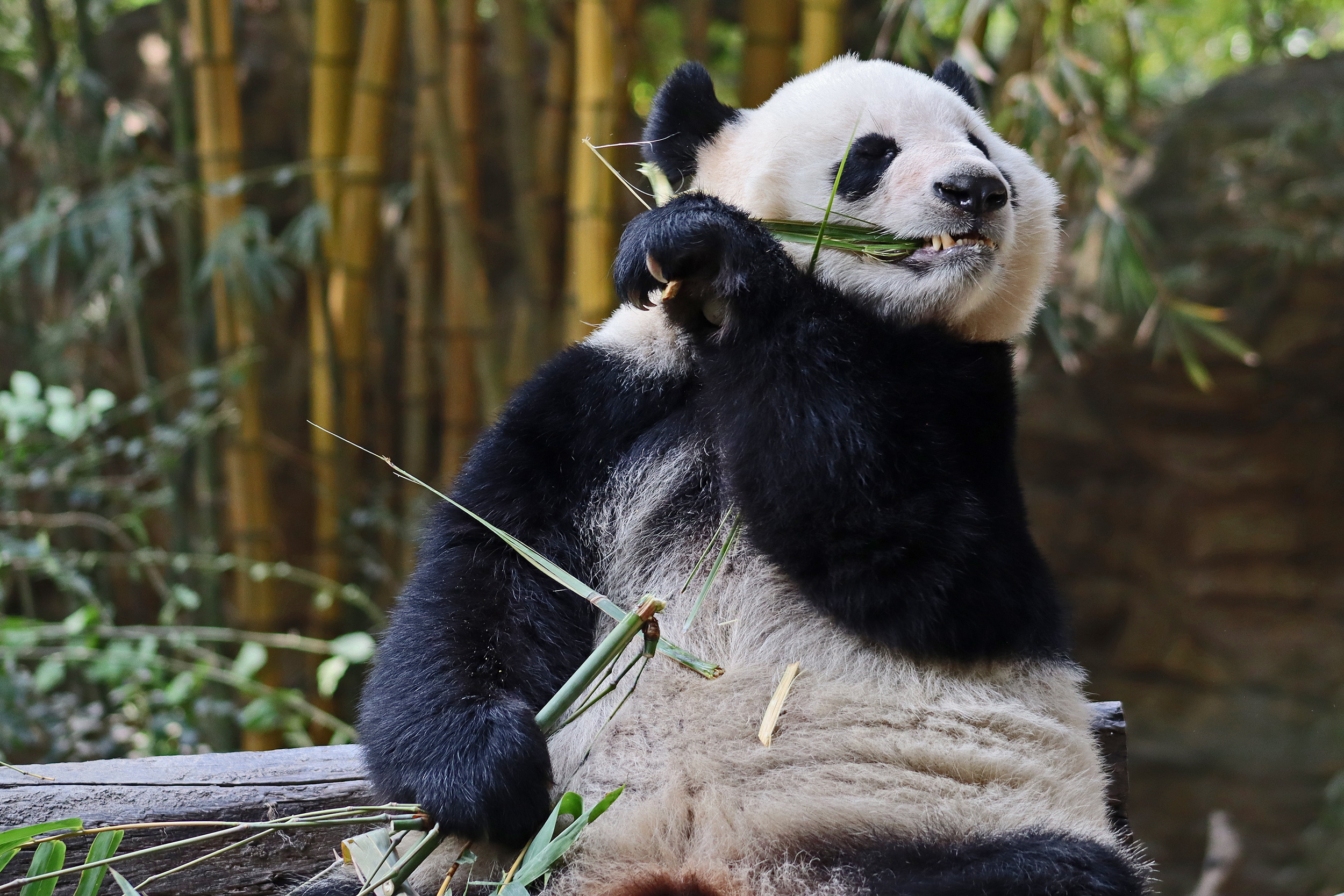 The final panda to share about at Chimelong Safari Park – it’s Guo Qing 国庆! Guo Qing was living in the separate section that you walked around to after viewing Meng Meng and Mei Zhu, and she was very very popular, always lots of people standing to watch her and I think she was loving the attention^ Guo Qing was 5.5 years old on my visit, so still quite young – she was very active and hungry, perhaps she’s been one of the only pandas I’ve not seen sleeping at all during my visit! She was very much enjoying climbing and being up high. The first time I went past she was sitting up on a log, then climbed over onto her high chair where there were some bamboo shoots to enjoy – so cute to see this, this was the sort of activity levels I was hoping for, and to see the chair getting used. She also played with her tire swing (treats were inside the tire), and then went into her wheel, where there was another enrichment ball tied up with treats inside too. She was very thorough in making sure she got every last one. Later she was up on a platform enjoying bamboo, and at the end of the day she was climbing again – so cute to see her dismount off the chair, opting for a head-first method and doing a roll mid-way before running off quickly once she got down!