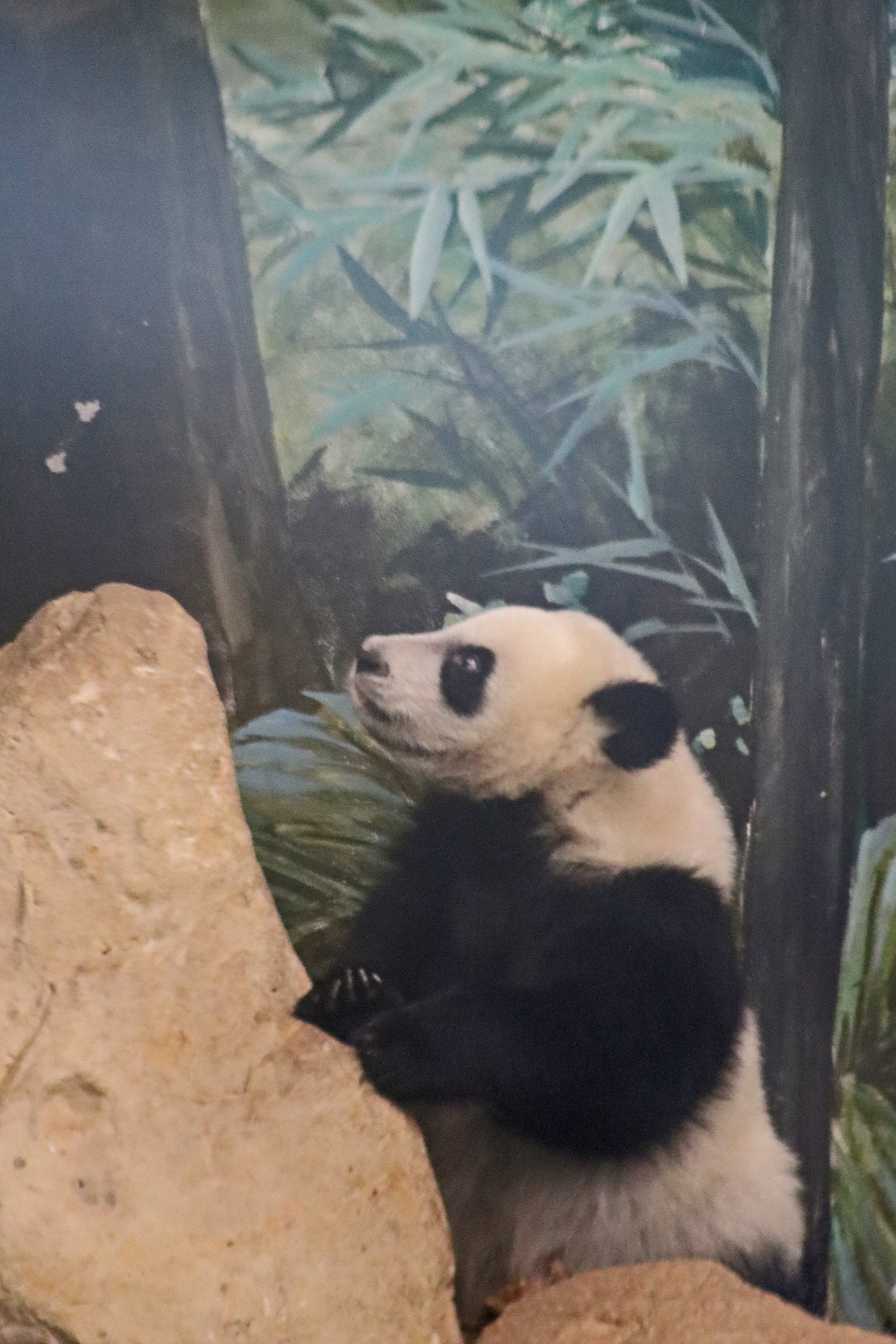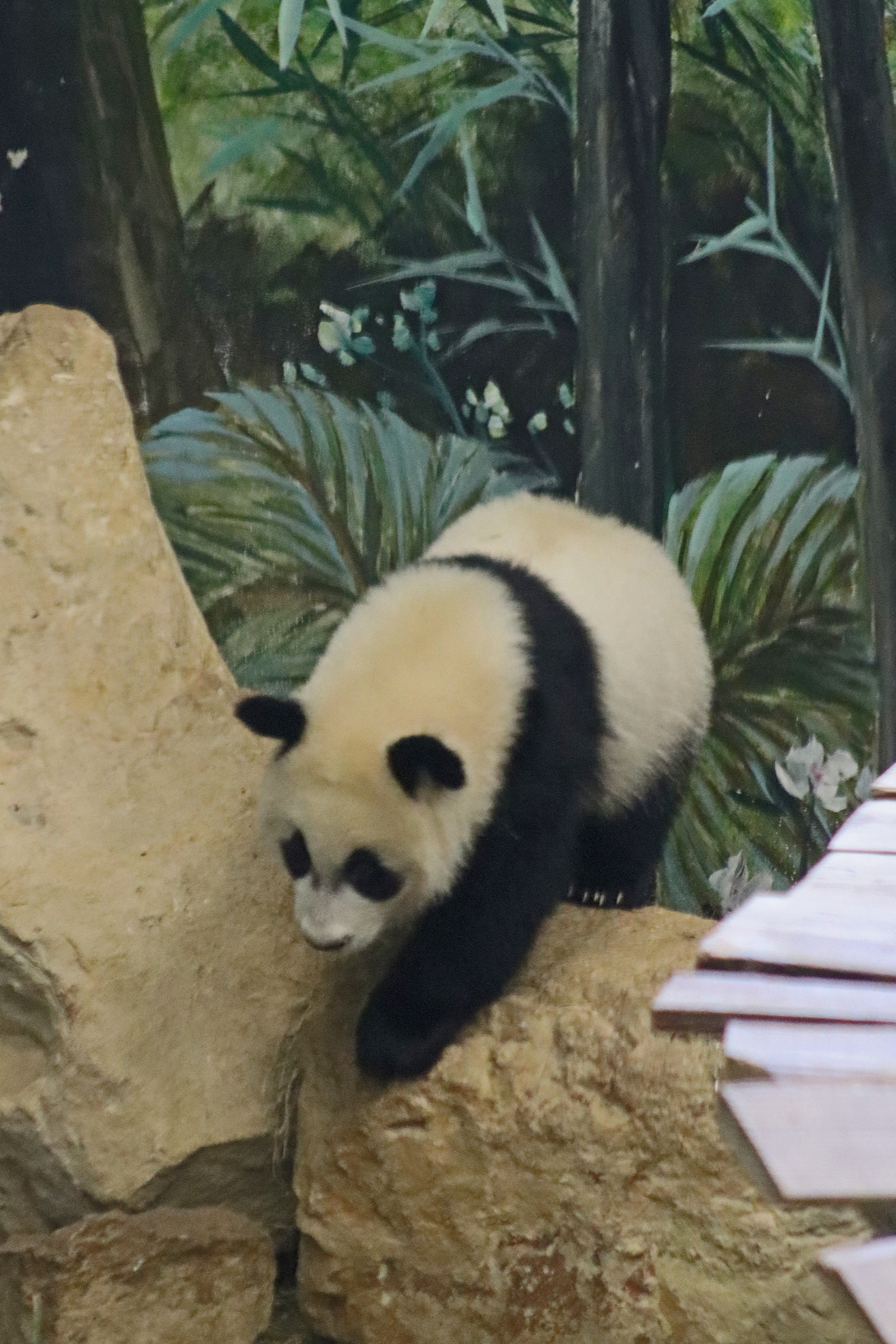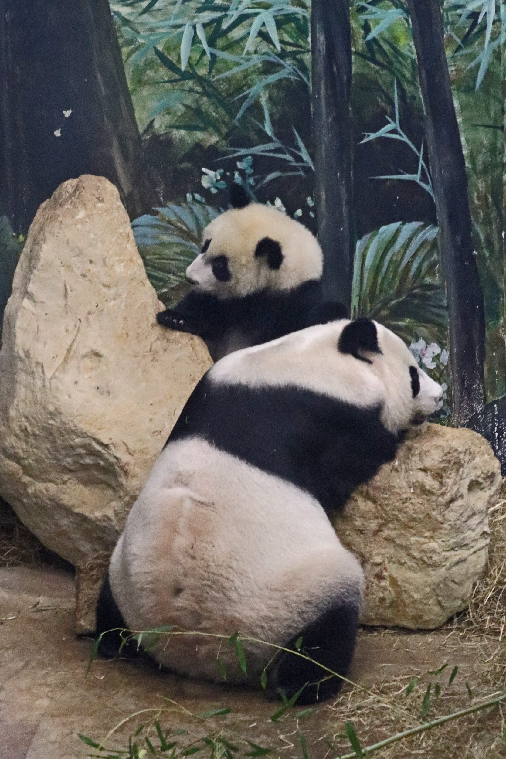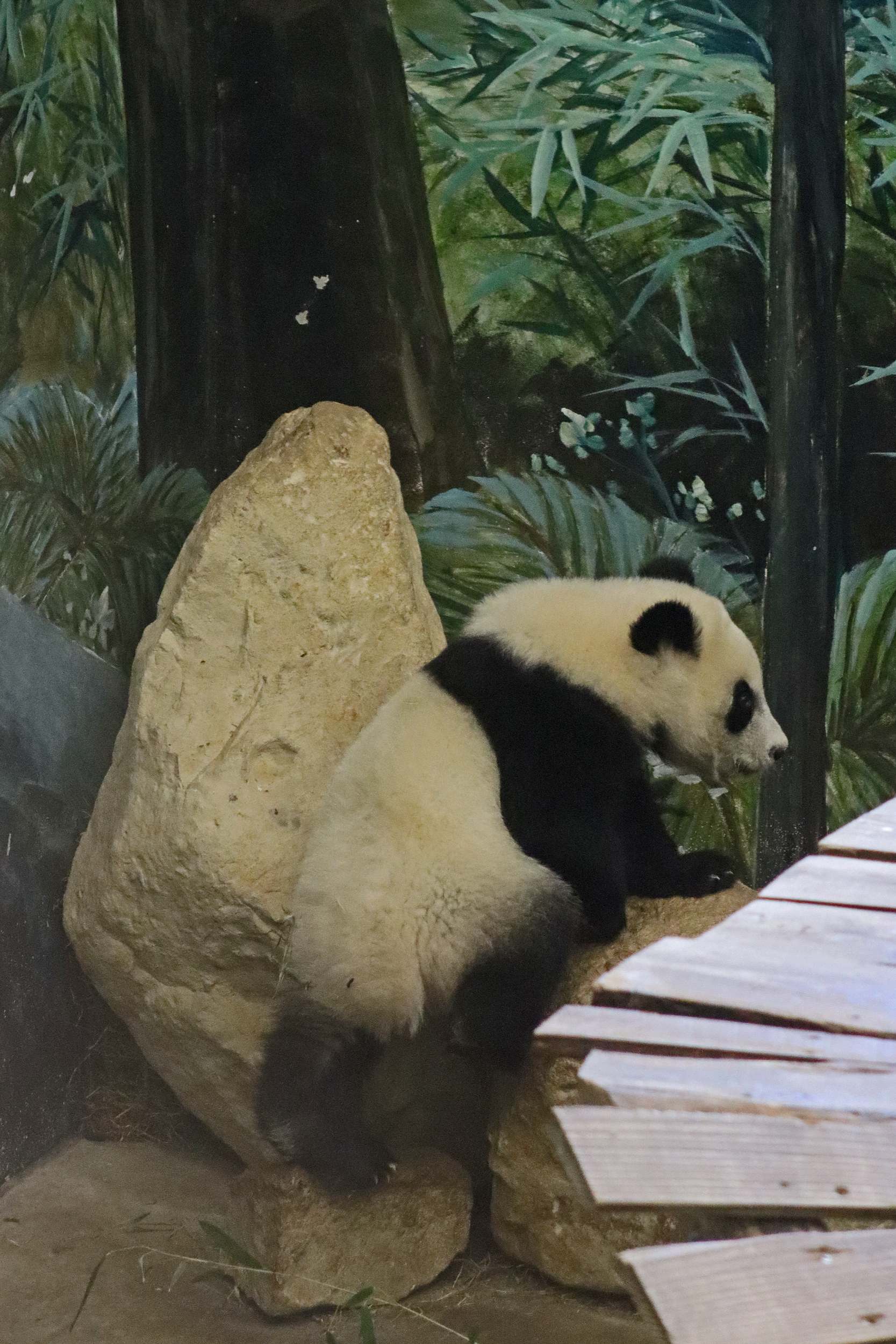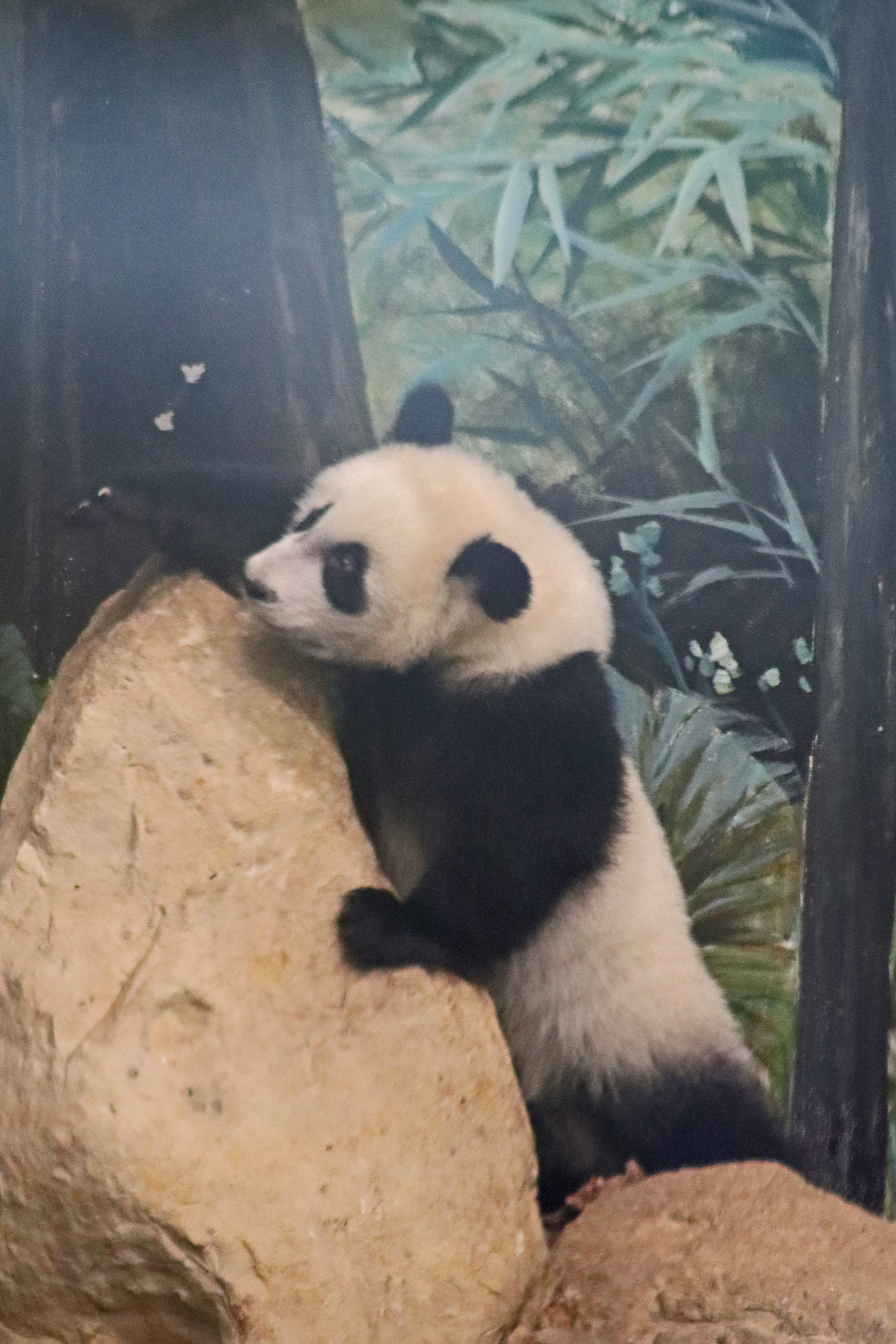 Now mama Wu Wen 武雯 and second Dutch-born cub Lang Yue 朗月 who is also a female – for a while when we arrived we could only see Lang Yue, she was sitting in the doorway to one of the back dens, then after maybe an hour or so Wu Wen eventually came out to see what Lang Yue was doing and catch up on some bamboo! These two were quite tricky to photograph, they mostly hung out by the wall below the tall viewing windows, so the only spot was the smaller side windows, and then you were at the mercy of the sun and the reflections on the glass – it was quite limiting but I think I did get some good ones eventually. Once Wu Wen had wandered out once, she was wandering around quite a bit, going out and in from the back den, checking on Lang Yue and having bamboo. Lang Yue was mostly just in the doorway for the day, so I think we got her on a quiet day, but at least it meant we could still see her – we got lucky later in the afternoon when she was feeling a little adventurous and came out for some climbing! Initially Wu Wen didn’t bother with this, but the second time she climbed up the rocky structure, mum headed over to pull her off! Some very sweet interactions that were definitely a highlight of the day.