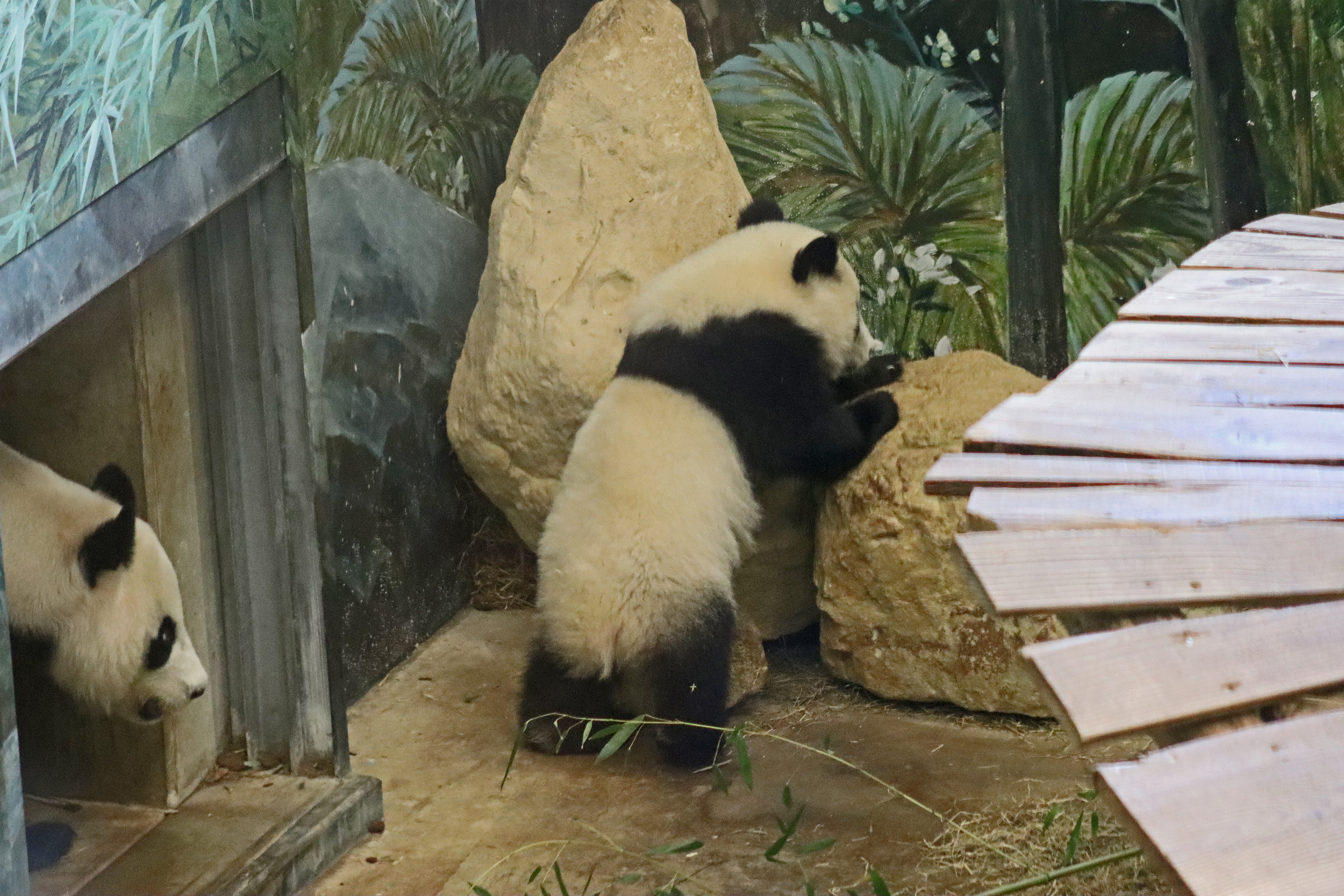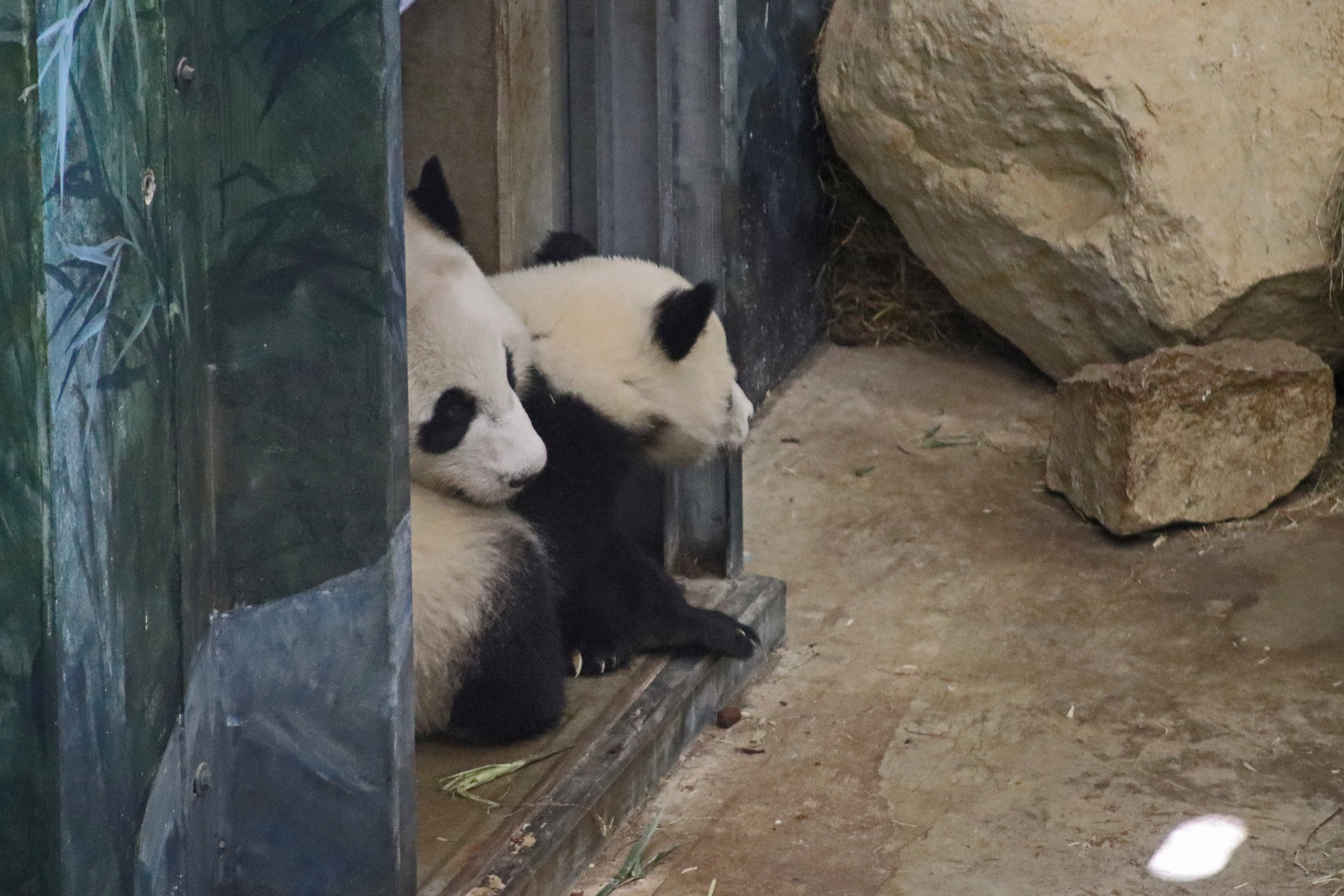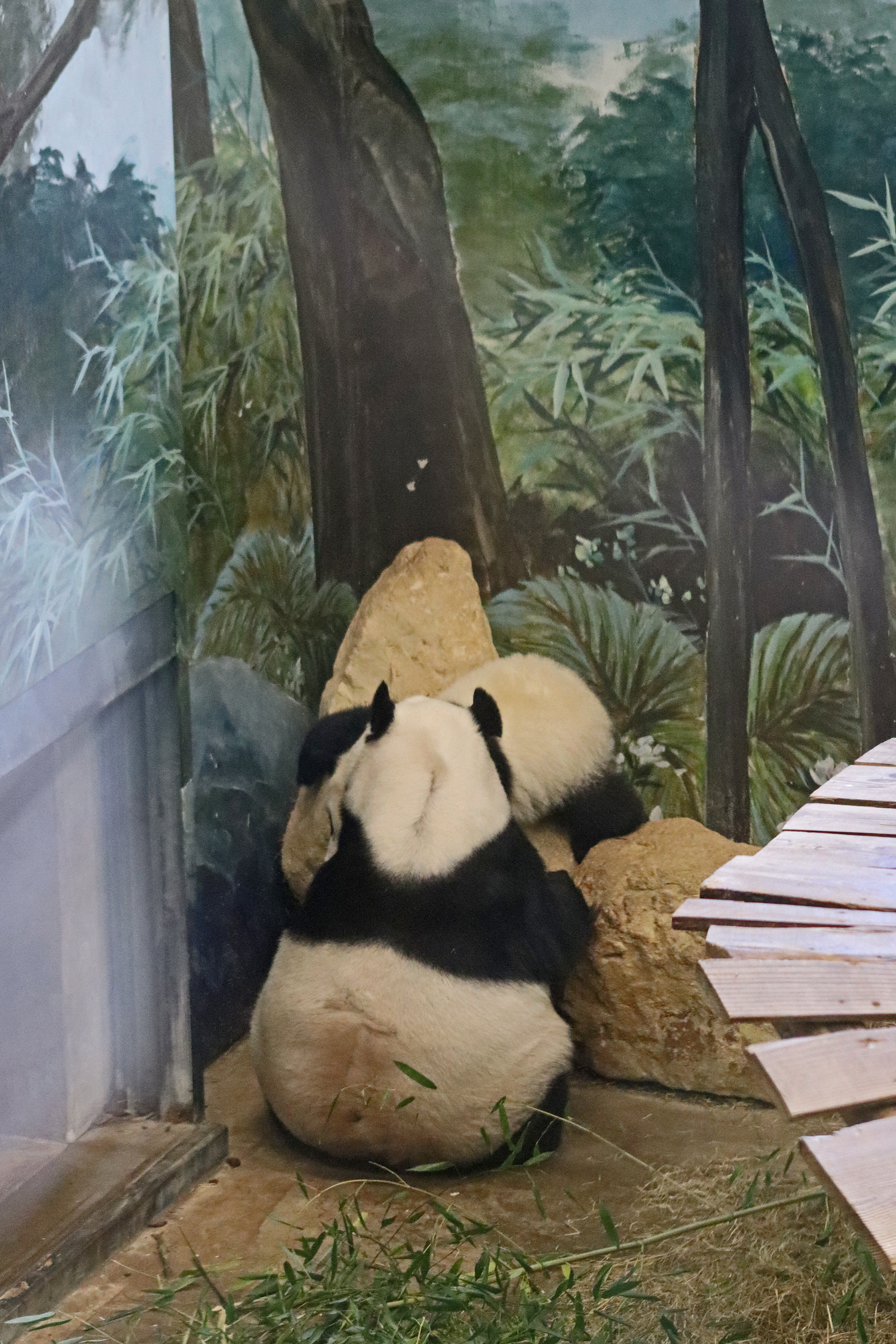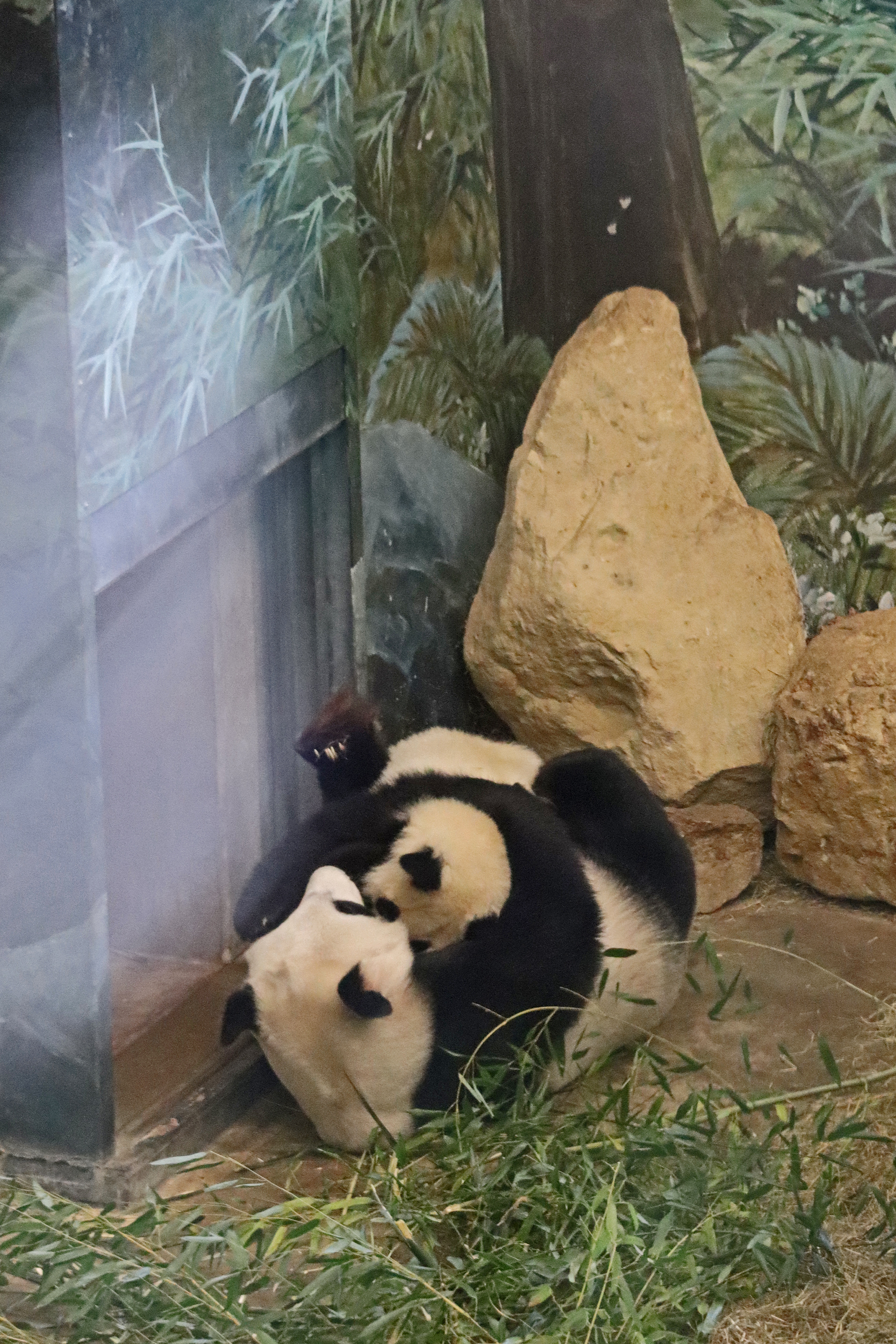 Now mama Wu Wen 武雯 and second Dutch-born cub Lang Yue 朗月 who is also a female – for a while when we arrived we could only see Lang Yue, she was sitting in the doorway to one of the back dens, then after maybe an hour or so Wu Wen eventually came out to see what Lang Yue was doing and catch up on some bamboo! These two were quite tricky to photograph, they mostly hung out by the wall below the tall viewing windows, so the only spot was the smaller side windows, and then you were at the mercy of the sun and the reflections on the glass – it was quite limiting but I think I did get some good ones eventually. Once Wu Wen had wandered out once, she was wandering around quite a bit, going out and in from the back den, checking on Lang Yue and having bamboo. Lang Yue was mostly just in the doorway for the day, so I think we got her on a quiet day, but at least it meant we could still see her – we got lucky later in the afternoon when she was feeling a little adventurous and came out for some climbing! Initially Wu Wen didn’t bother with this, but the second time she climbed up the rocky structure, mum headed over to pull her off! Some very sweet interactions that were definitely a highlight of the day.