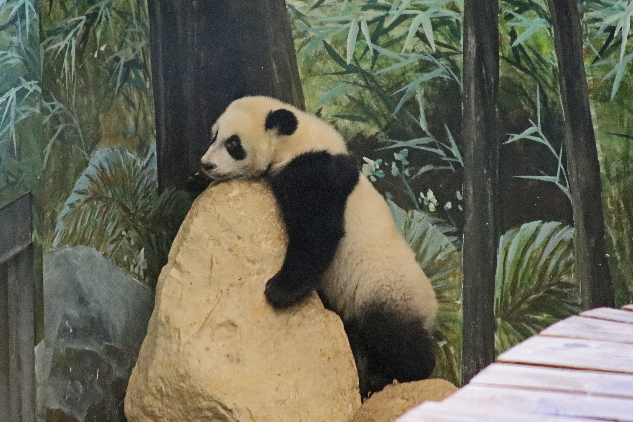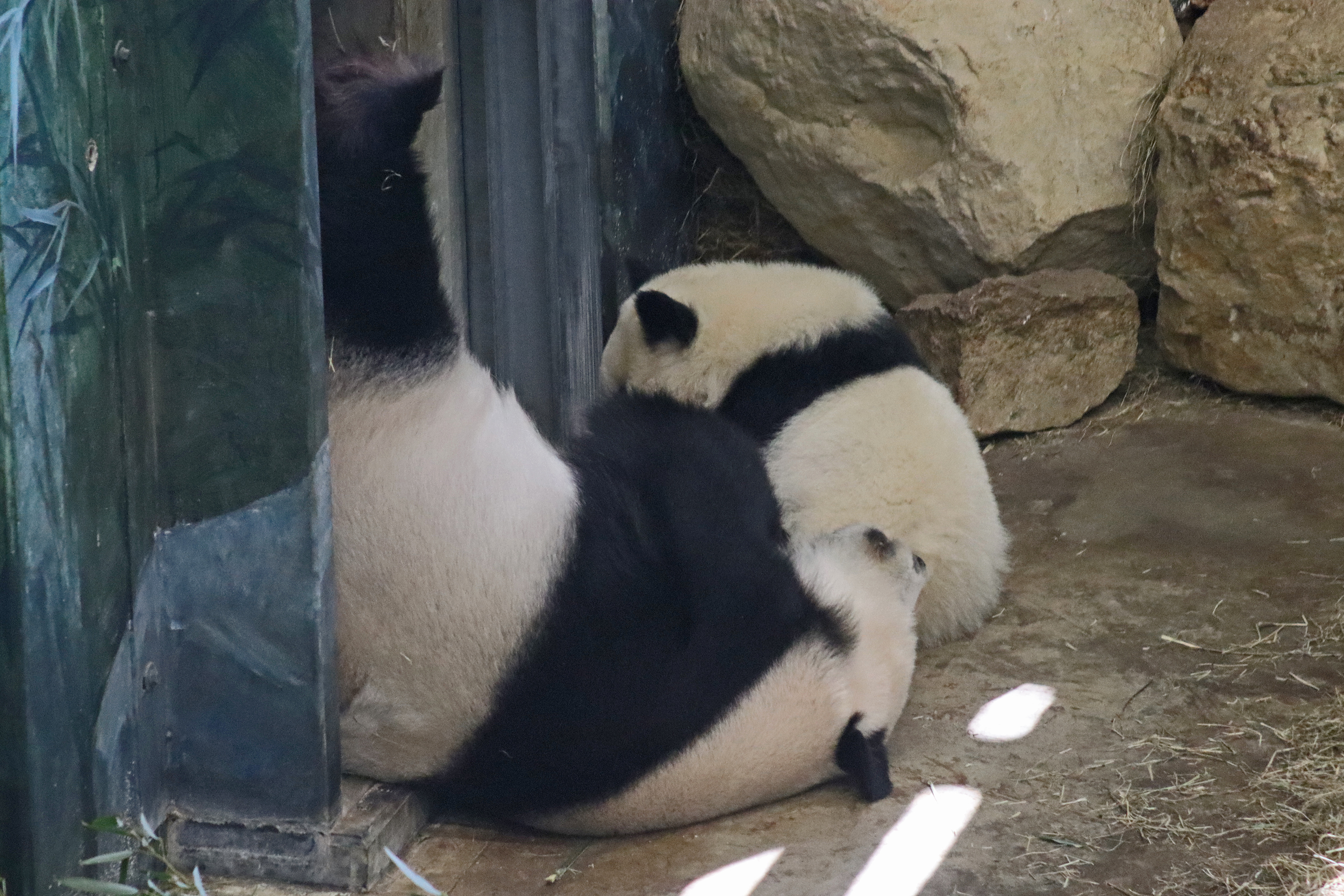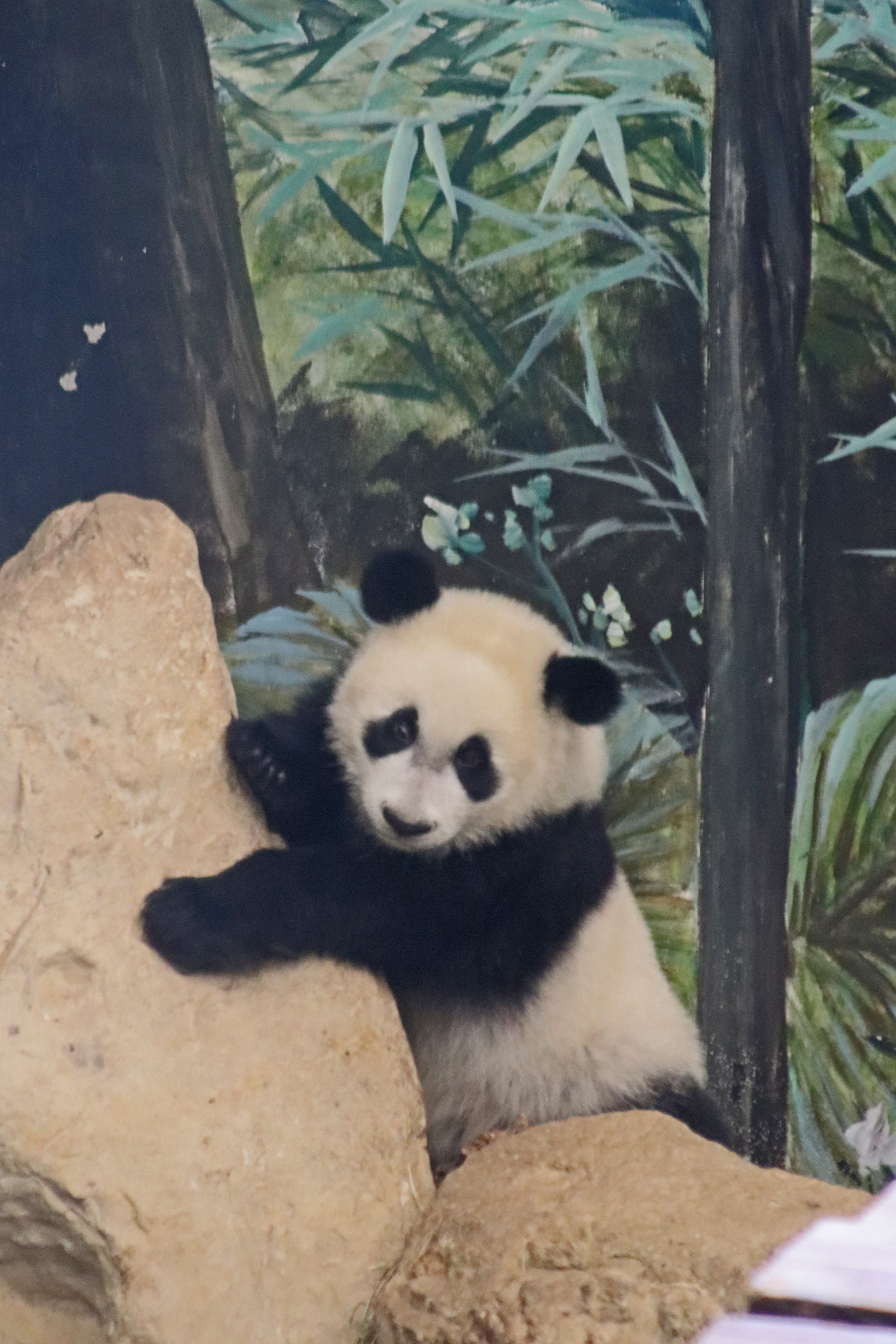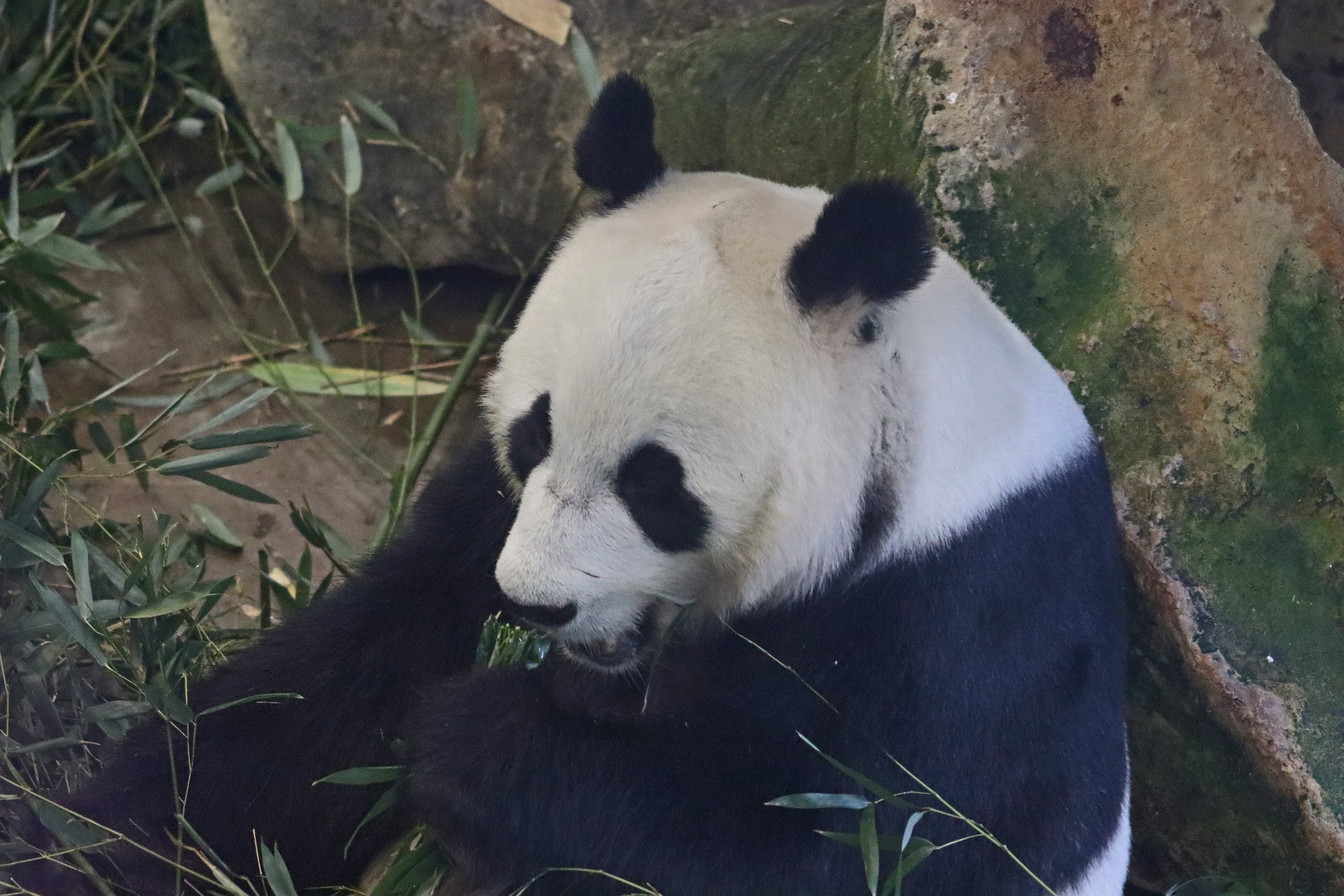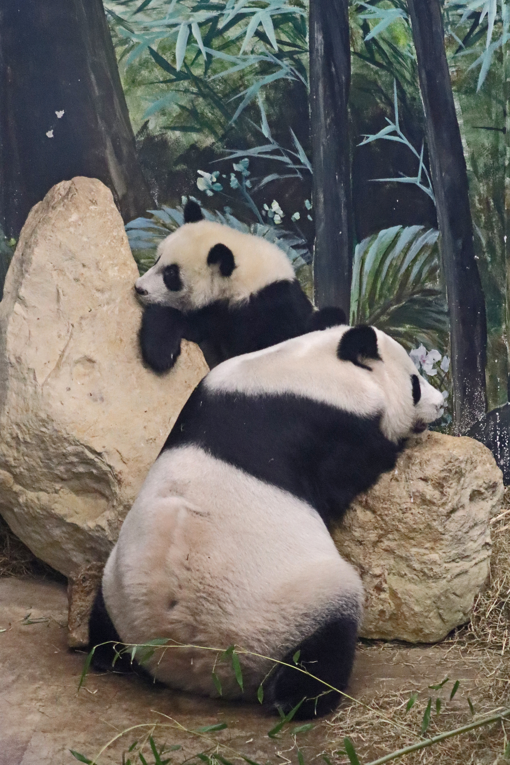 Now mama Wu Wen 武雯 and second Dutch-born cub Lang Yue 朗月 who is also a female – for a while when we arrived we could only see Lang Yue, she was sitting in the doorway to one of the back dens, then after maybe an hour or so Wu Wen eventually came out to see what Lang Yue was doing and catch up on some bamboo! These two were quite tricky to photograph, they mostly hung out by the wall below the tall viewing windows, so the only spot was the smaller side windows, and then you were at the mercy of the sun and the reflections on the glass – it was quite limiting but I think I did get some good ones eventually. Once Wu Wen had wandered out once, she was wandering around quite a bit, going out and in from the back den, checking on Lang Yue and having bamboo. Lang Yue was mostly just in the doorway for the day, so I think we got her on a quiet day, but at least it meant we could still see her – we got lucky later in the afternoon when she was feeling a little adventurous and came out for some climbing! Initially Wu Wen didn’t bother with this, but the second time she climbed up the rocky structure, mum headed over to pull her off! Some very sweet interactions that were definitely a highlight of the day.