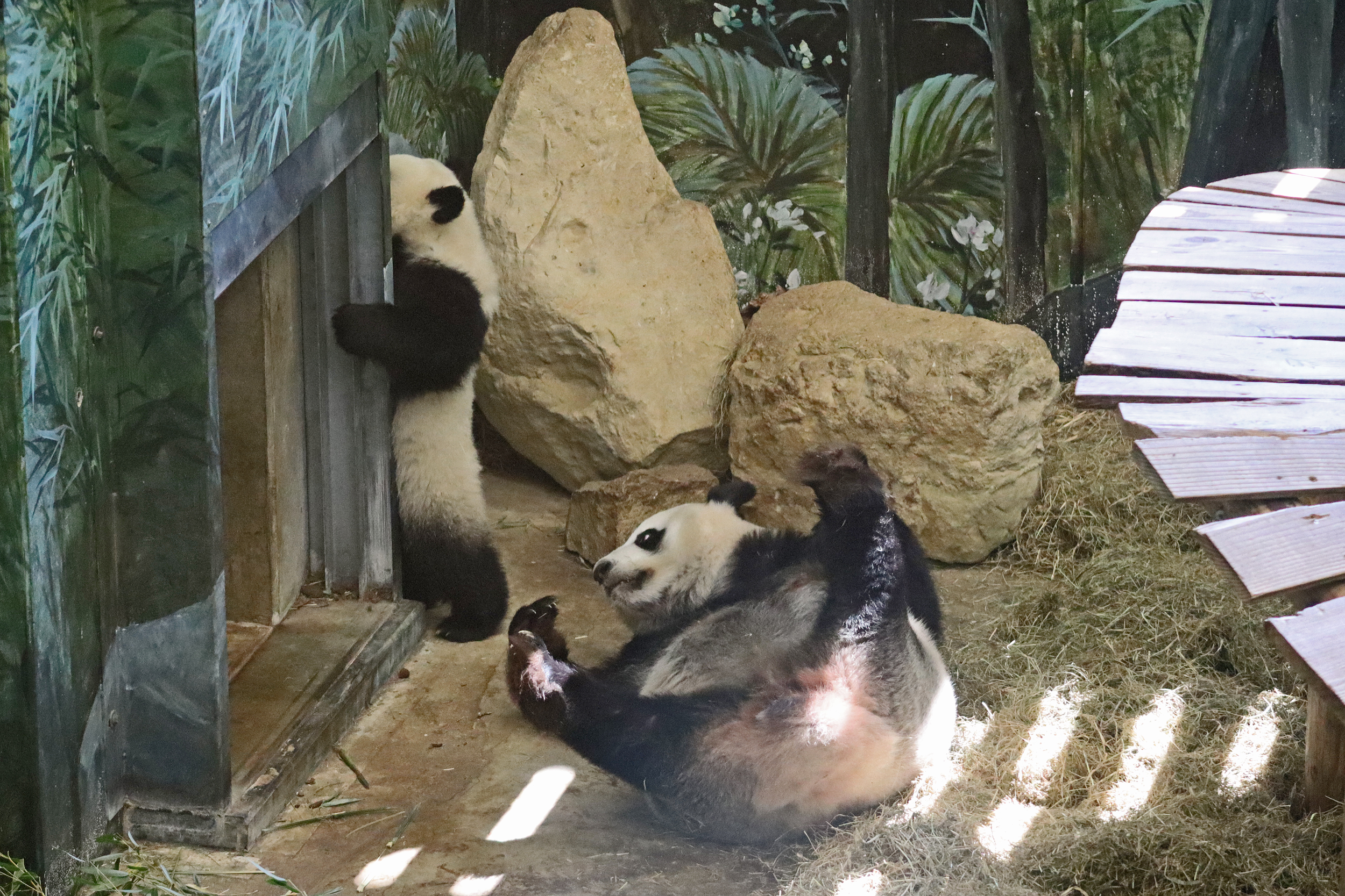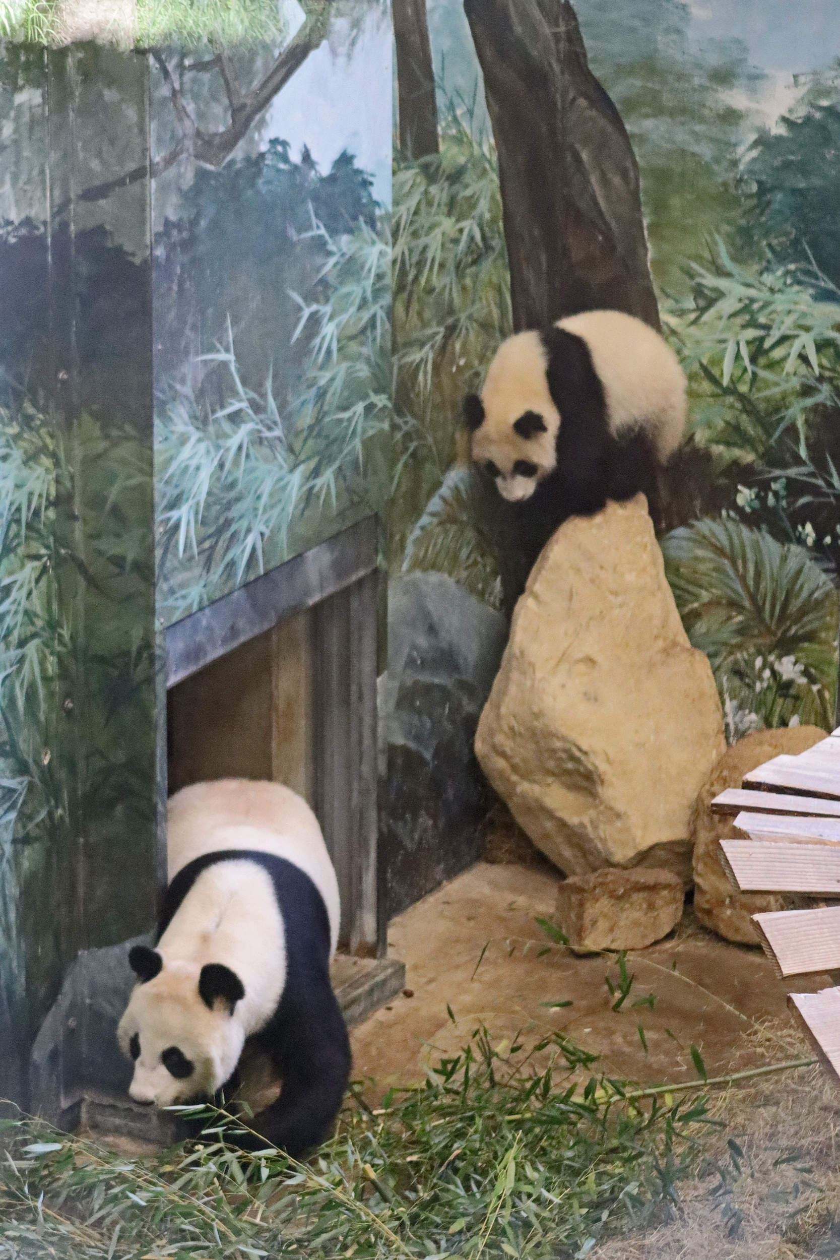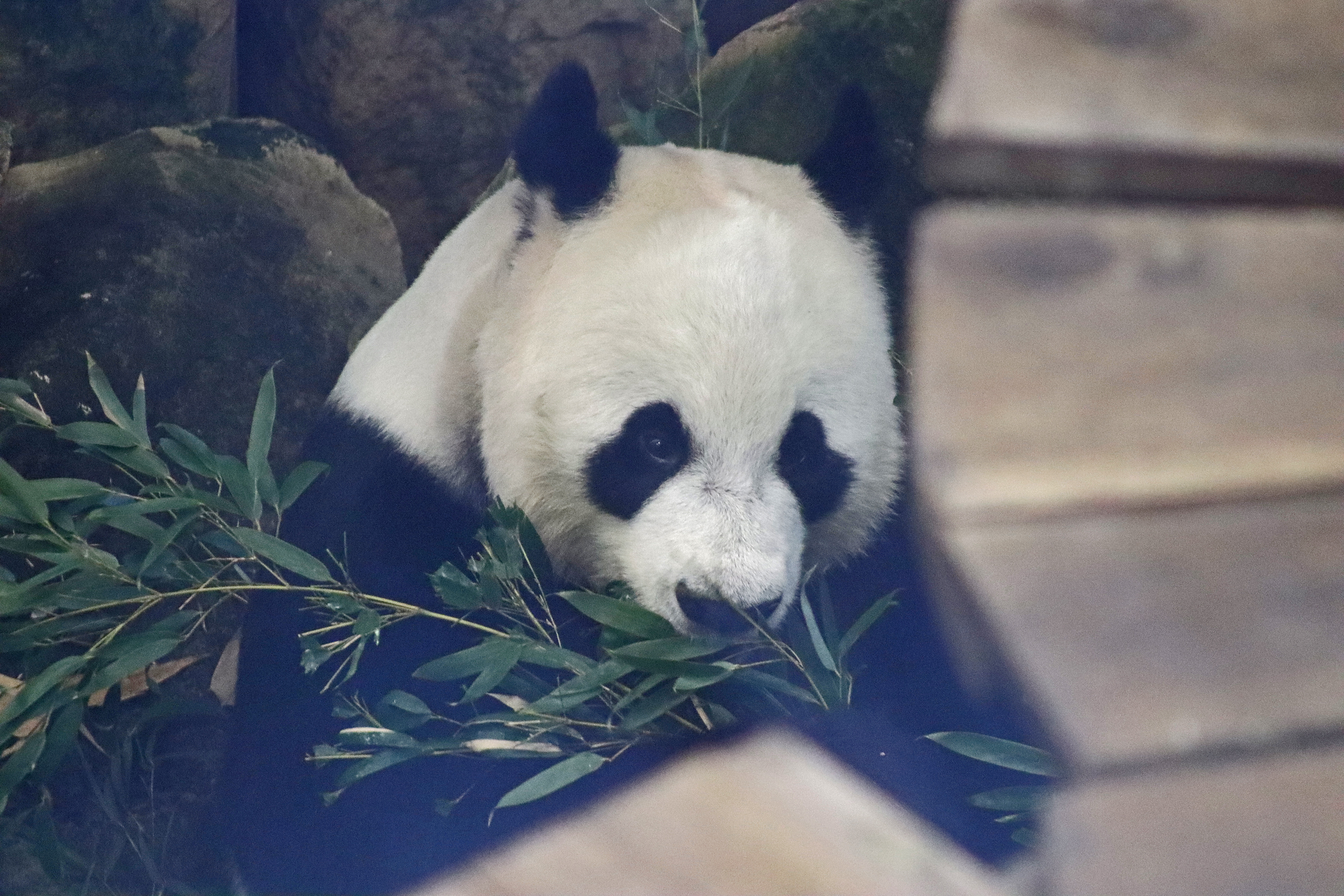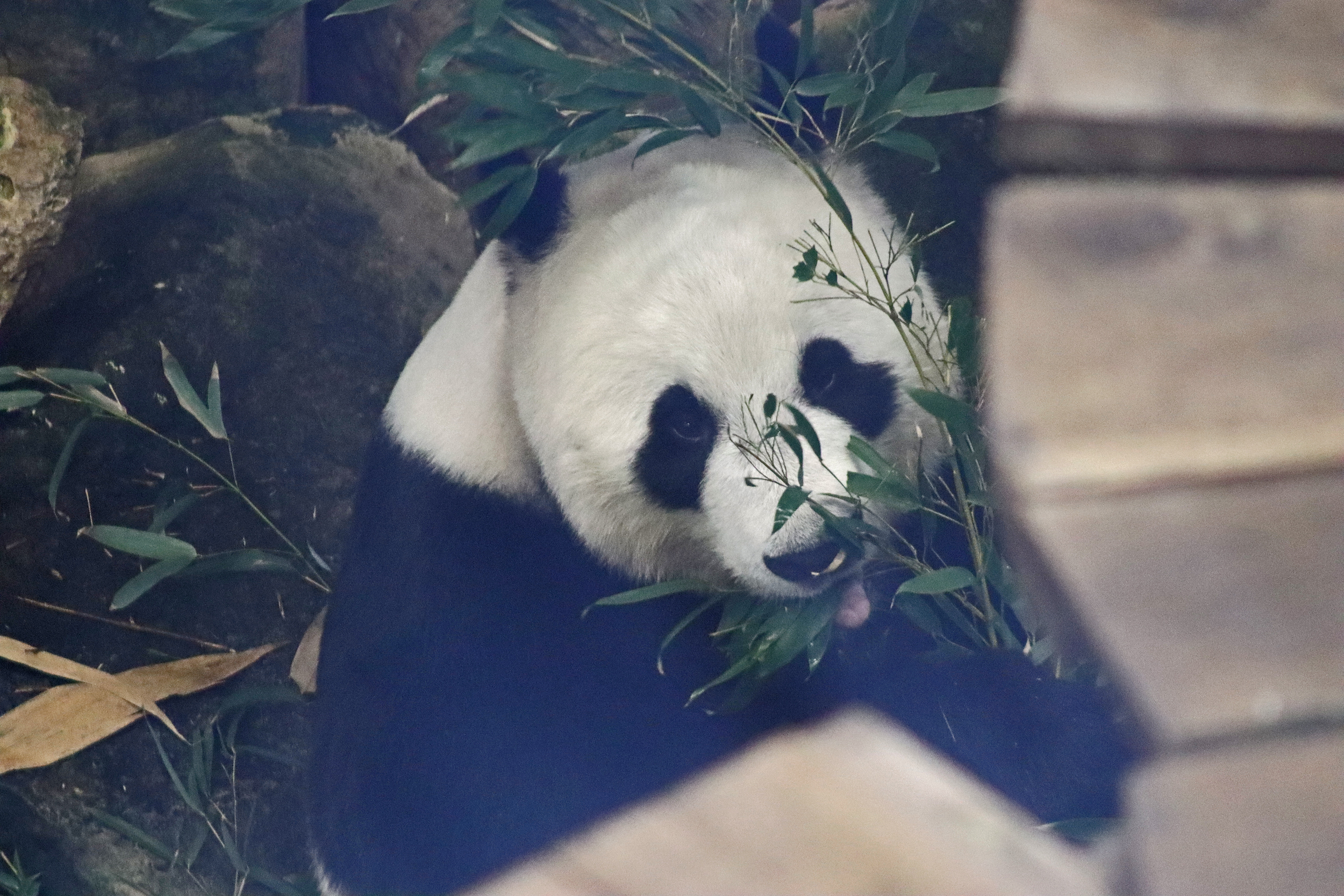 Now mama Wu Wen 武雯 and second Dutch-born cub Lang Yue 朗月 who is also a female – for a while when we arrived we could only see Lang Yue, she was sitting in the doorway to one of the back dens, then after maybe an hour or so Wu Wen eventually came out to see what Lang Yue was doing and catch up on some bamboo! These two were quite tricky to photograph, they mostly hung out by the wall below the tall viewing windows, so the only spot was the smaller side windows, and then you were at the mercy of the sun and the reflections on the glass – it was quite limiting but I think I did get some good ones eventually. Once Wu Wen had wandered out once, she was wandering around quite a bit, going out and in from the back den, checking on Lang Yue and having bamboo. Lang Yue was mostly just in the doorway for the day, so I think we got her on a quiet day, but at least it meant we could still see her – we got lucky later in the afternoon when she was feeling a little adventurous and came out for some climbing! Initially Wu Wen didn’t bother with this, but the second time she climbed up the rocky structure, mum headed over to pull her off! Some very sweet interactions that were definitely a highlight of the day.
