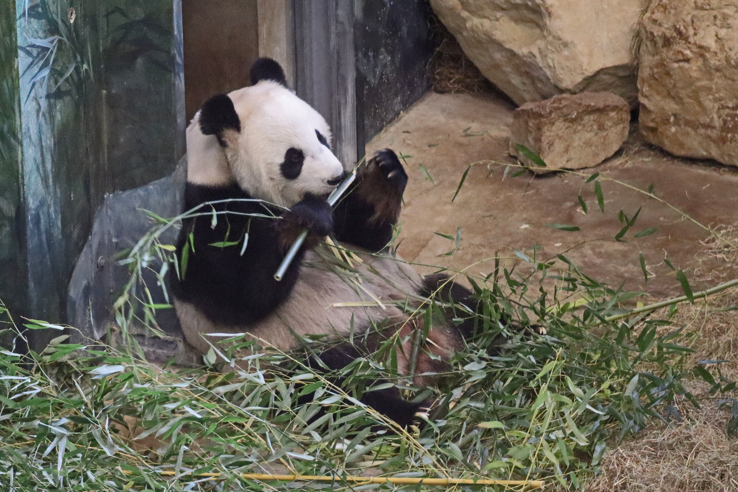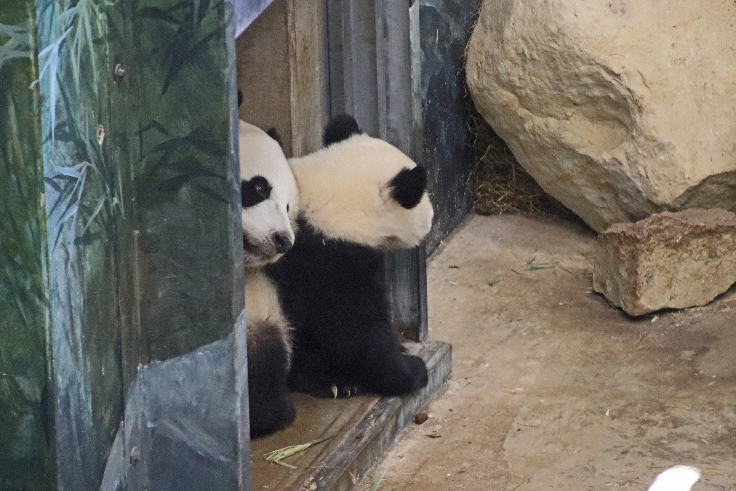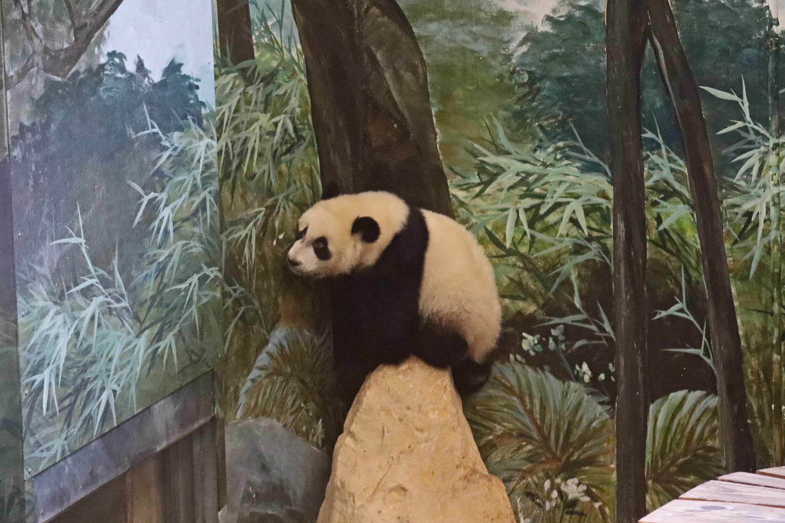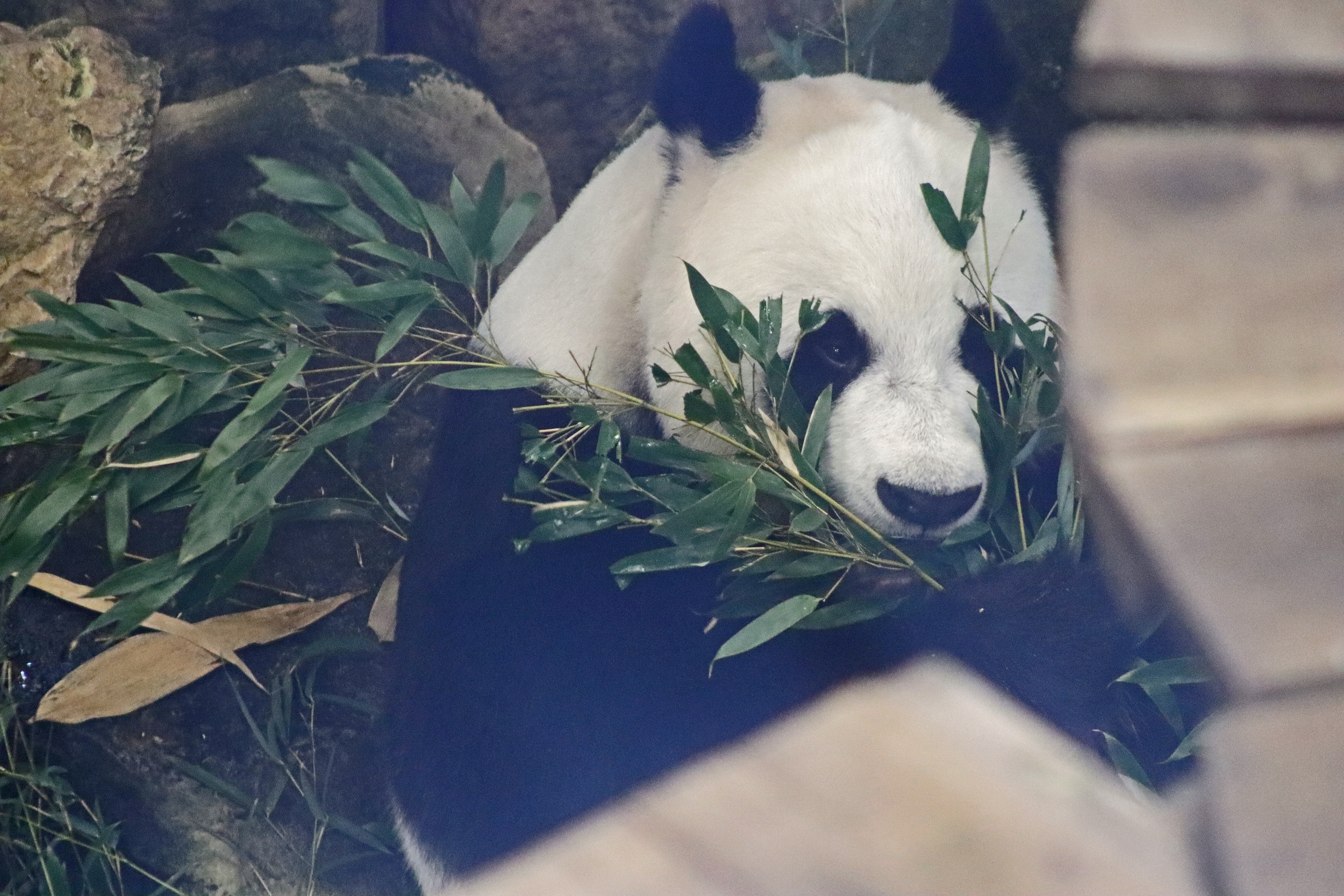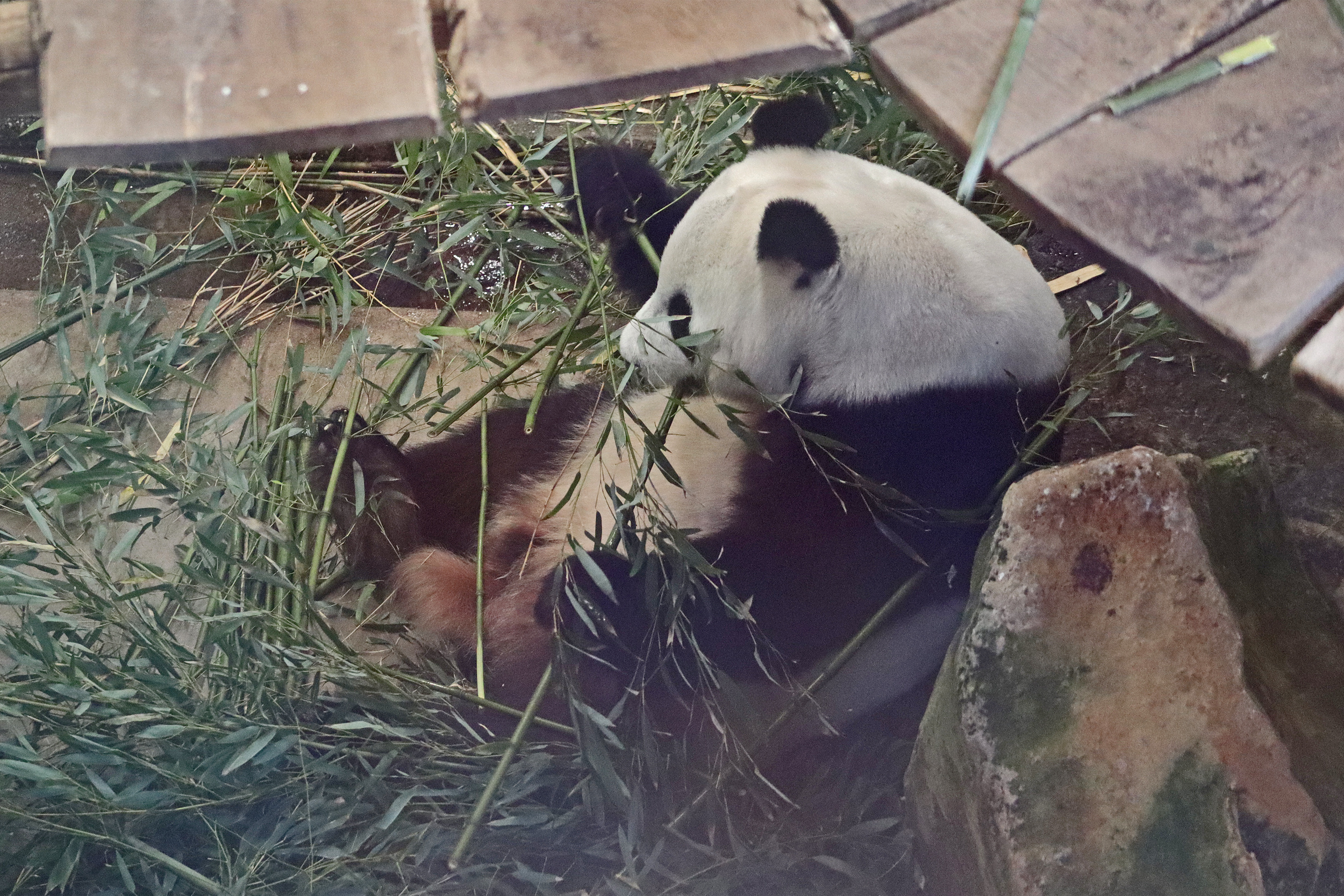 Now mama Wu Wen 武雯 and second Dutch-born cub Lang Yue 朗月 who is also a female – for a while when we arrived we could only see Lang Yue, she was sitting in the doorway to one of the back dens, then after maybe an hour or so Wu Wen eventually came out to see what Lang Yue was doing and catch up on some bamboo! These two were quite tricky to photograph, they mostly hung out by the wall below the tall viewing windows, so the only spot was the smaller side windows, and then you were at the mercy of the sun and the reflections on the glass – it was quite limiting but I think I did get some good ones eventually. Once Wu Wen had wandered out once, she was wandering around quite a bit, going out and in from the back den, checking on Lang Yue and having bamboo. Lang Yue was mostly just in the doorway for the day, so I think we got her on a quiet day, but at least it meant we could still see her – we got lucky later in the afternoon when she was feeling a little adventurous and came out for some climbing! Initially Wu Wen didn’t bother with this, but the second time she climbed up the rocky structure, mum headed over to pull her off! Some very sweet interactions that were definitely a highlight of the day.