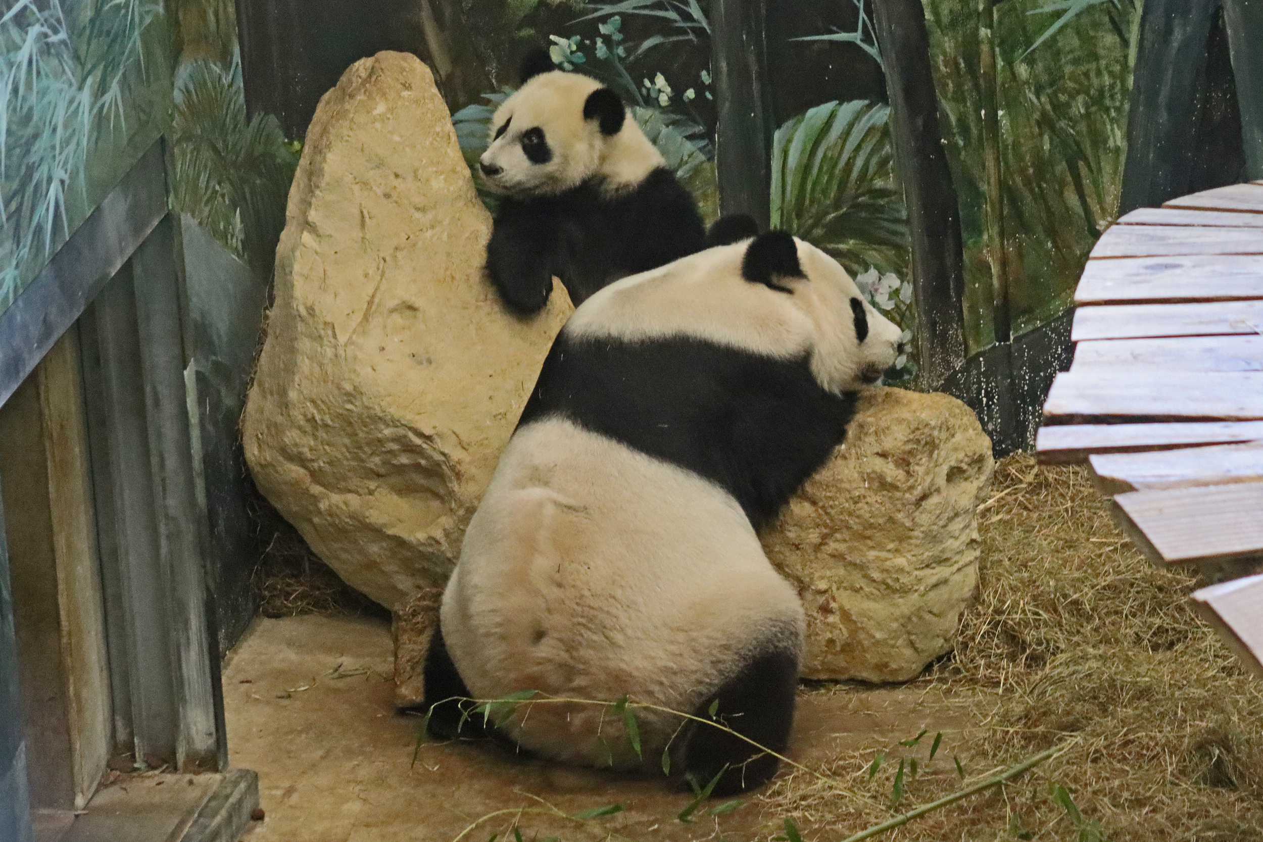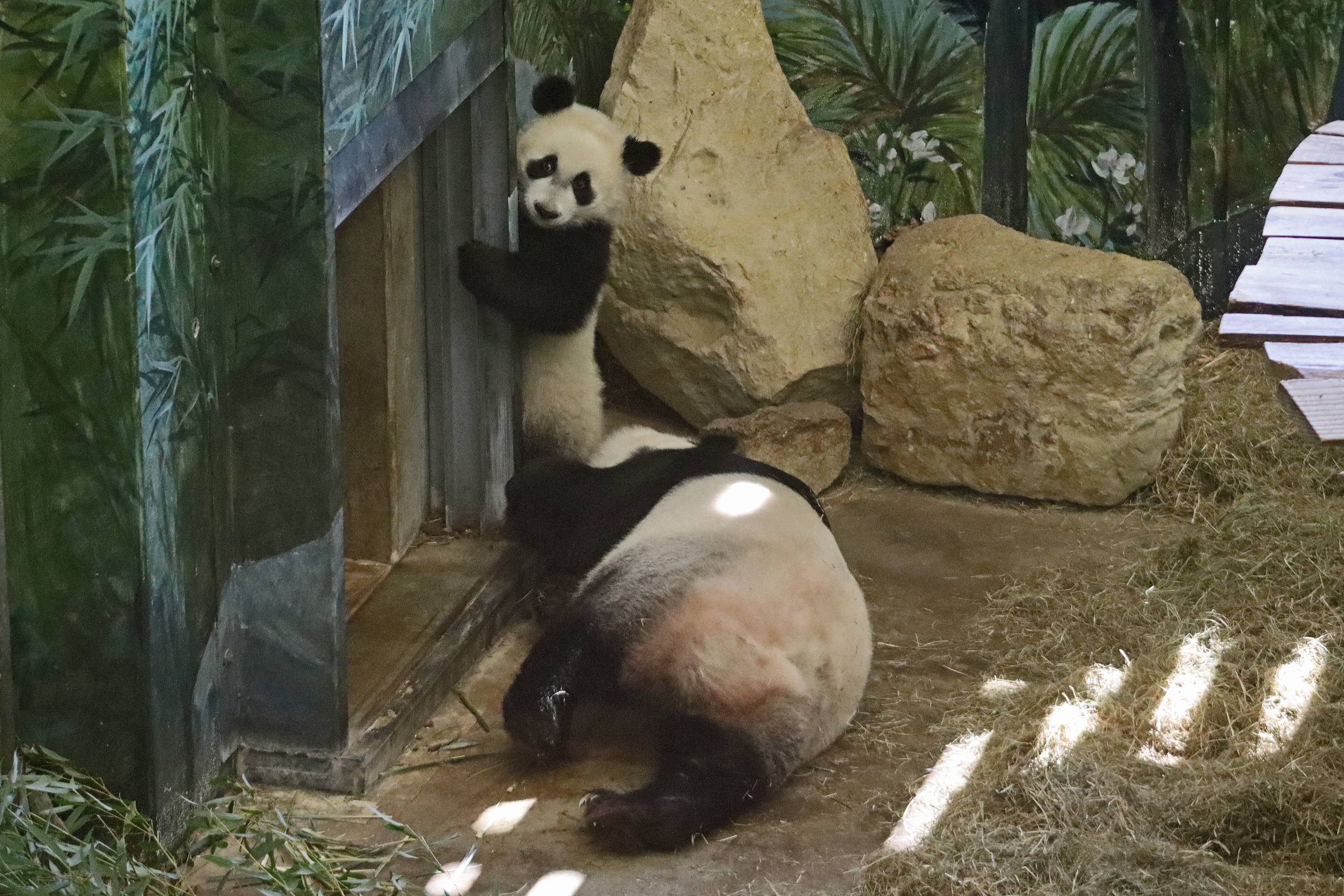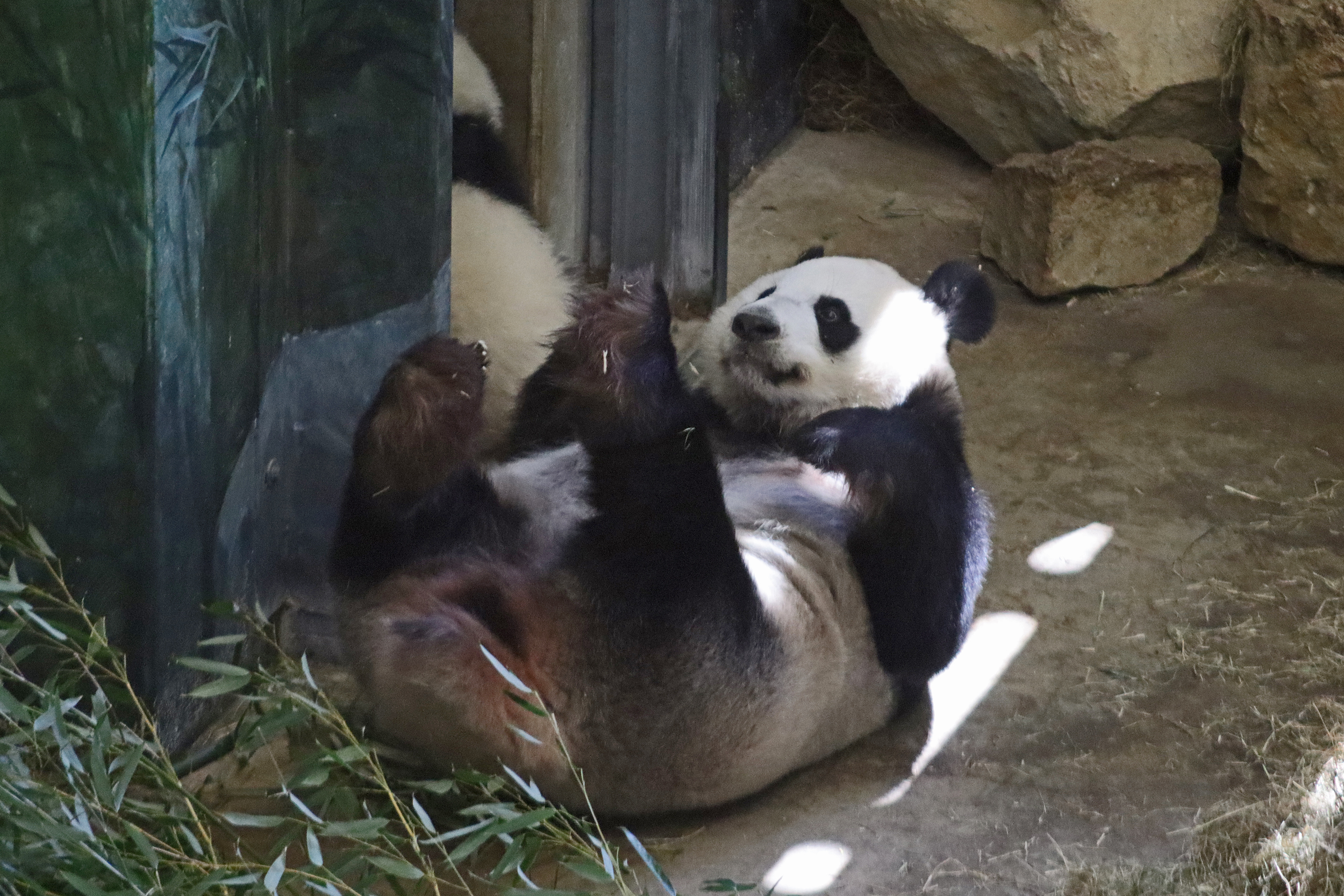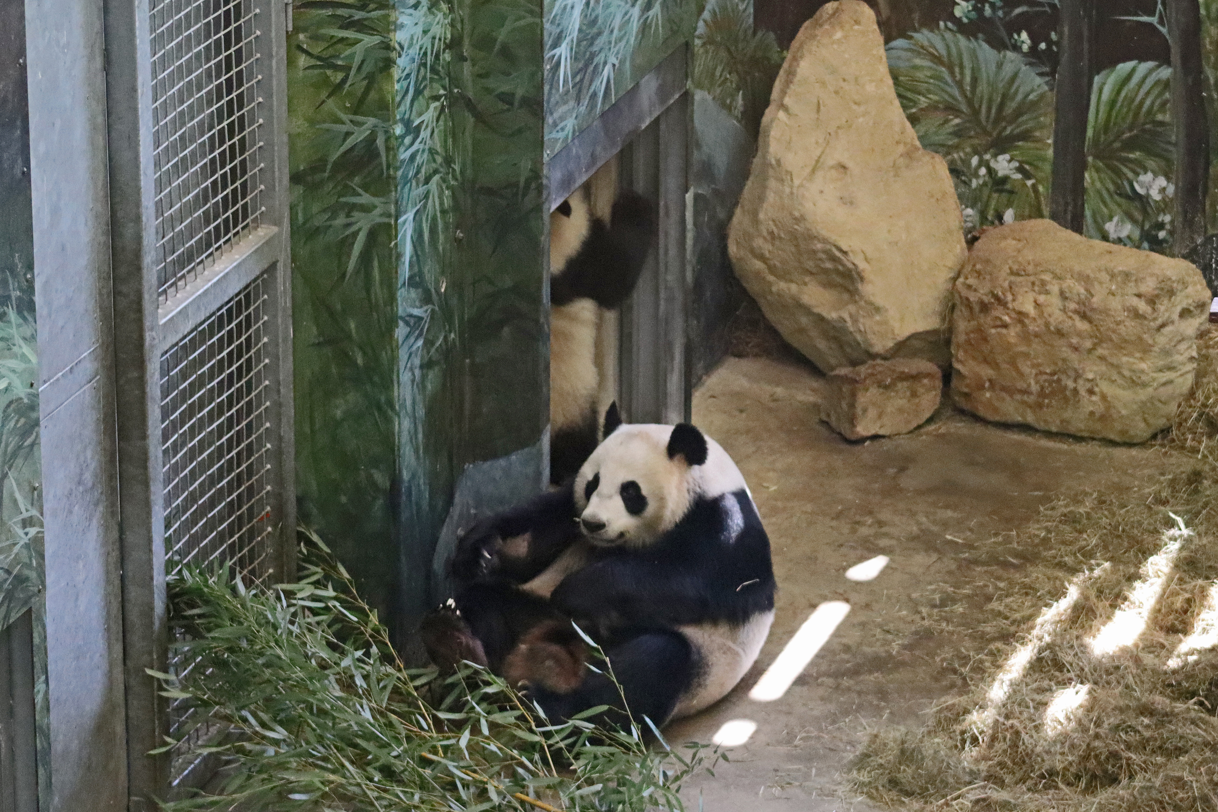 Now mama Wu Wen 武雯 and second Dutch-born cub Lang Yue 朗月 who is also a female – for a while when we arrived we could only see Lang Yue, she was sitting in the doorway to one of the back dens, then after maybe an hour or so Wu Wen eventually came out to see what Lang Yue was doing and catch up on some bamboo! These two were quite tricky to photograph, they mostly hung out by the wall below the tall viewing windows, so the only spot was the smaller side windows, and then you were at the mercy of the sun and the reflections on the glass – it was quite limiting but I think I did get some good ones eventually. Once Wu Wen had wandered out once, she was wandering around quite a bit, going out and in from the back den, checking on Lang Yue and having bamboo. Lang Yue was mostly just in the doorway for the day, so I think we got her on a quiet day, but at least it meant we could still see her – we got lucky later in the afternoon when she was feeling a little adventurous and came out for some climbing! Initially Wu Wen didn’t bother with this, but the second time she climbed up the rocky structure, mum headed over to pull her off! Some very sweet interactions that were definitely a highlight of the day.