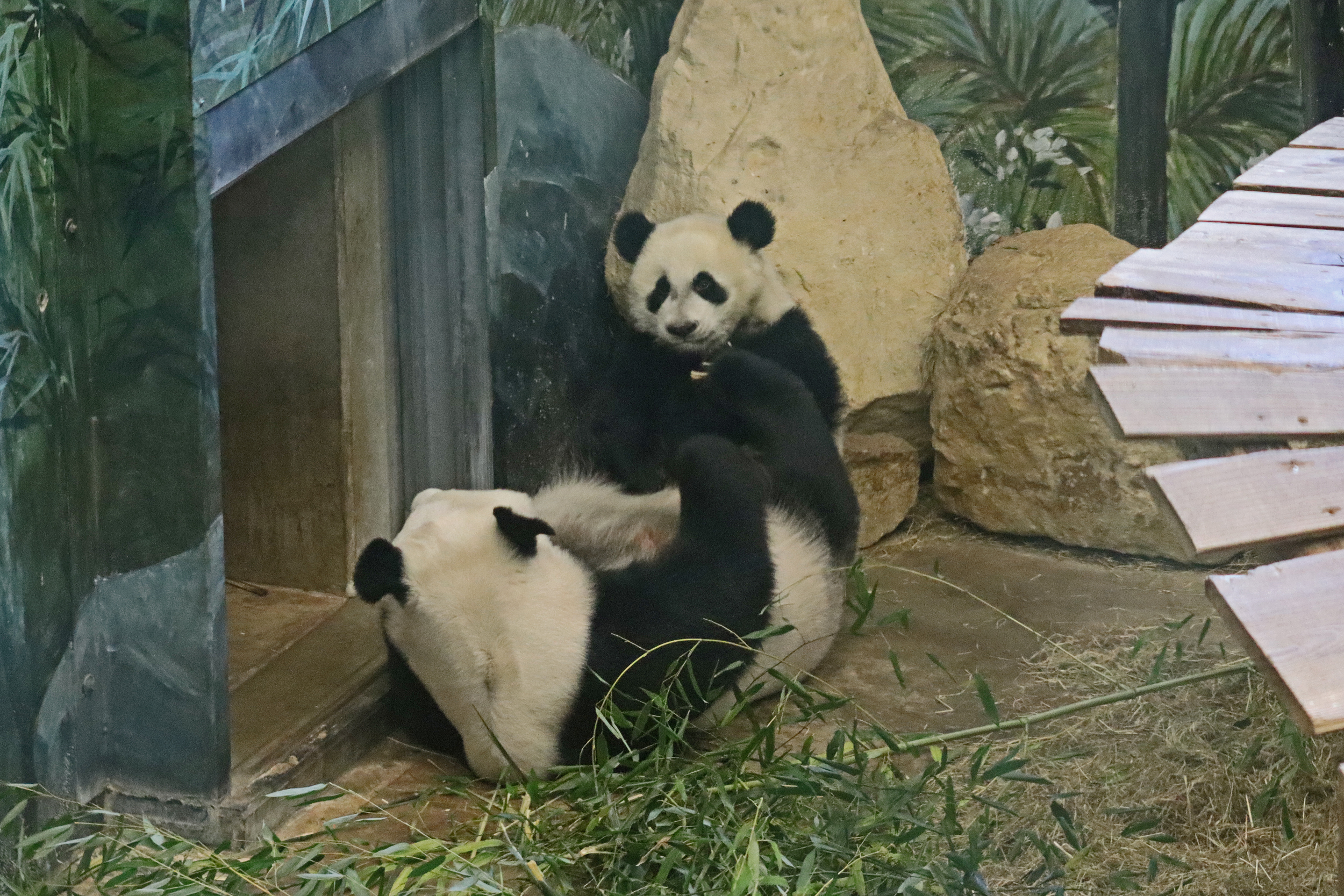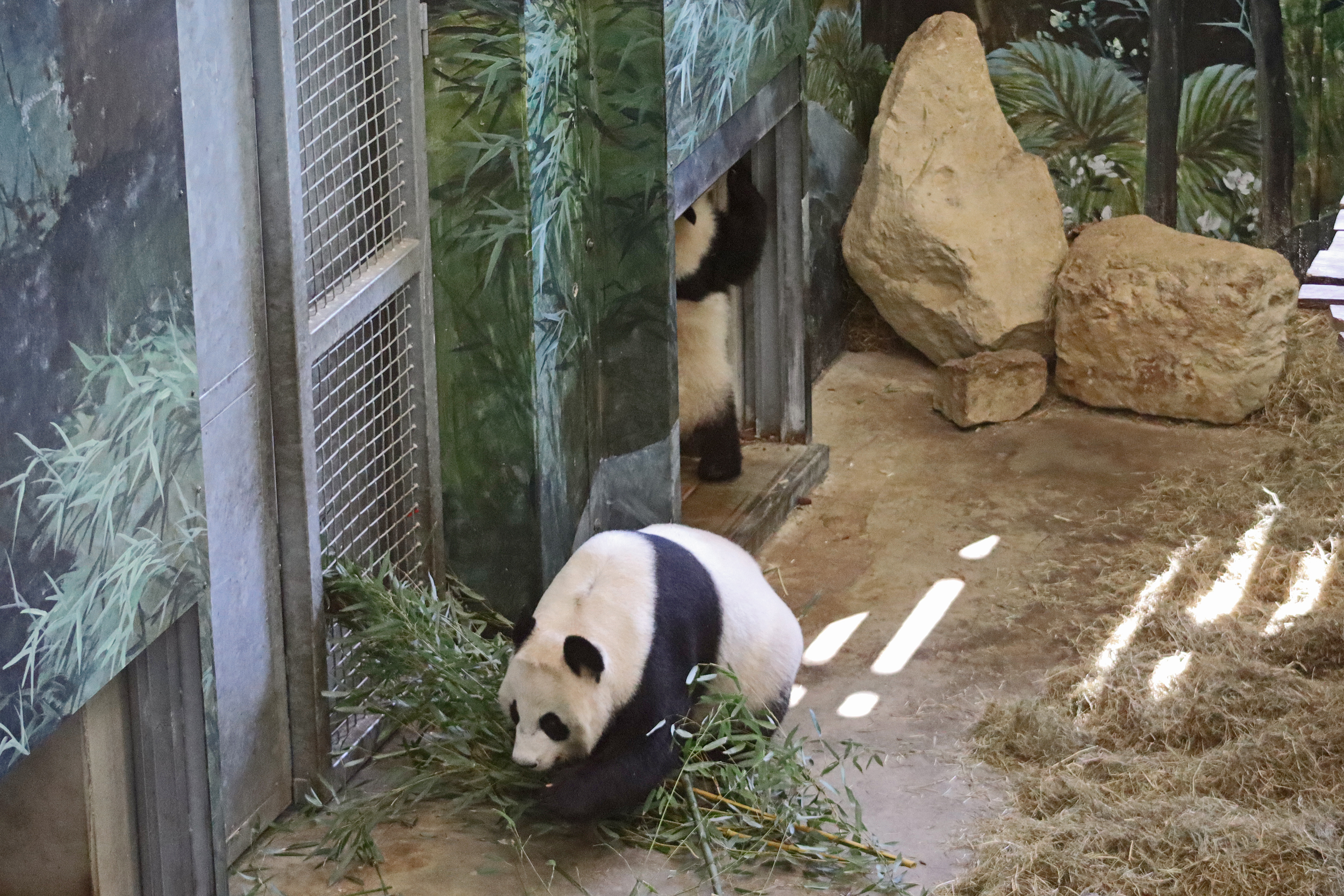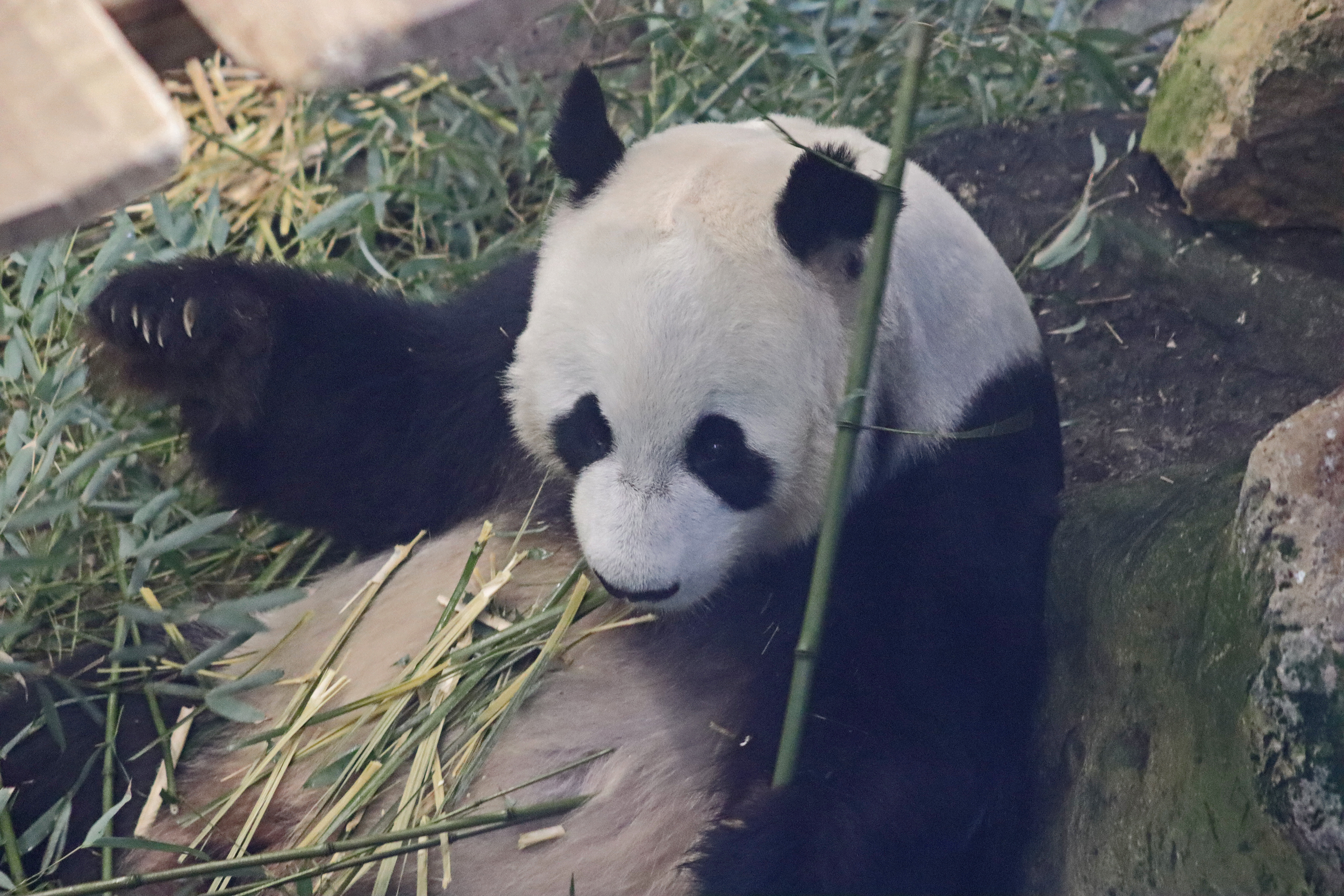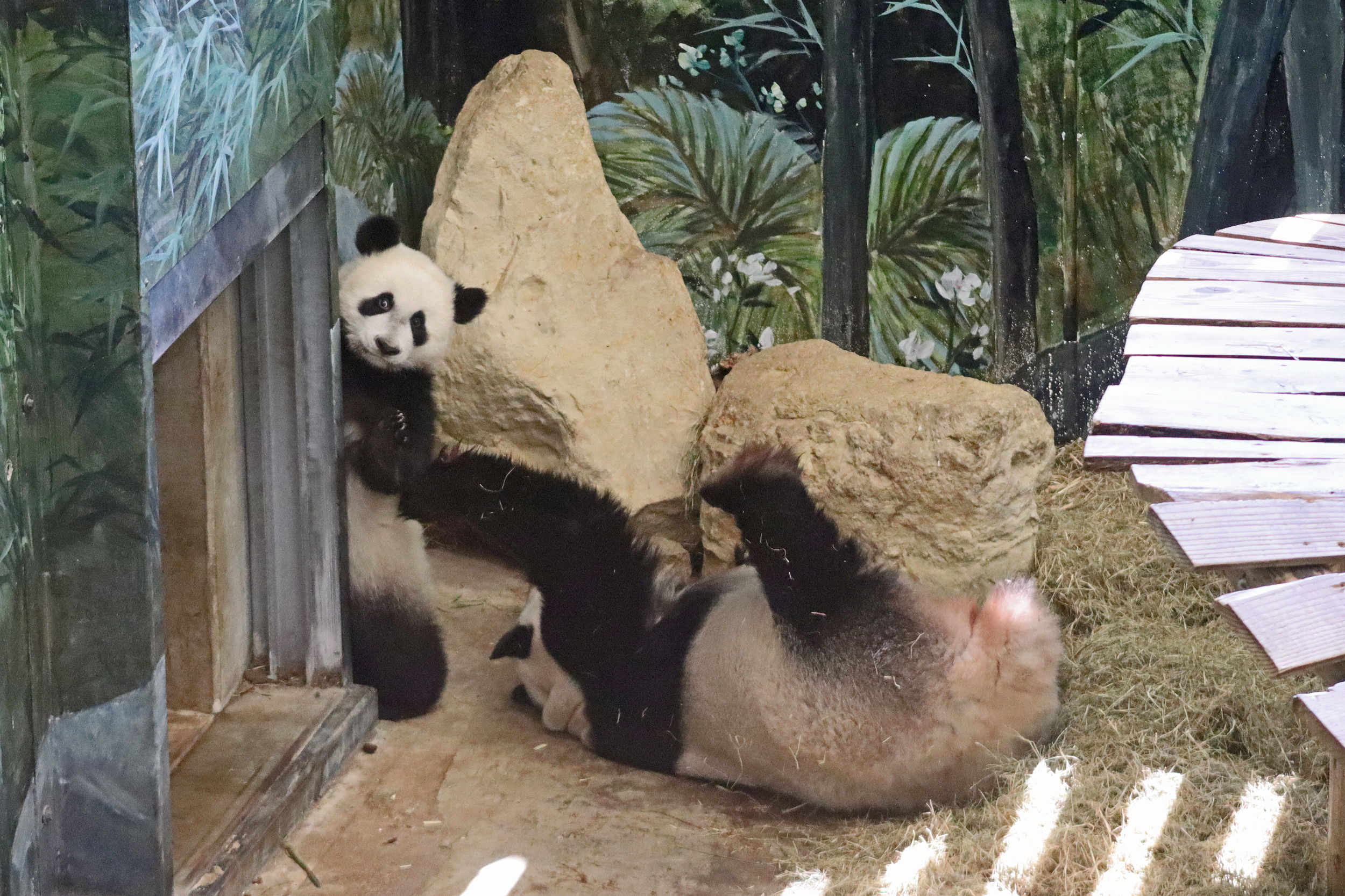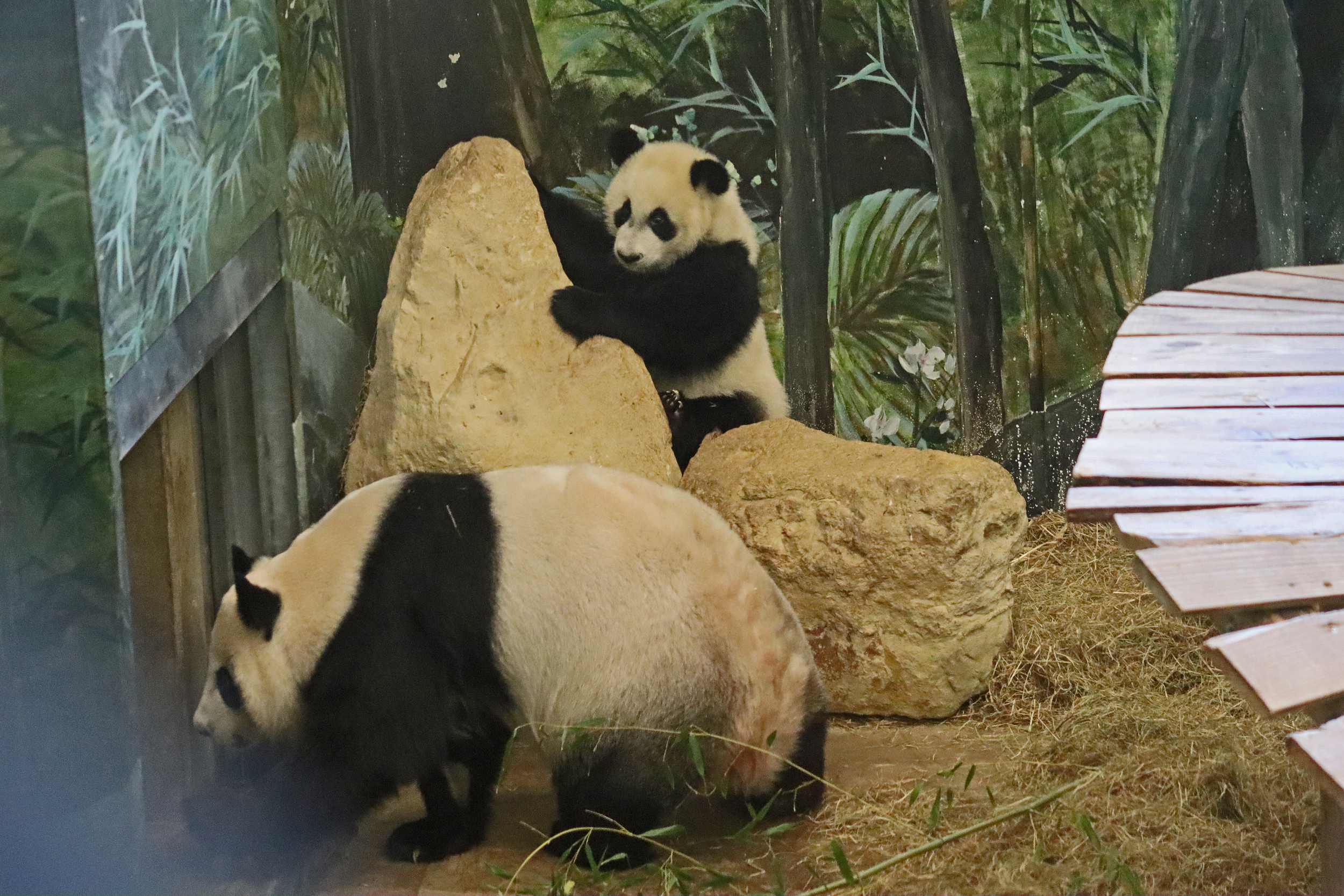 Now mama Wu Wen 武雯 and second Dutch-born cub Lang Yue 朗月 who is also a female – for a while when we arrived we could only see Lang Yue, she was sitting in the doorway to one of the back dens, then after maybe an hour or so Wu Wen eventually came out to see what Lang Yue was doing and catch up on some bamboo! These two were quite tricky to photograph, they mostly hung out by the wall below the tall viewing windows, so the only spot was the smaller side windows, and then you were at the mercy of the sun and the reflections on the glass – it was quite limiting but I think I did get some good ones eventually. Once Wu Wen had wandered out once, she was wandering around quite a bit, going out and in from the back den, checking on Lang Yue and having bamboo. Lang Yue was mostly just in the doorway for the day, so I think we got her on a quiet day, but at least it meant we could still see her – we got lucky later in the afternoon when she was feeling a little adventurous and came out for some climbing! Initially Wu Wen didn’t bother with this, but the second time she climbed up the rocky structure, mum headed over to pull her off! Some very sweet interactions that were definitely a highlight of the day.