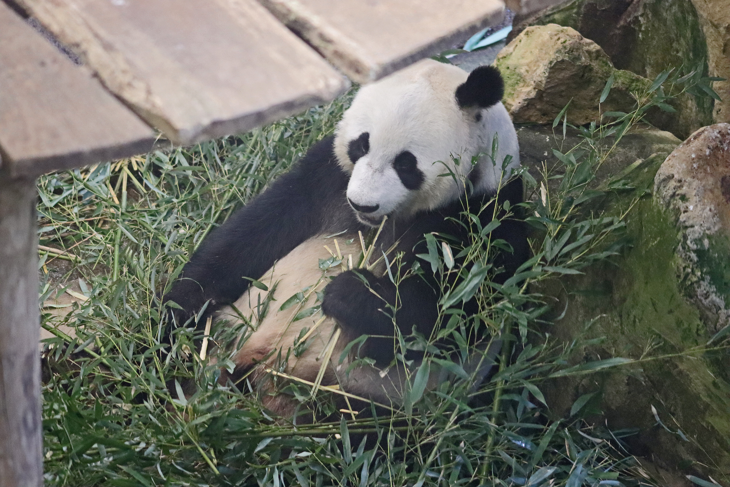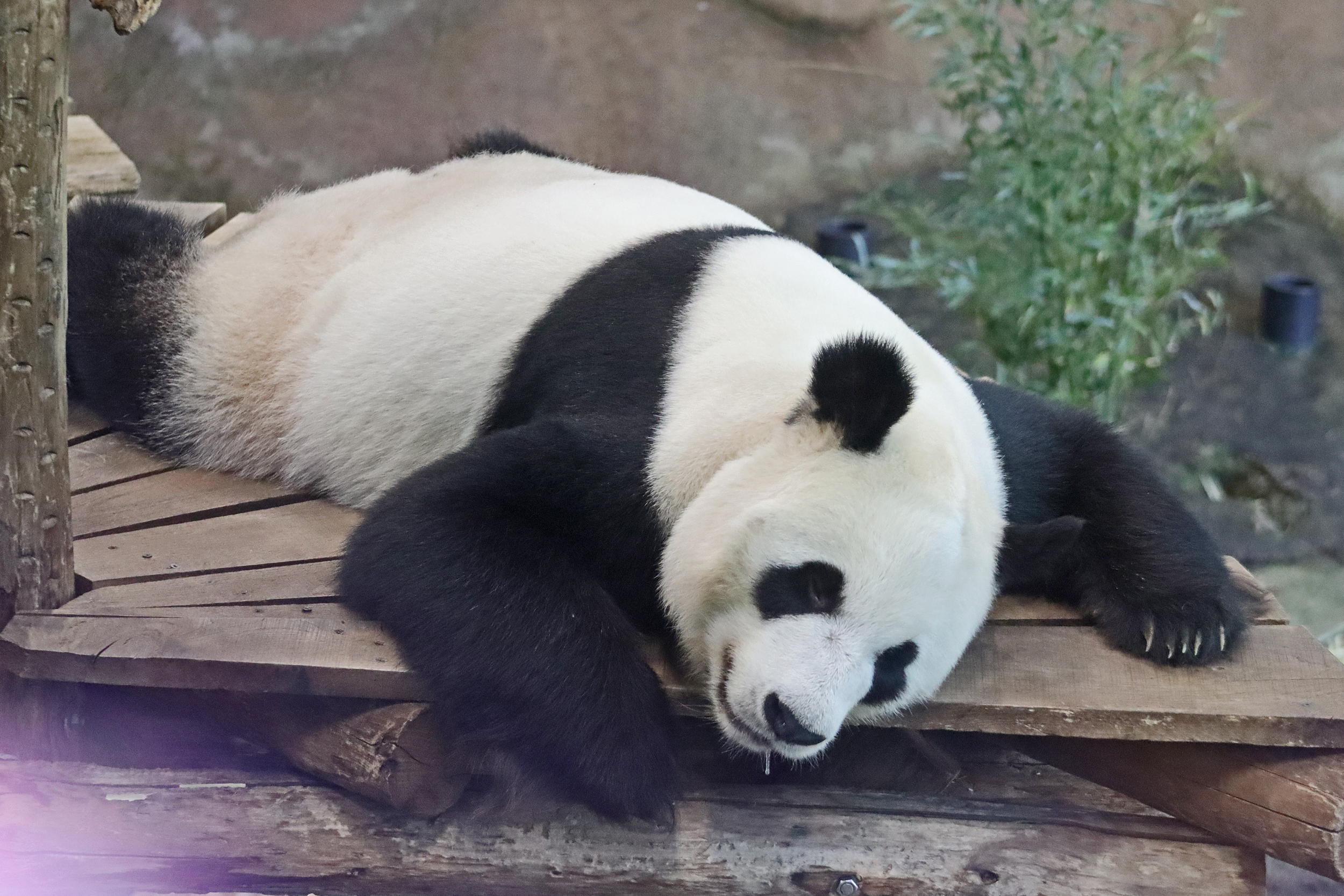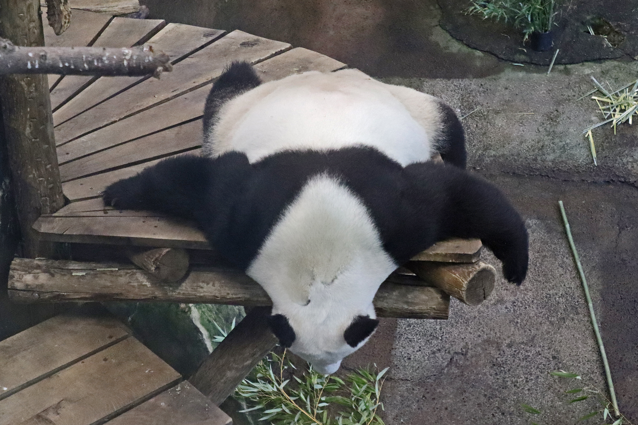 Papa Xing Ya 星雅 – what a sweet guy^ He had access to the outdoor yard all day, but didn’t head out, and actually he didn’t come into the indoor viewing from the back den until around lunchtime, so it took a few hours of stopping by his windows to check if he was there. He mostly choose positions that were tricky to photograph, so I was crouched on the ground to get an angle where he was positioned well in the shot! Luckily he did move around a bit, but spent a good hour or so enjoying his bamboo before heading up onto one of his platforms for a long afternoon nap – gotta love a starfished panda XD And caught him drooling as well! He seems super chilled out and laid back and one day I hope I’ll see him enjoying the outdoor yard because it’s a lovely one.