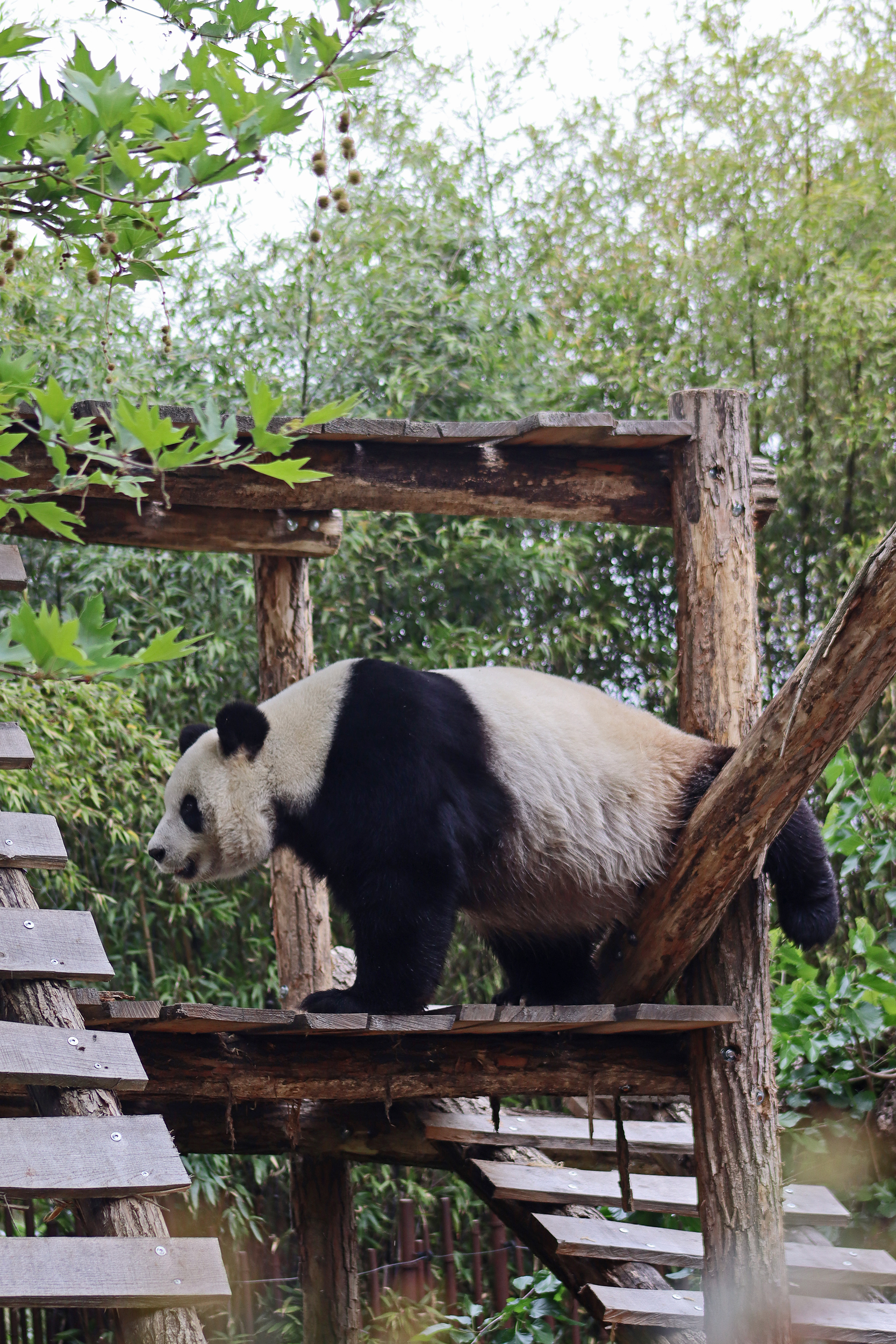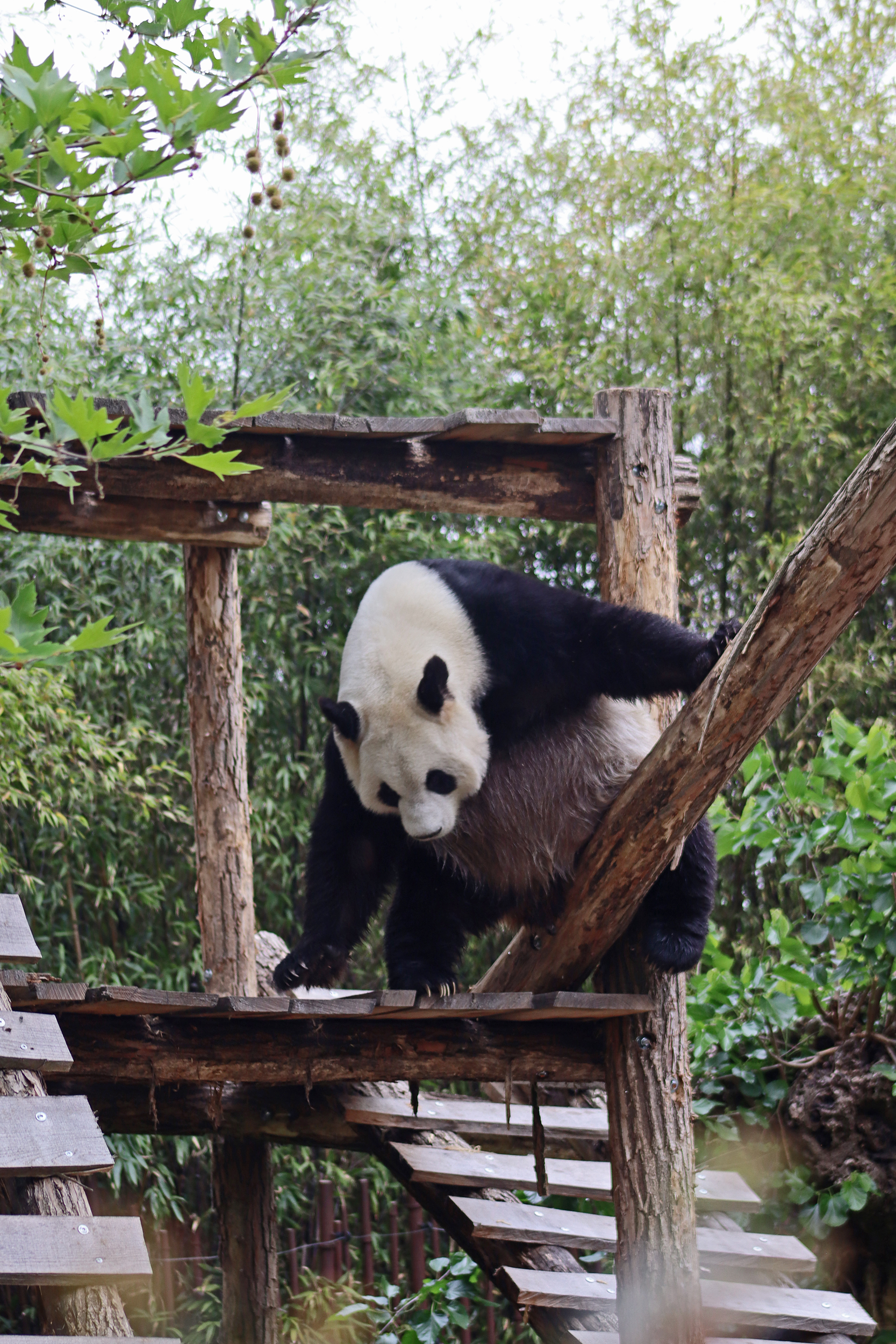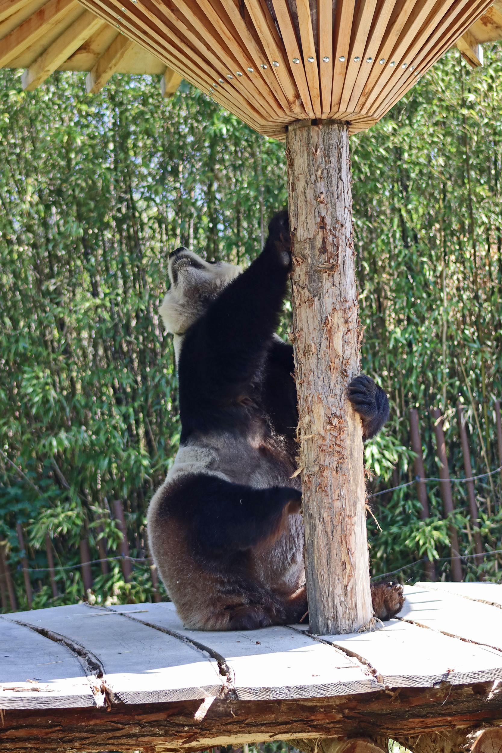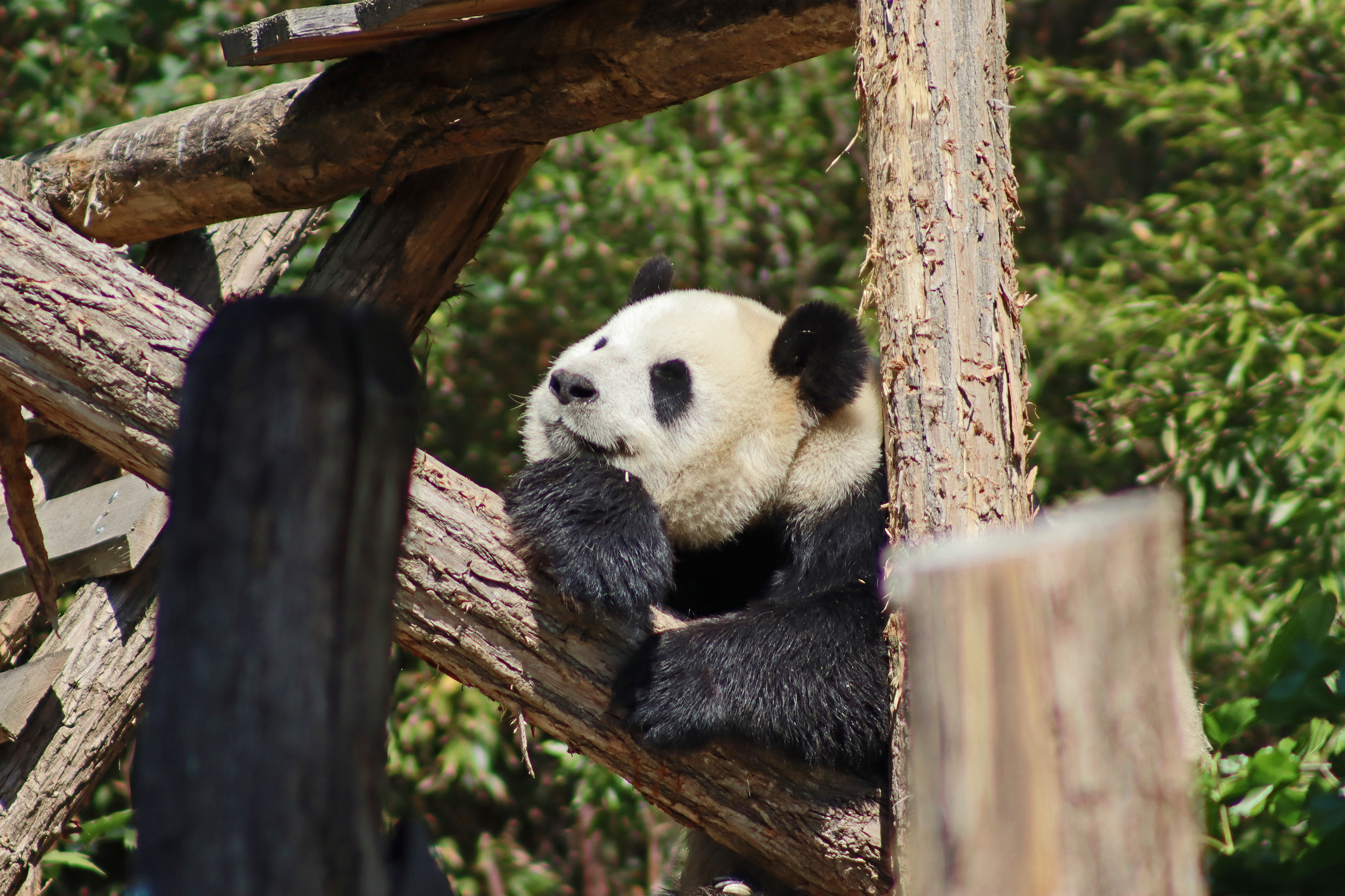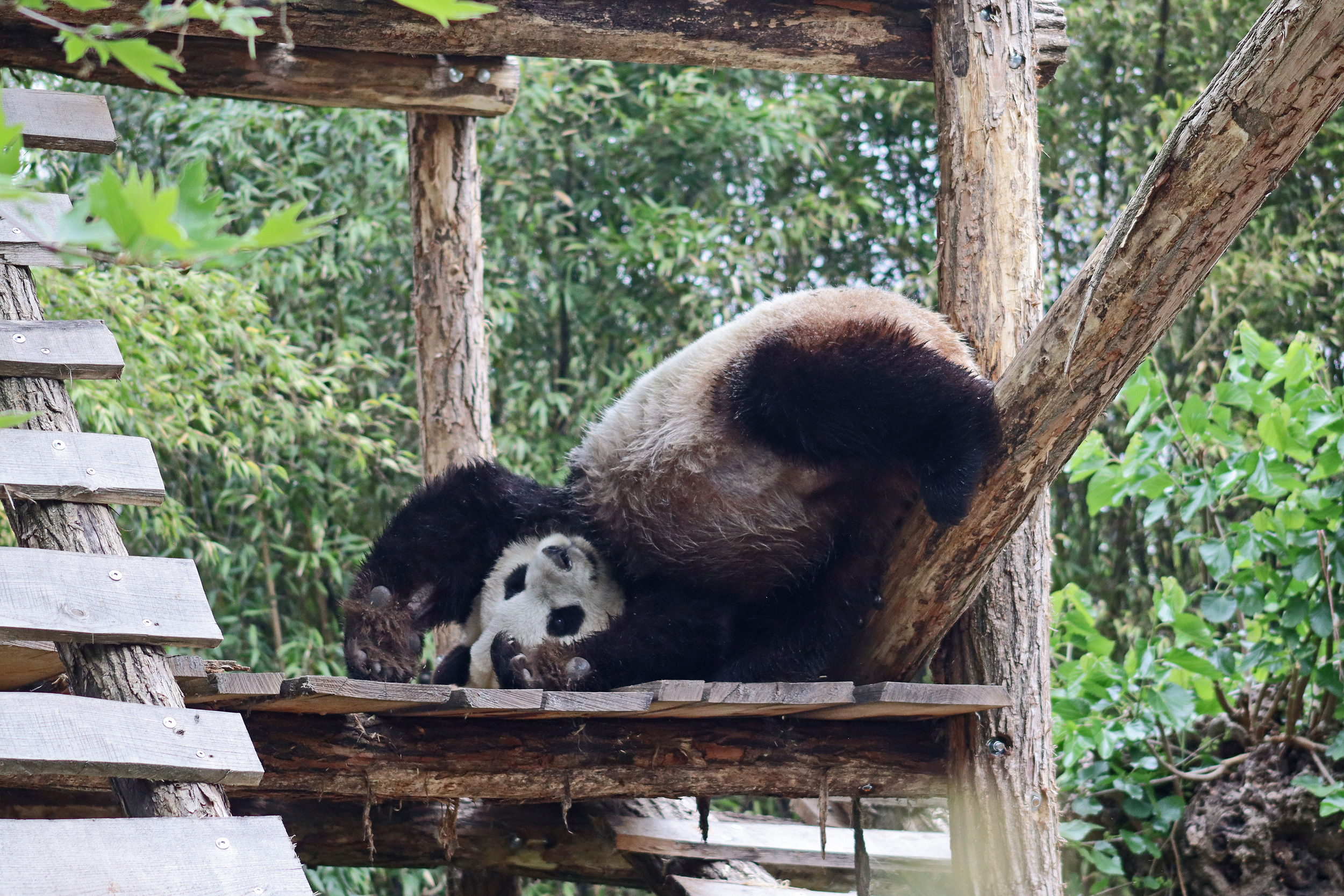 And for female Hao Hao 好好 – this is the first time I’m seeing her alone without cubs. She was really loving life outside in the hot weather on this visit, she spent so much time outside and was really playing to her audience! When we arrived she was outside up on her platform in the shade, but she quickly woke up and was really tearing into the structure, you could already see where she had clawed away at some sections and where there were some holes. It was really nice to see her active and playful. She did then settle down in what didn’t look comfy, but was a cute position, with her face through two struts of the structure – that made for some very cute pictures^ The next time we went back she was wandering around outside, she didn’t seem particularly interested in bamboo but was keen to explore and make good use of all of her climbing frames. It was great to see her climbing up the ladder and along some of her bridges between platforms. It was cooler on the second day of our visit, but this didn’t deter Hao Hao because she was asleep outside on the platform for most of the day, but we got lucky and saw her awake – she looked like she was going to climb up one of the big log struts, in the end she just had a very thorough scratch on it!