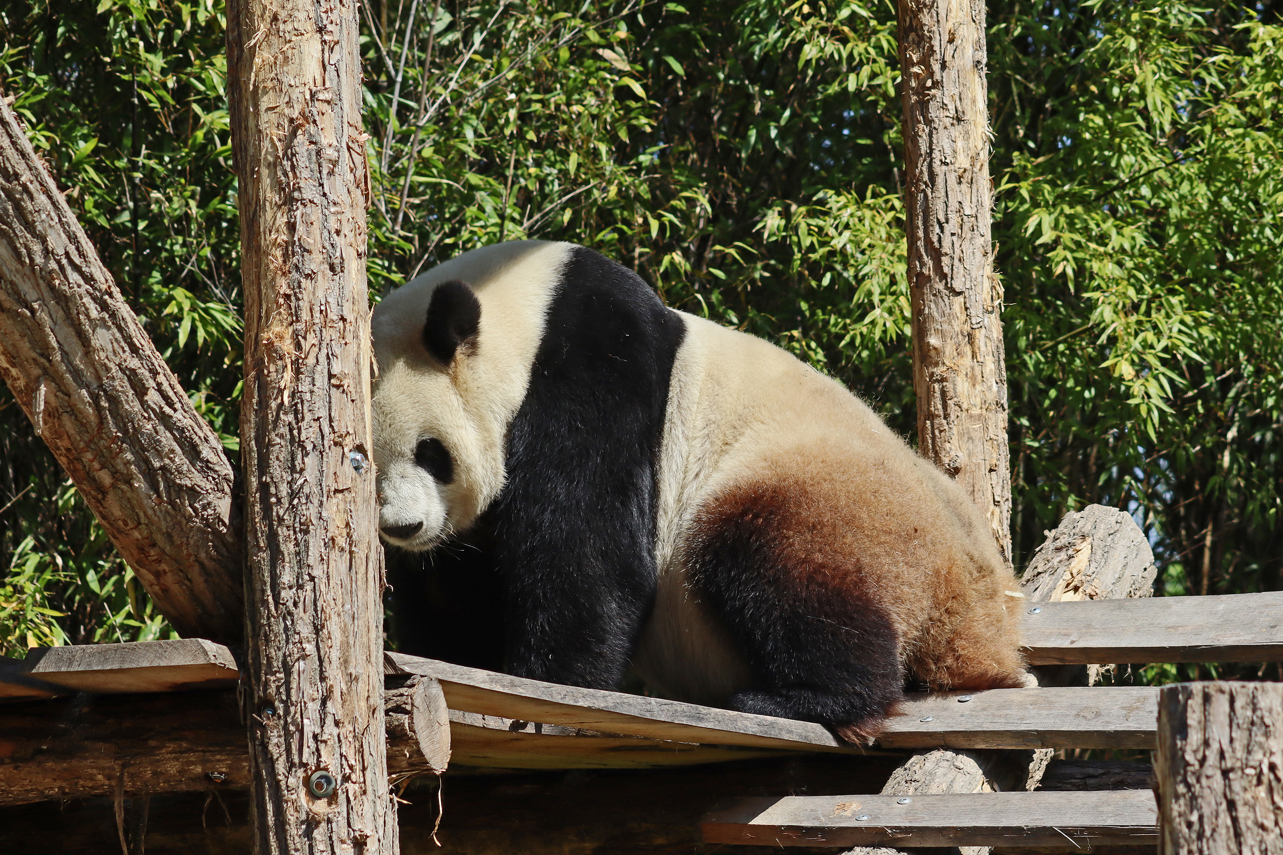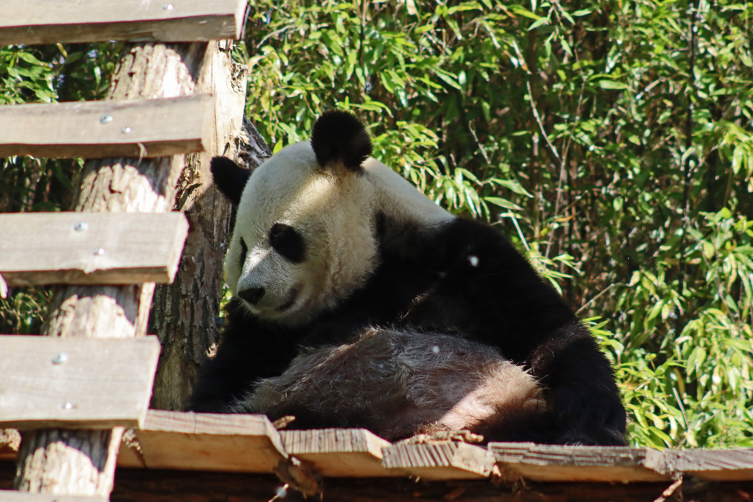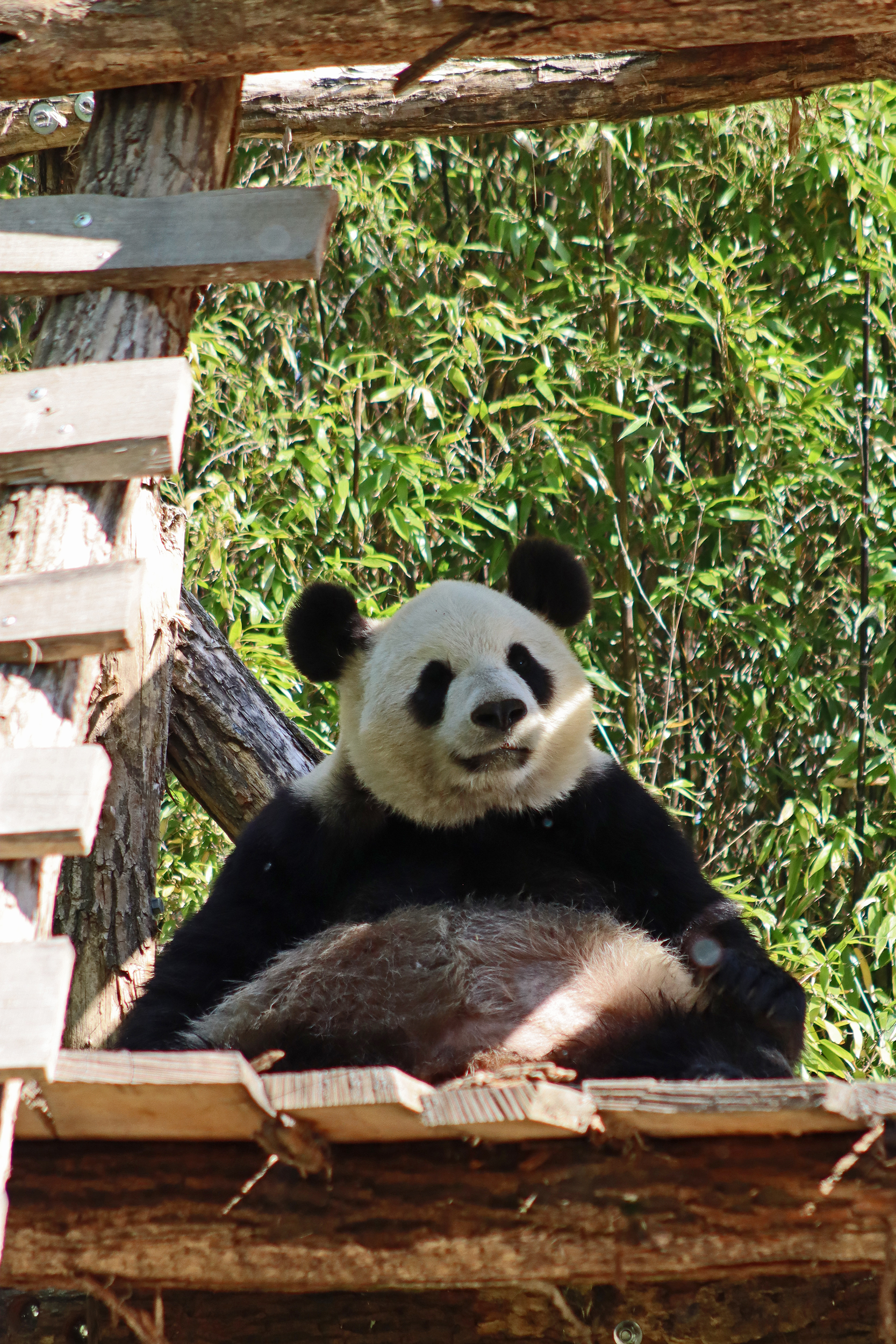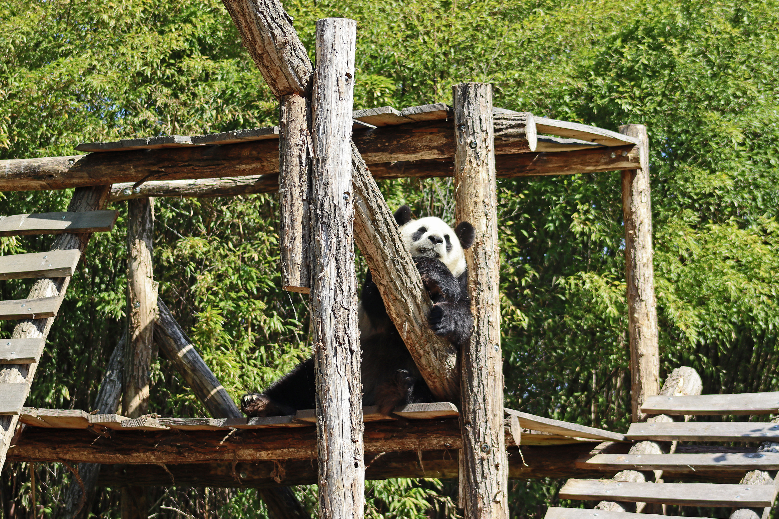 And for female Hao Hao 好好 – this is the first time I’m seeing her alone without cubs. She was really loving life outside in the hot weather on this visit, she spent so much time outside and was really playing to her audience! When we arrived she was outside up on her platform in the shade, but she quickly woke up and was really tearing into the structure, you could already see where she had clawed away at some sections and where there were some holes. It was really nice to see her active and playful. She did then settle down in what didn’t look comfy, but was a cute position, with her face through two struts of the structure – that made for some very cute pictures^ The next time we went back she was wandering around outside, she didn’t seem particularly interested in bamboo but was keen to explore and make good use of all of her climbing frames. It was great to see her climbing up the ladder and along some of her bridges between platforms. It was cooler on the second day of our visit, but this didn’t deter Hao Hao because she was asleep outside on the platform for most of the day, but we got lucky and saw her awake – she looked like she was going to climb up one of the big log struts, in the end she just had a very thorough scratch on it!