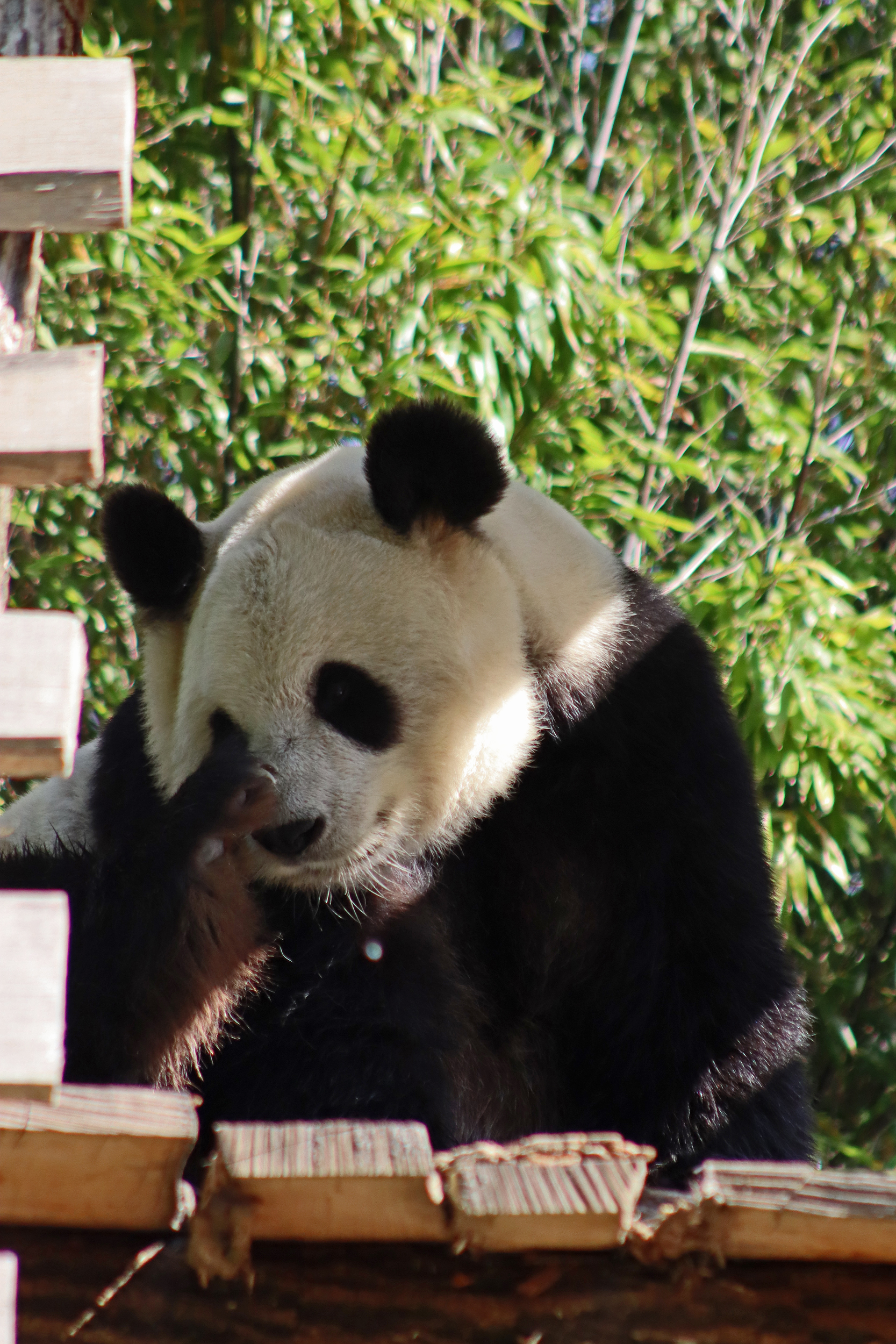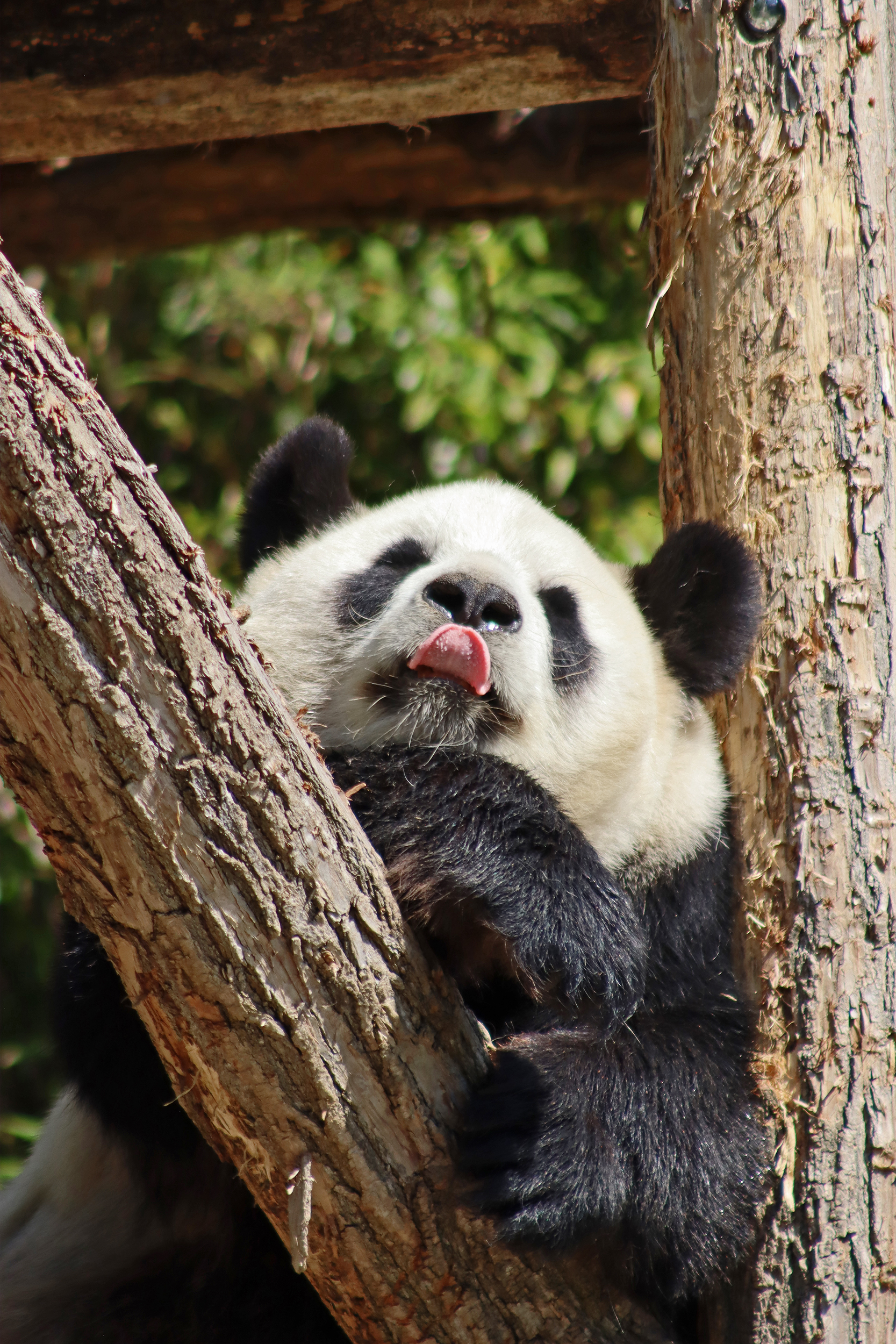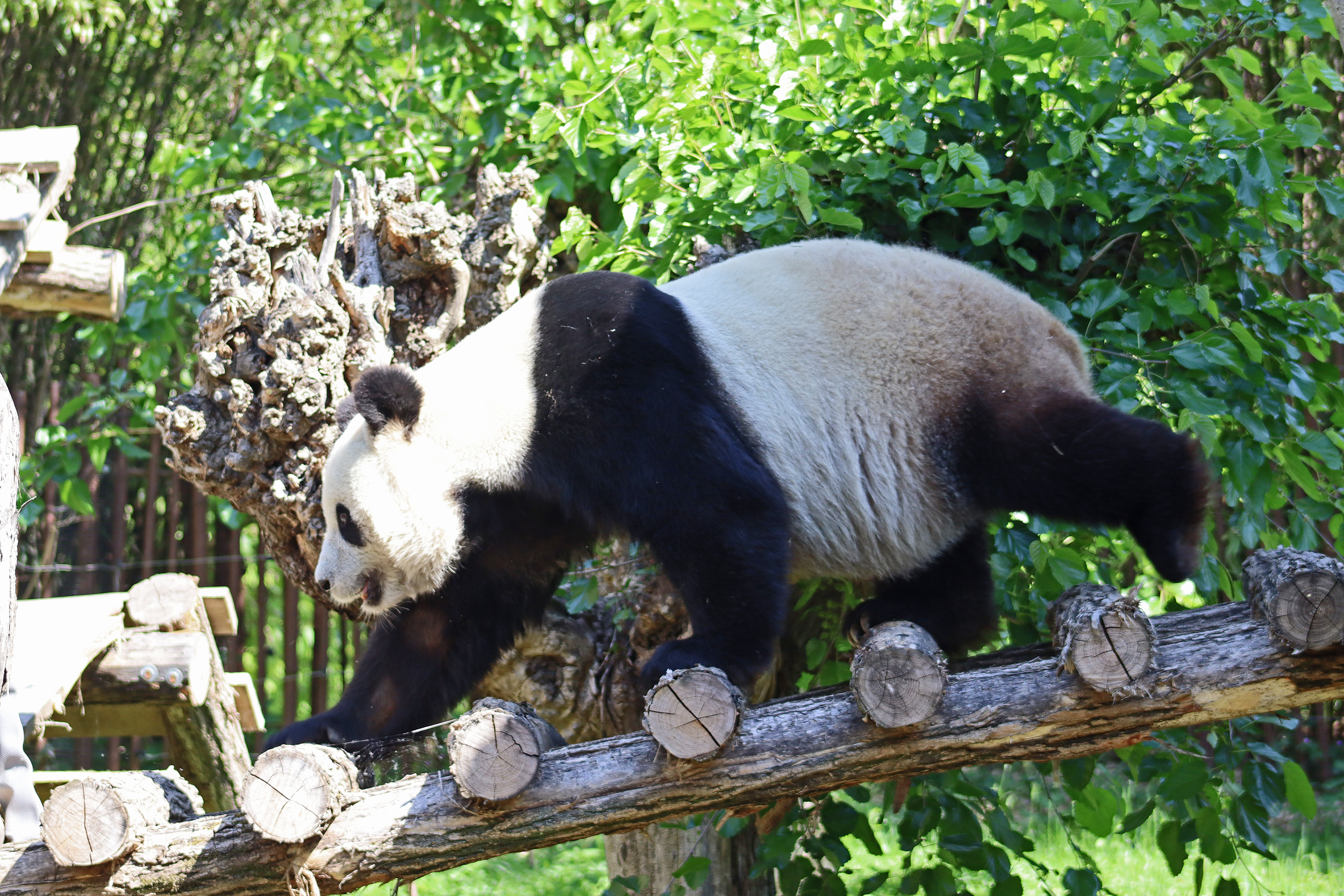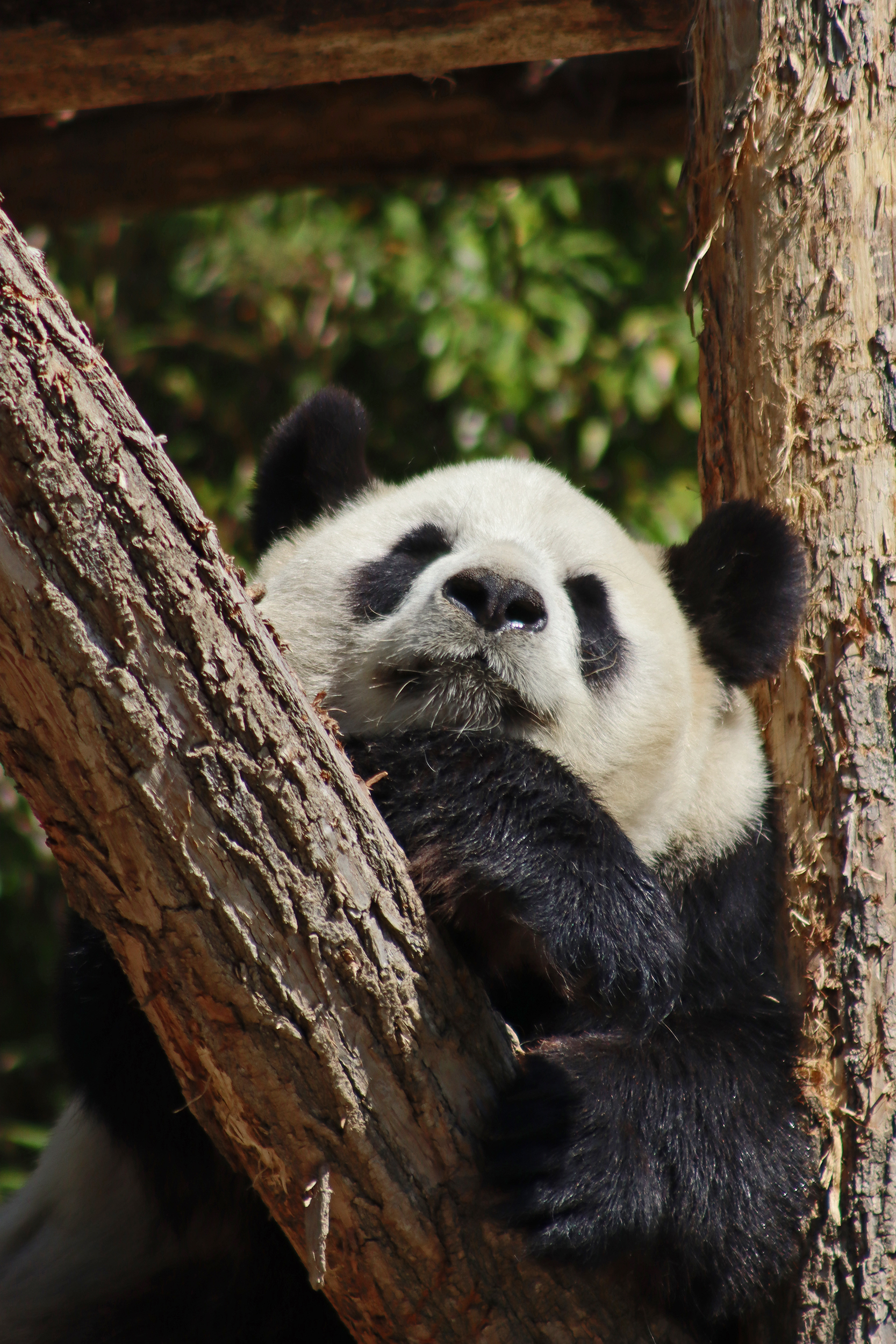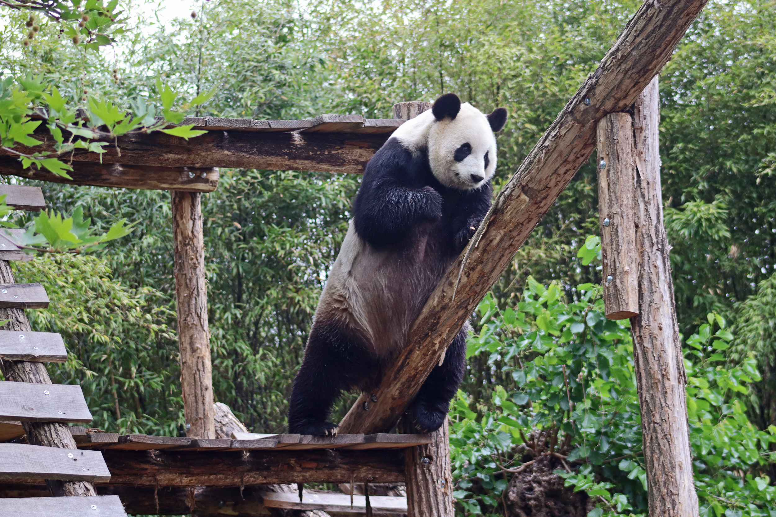 And for female Hao Hao 好好 – this is the first time I’m seeing her alone without cubs. She was really loving life outside in the hot weather on this visit, she spent so much time outside and was really playing to her audience! When we arrived she was outside up on her platform in the shade, but she quickly woke up and was really tearing into the structure, you could already see where she had clawed away at some sections and where there were some holes. It was really nice to see her active and playful. She did then settle down in what didn’t look comfy, but was a cute position, with her face through two struts of the structure – that made for some very cute pictures^ The next time we went back she was wandering around outside, she didn’t seem particularly interested in bamboo but was keen to explore and make good use of all of her climbing frames. It was great to see her climbing up the ladder and along some of her bridges between platforms. It was cooler on the second day of our visit, but this didn’t deter Hao Hao because she was asleep outside on the platform for most of the day, but we got lucky and saw her awake – she looked like she was going to climb up one of the big log struts, in the end she just had a very thorough scratch on it!