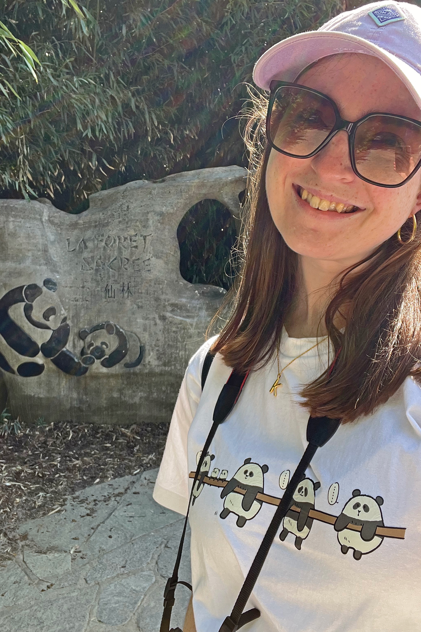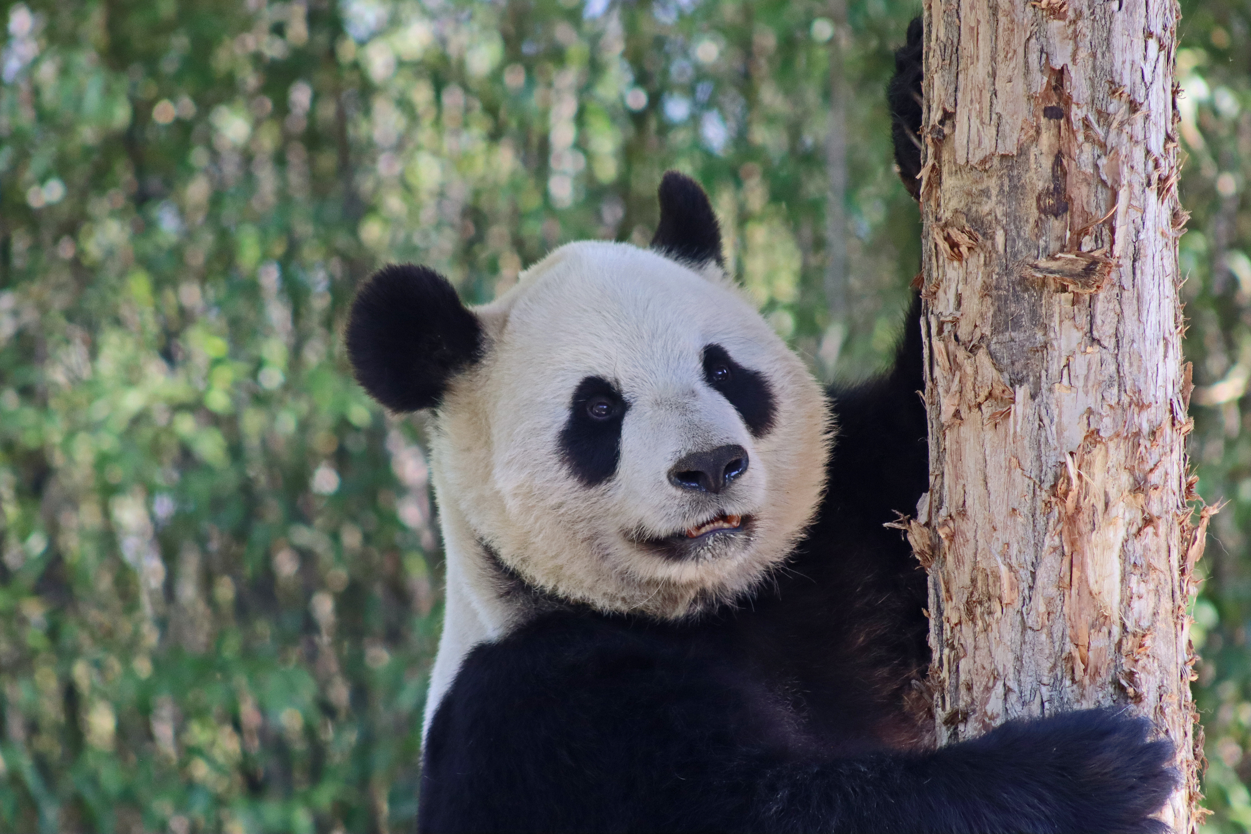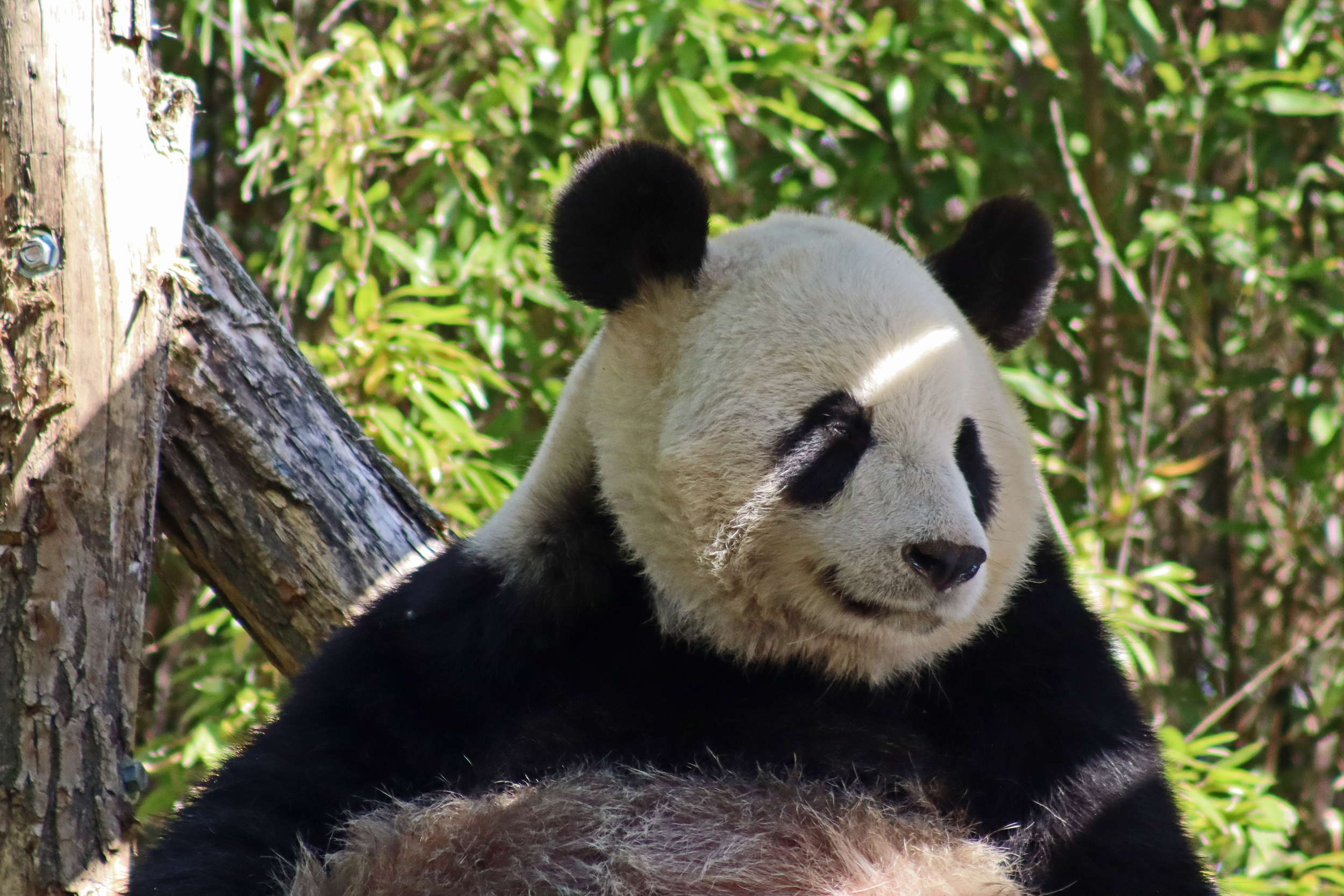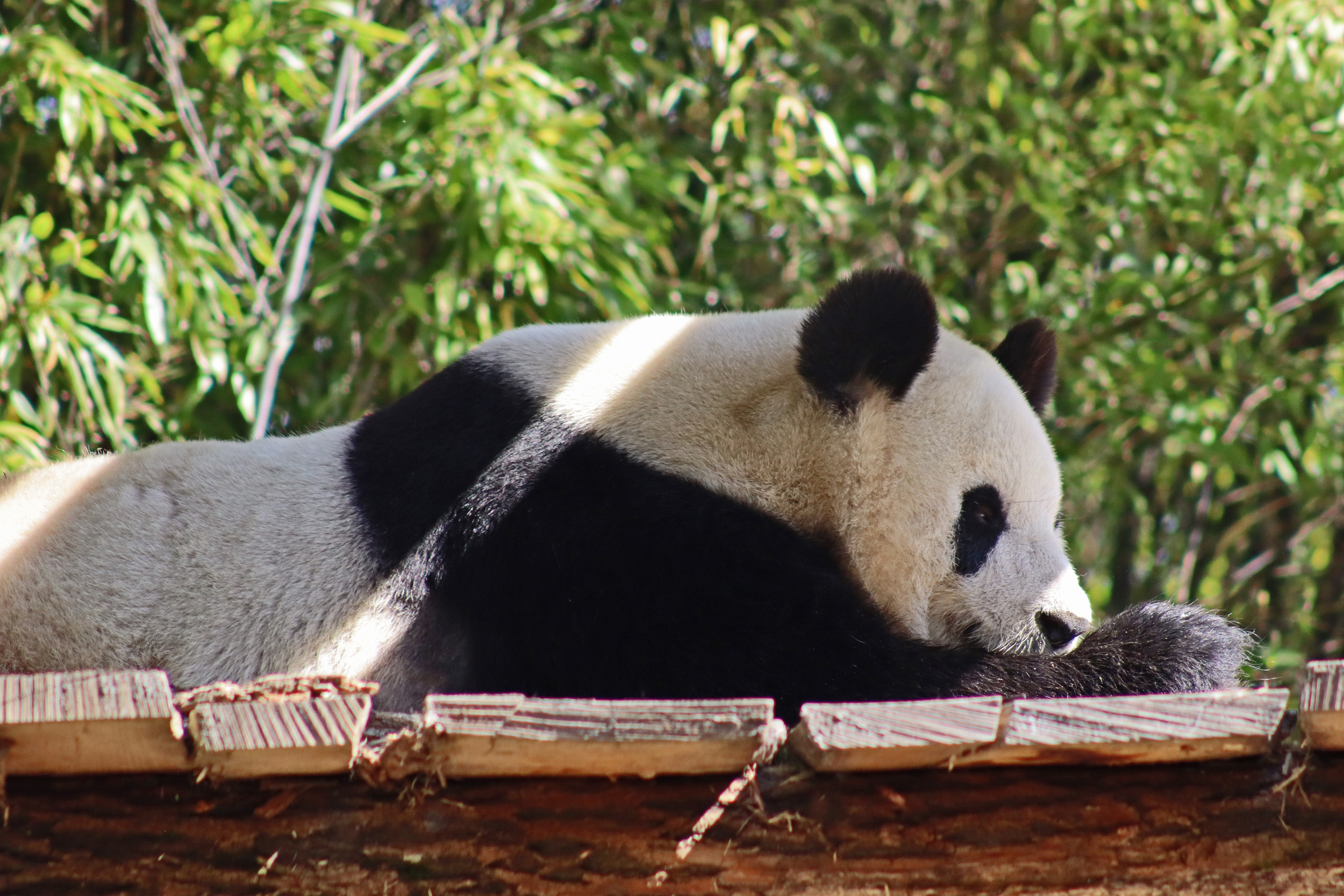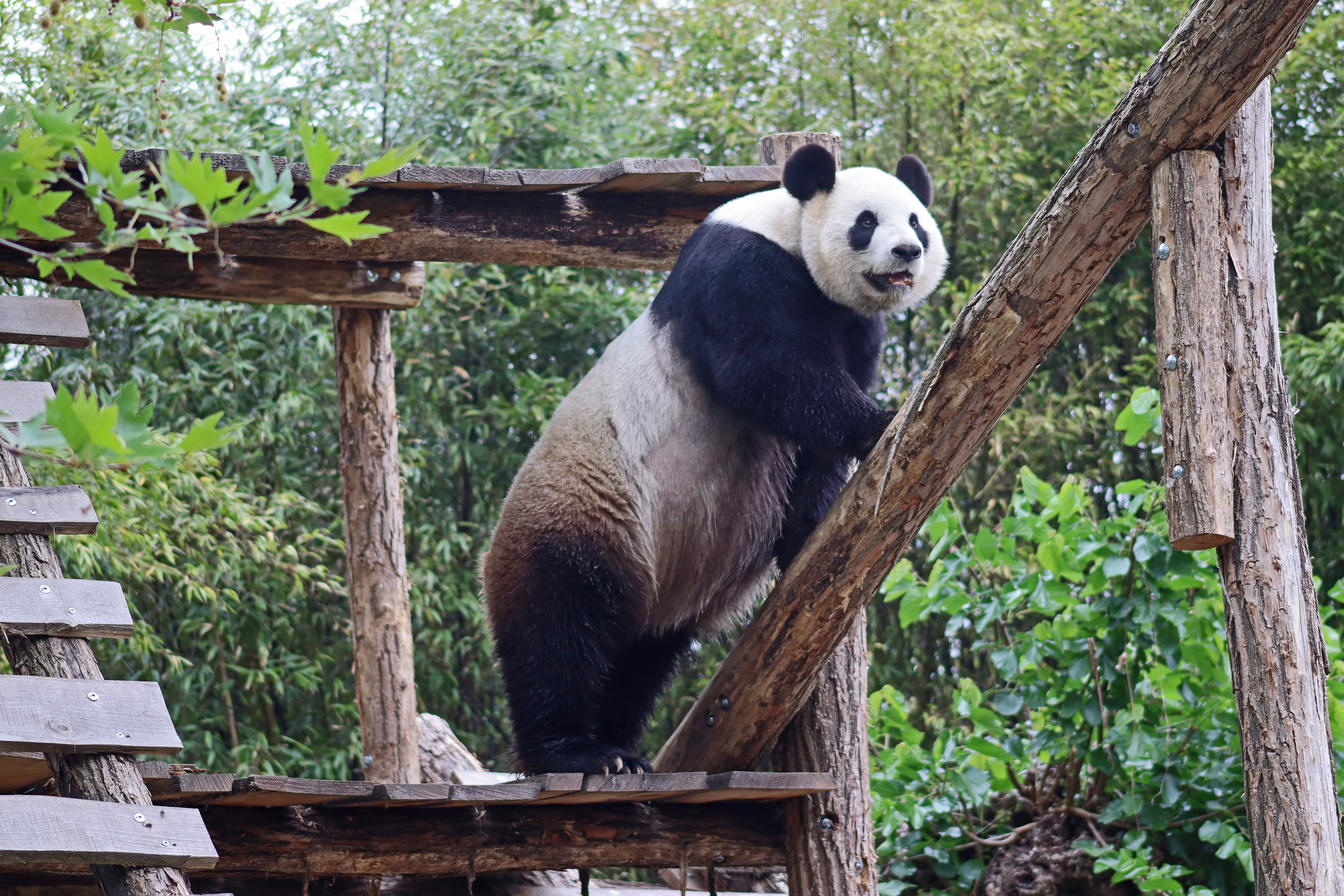 And for female Hao Hao 好好 – this is the first time I’m seeing her alone without cubs. She was really loving life outside in the hot weather on this visit, she spent so much time outside and was really playing to her audience! When we arrived she was outside up on her platform in the shade, but she quickly woke up and was really tearing into the structure, you could already see where she had clawed away at some sections and where there were some holes. It was really nice to see her active and playful. She did then settle down in what didn’t look comfy, but was a cute position, with her face through two struts of the structure – that made for some very cute pictures^ The next time we went back she was wandering around outside, she didn’t seem particularly interested in bamboo but was keen to explore and make good use of all of her climbing frames. It was great to see her climbing up the ladder and along some of her bridges between platforms. It was cooler on the second day of our visit, but this didn’t deter Hao Hao because she was asleep outside on the platform for most of the day, but we got lucky and saw her awake – she looked like she was going to climb up one of the big log struts, in the end she just had a very thorough scratch on it!
